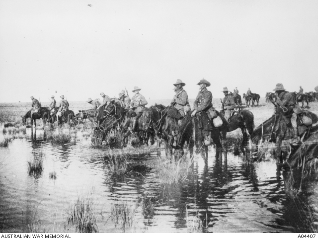 Mounted troopers of the 1st Battalion, Australian Commonwealth Horse, watering their horses while ...