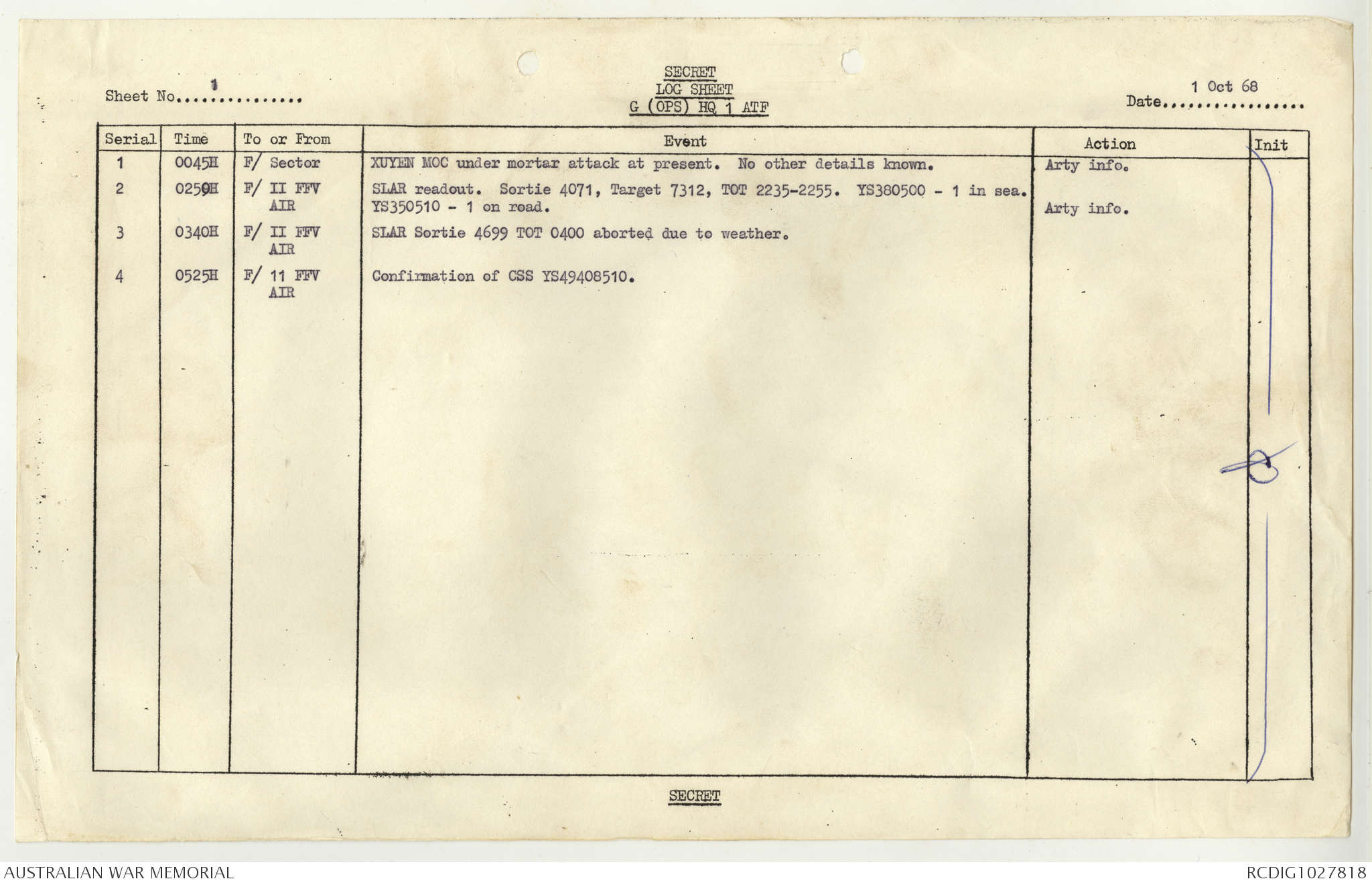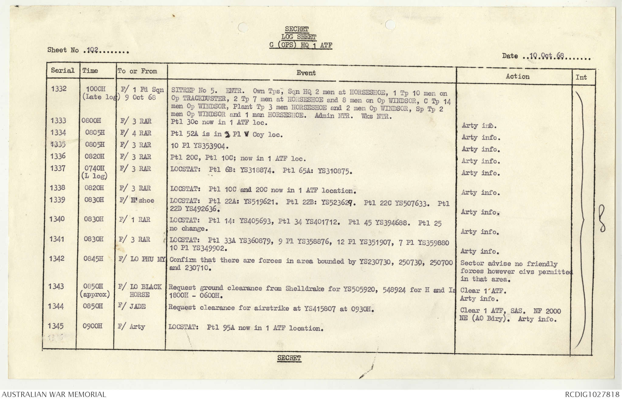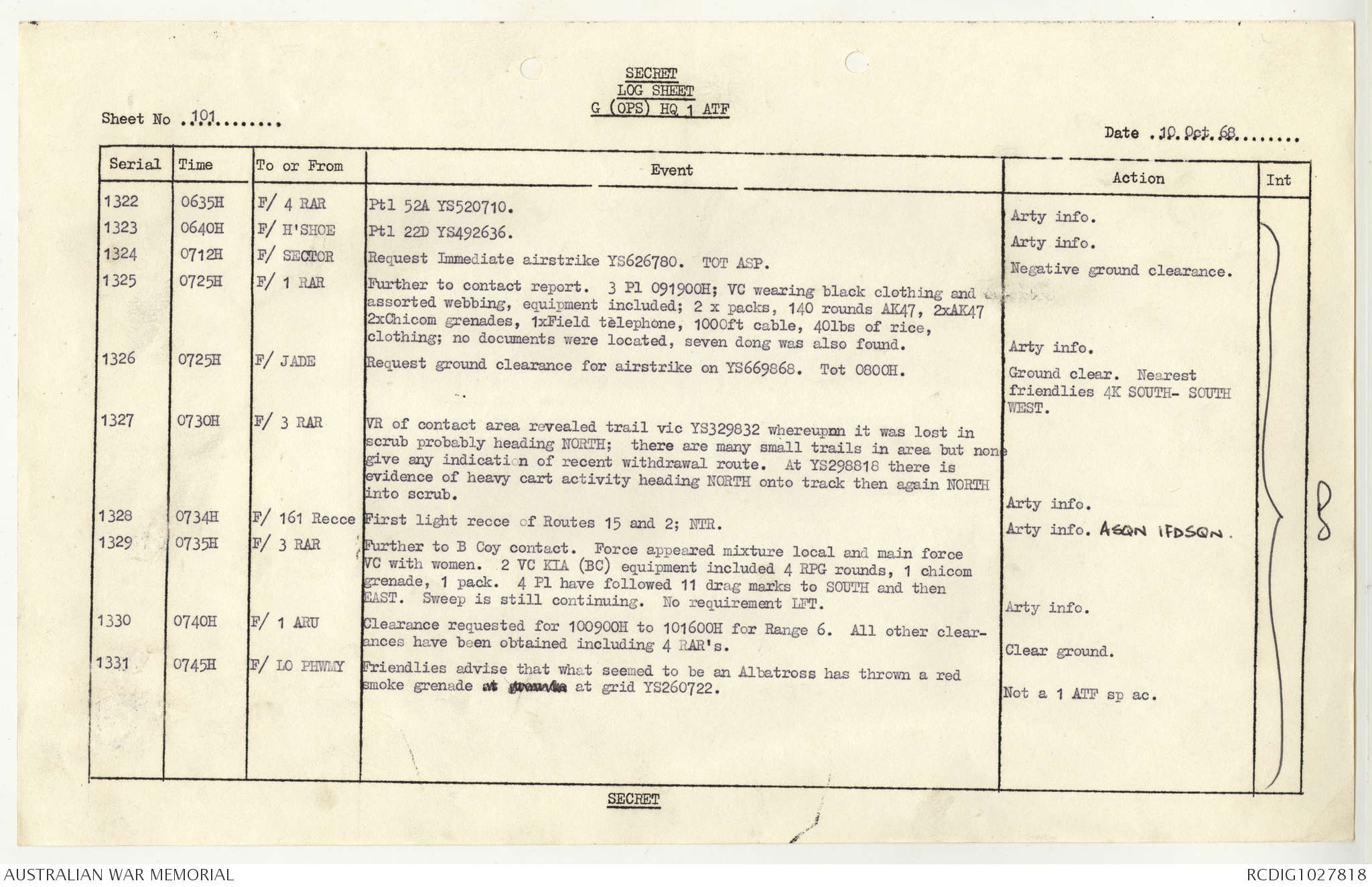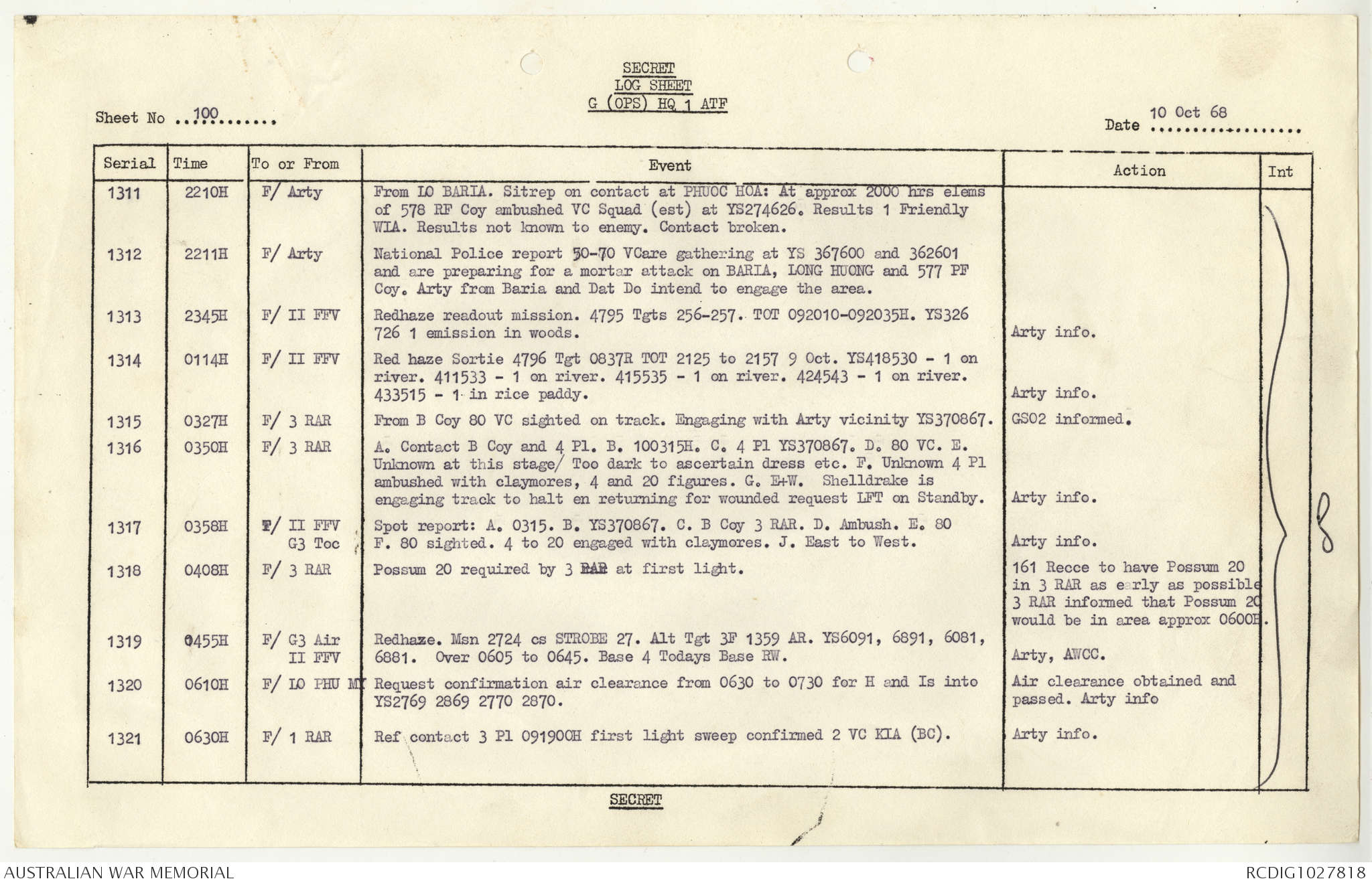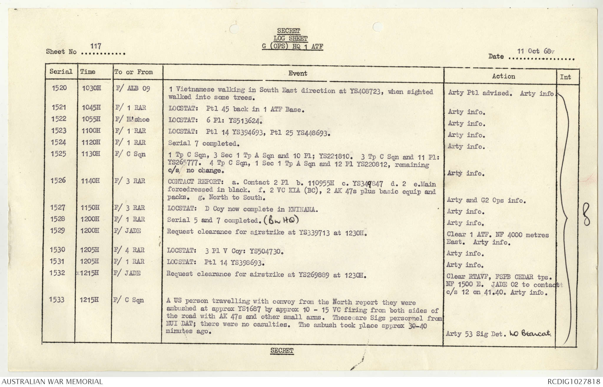 AWM95 1/4/117 - 1-31 October 1968, Narrative, Duty Officer's log
