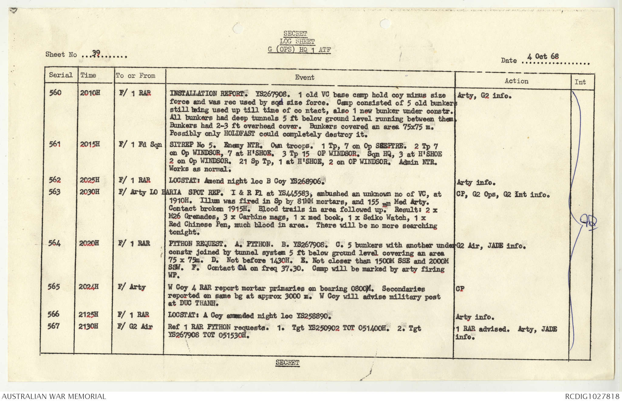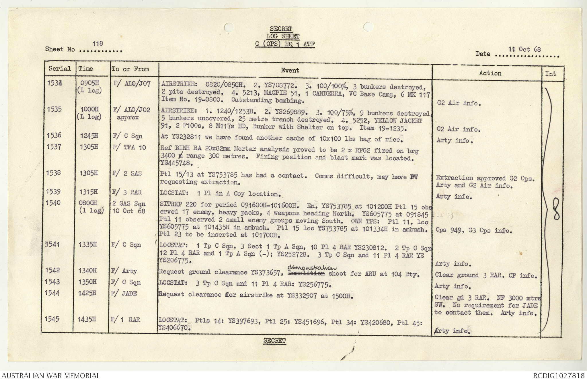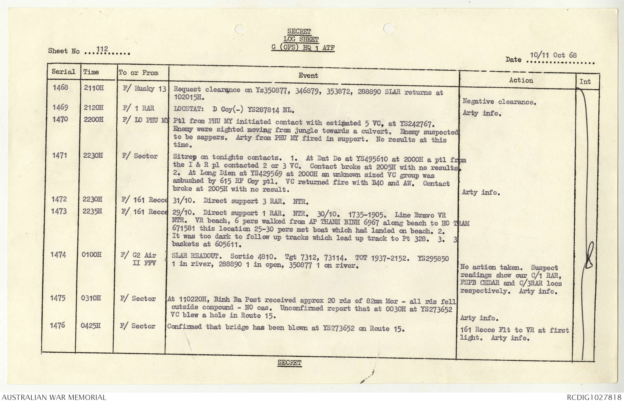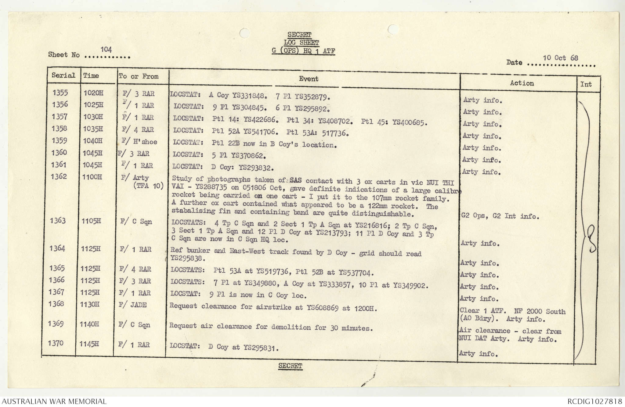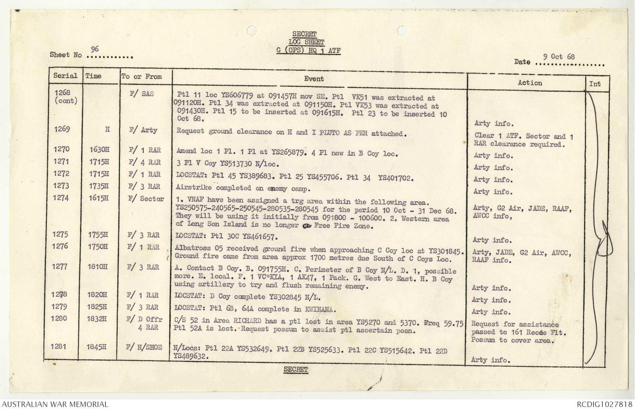 AWM95 1/4/117 - 1-31 October 1968, Narrative, Duty Officer's log