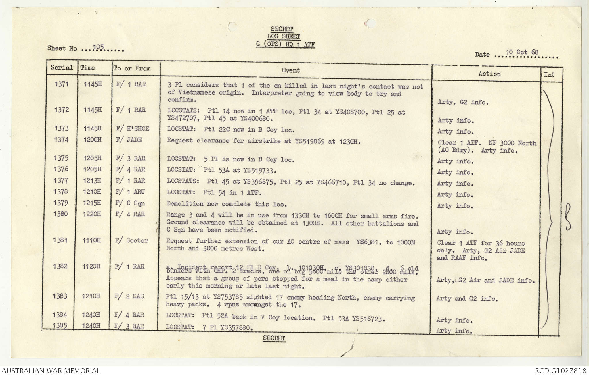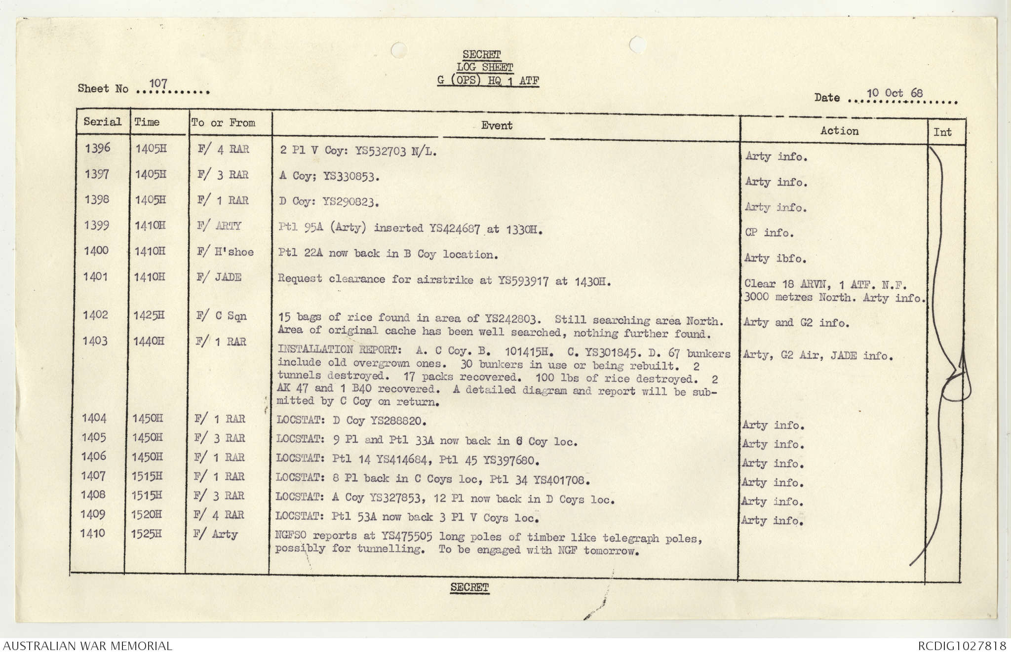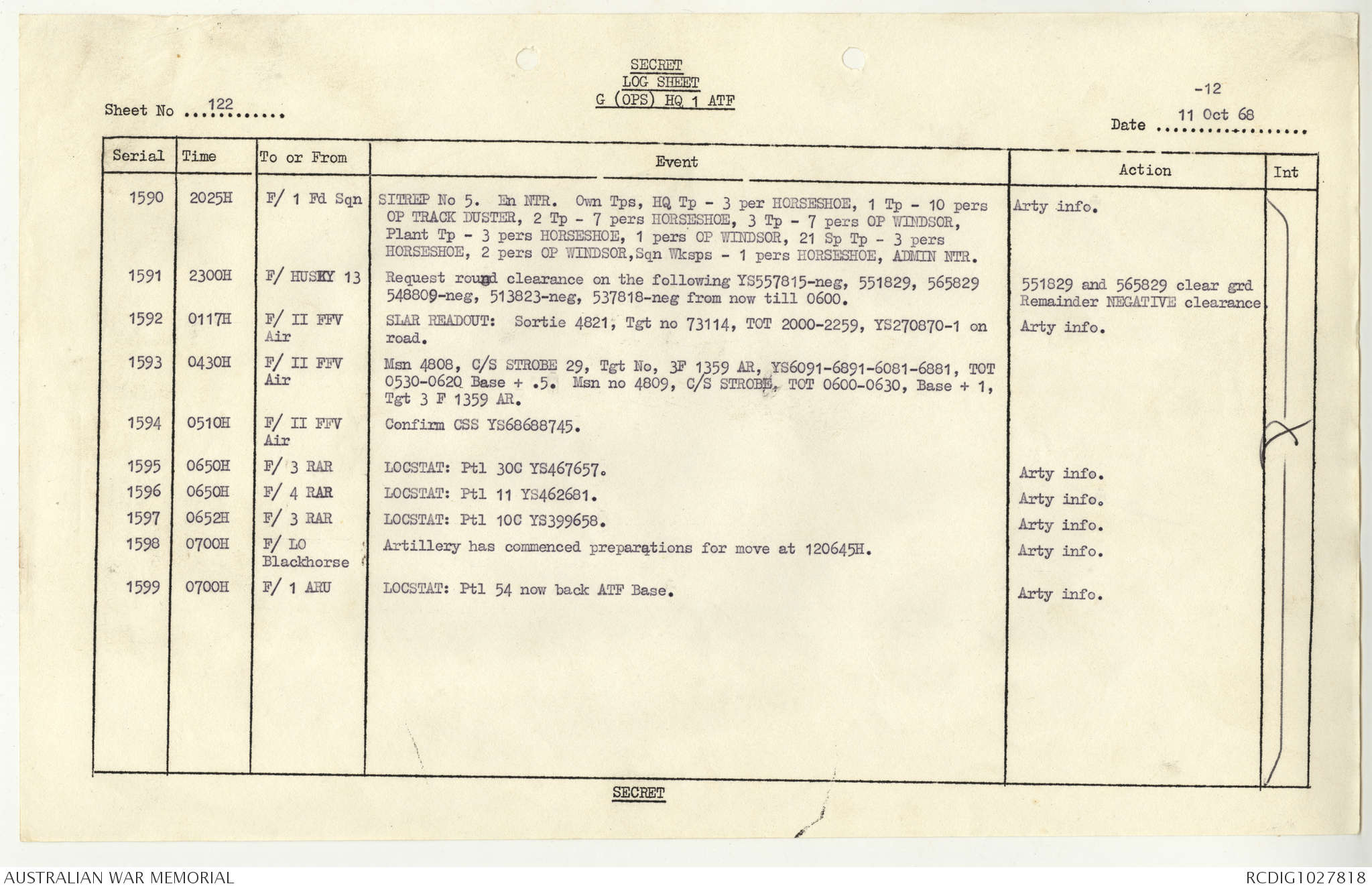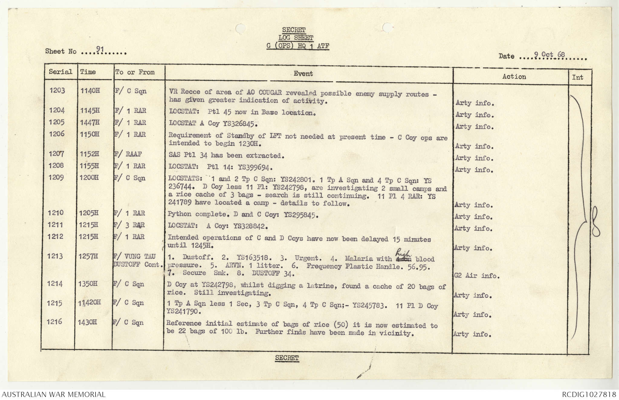 AWM95 1/4/117 - 1-31 October 1968, Narrative, Duty Officer's log