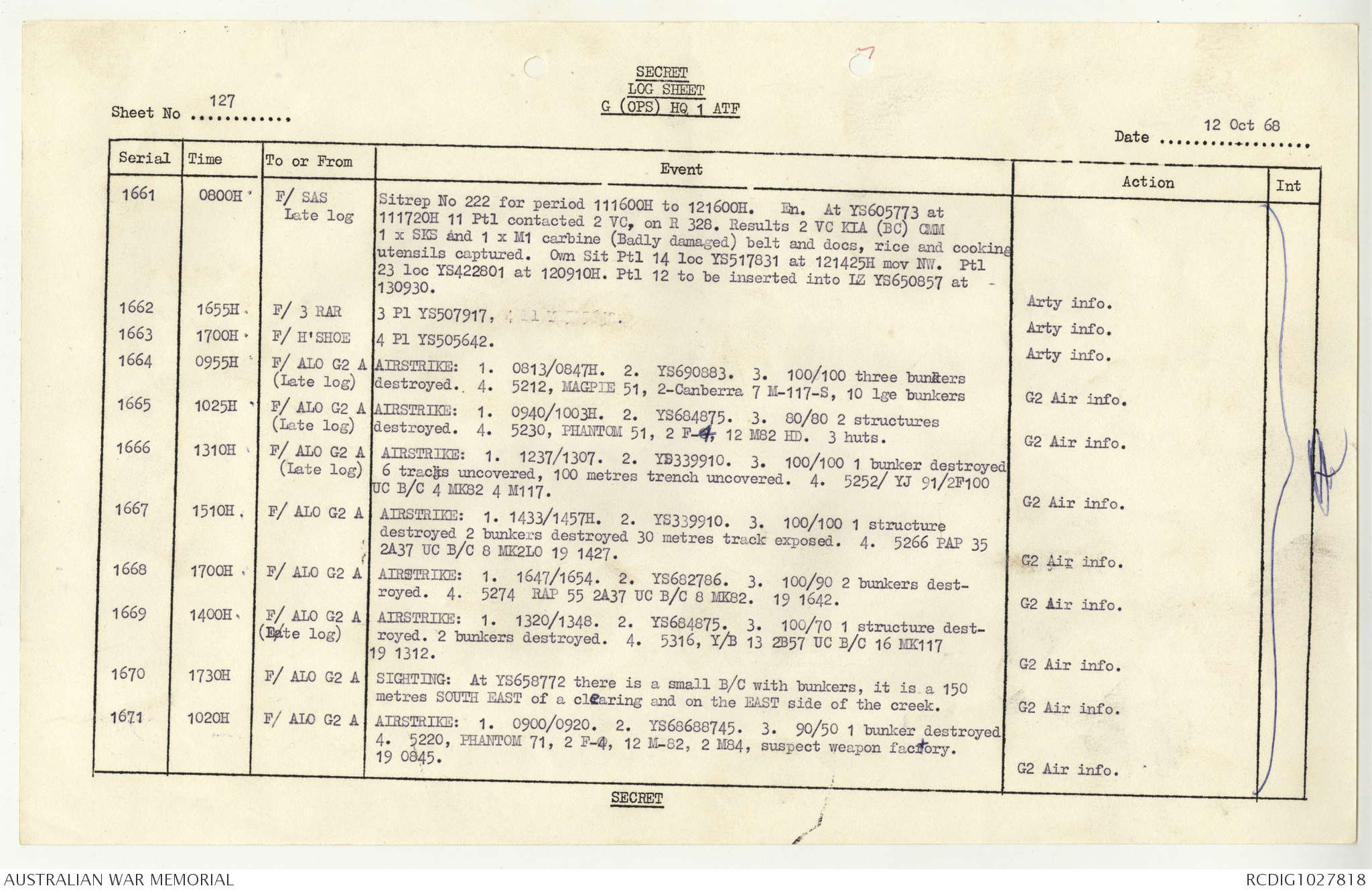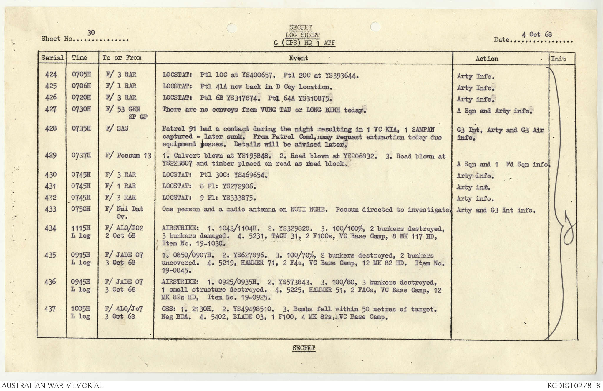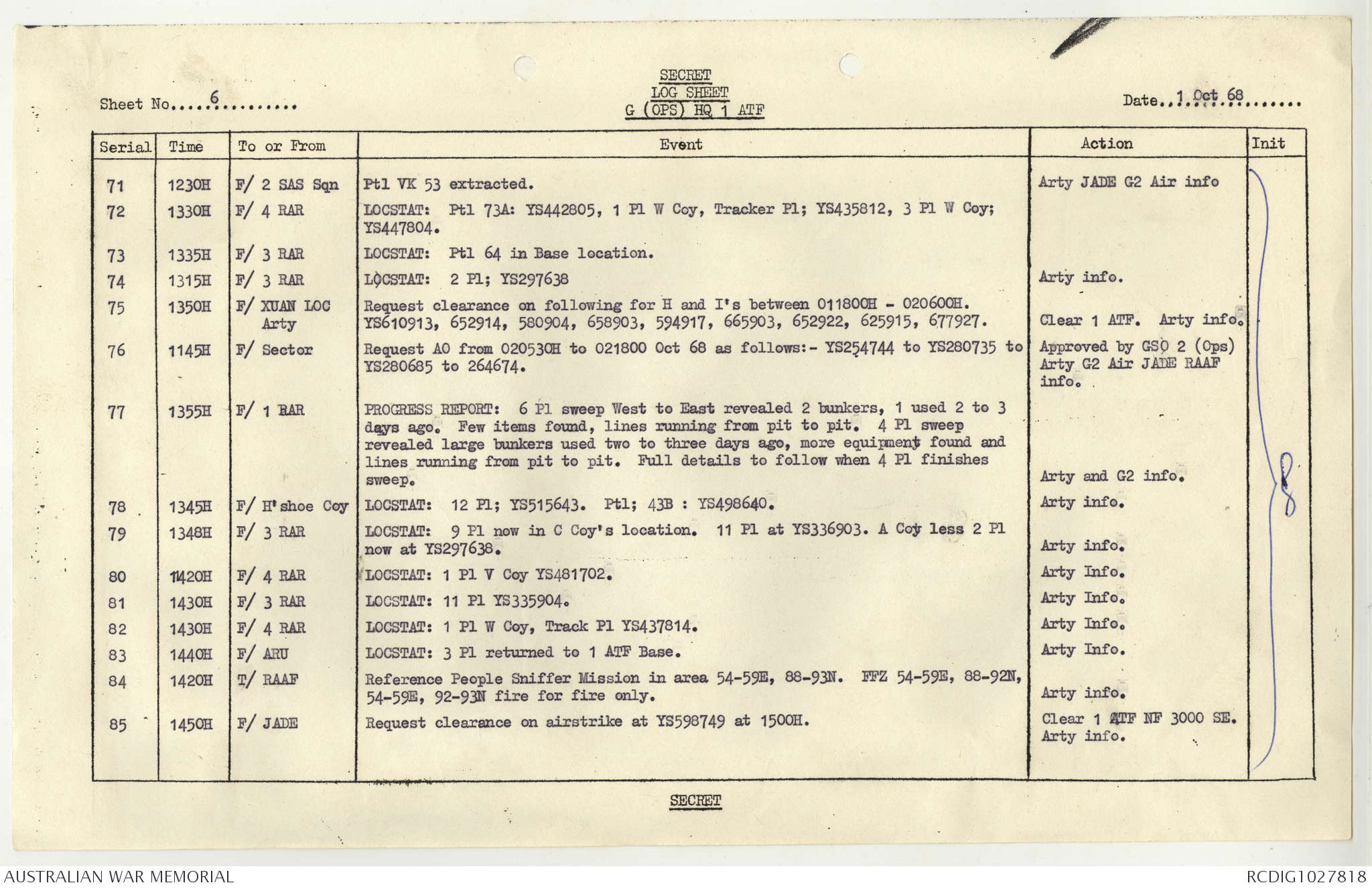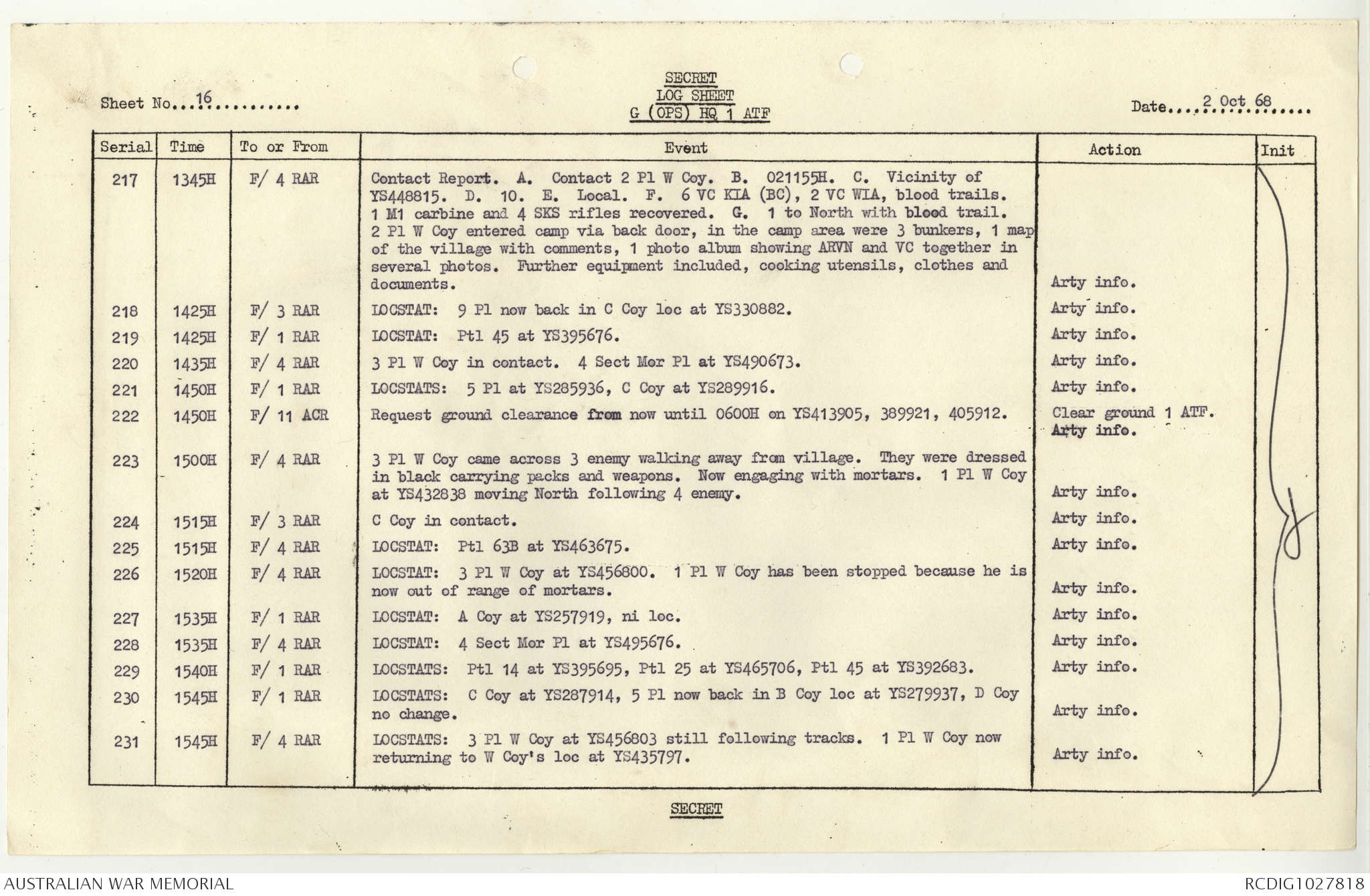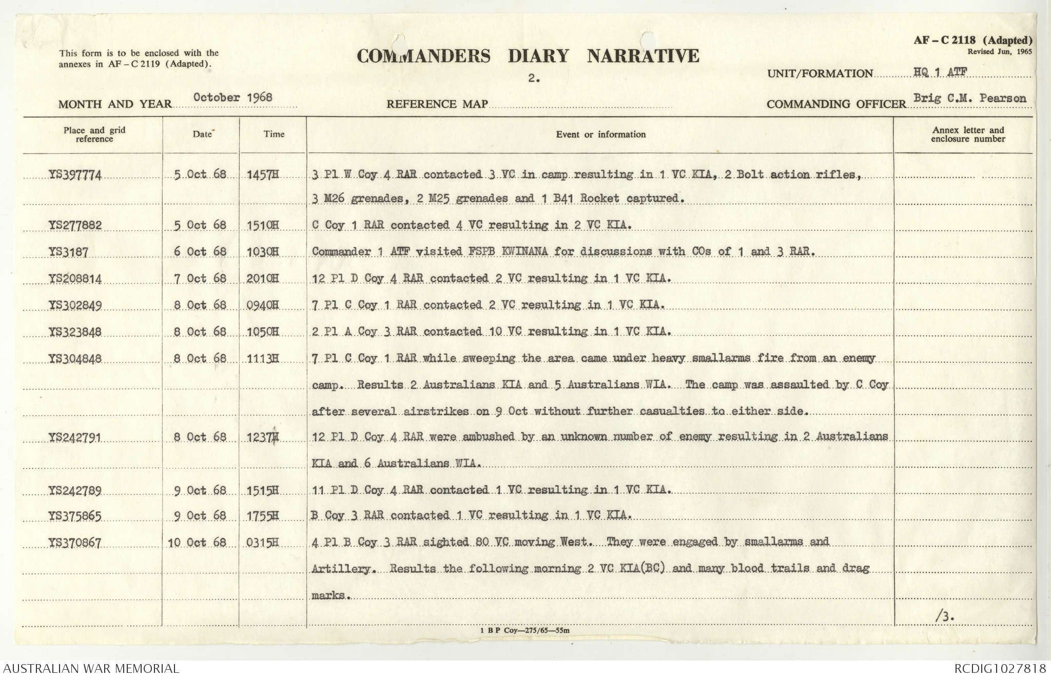 AWM95 1/4/117 - 1-31 October 1968, Narrative, Duty Officer's log