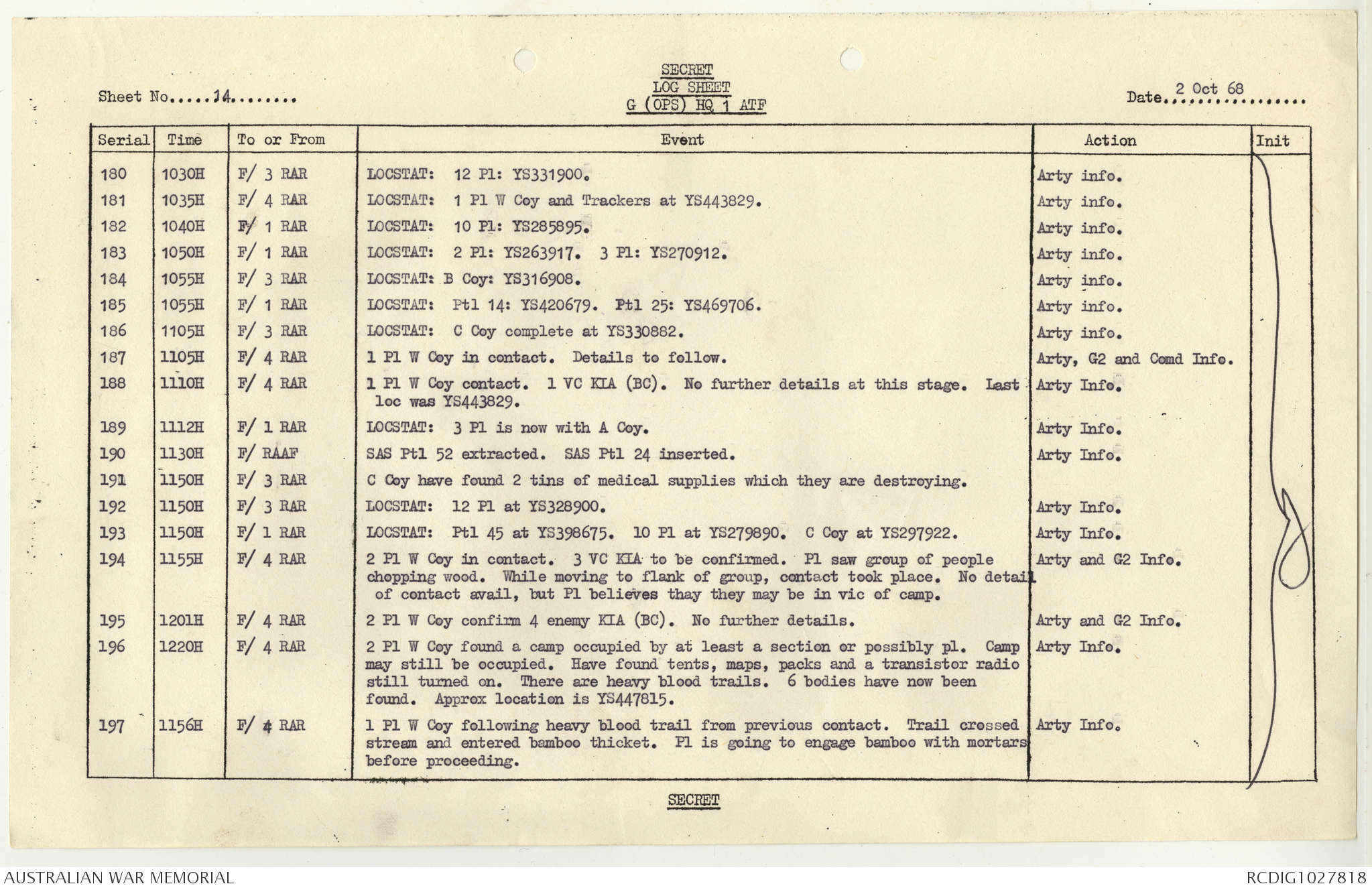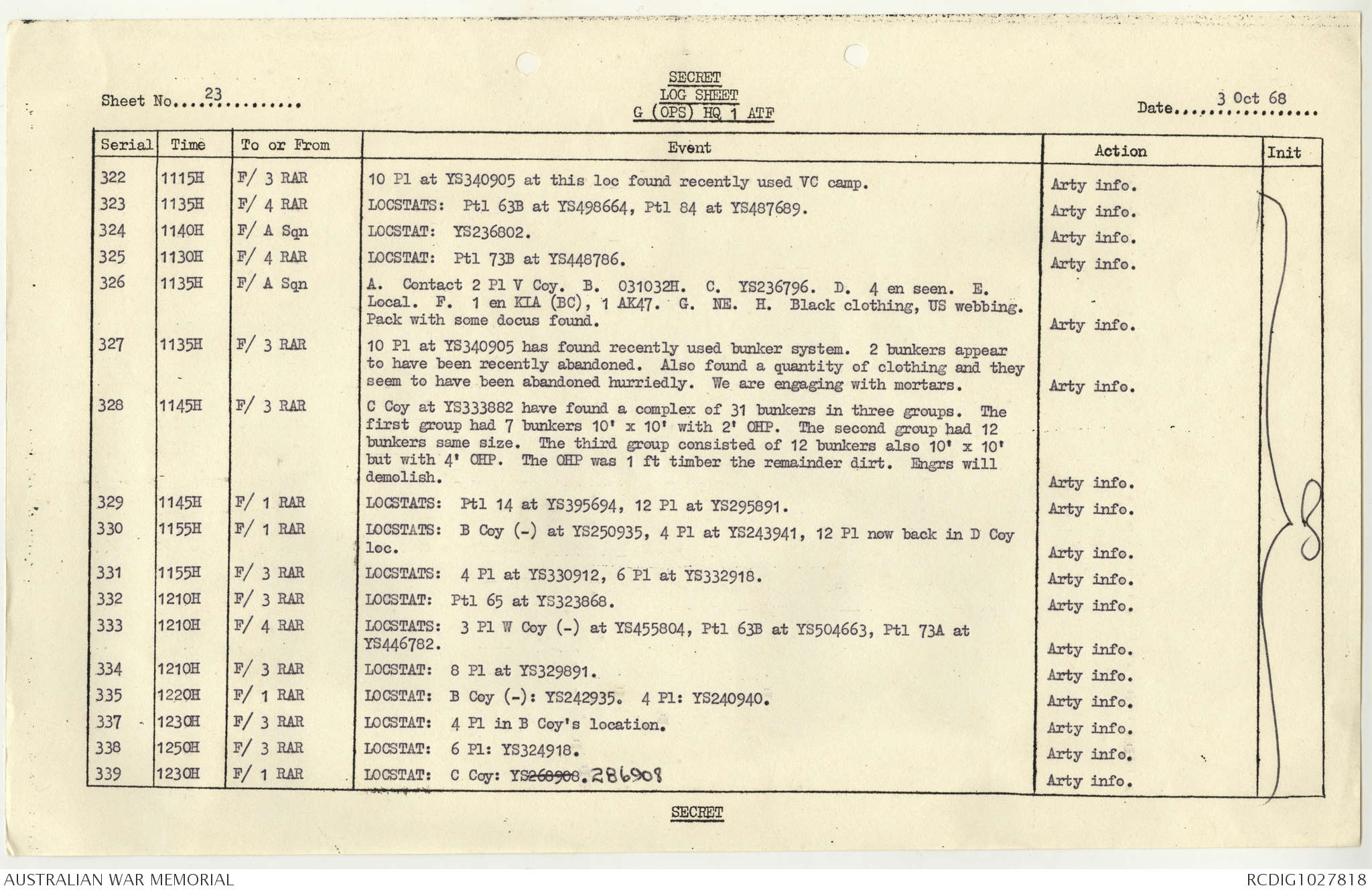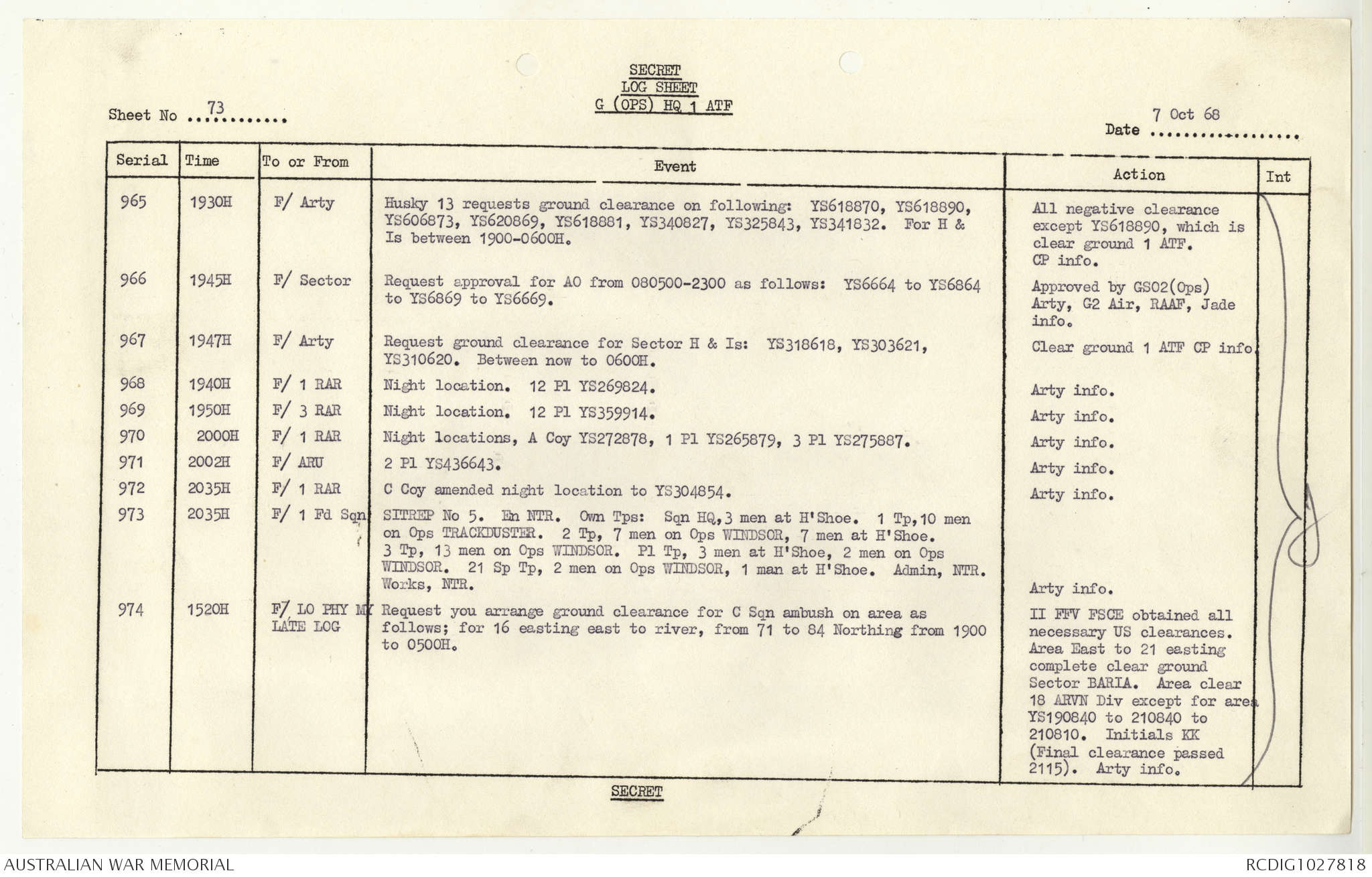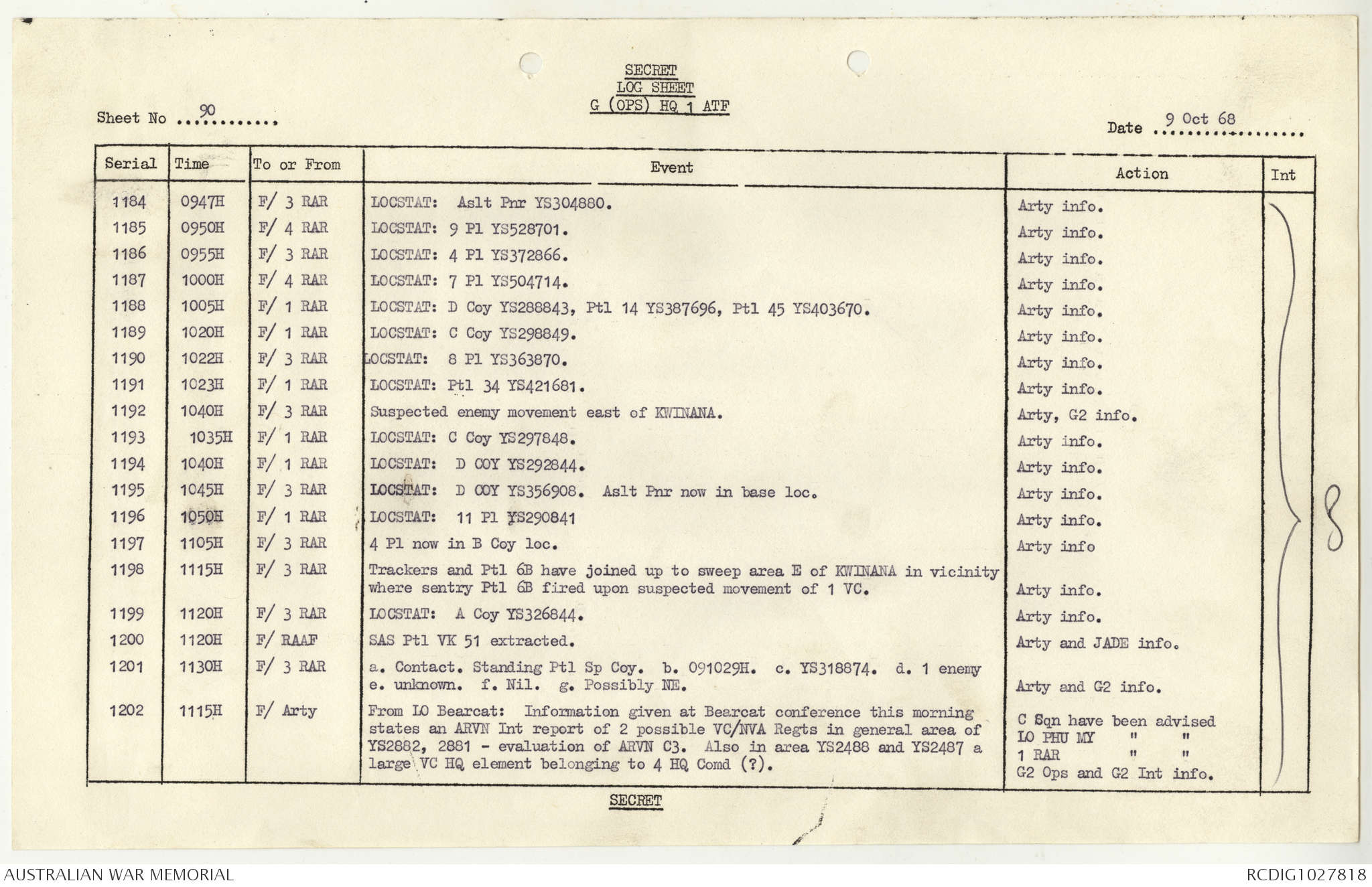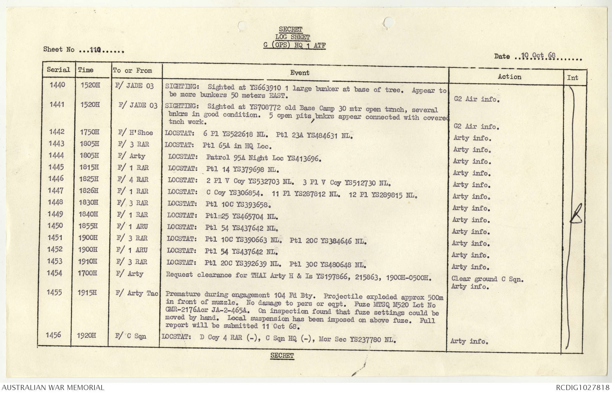 AWM95 1/4/117 - 1-31 October 1968, Narrative, Duty Officer's log
