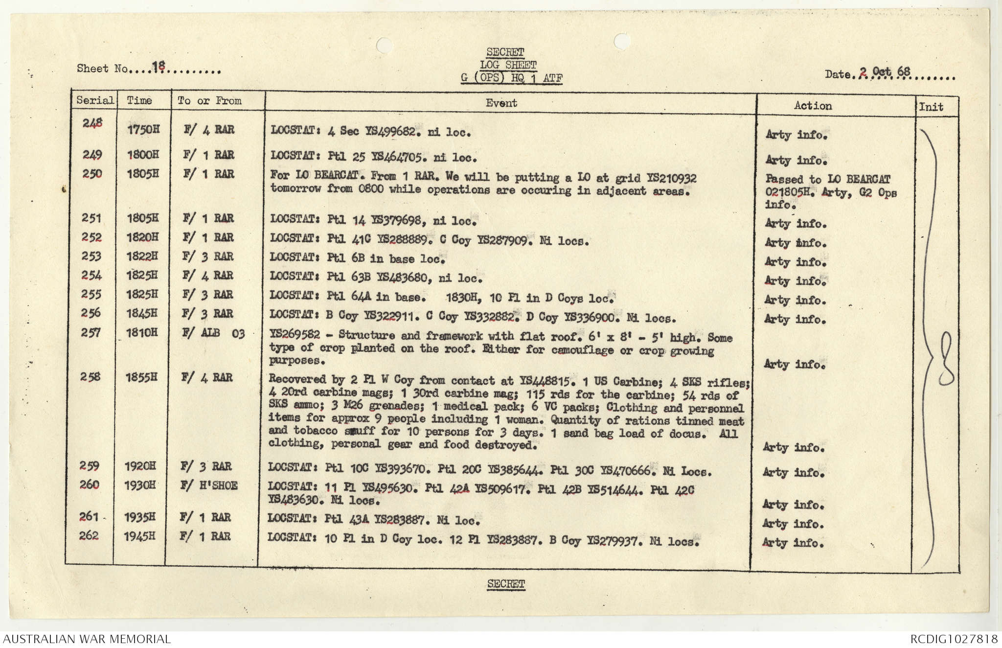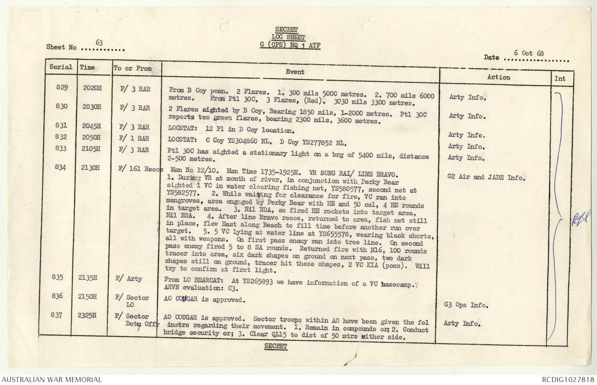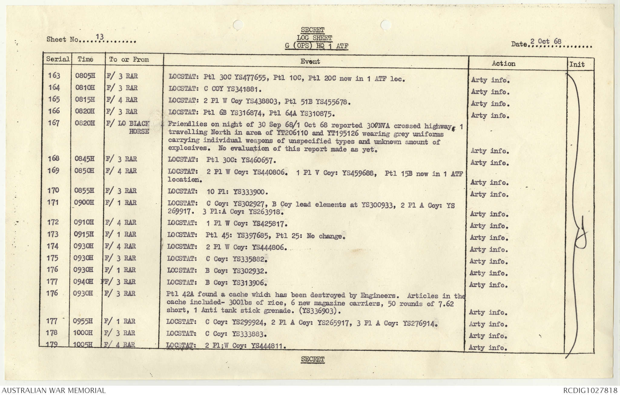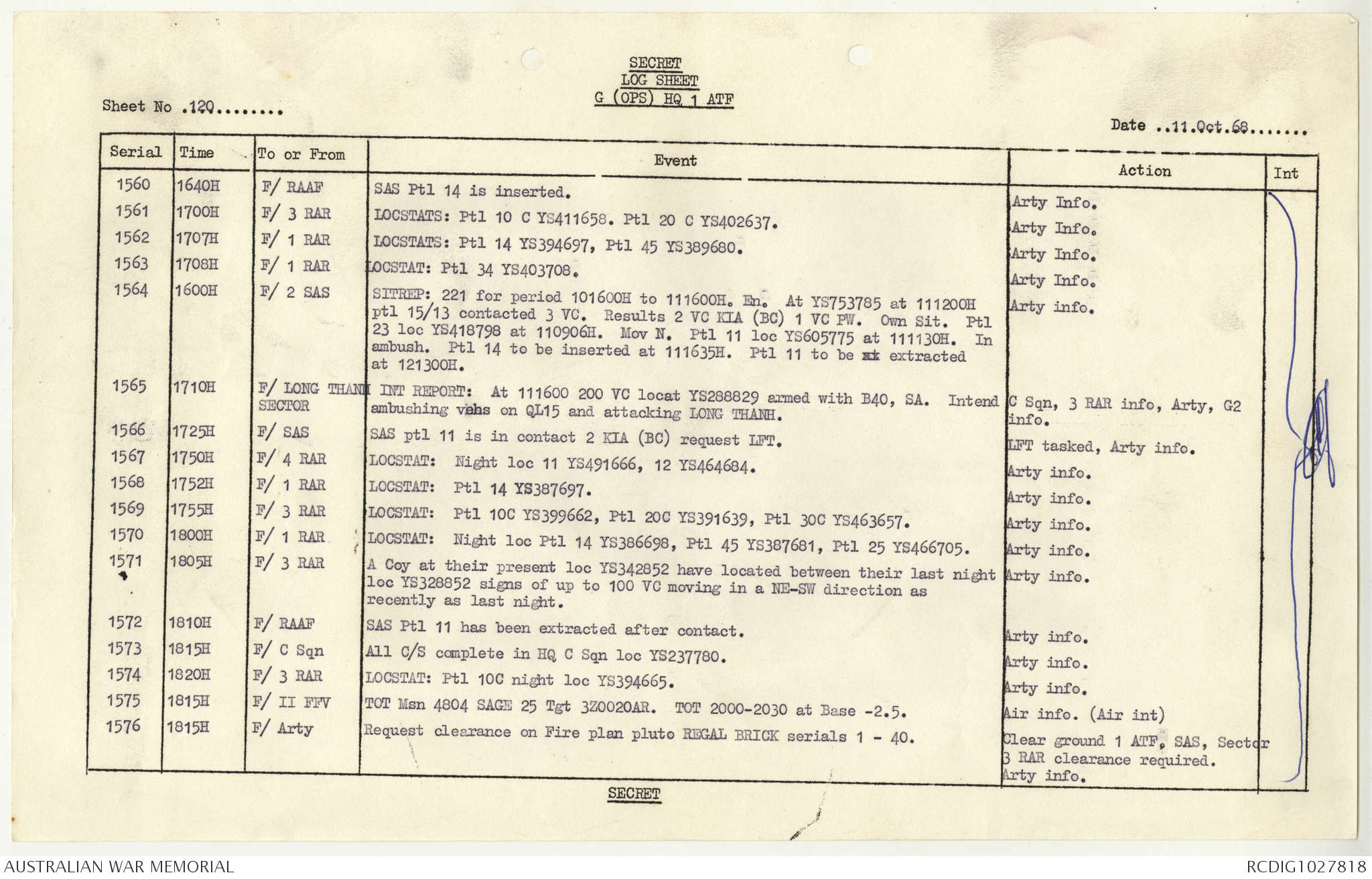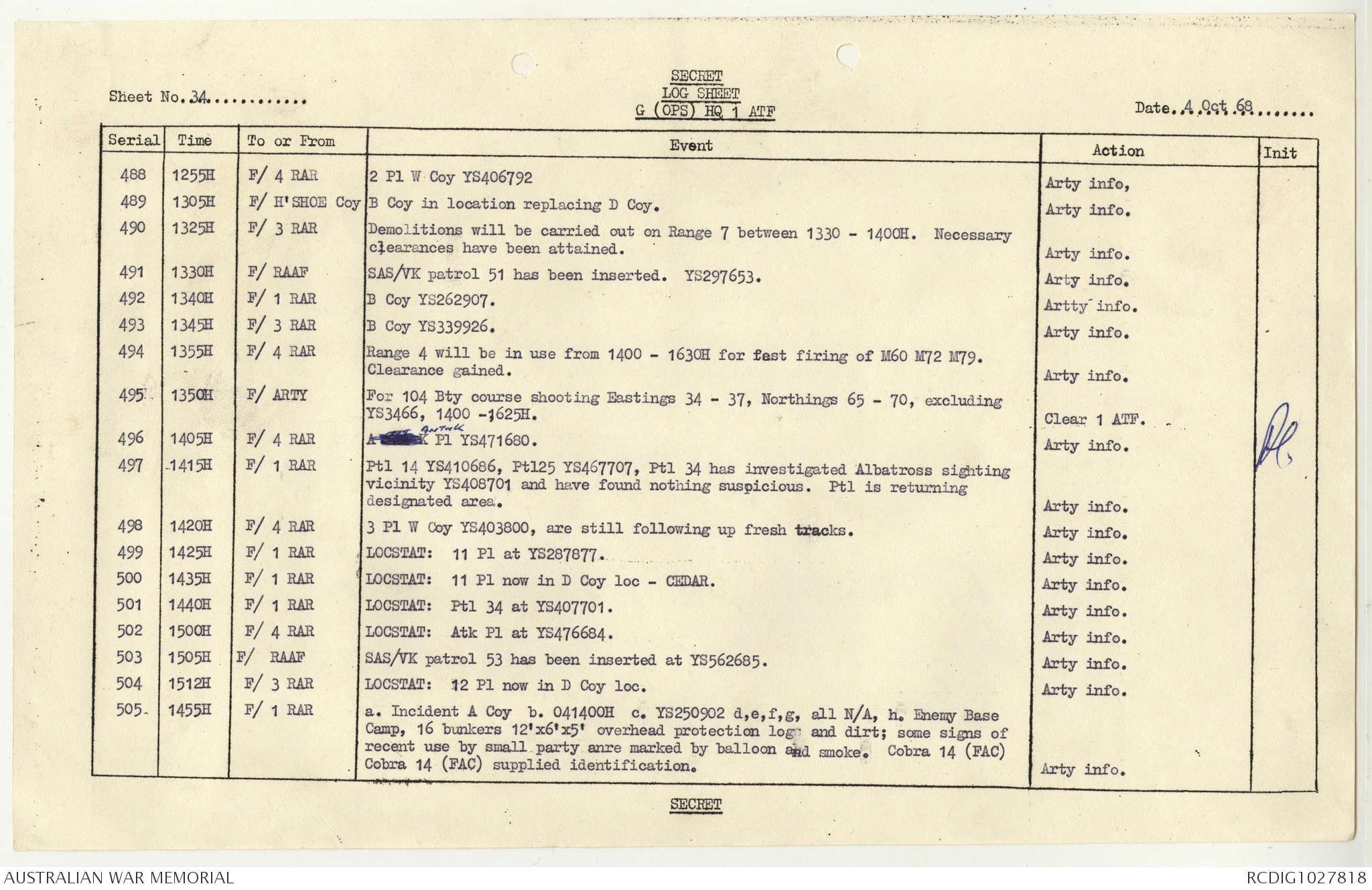 AWM95 1/4/117 - 1-31 October 1968, Narrative, Duty Officer's log