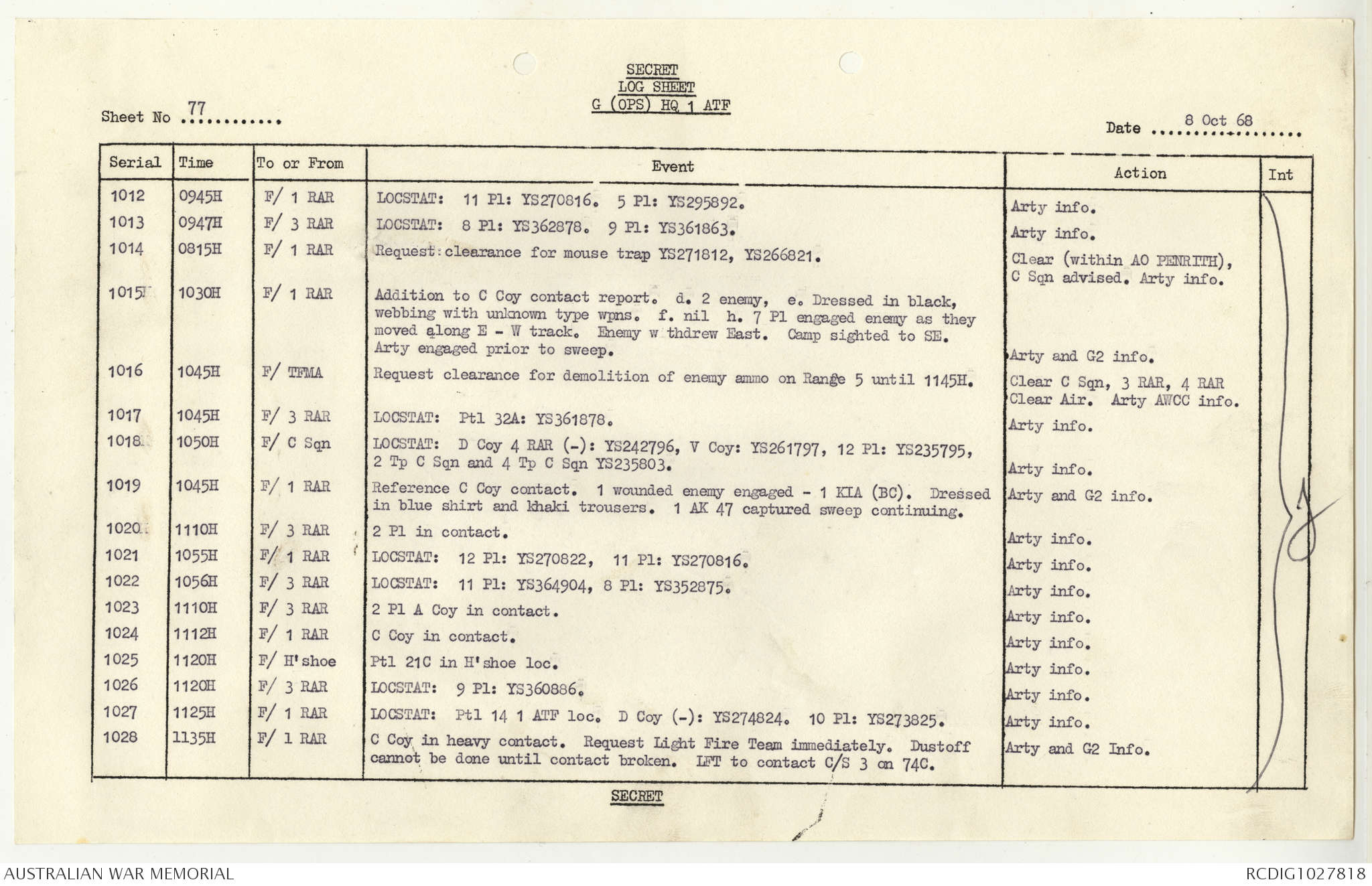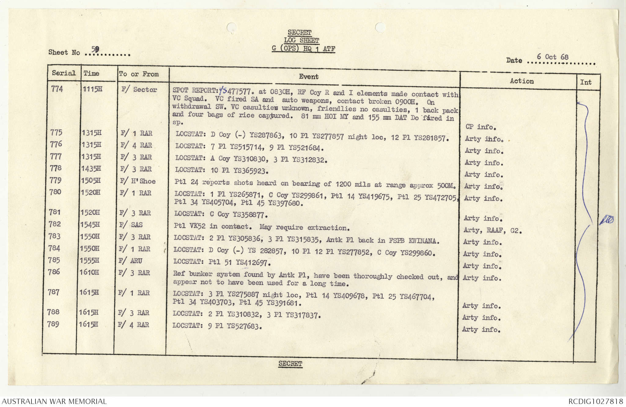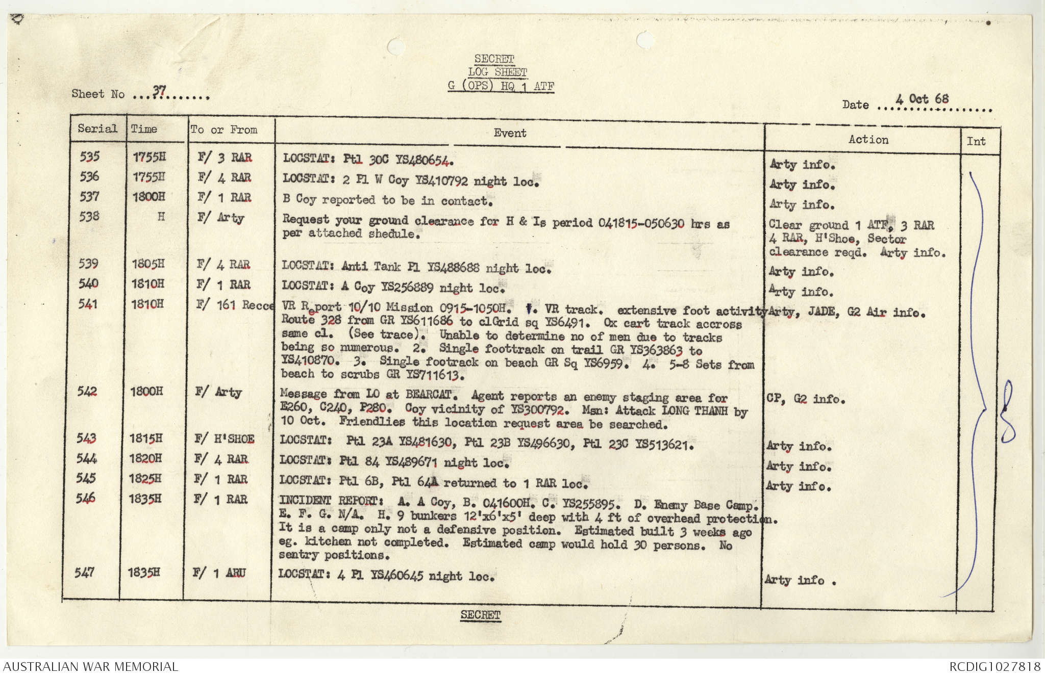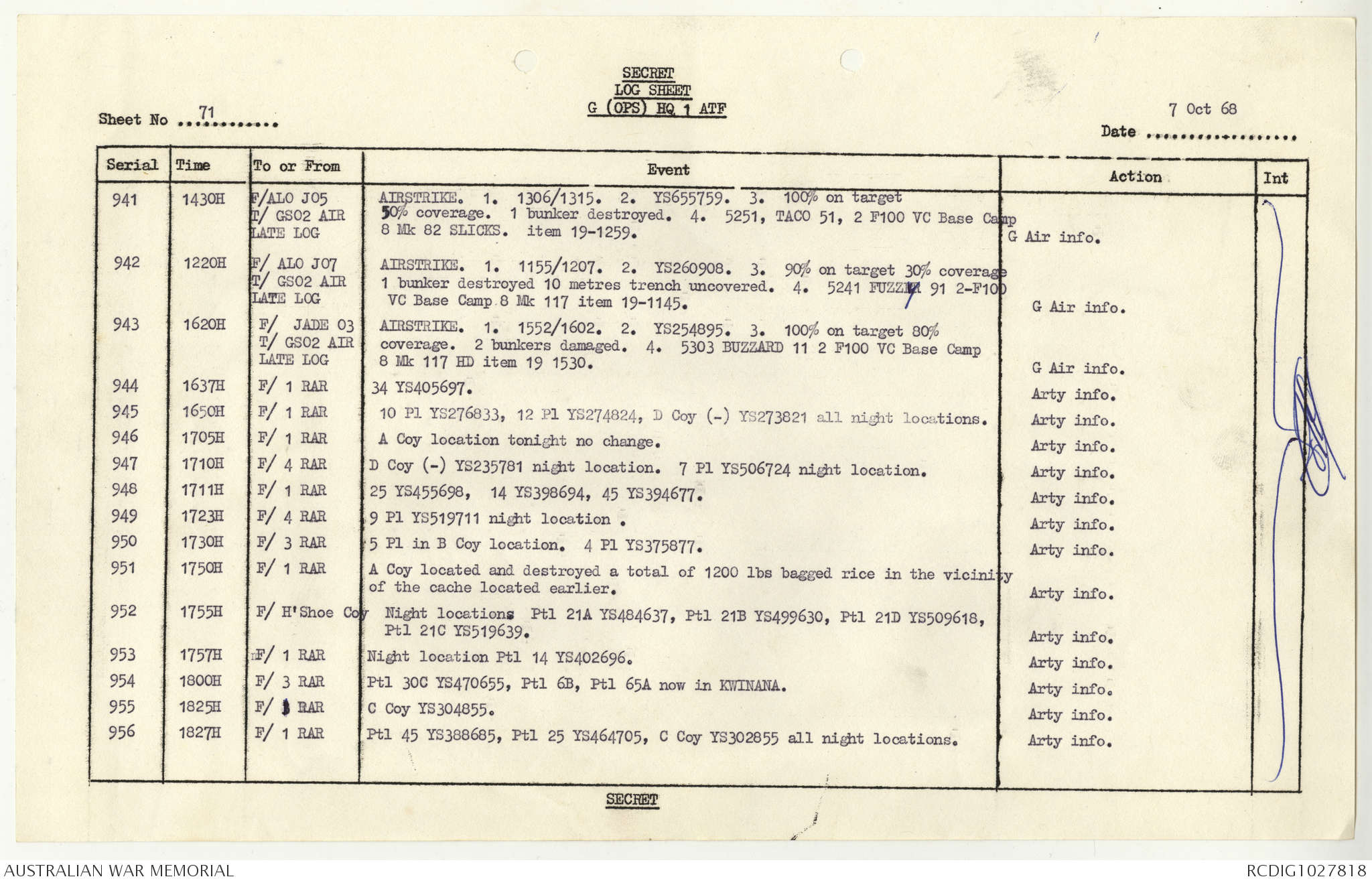 AWM95 1/4/117 - 1-31 October 1968, Narrative, Duty Officer's log