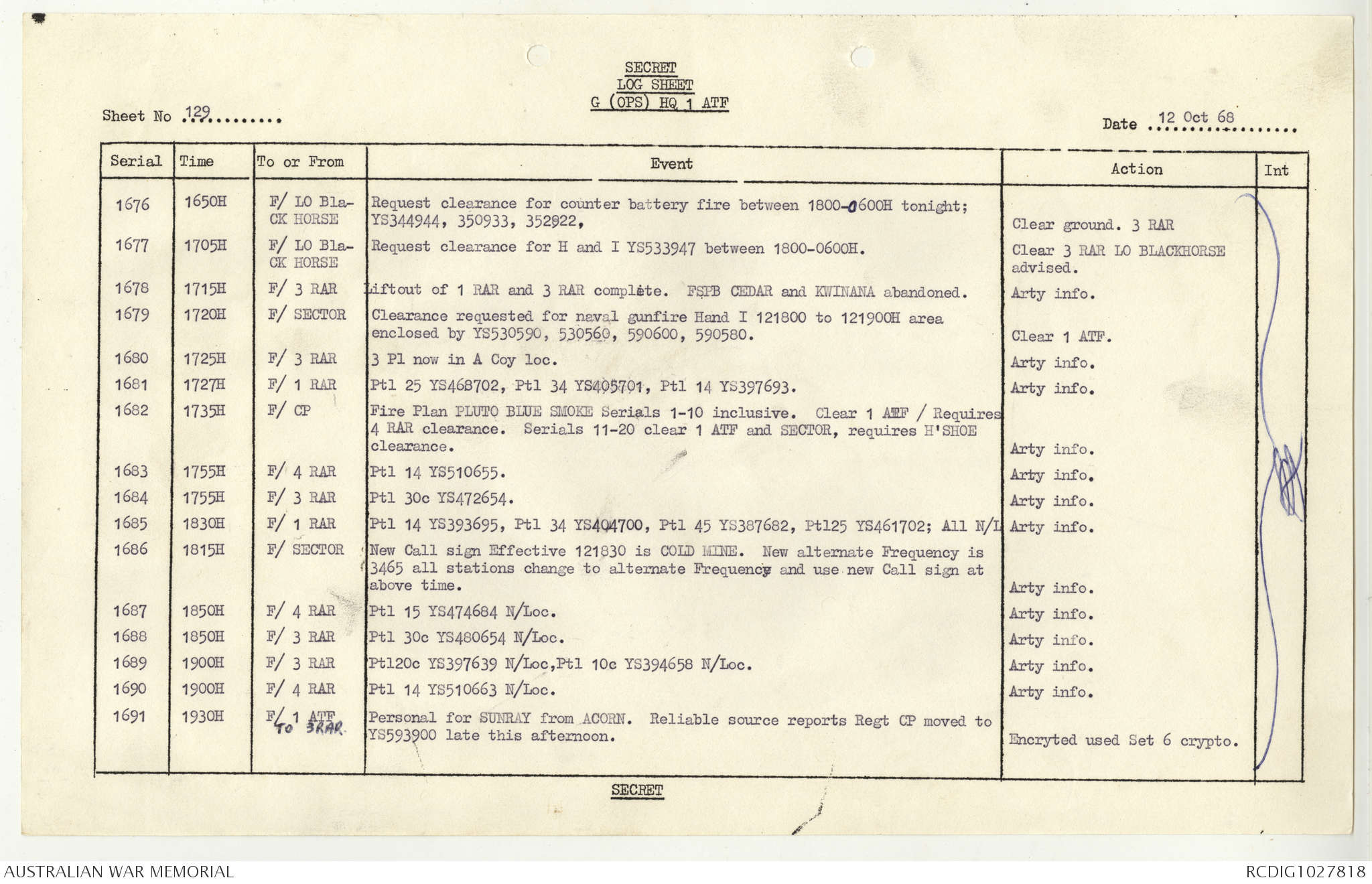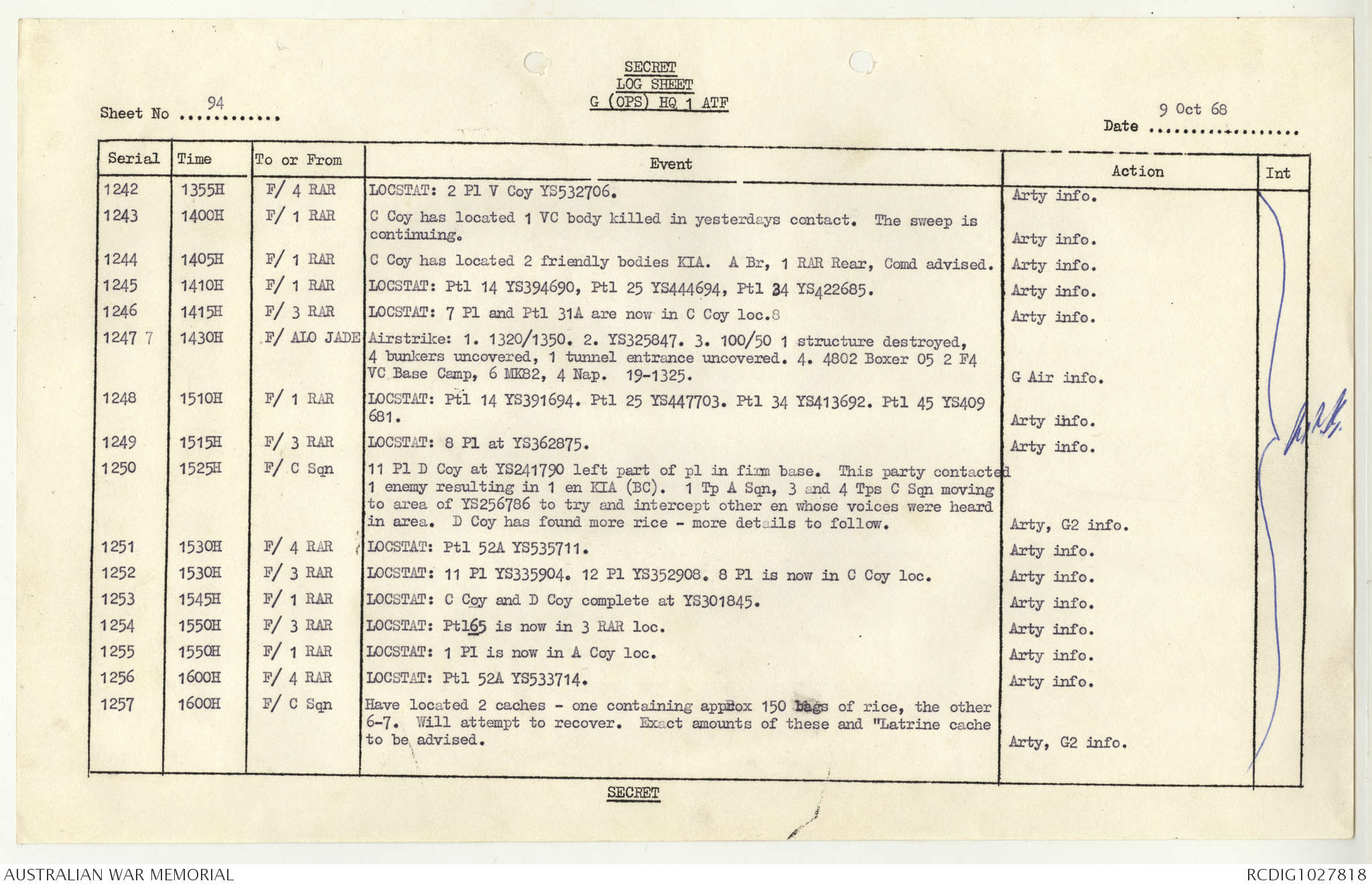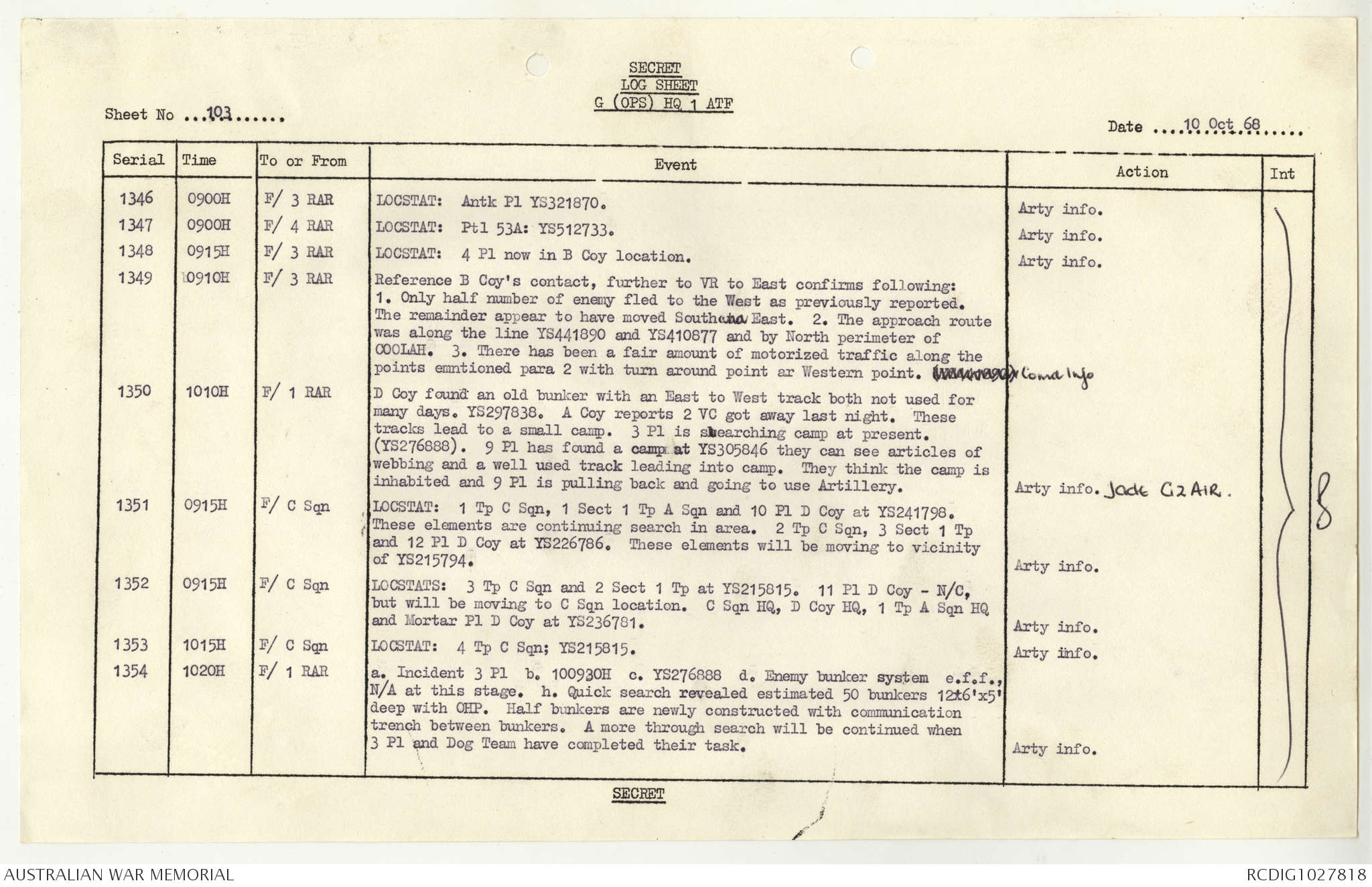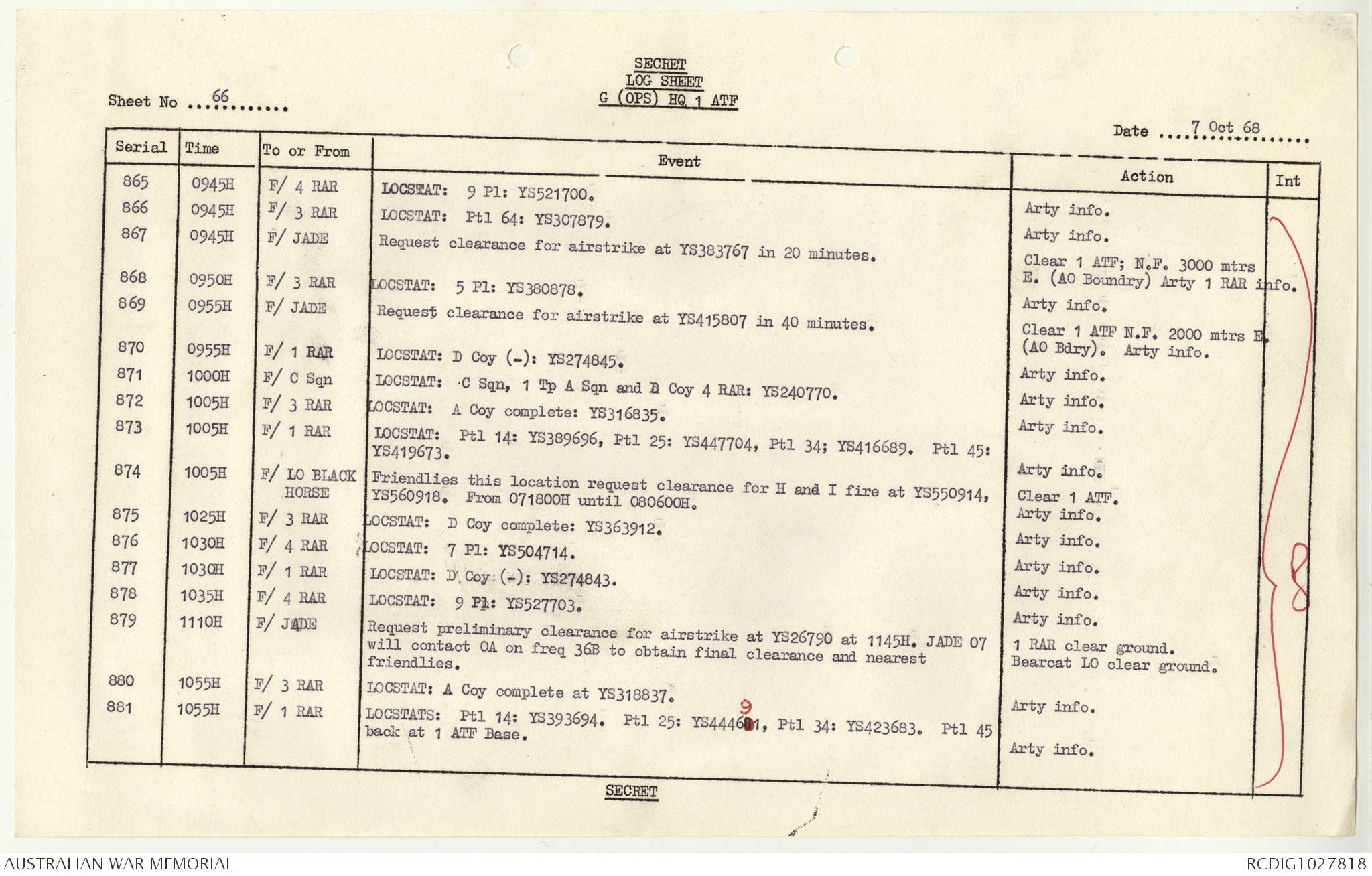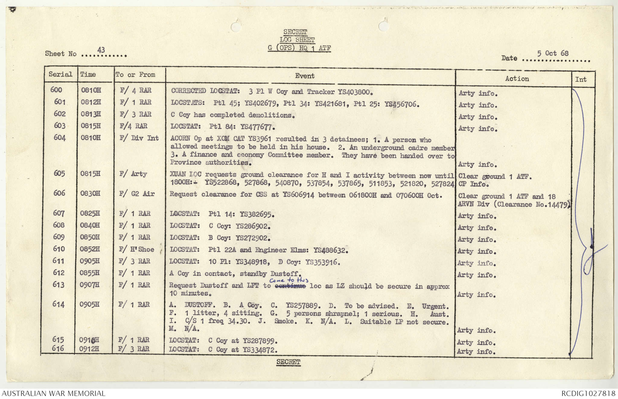 AWM95 1/4/117 - 1-31 October 1968, Narrative, Duty Officer's log