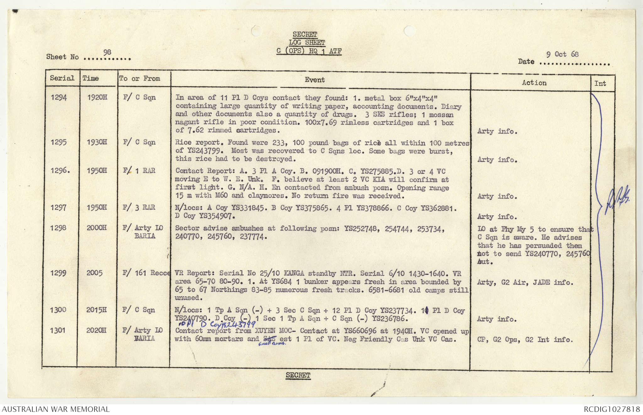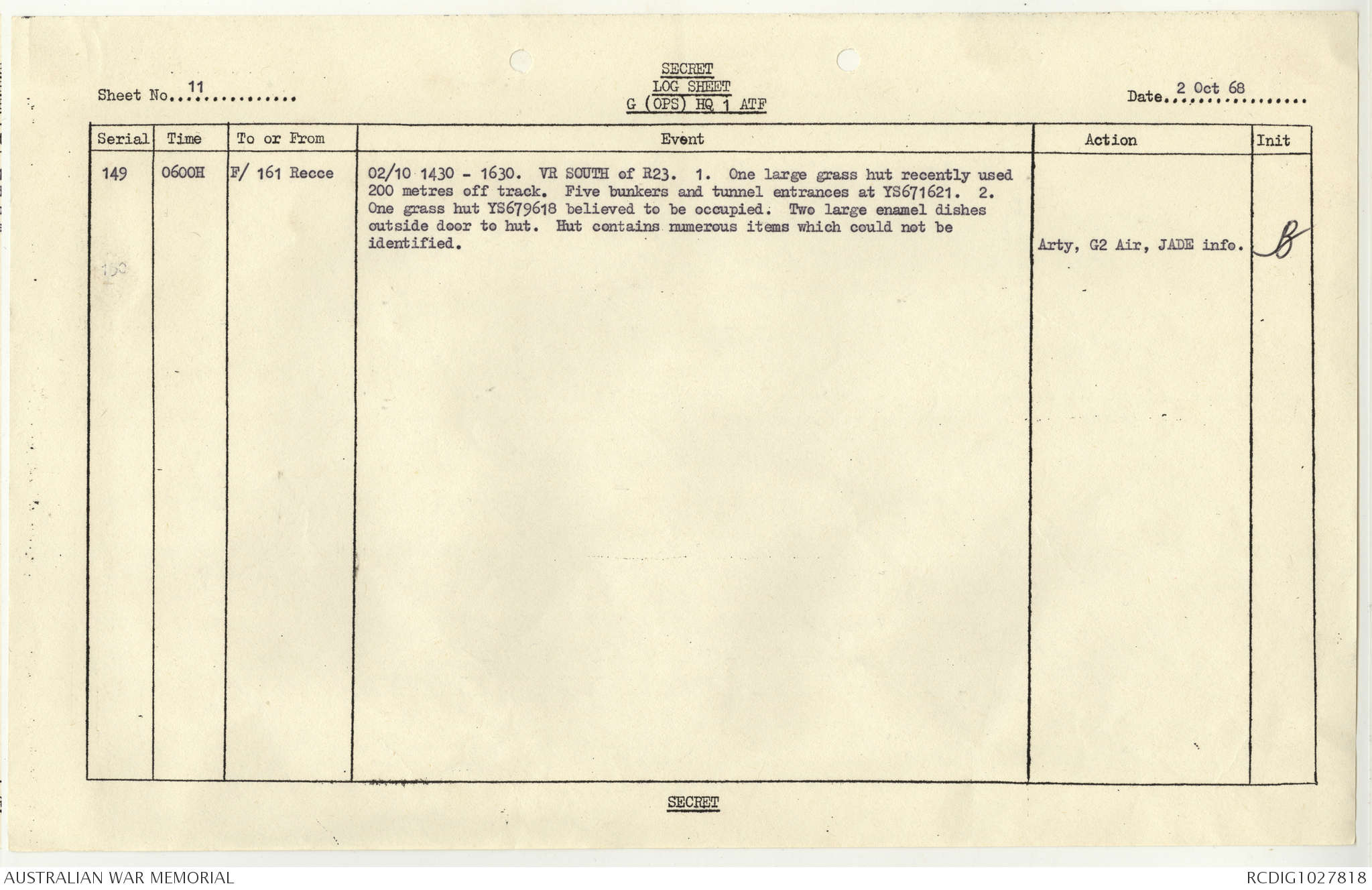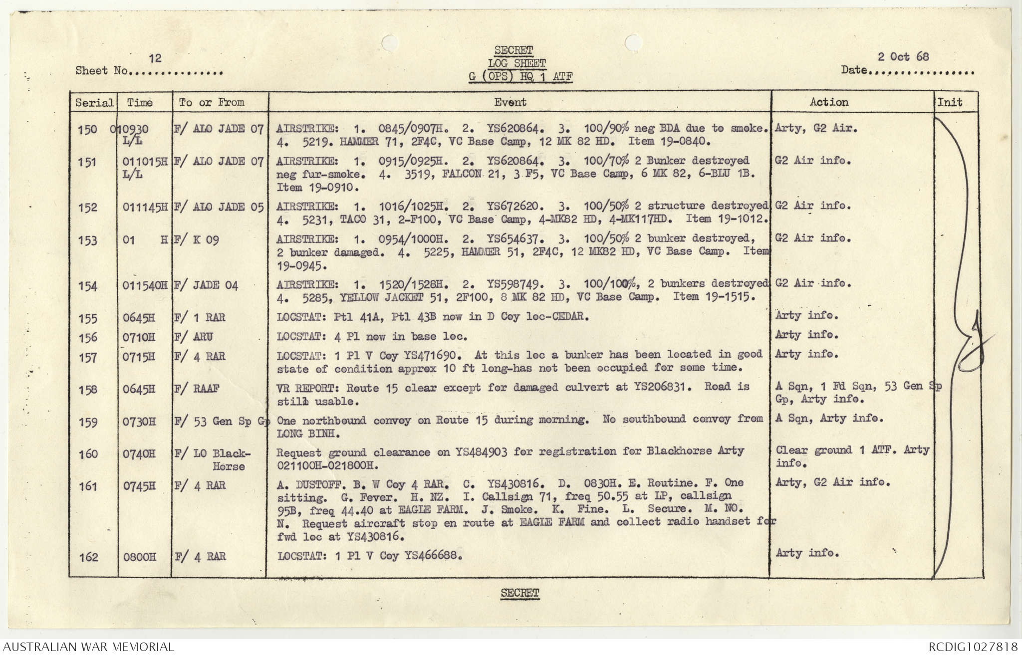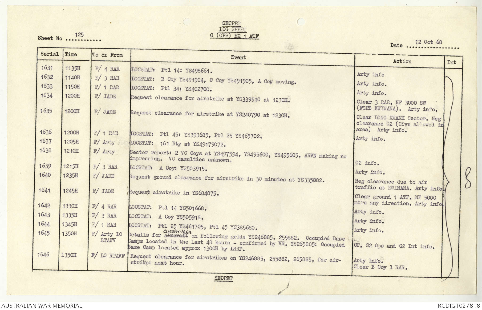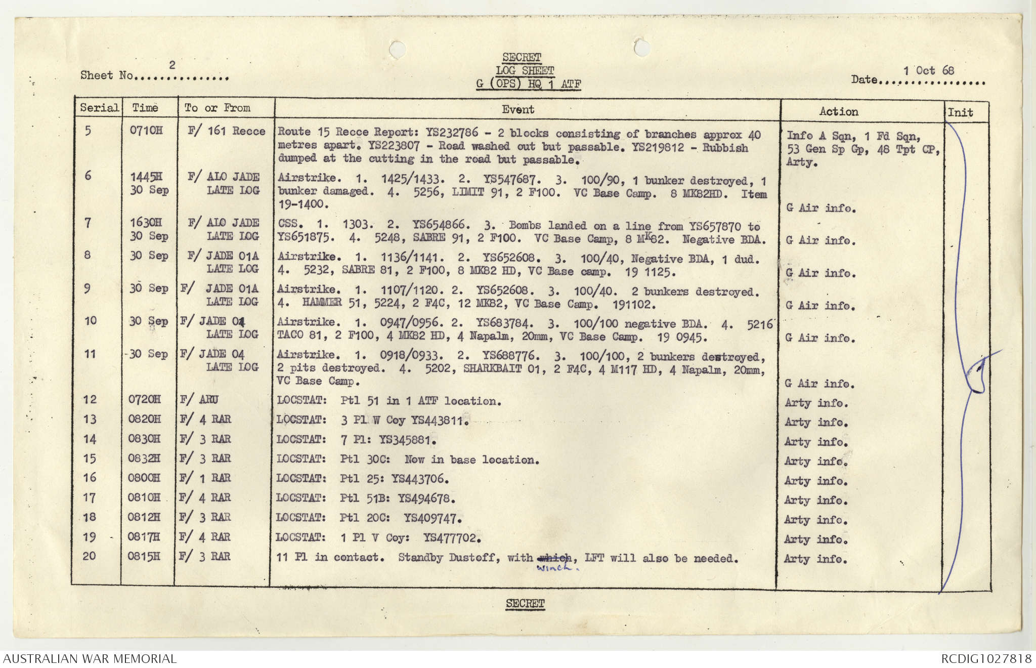 AWM95 1/4/117 - 1-31 October 1968, Narrative, Duty Officer's log