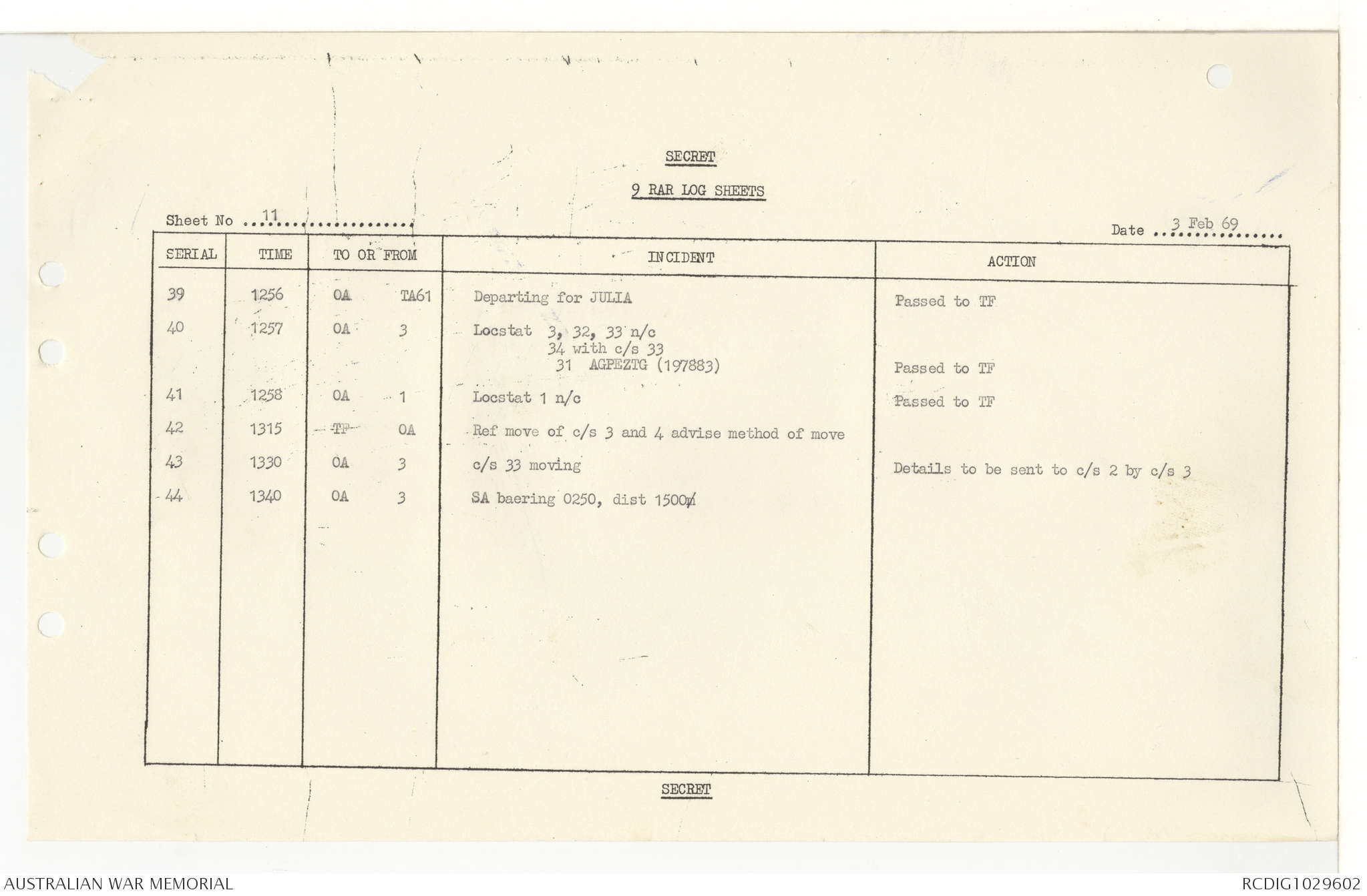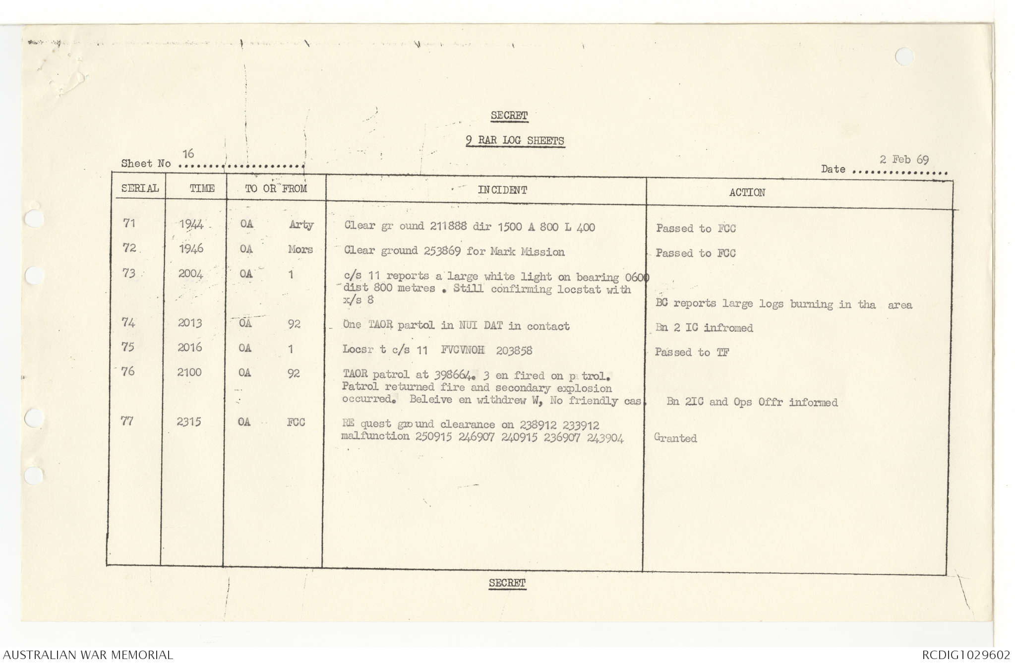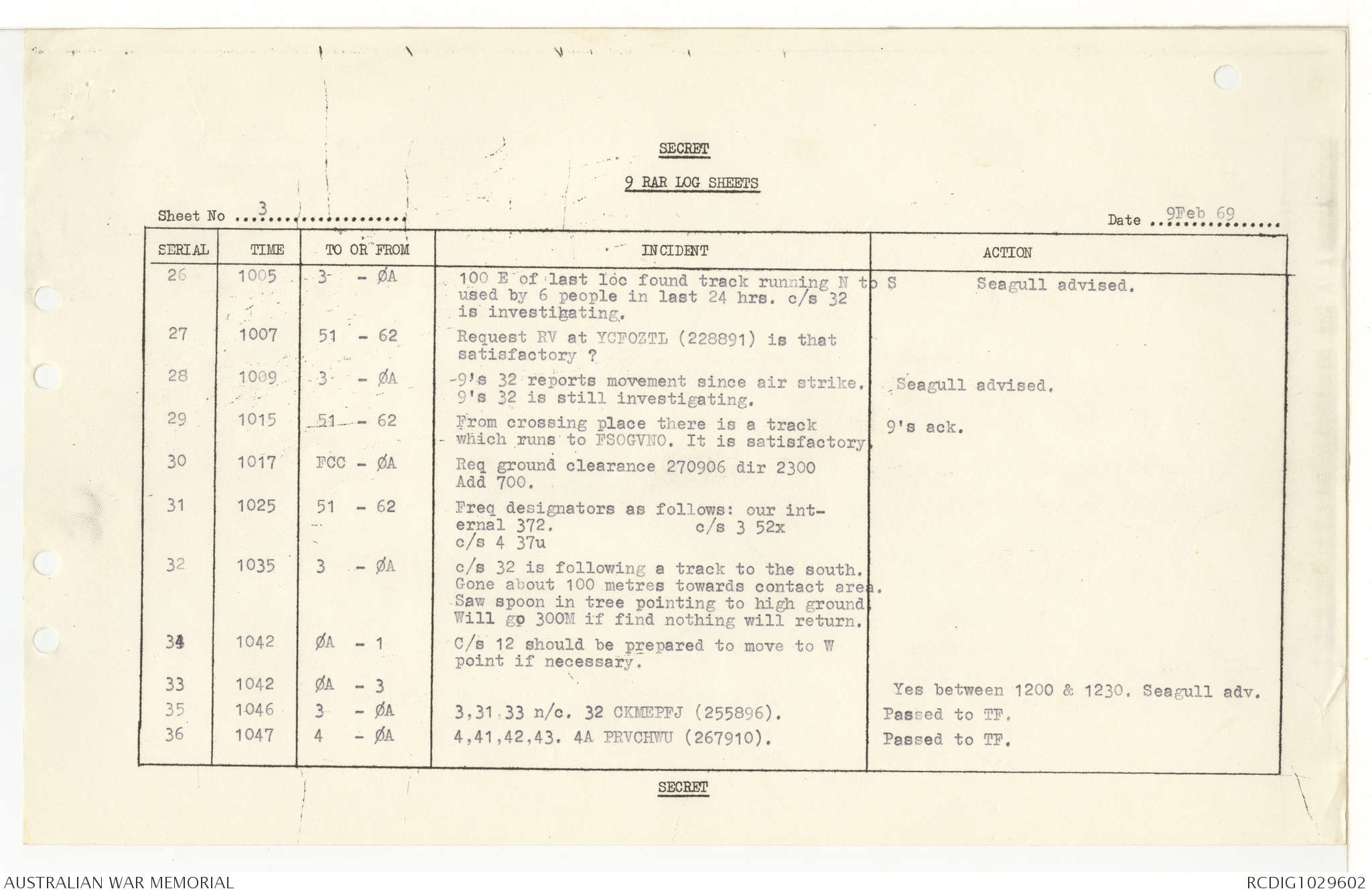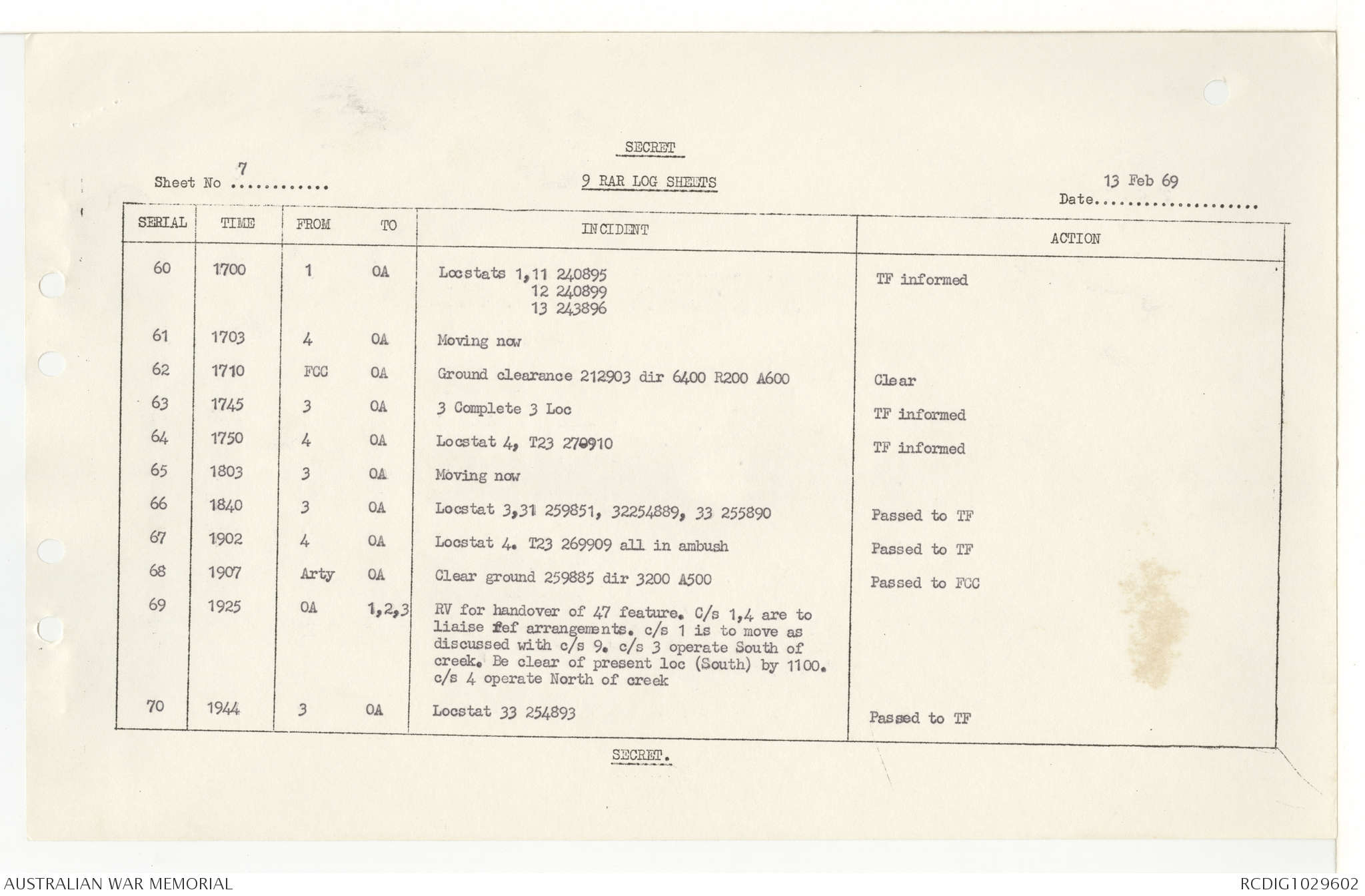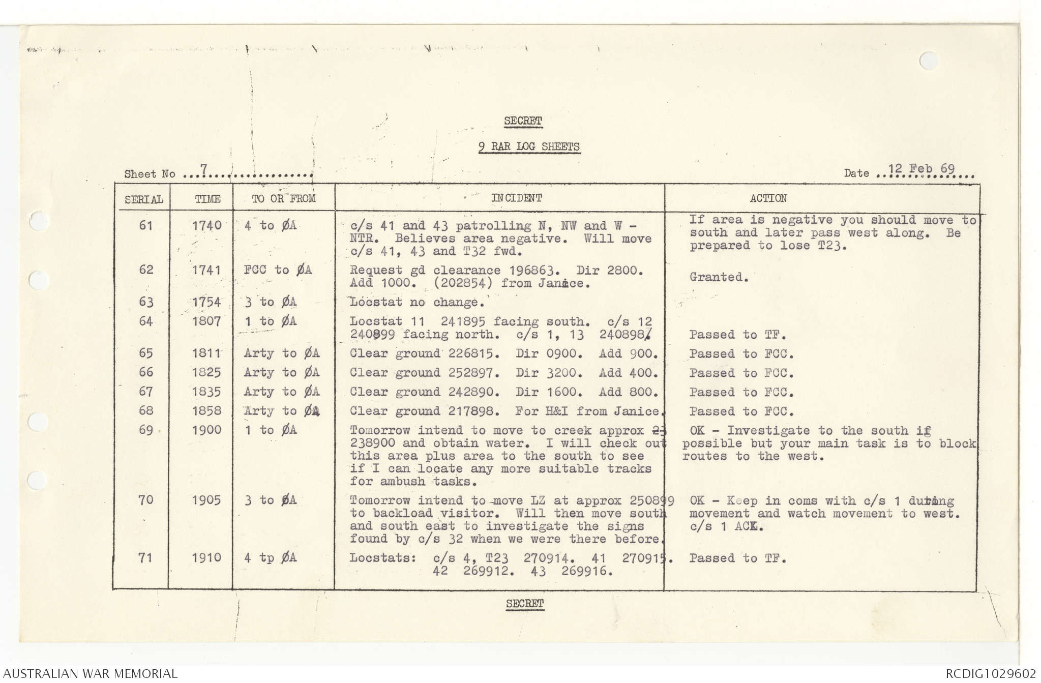 AWM95 7/9/11 - 1-28 February 1969, Narrative, Operations log