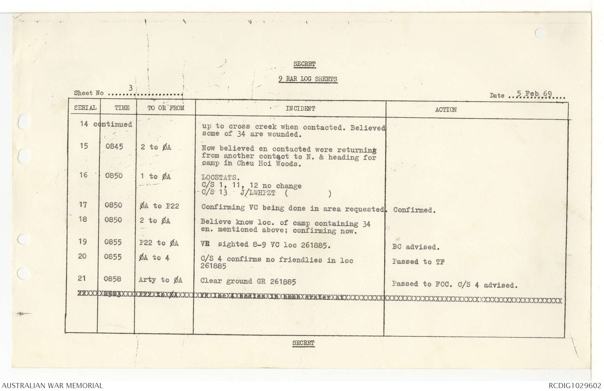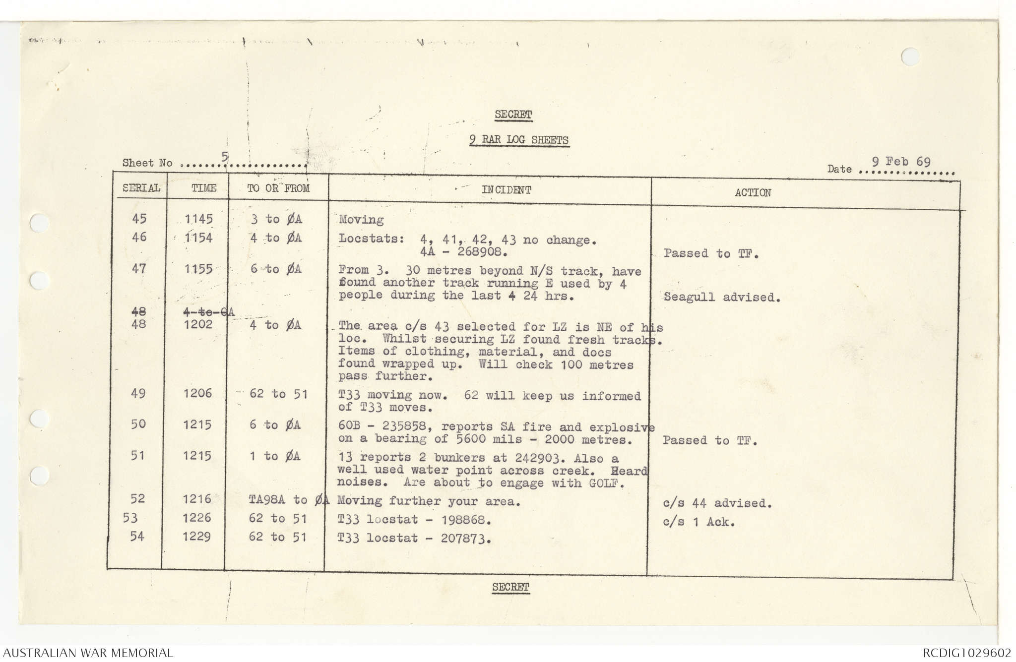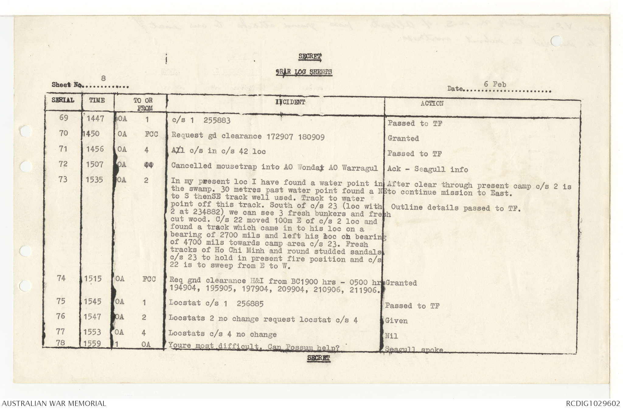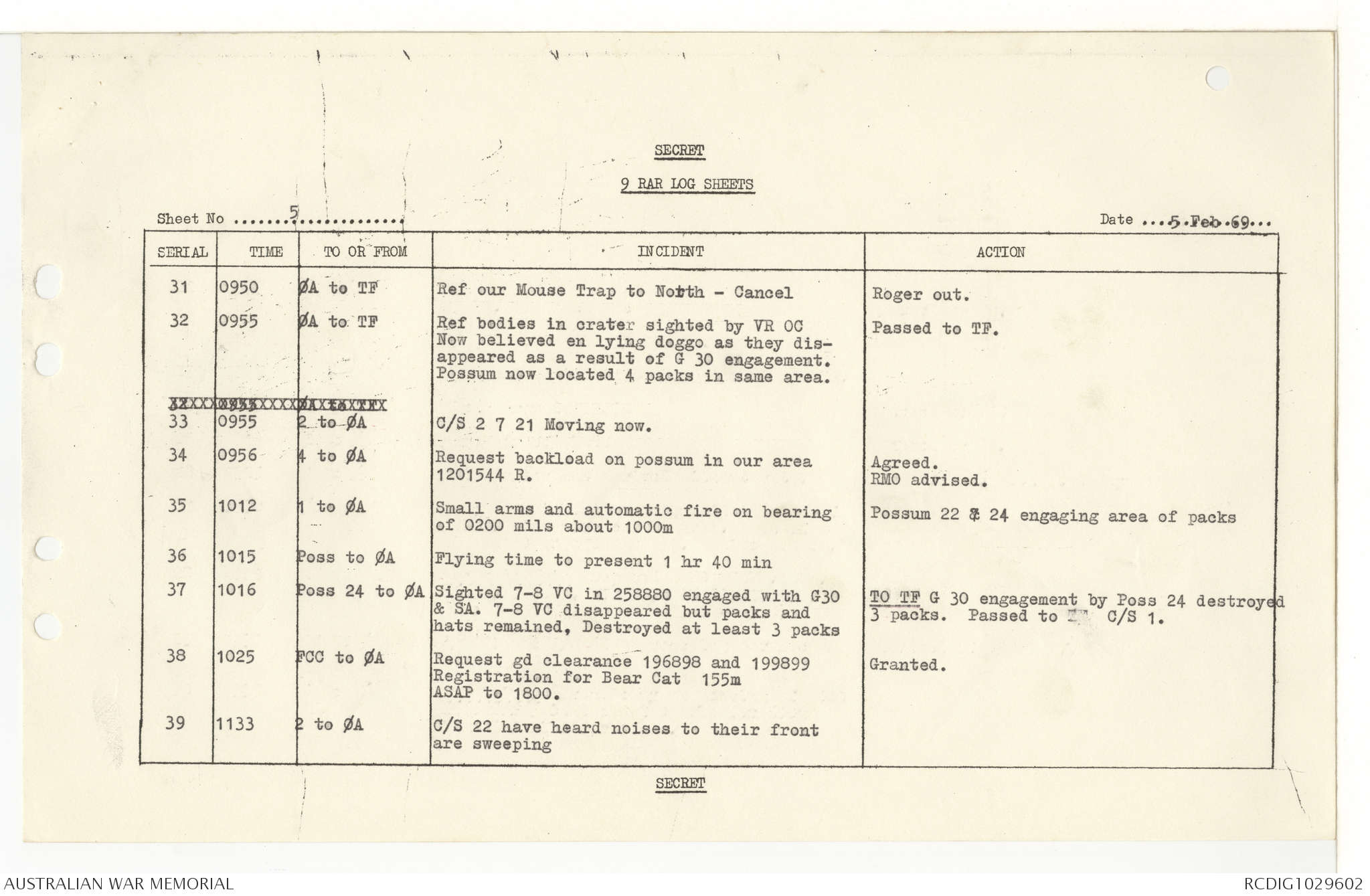 AWM95 7/9/11 - 1-28 February 1969, Narrative, Operations log