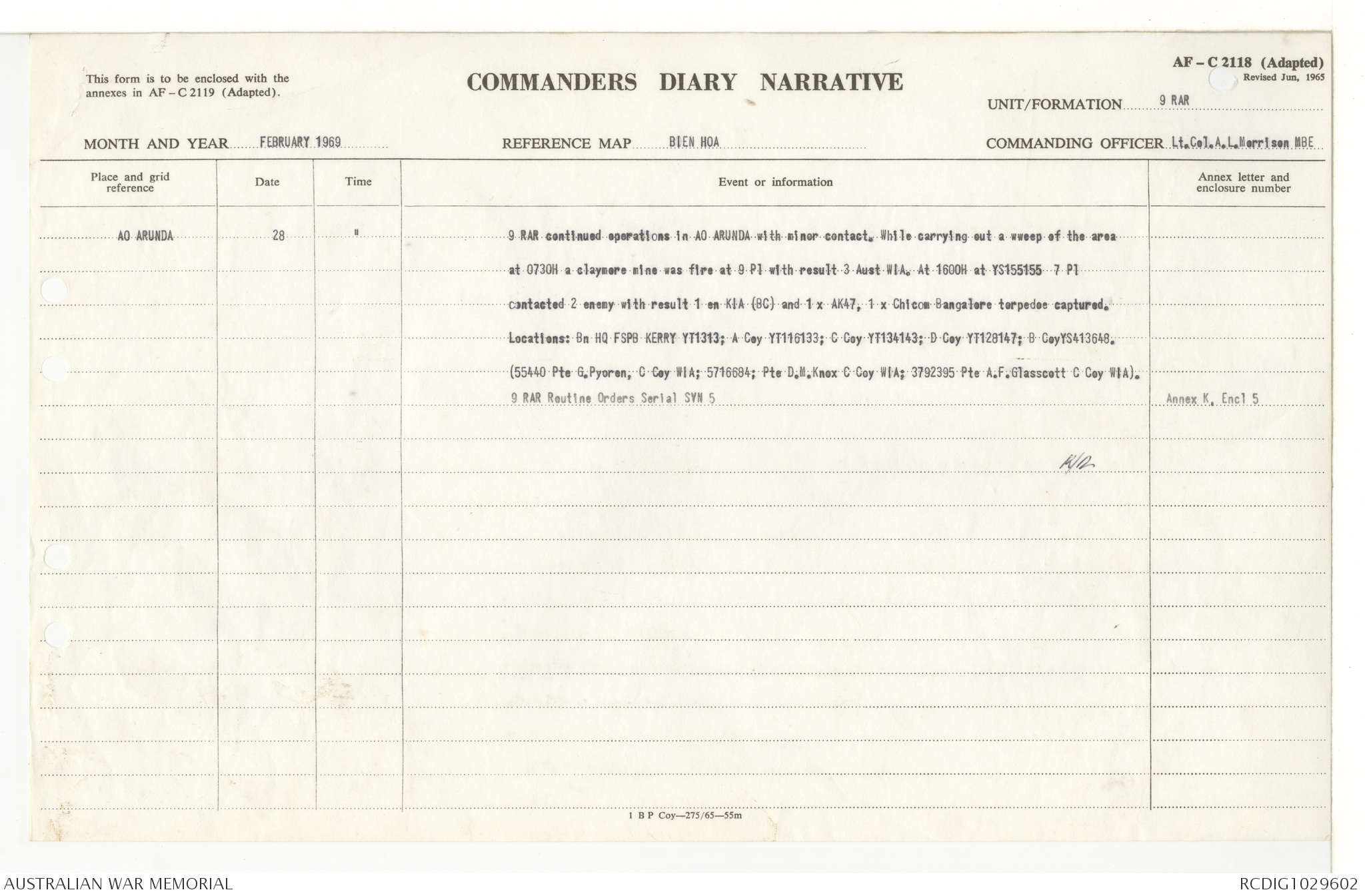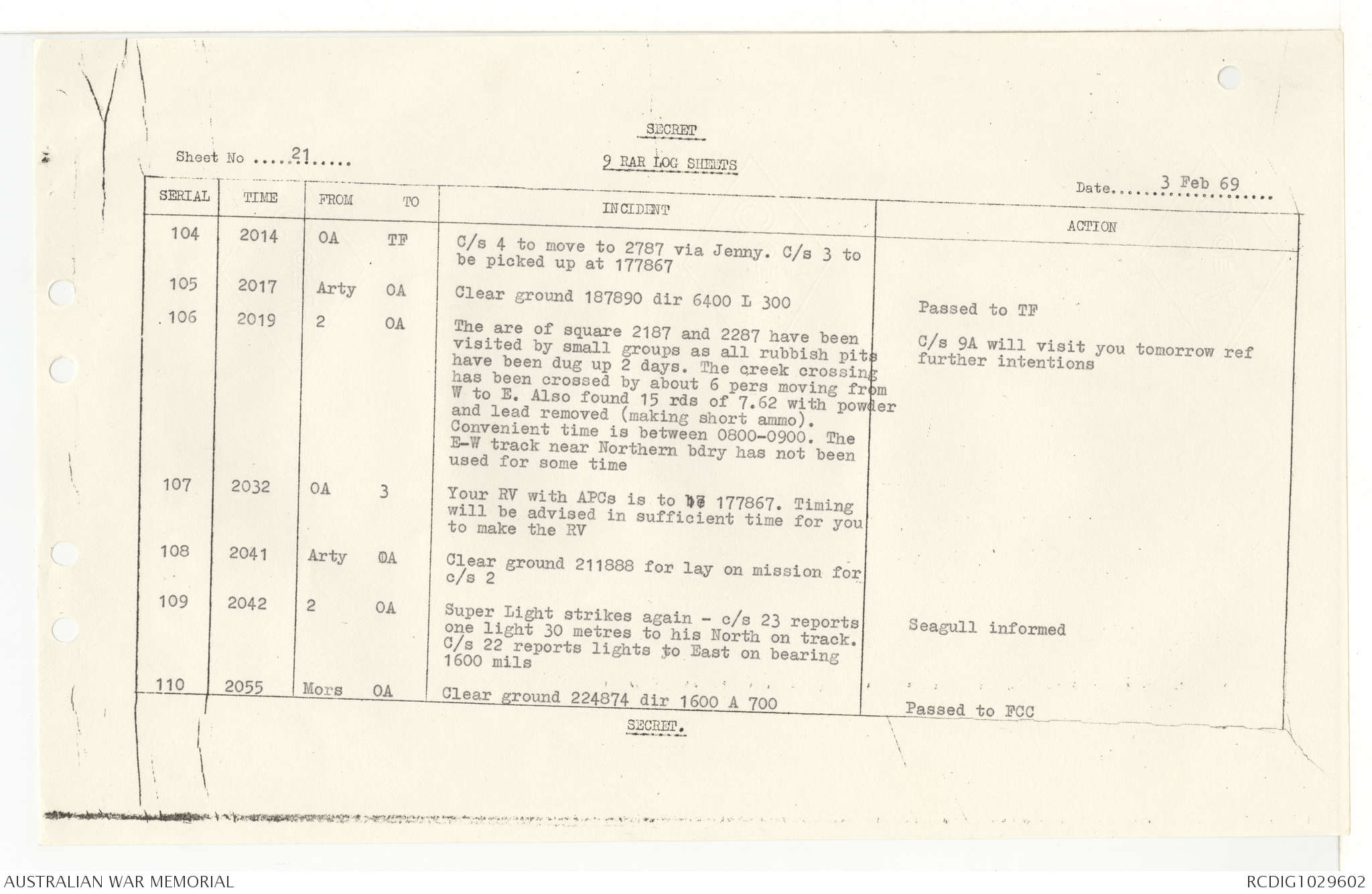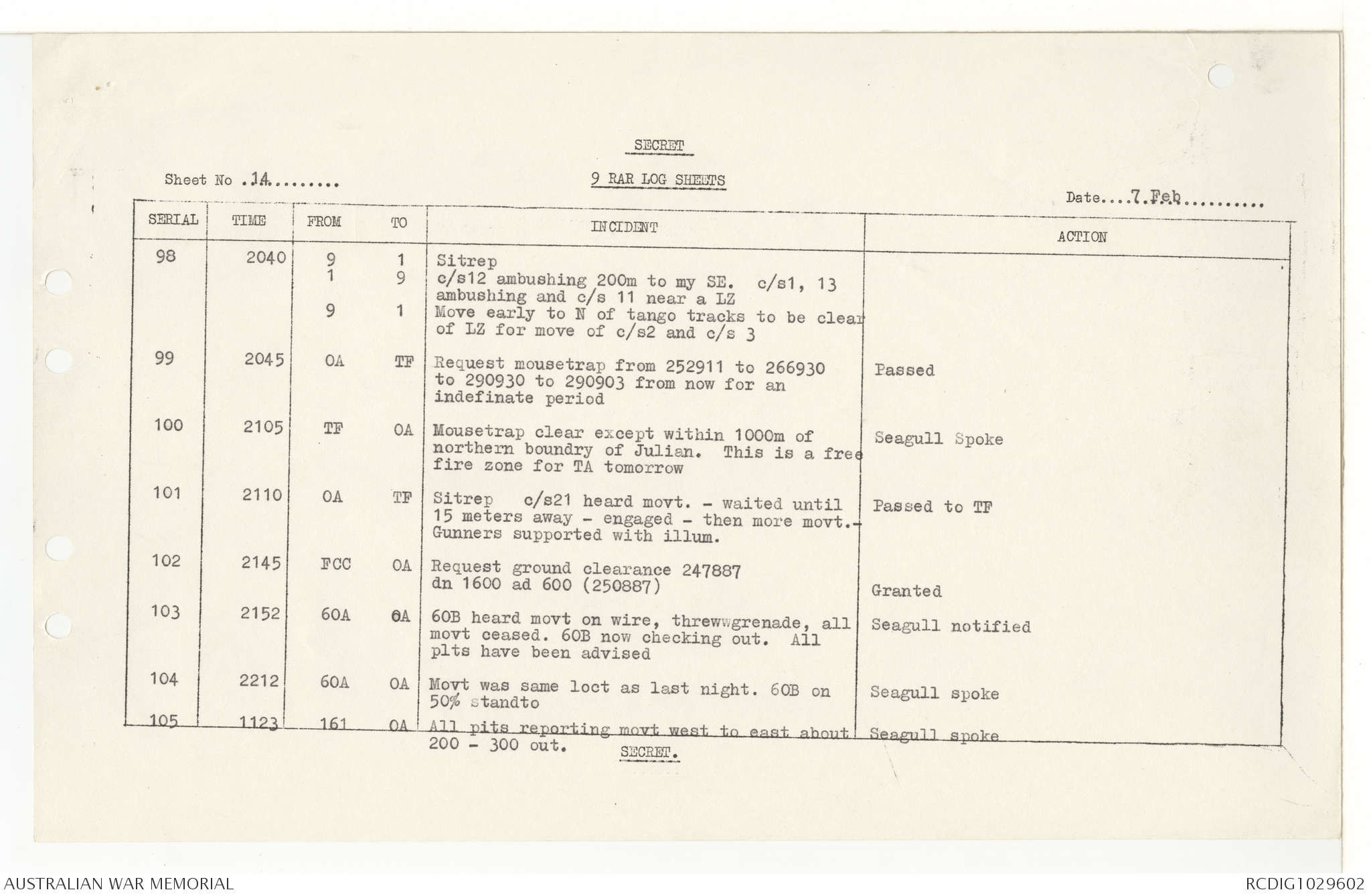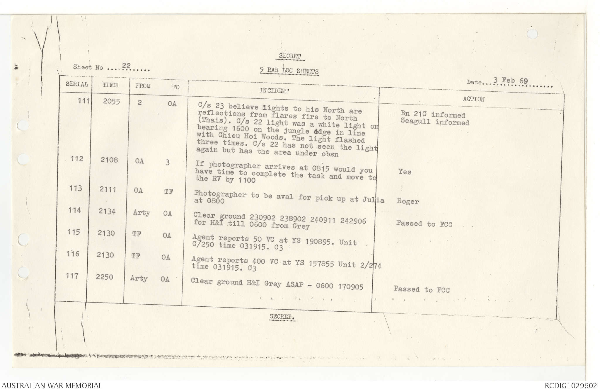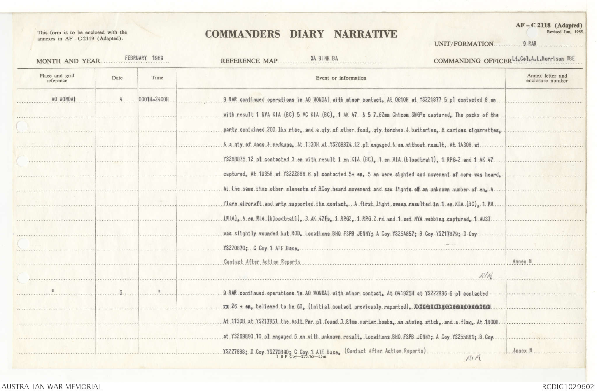 AWM95 7/9/11 - 1-28 February 1969, Narrative, Operations log