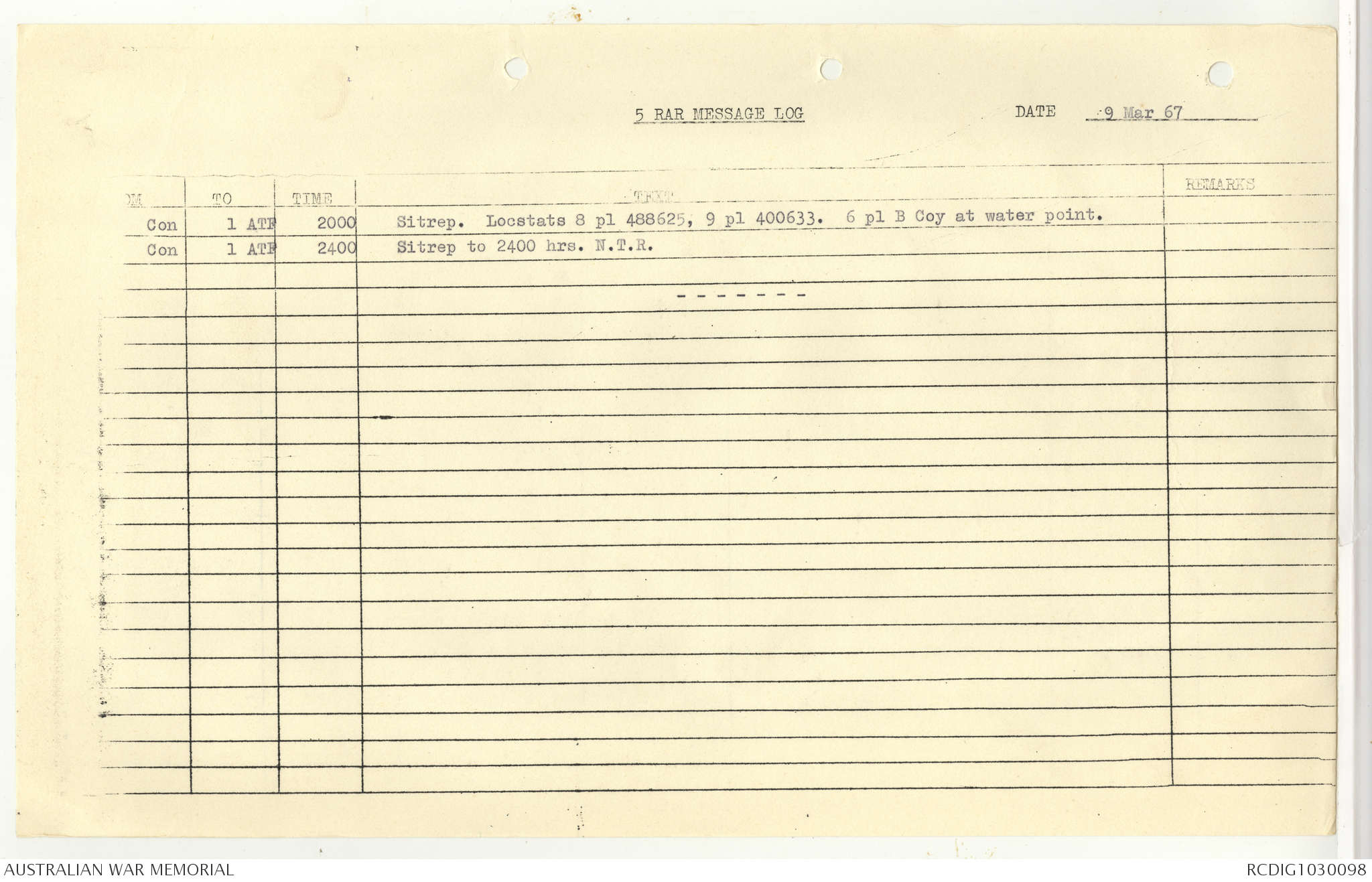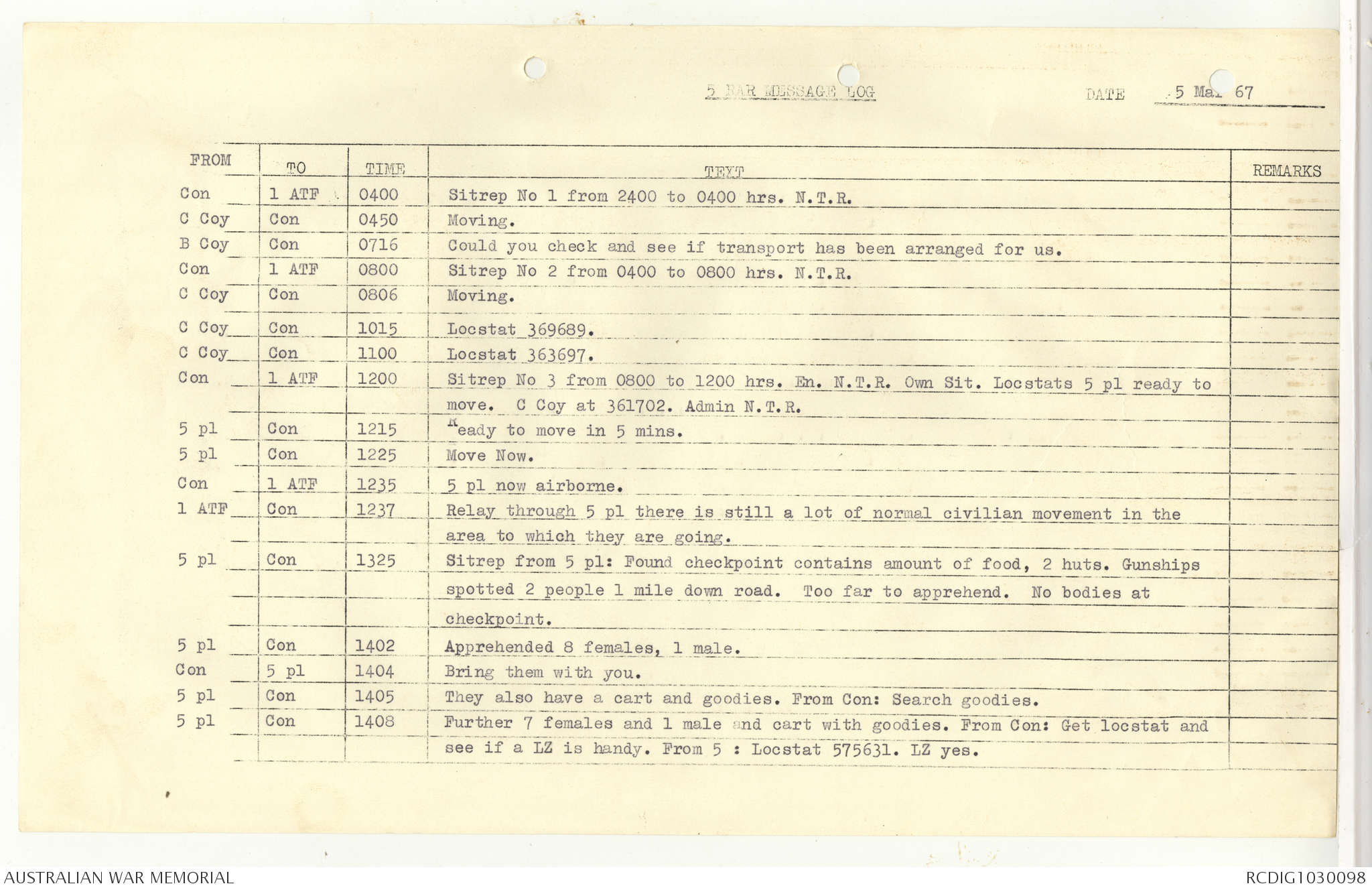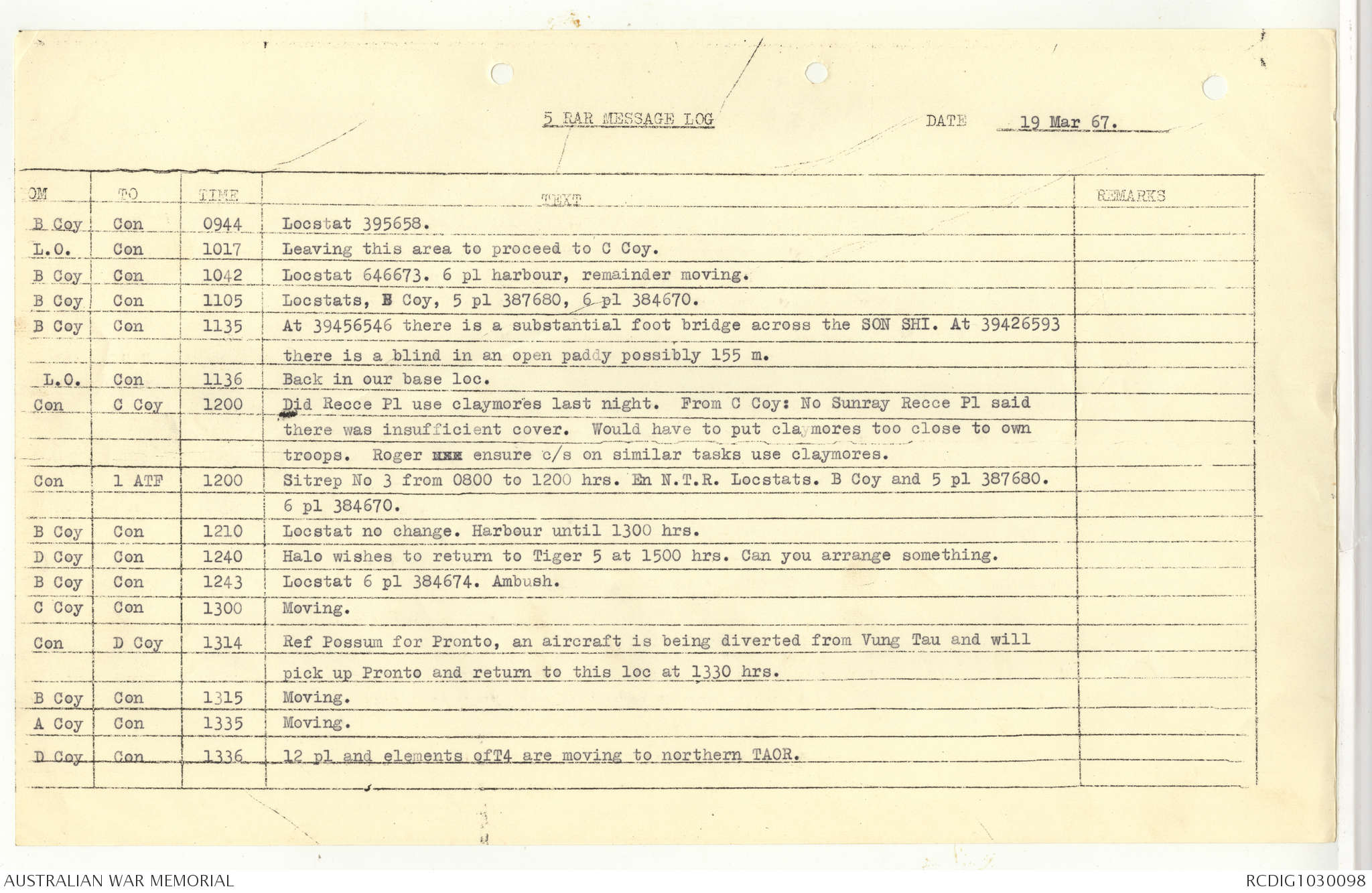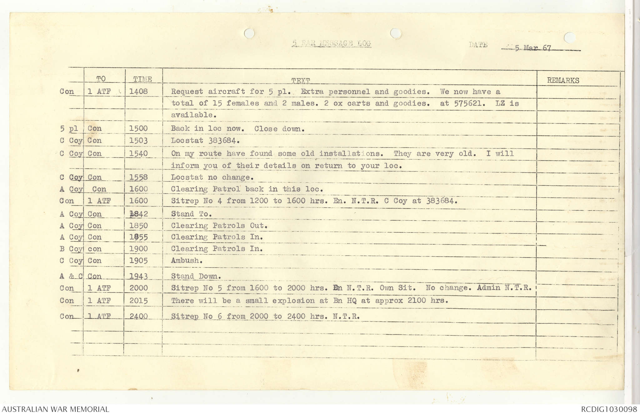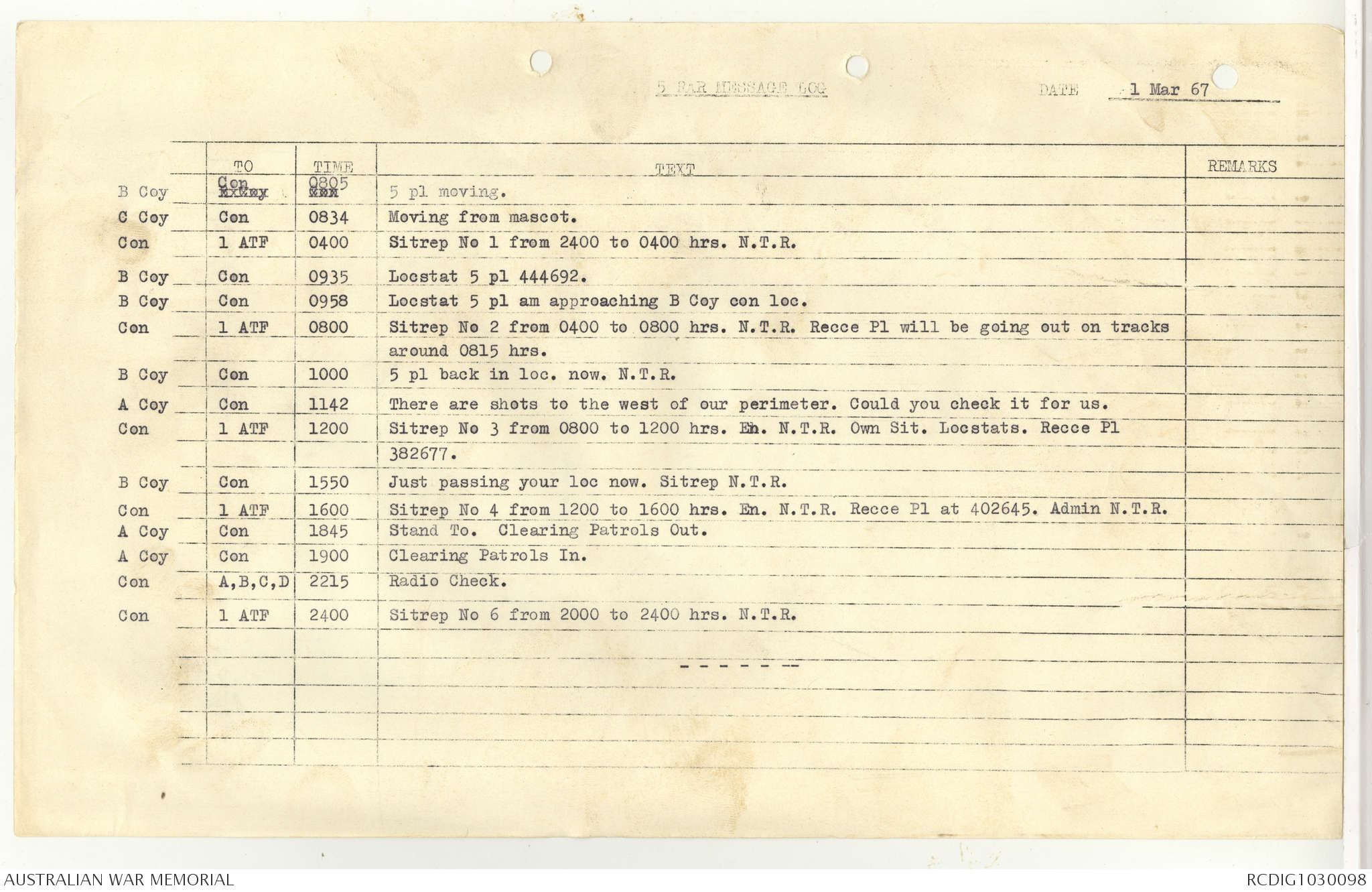 AWM95 7/5/15 - 1-31 March 1967, Narrative, Operation log