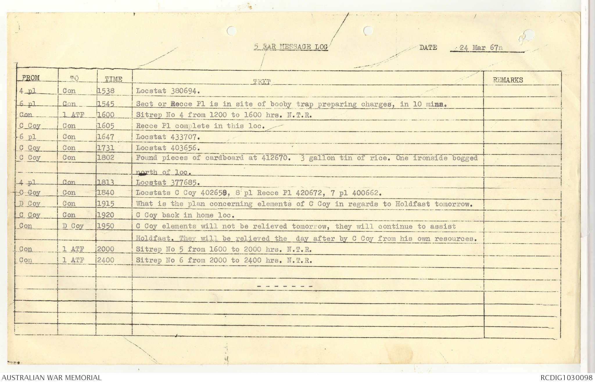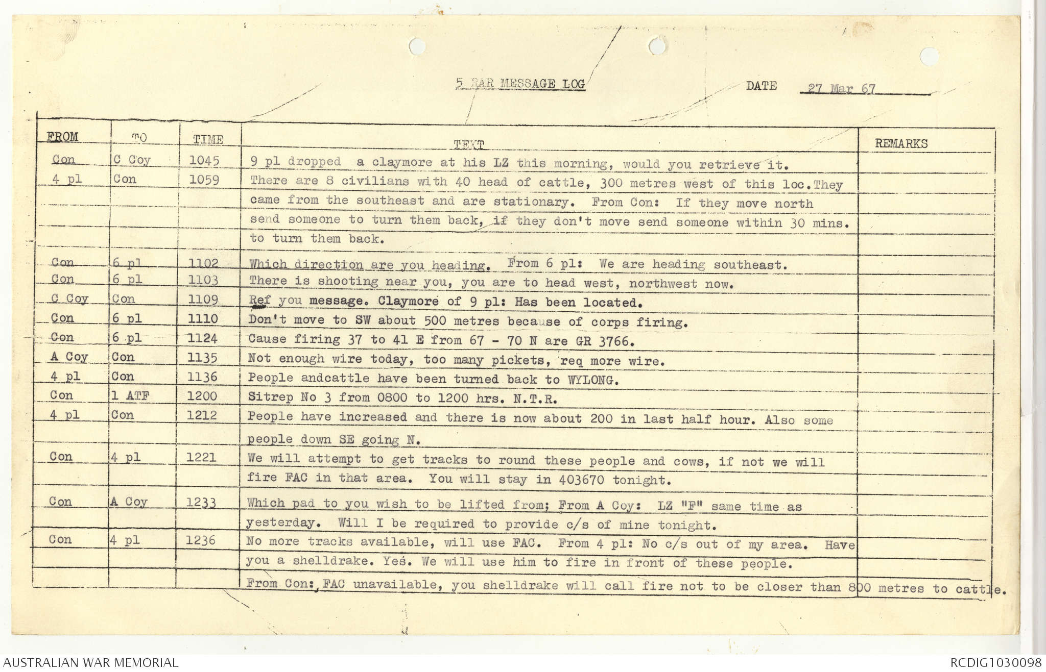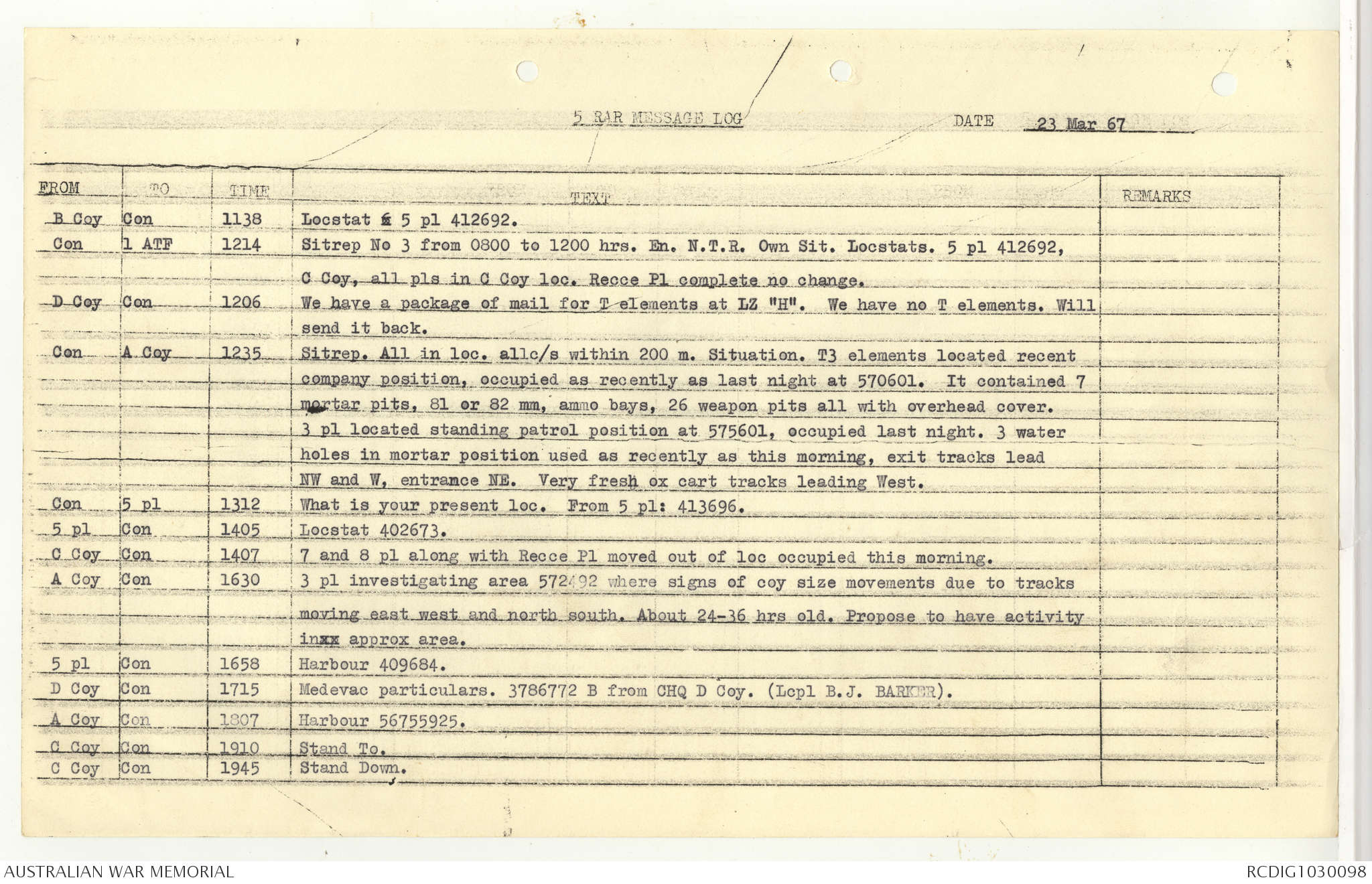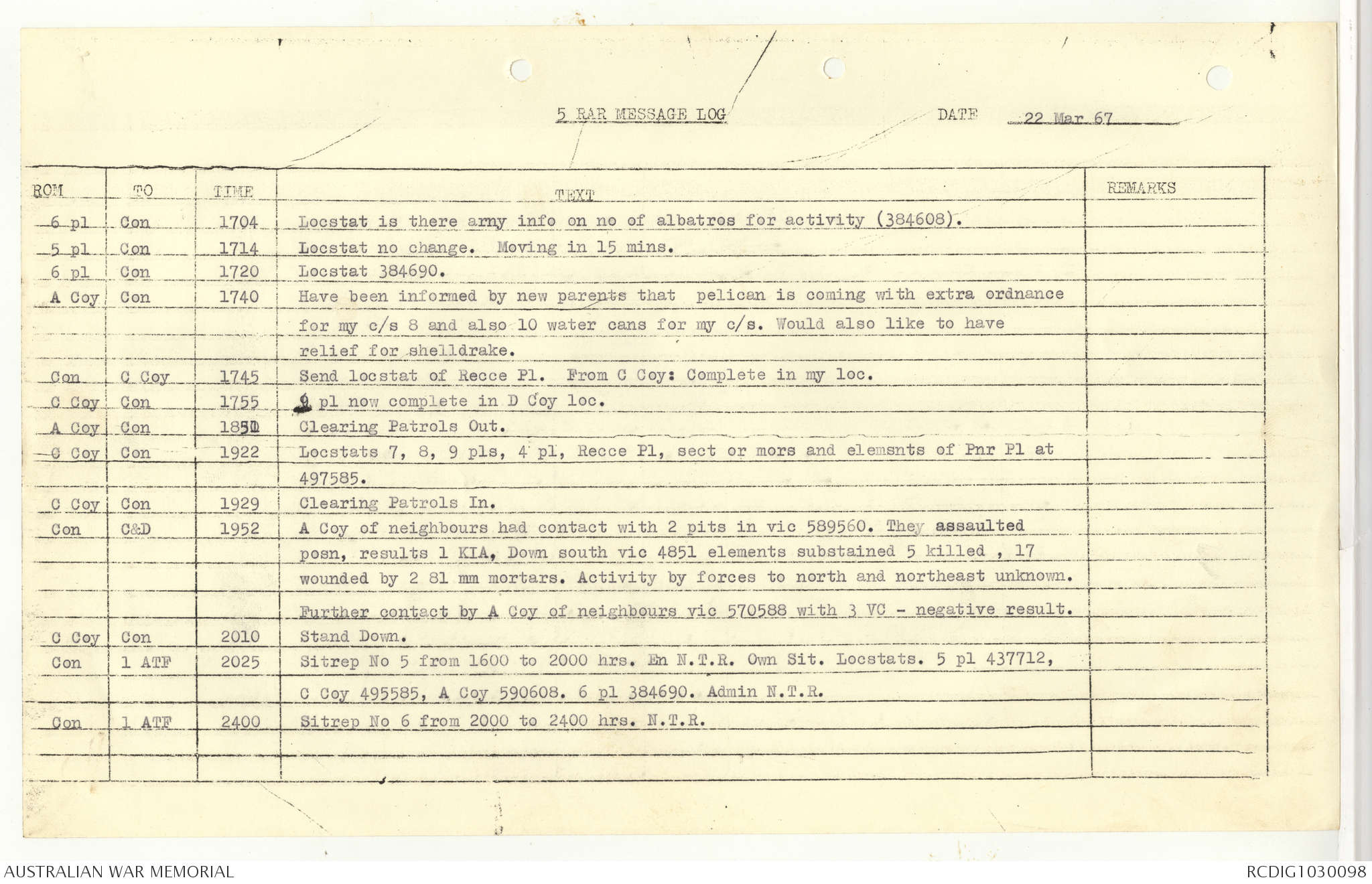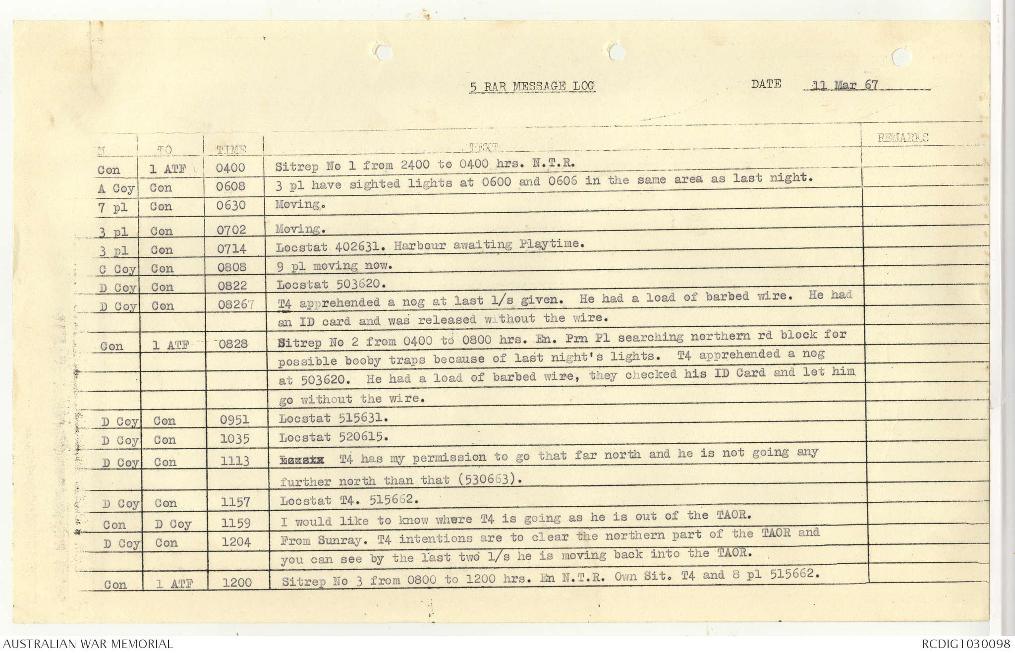 AWM95 7/5/15 - 1-31 March 1967, Narrative, Operation log