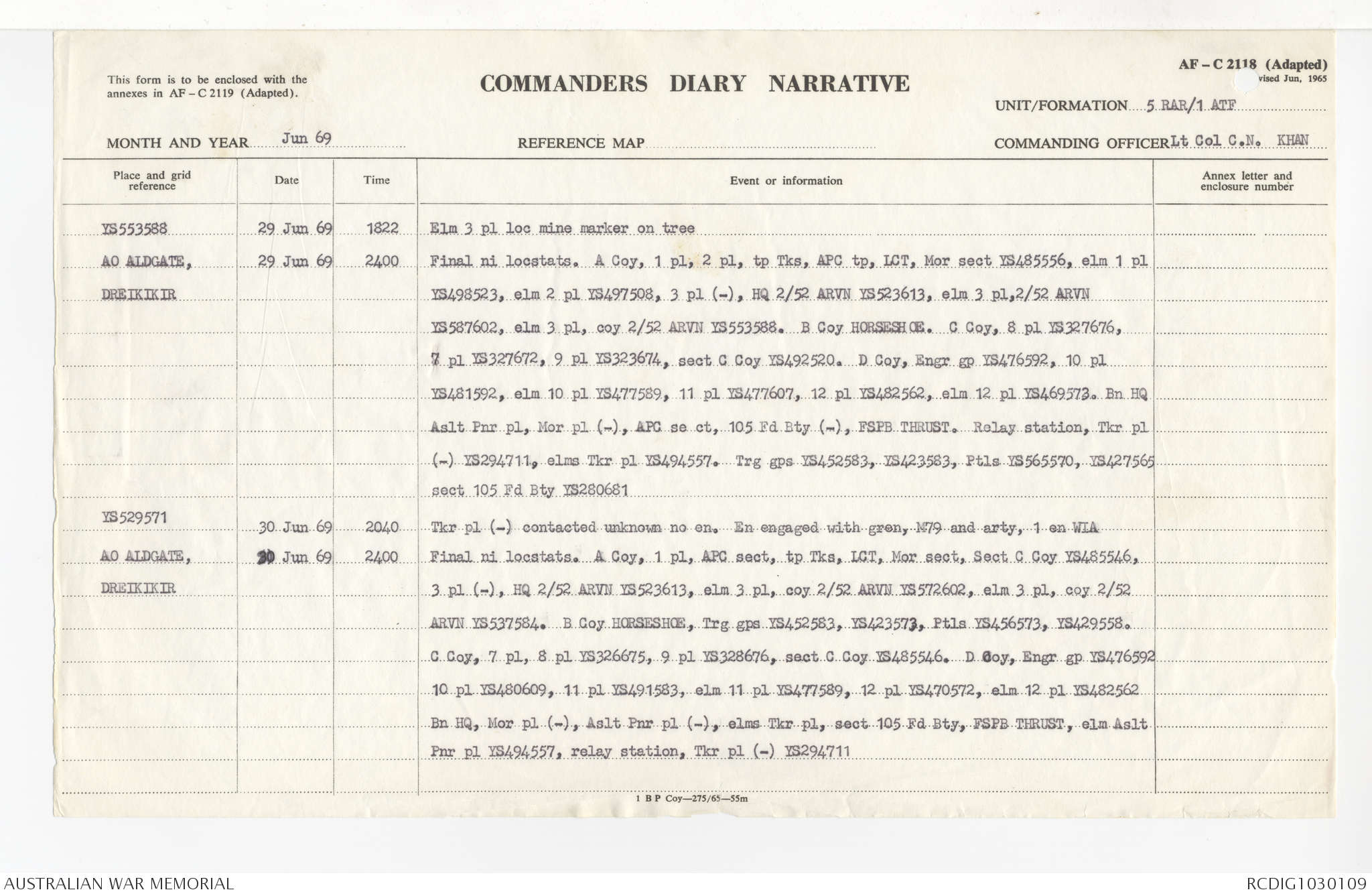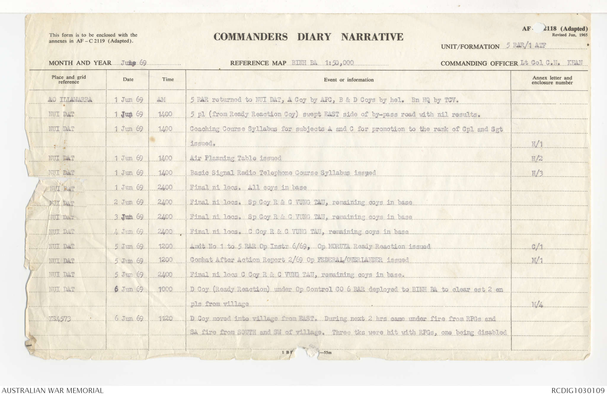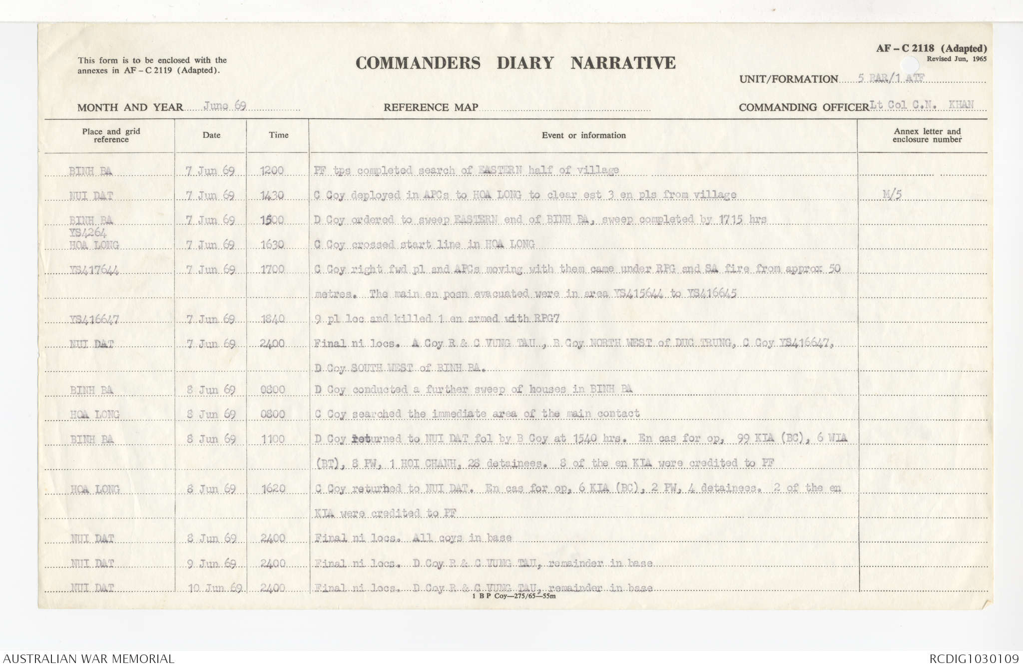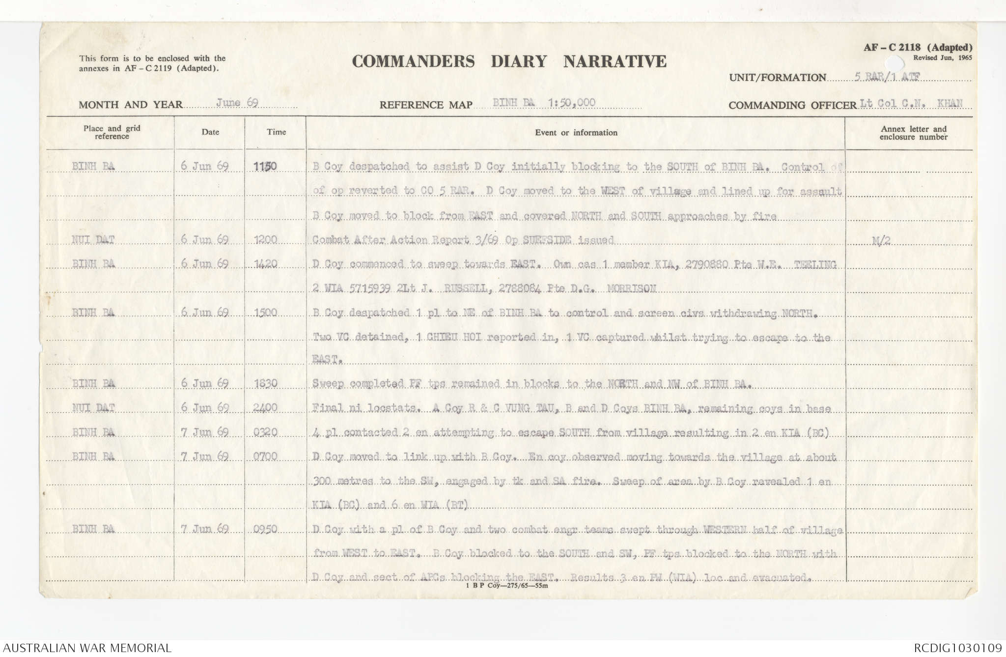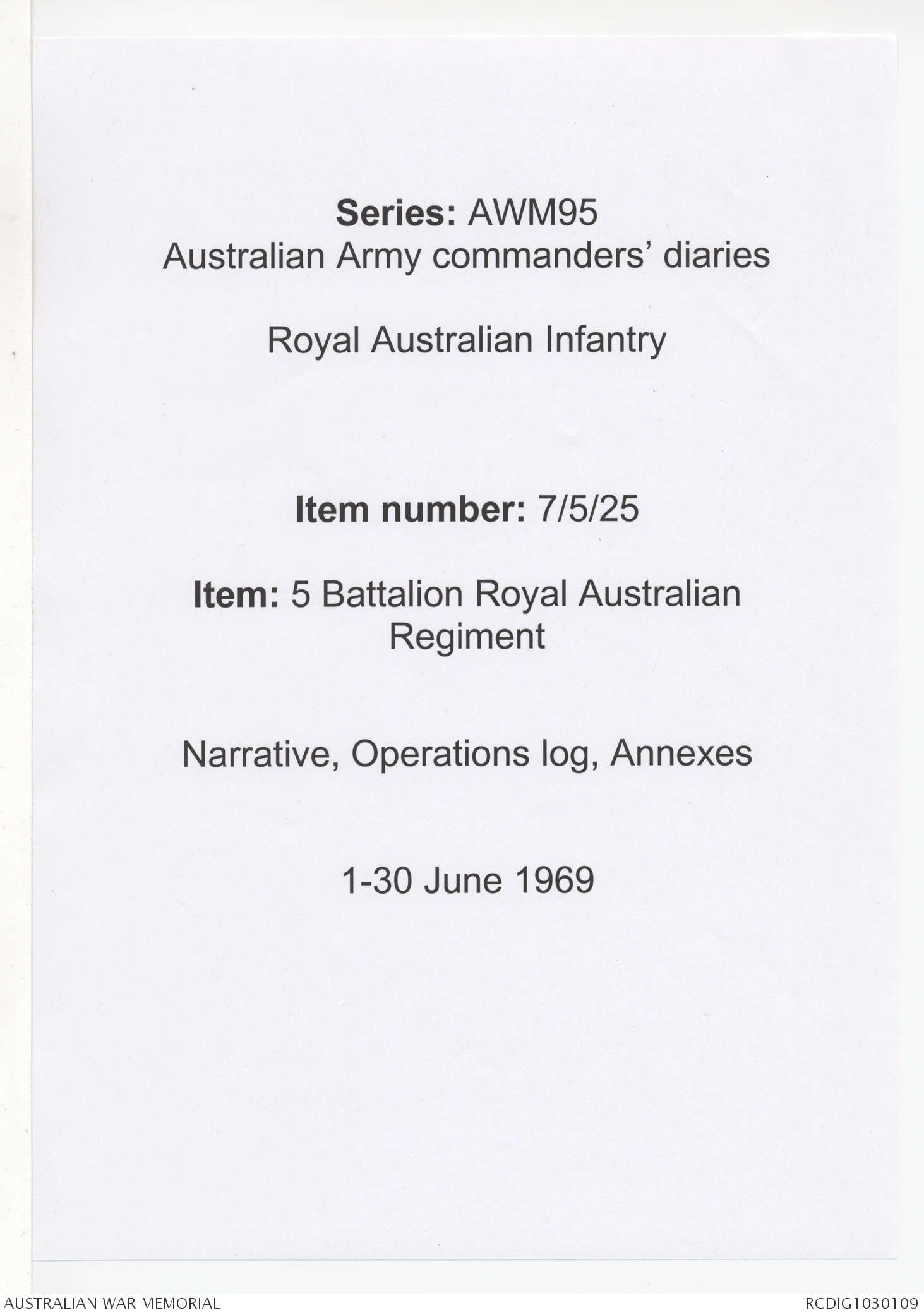 AWM95 7/5/25 - 1-30 June 1969, Narrative, Operations log, Annexes