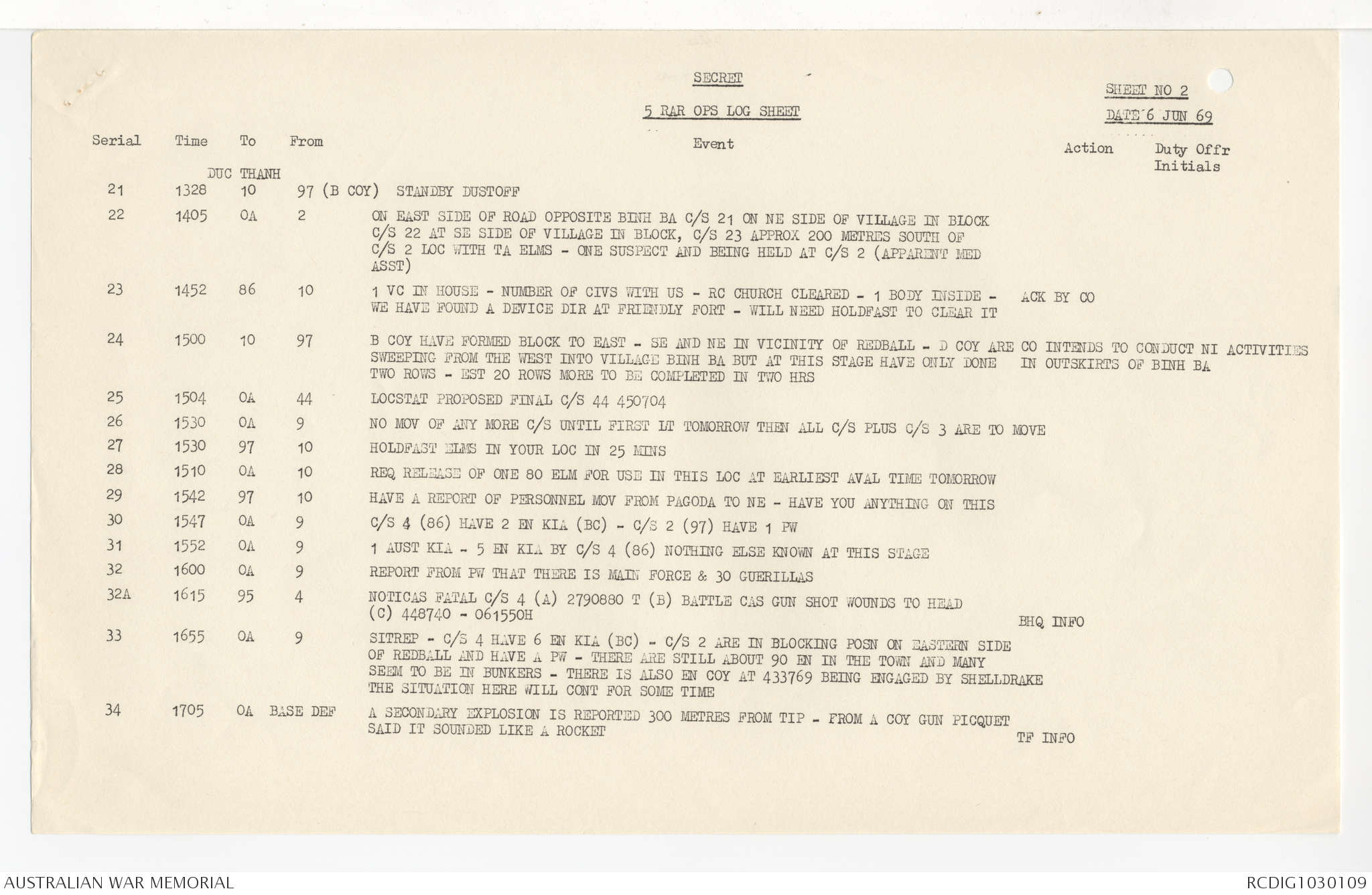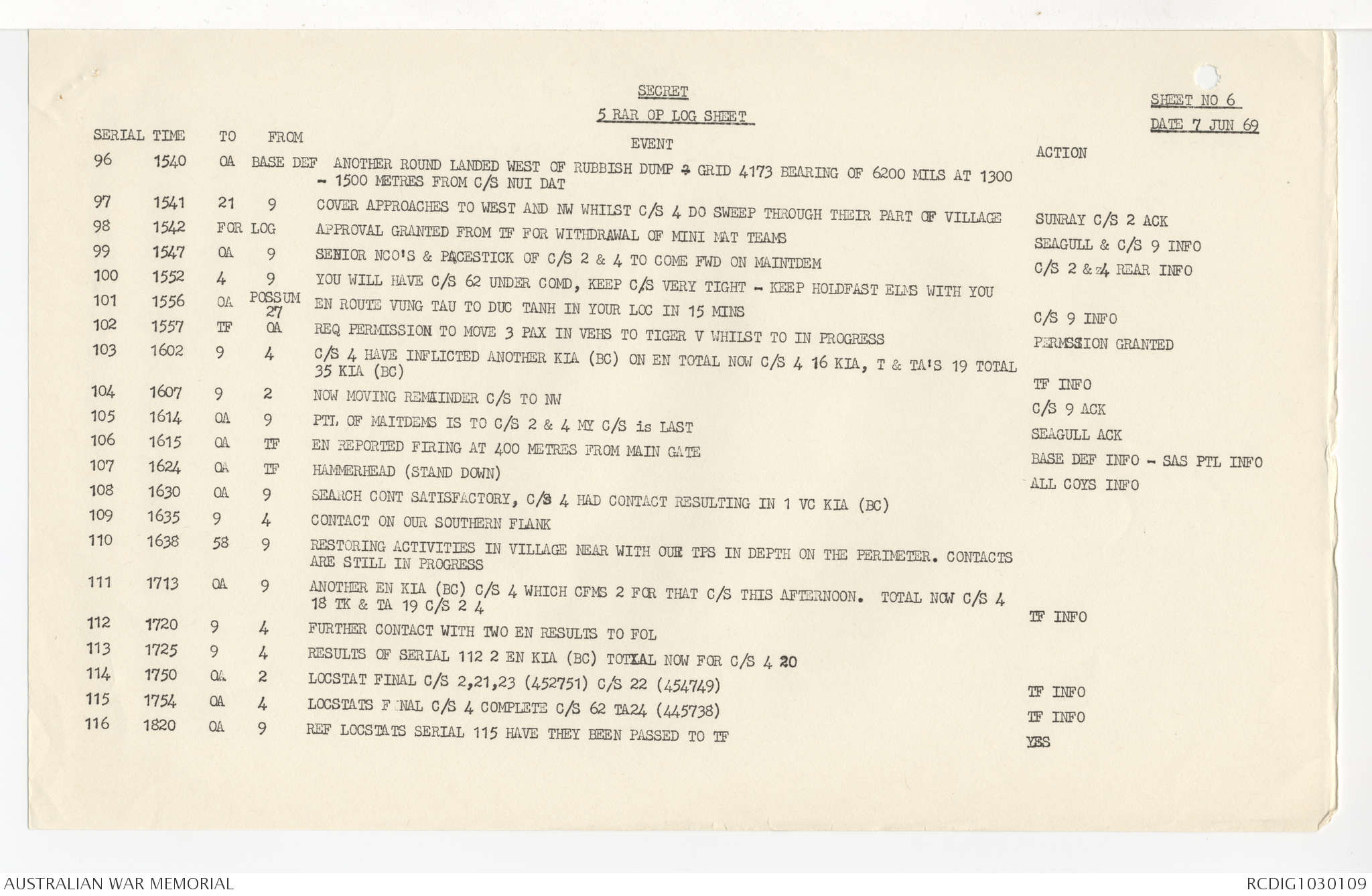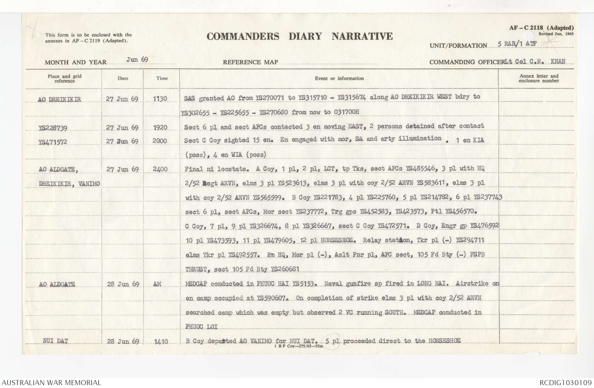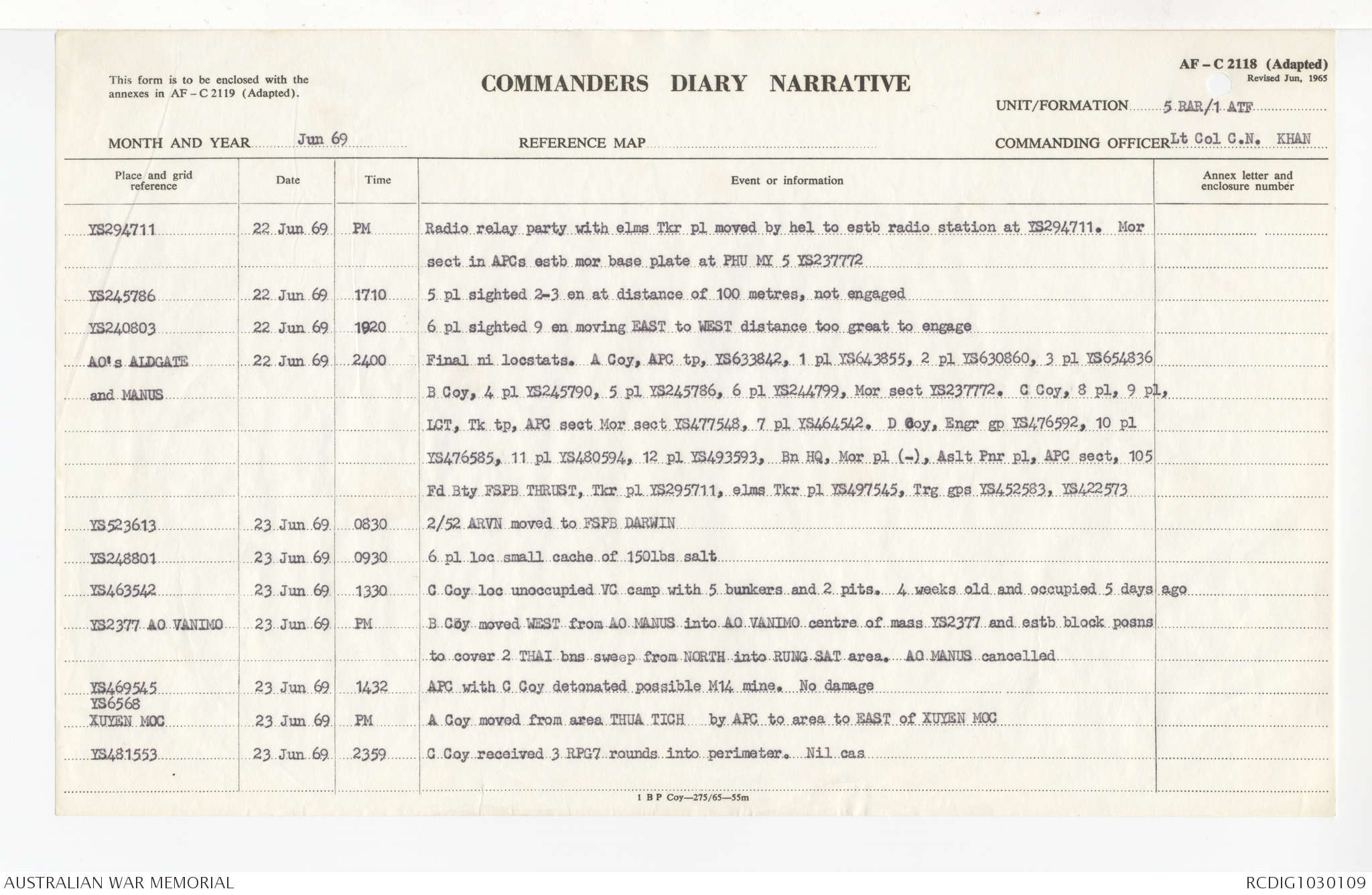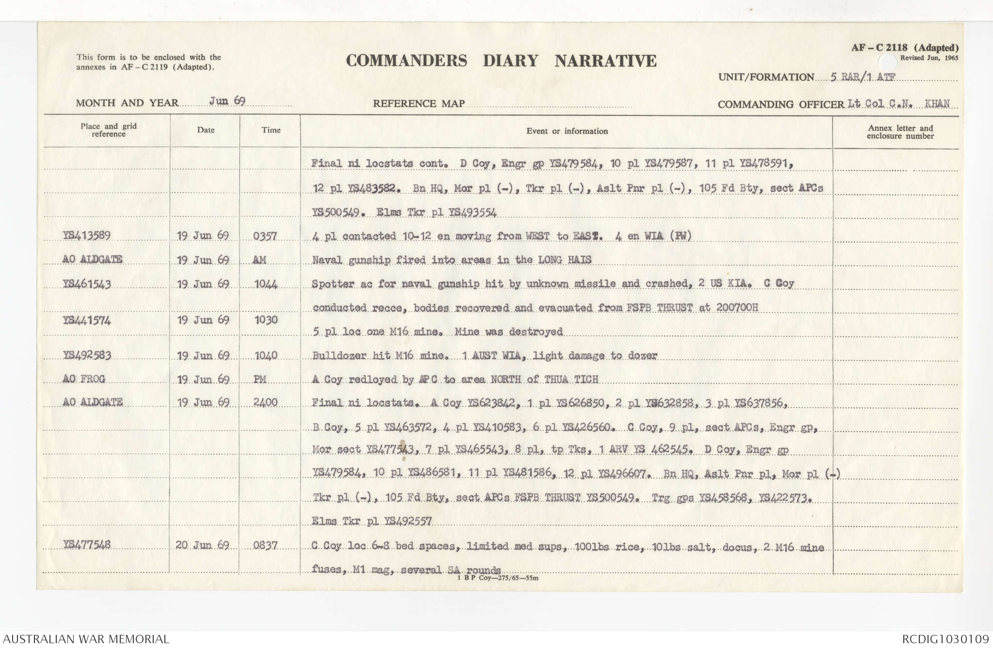 AWM95 7/5/25 - 1-30 June 1969, Narrative, Operations log, Annexes