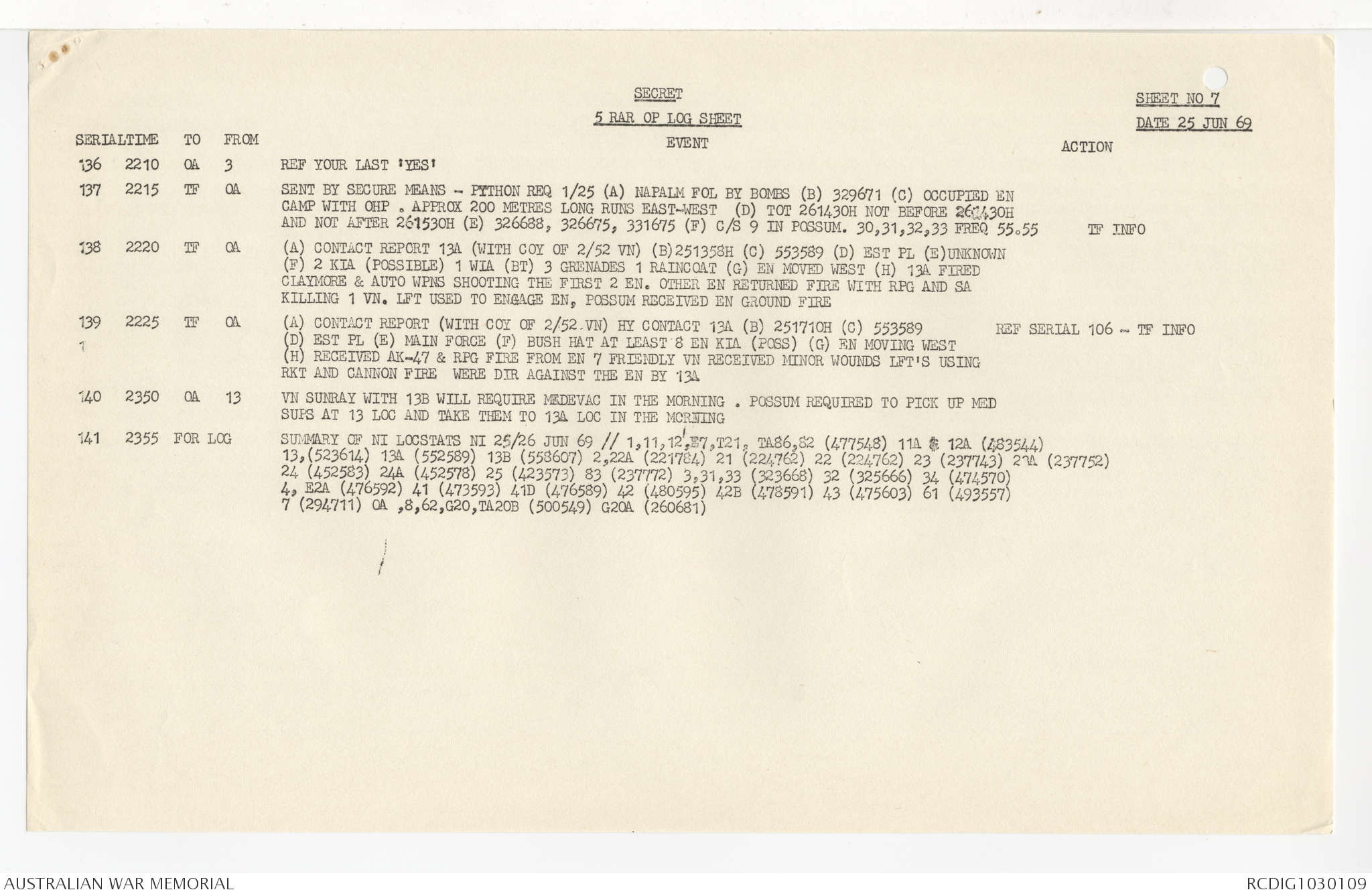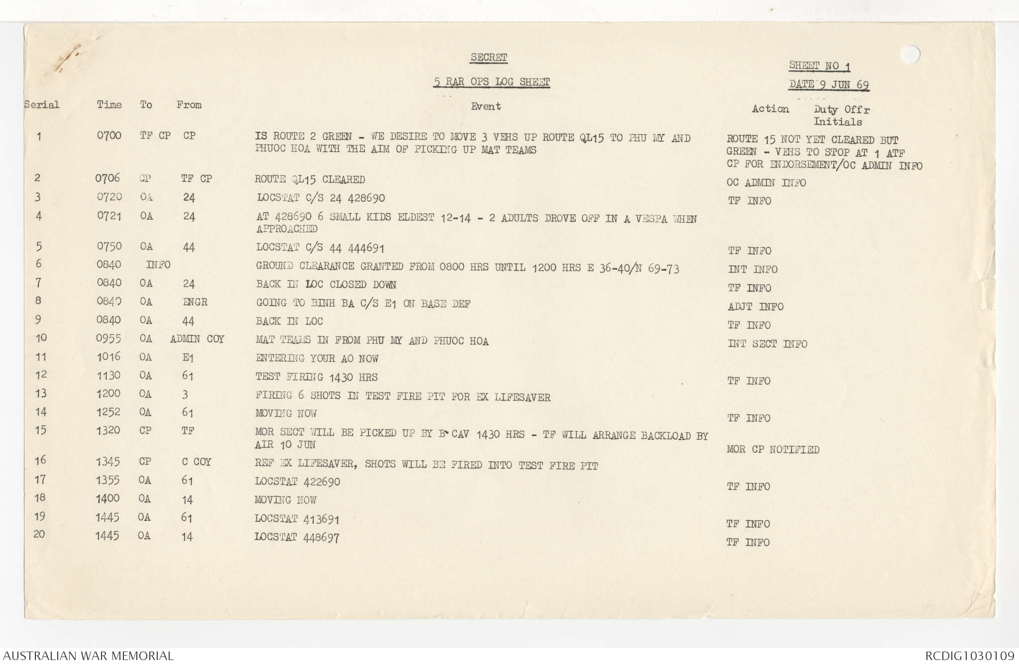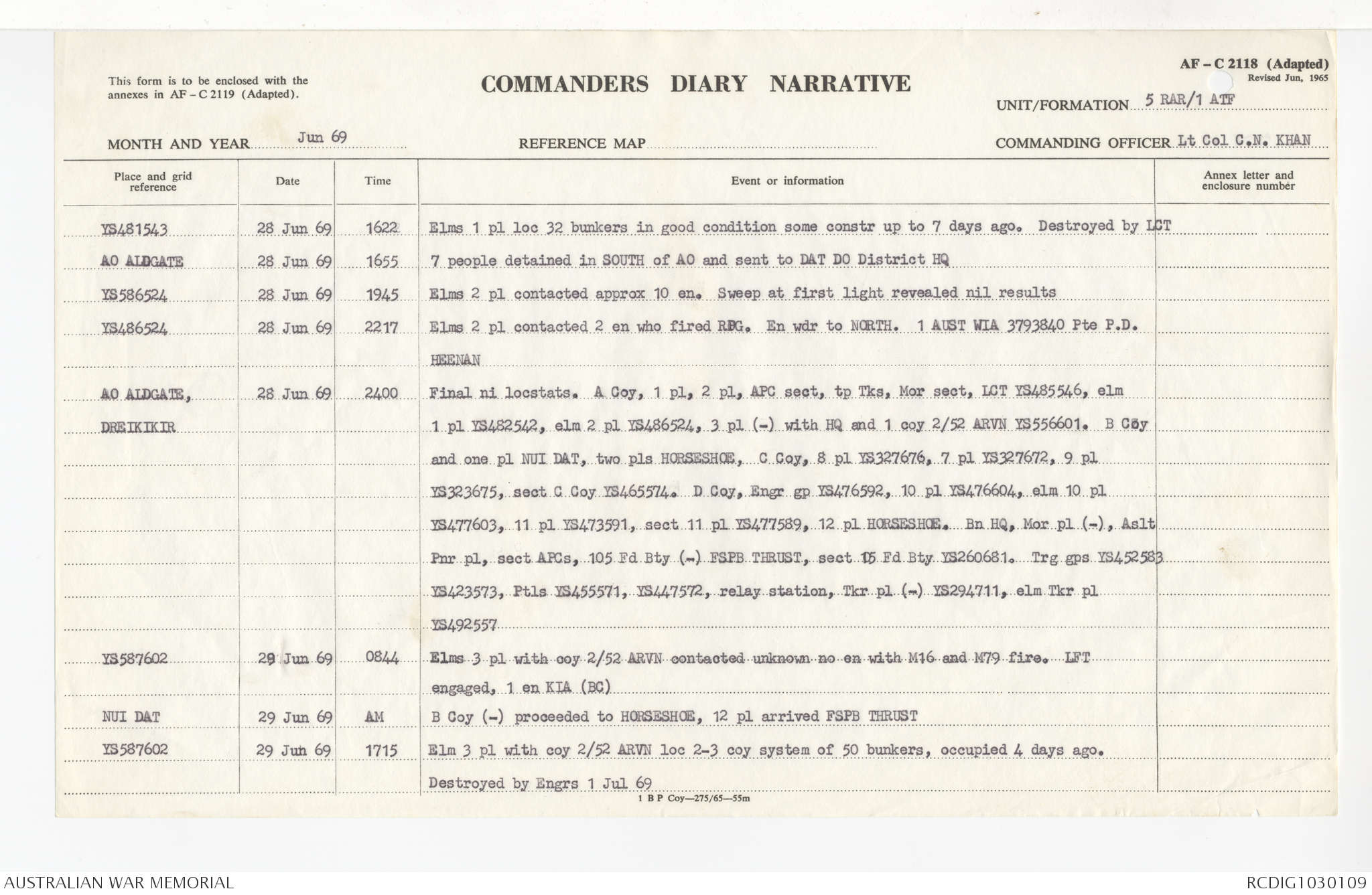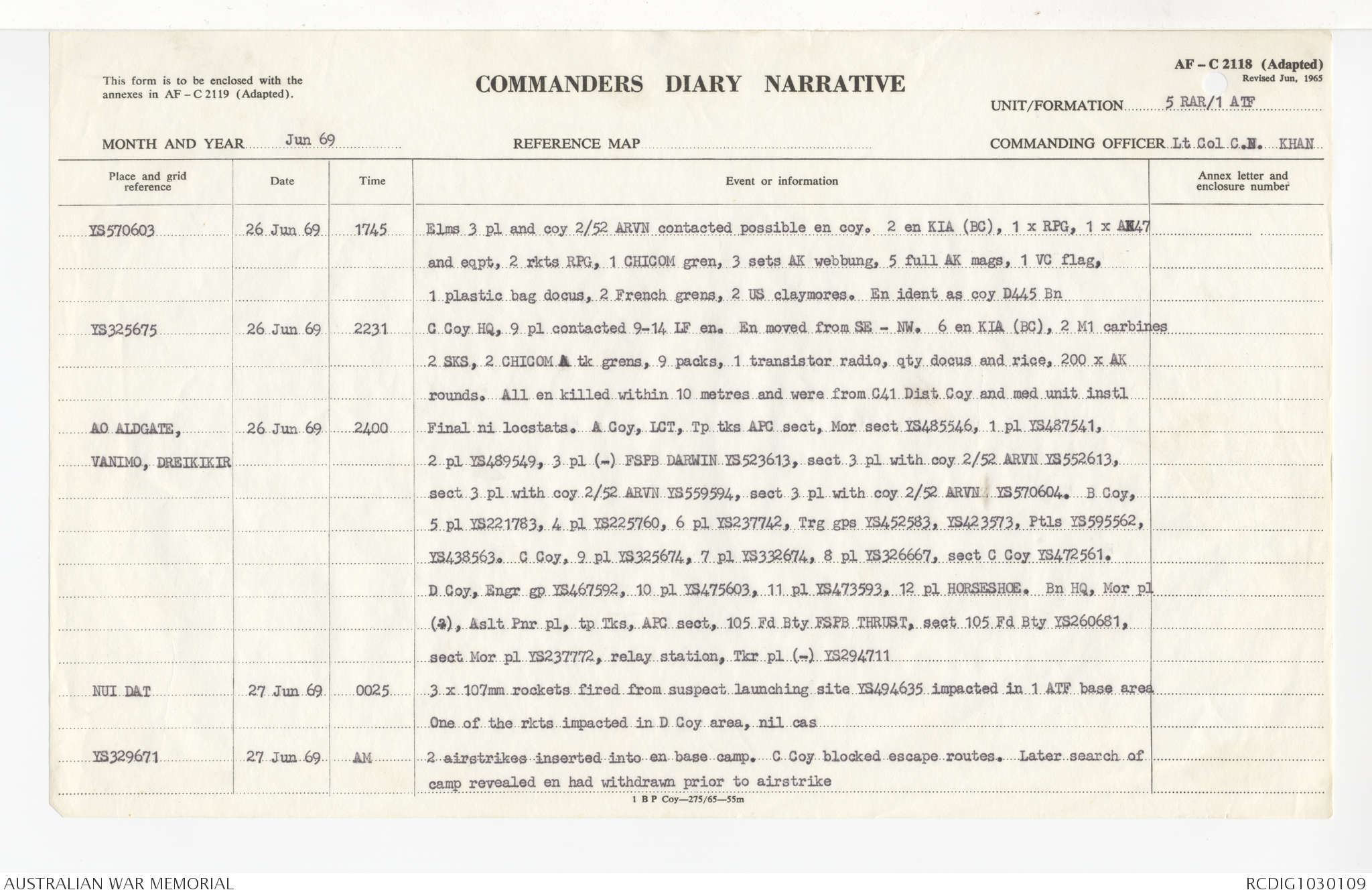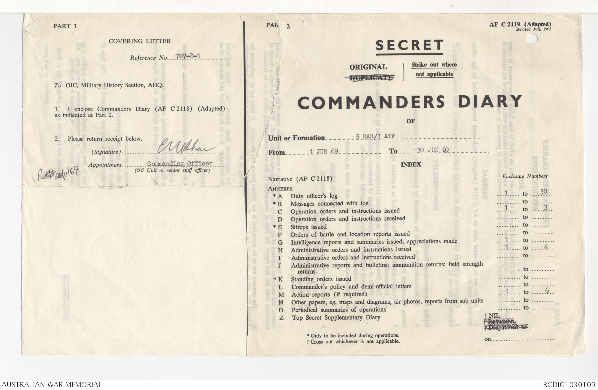 AWM95 7/5/25 - 1-30 June 1969, Narrative, Operations log, Annexes