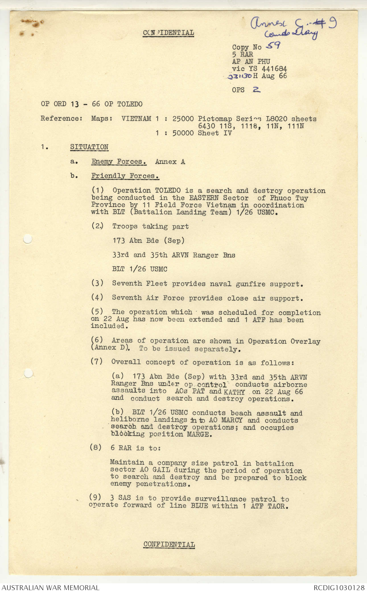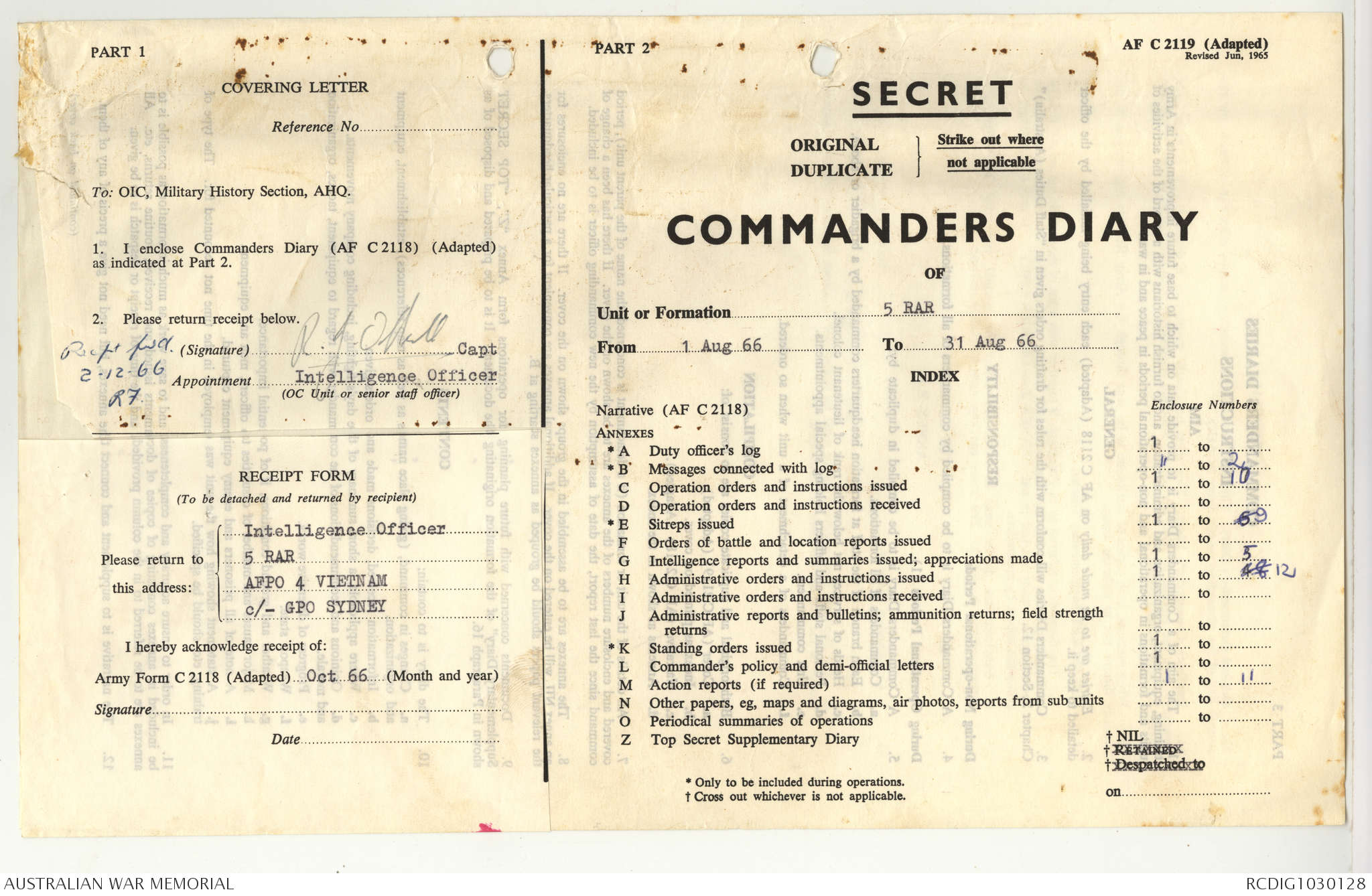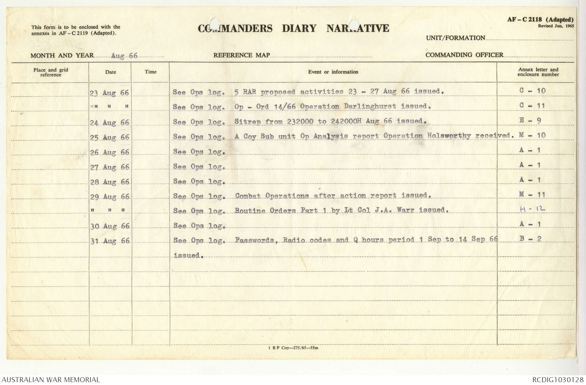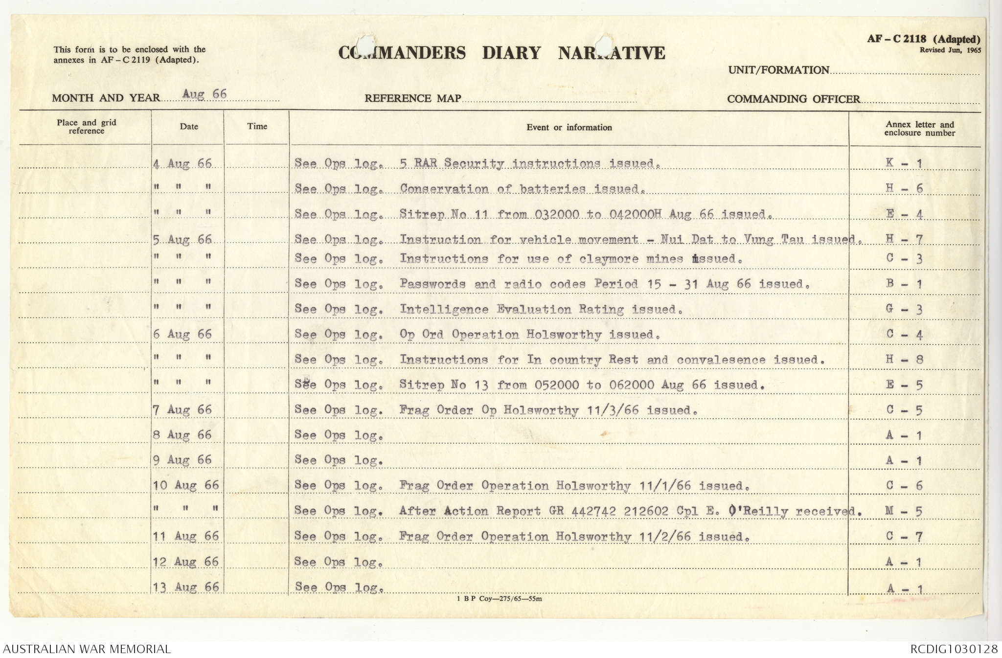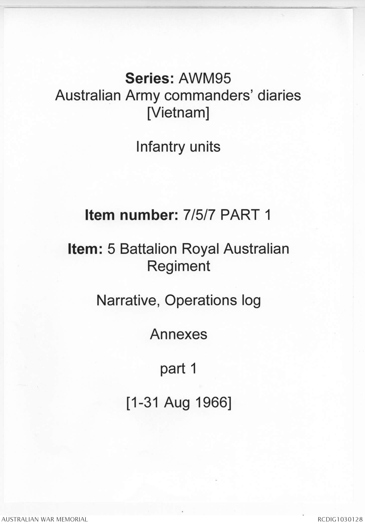 AWM95 7/5/7 PART 1 - 1-31 August 1966, Narrative, Operations log, Annexes
