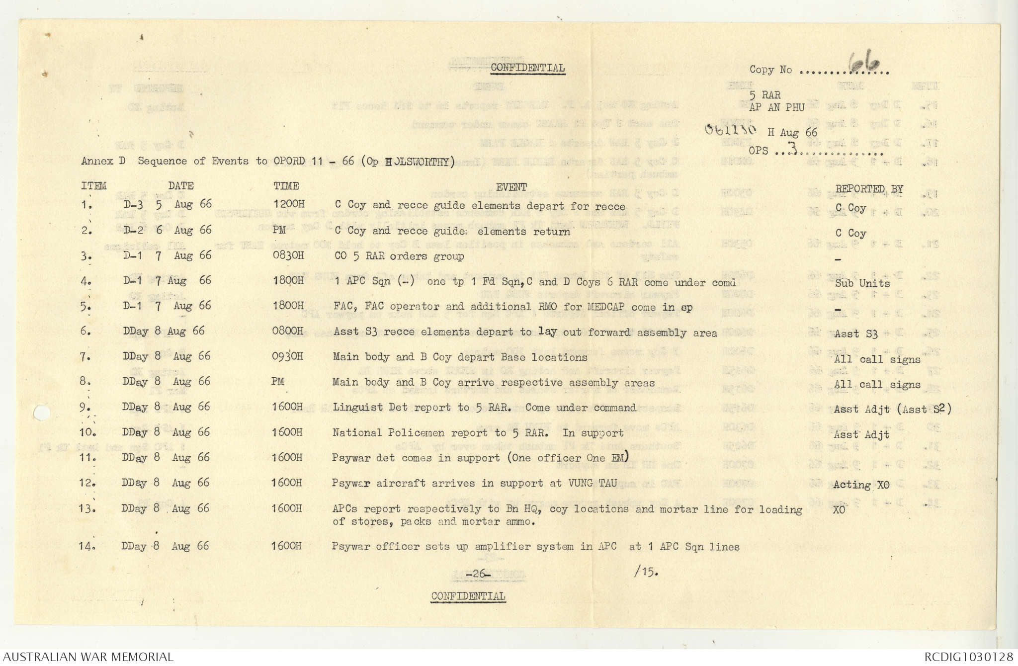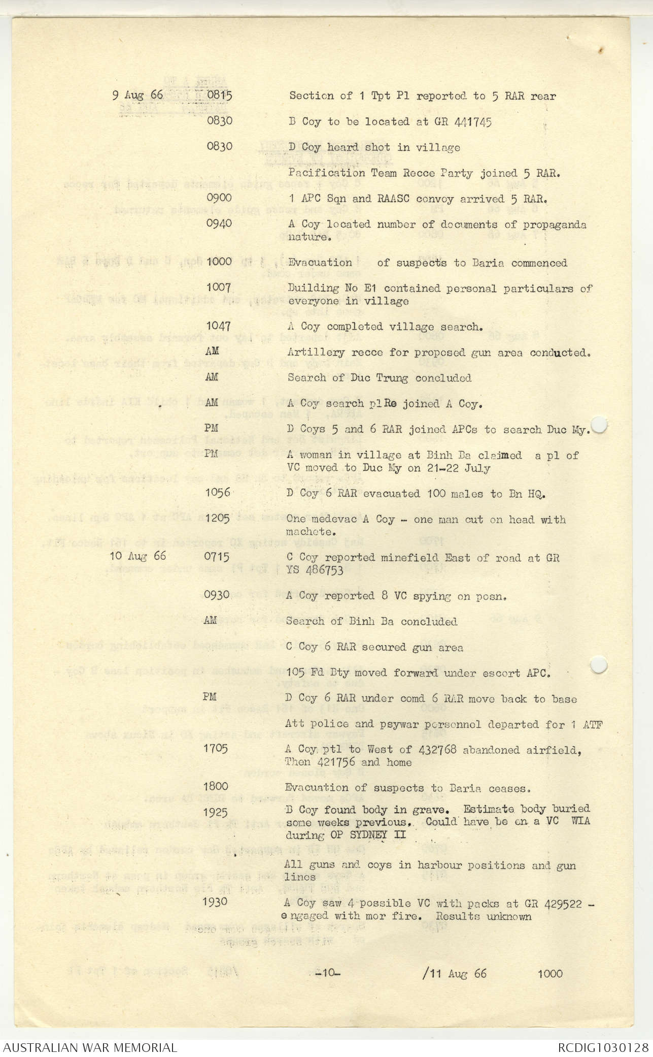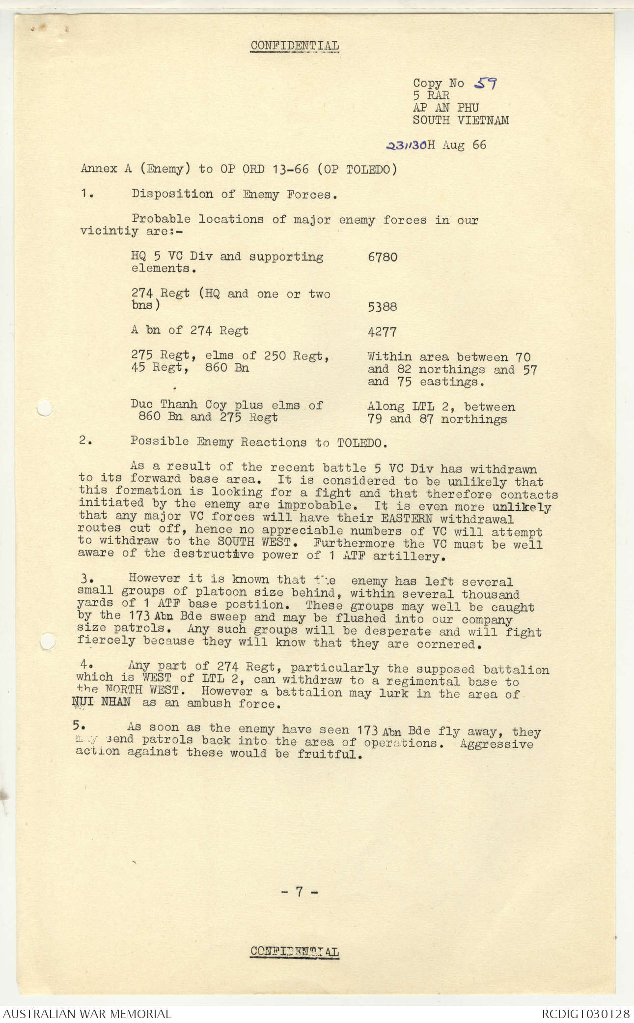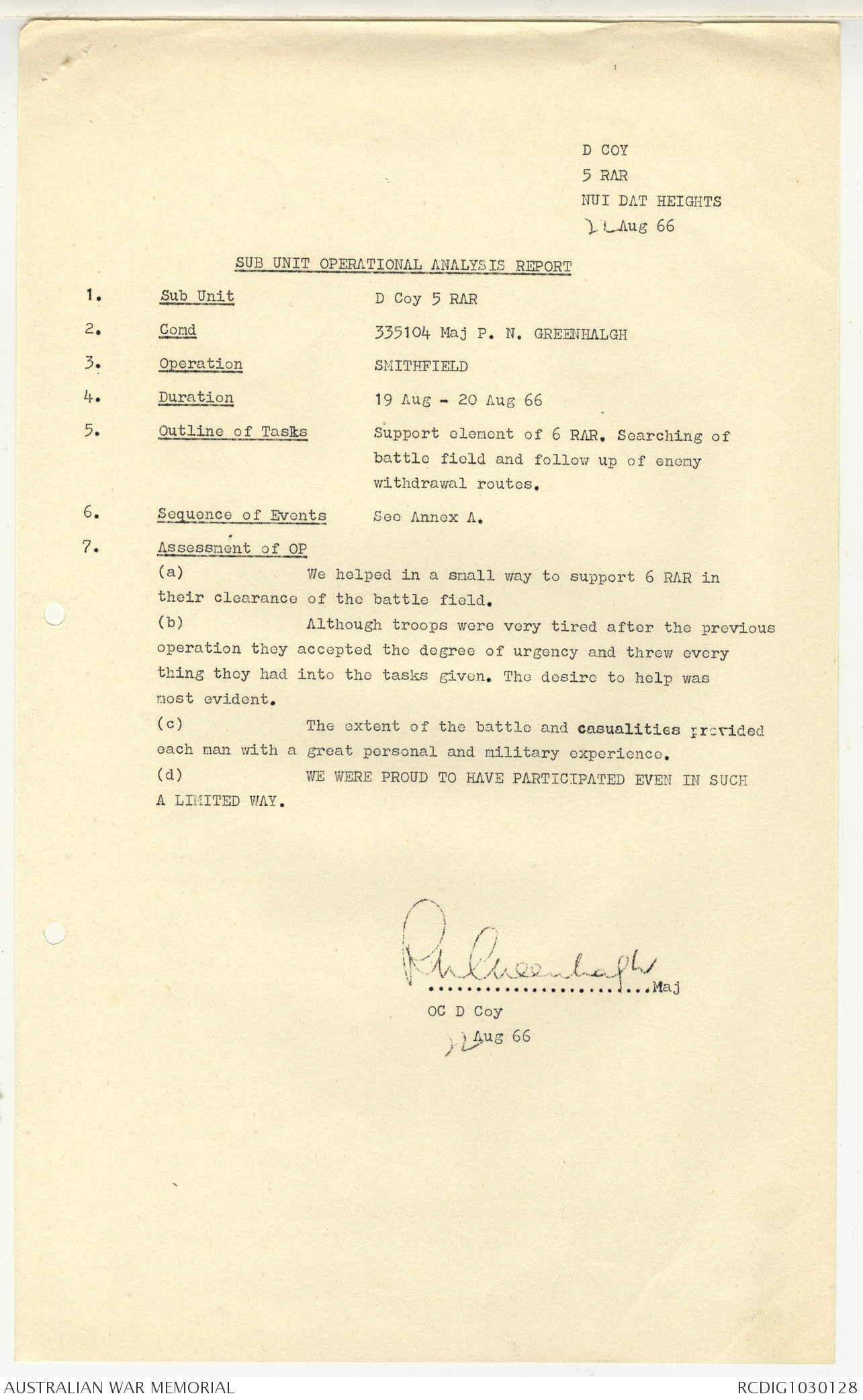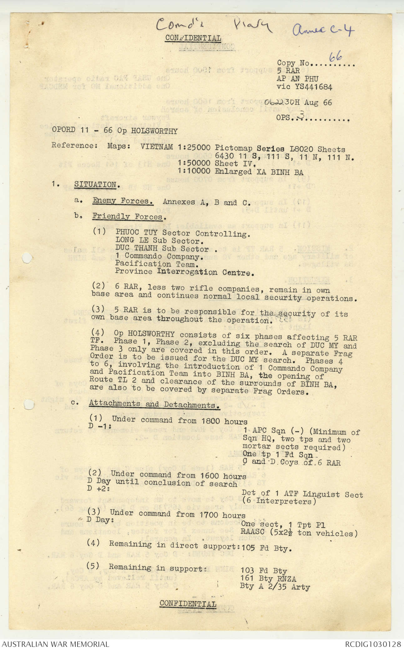 AWM95 7/5/7 PART 1 - 1-31 August 1966, Narrative, Operations log, Annexes