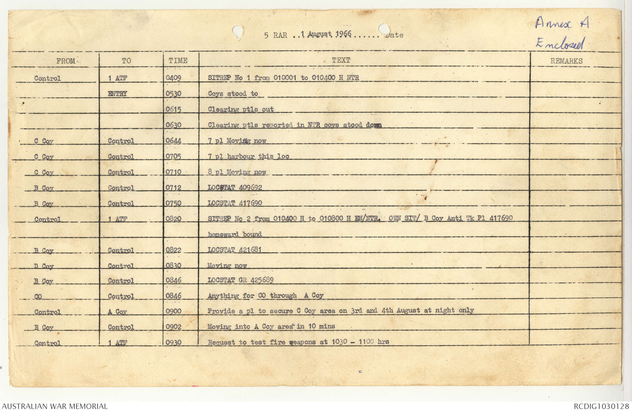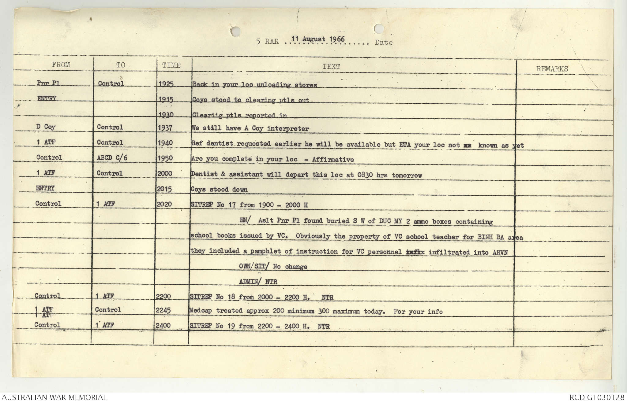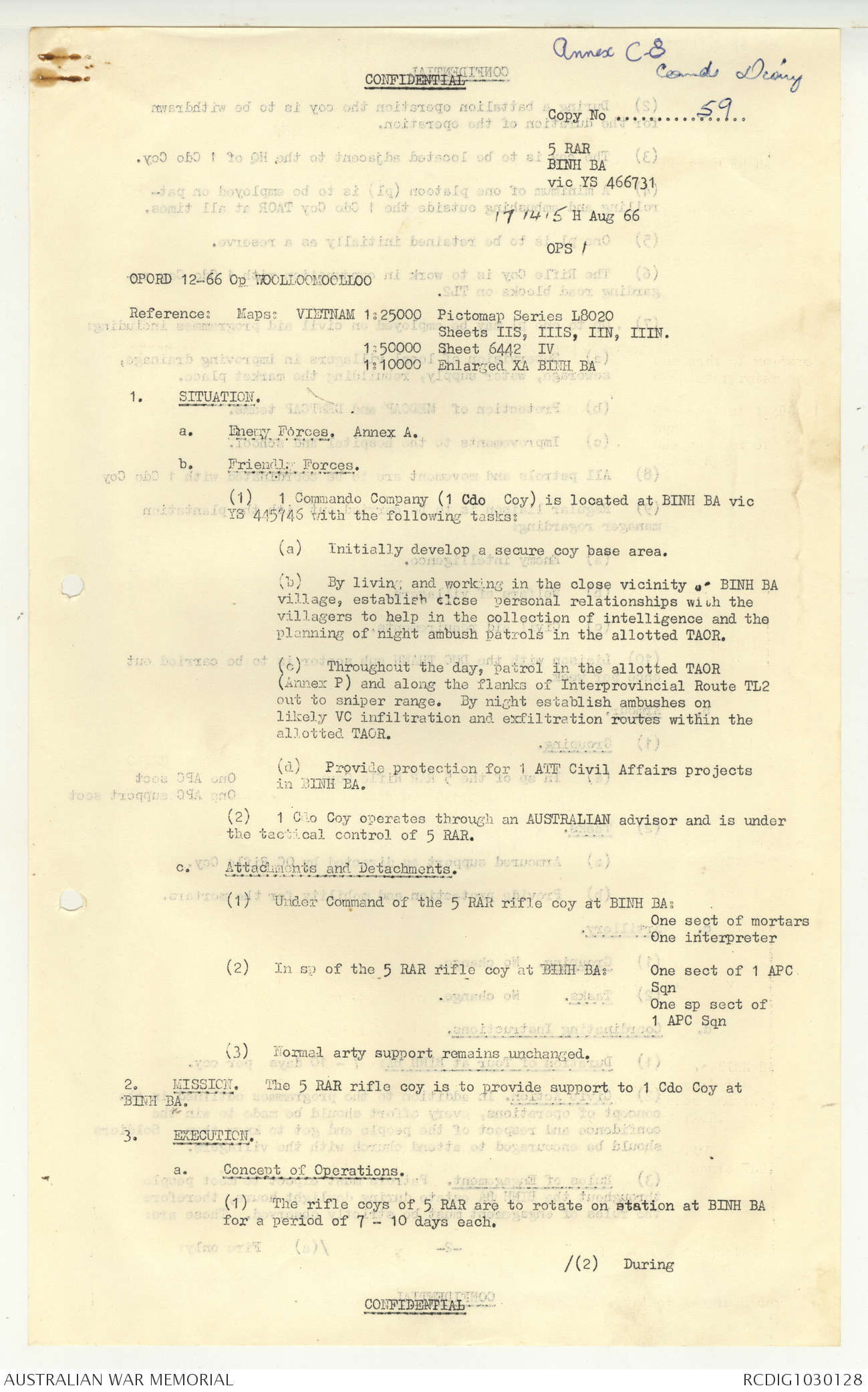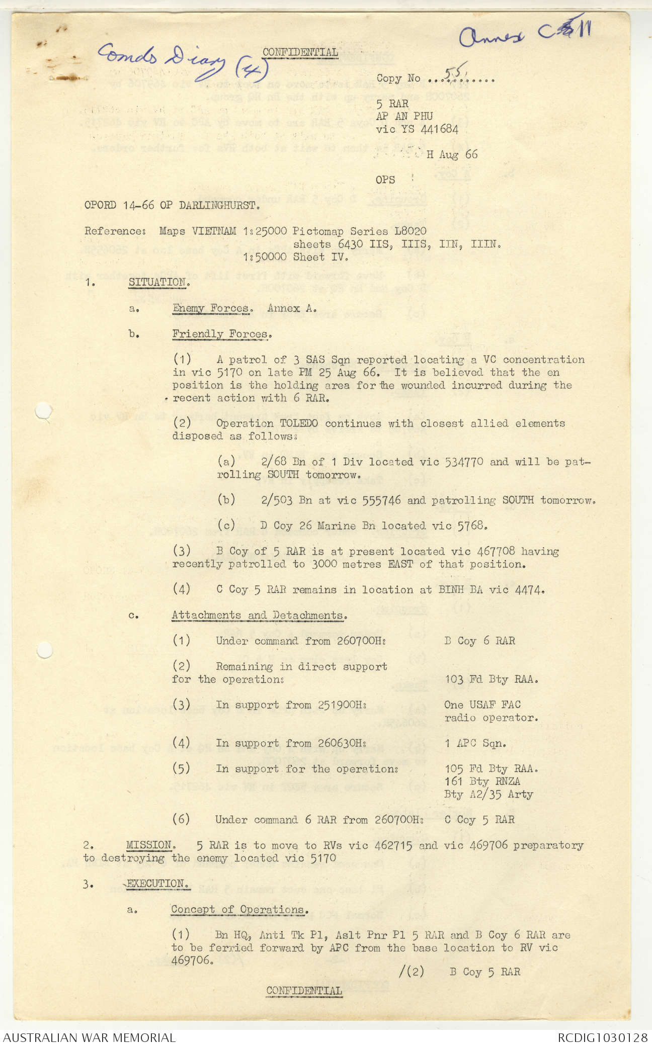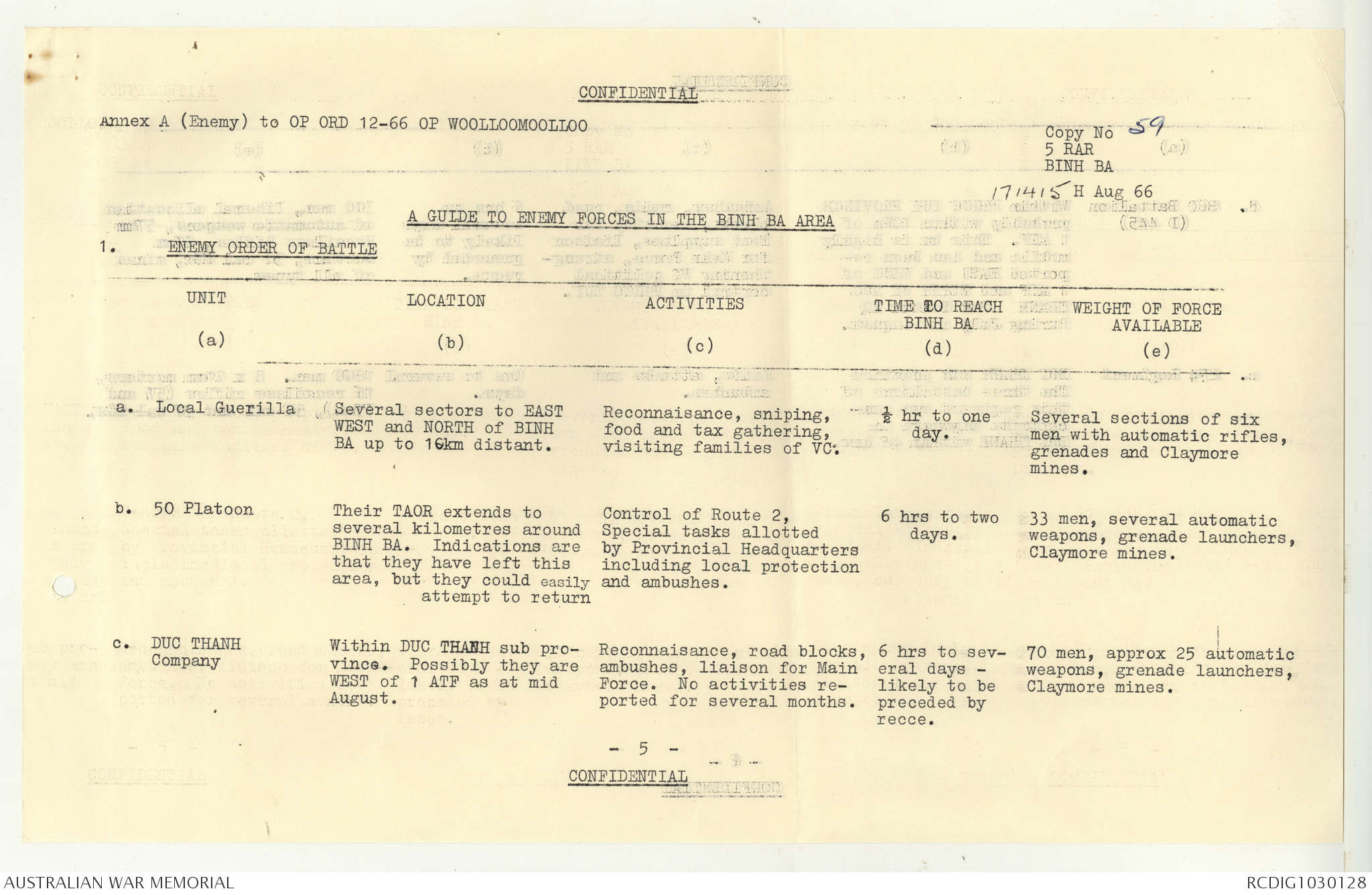 AWM95 7/5/7 PART 1 - 1-31 August 1966, Narrative, Operations log, Annexes
