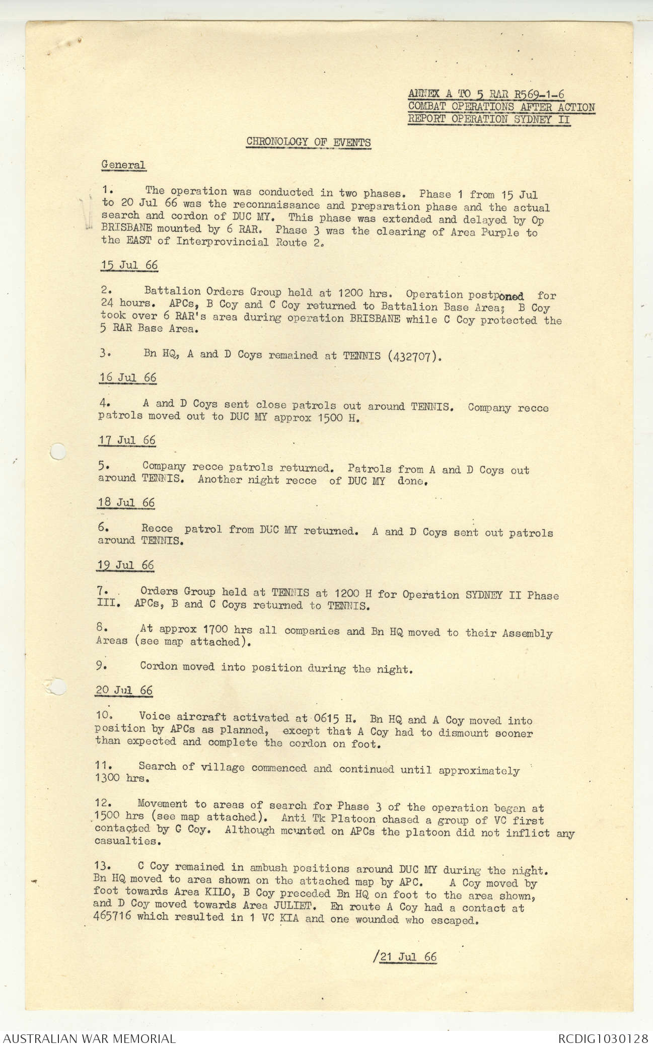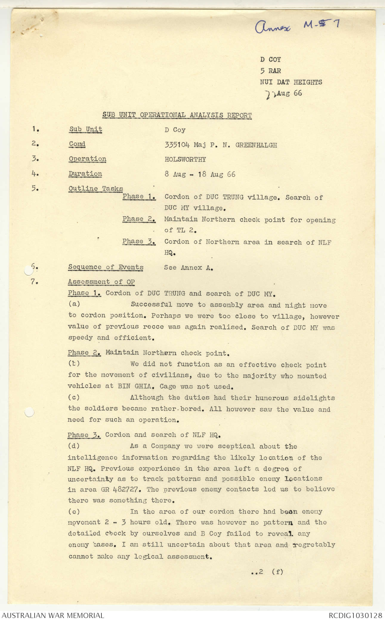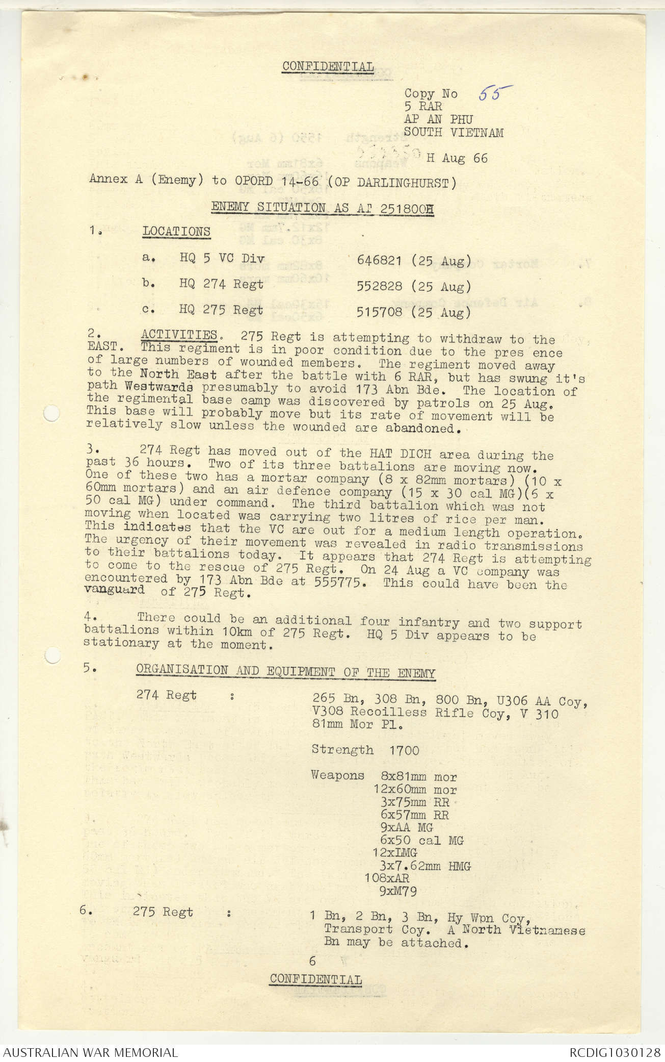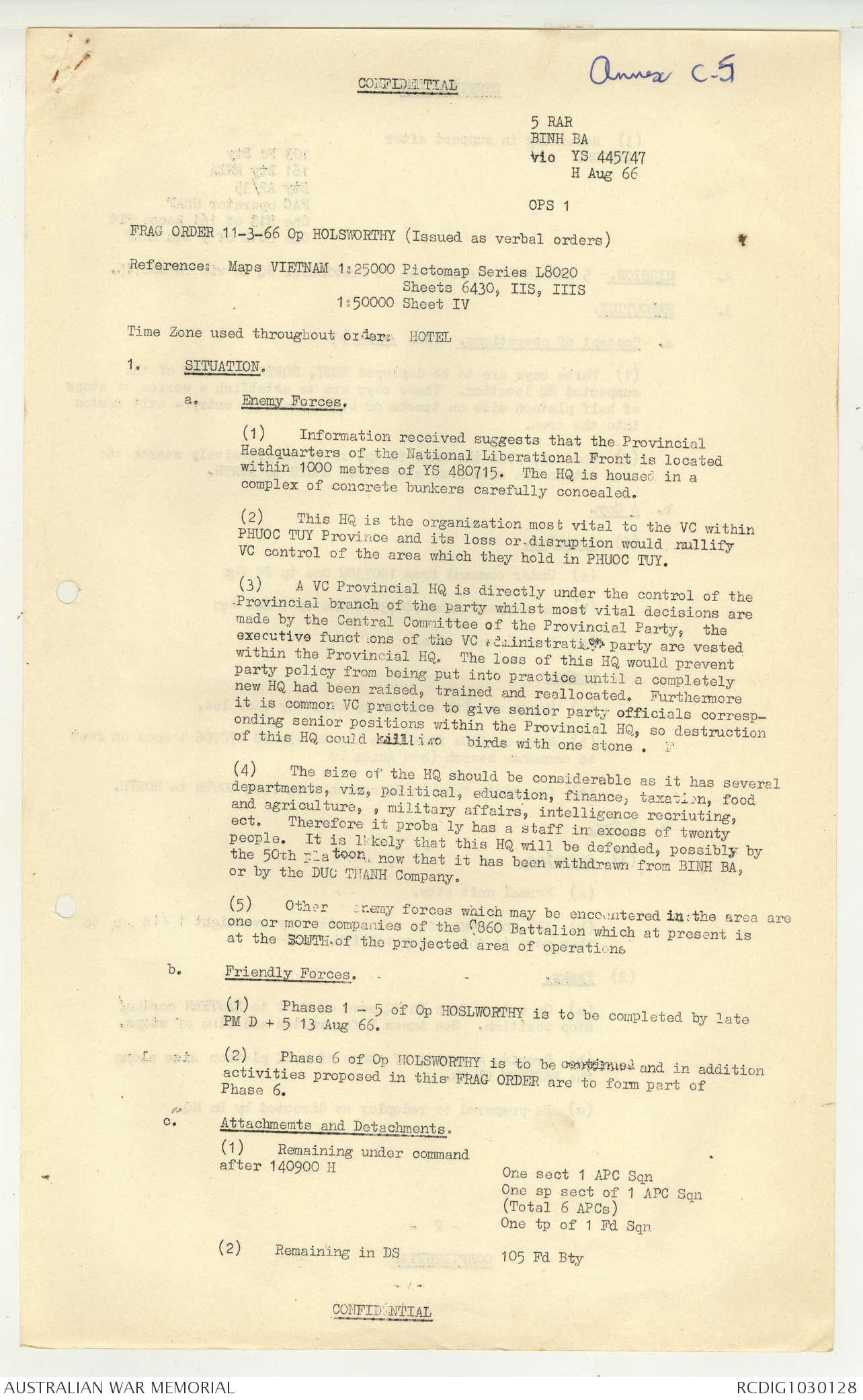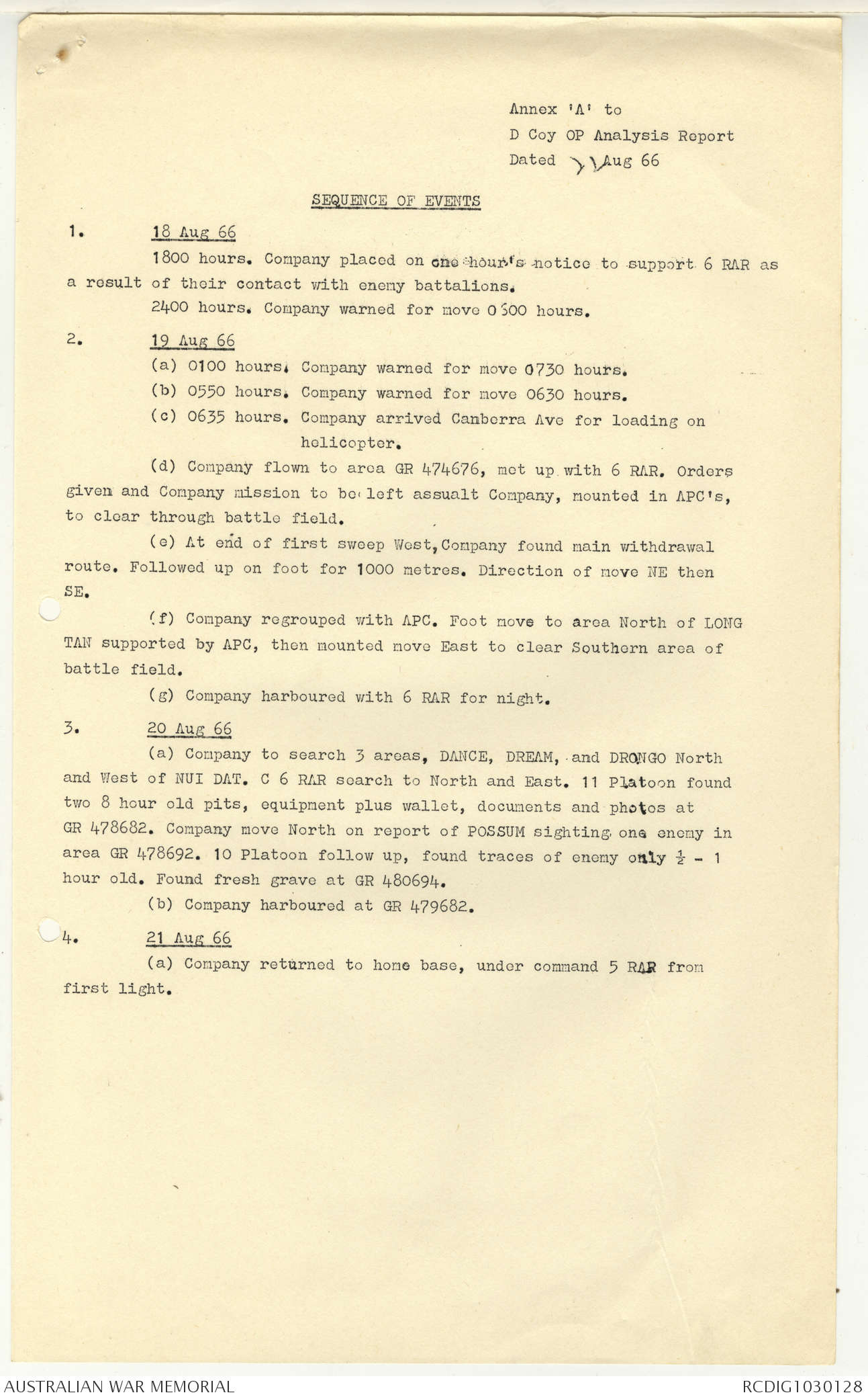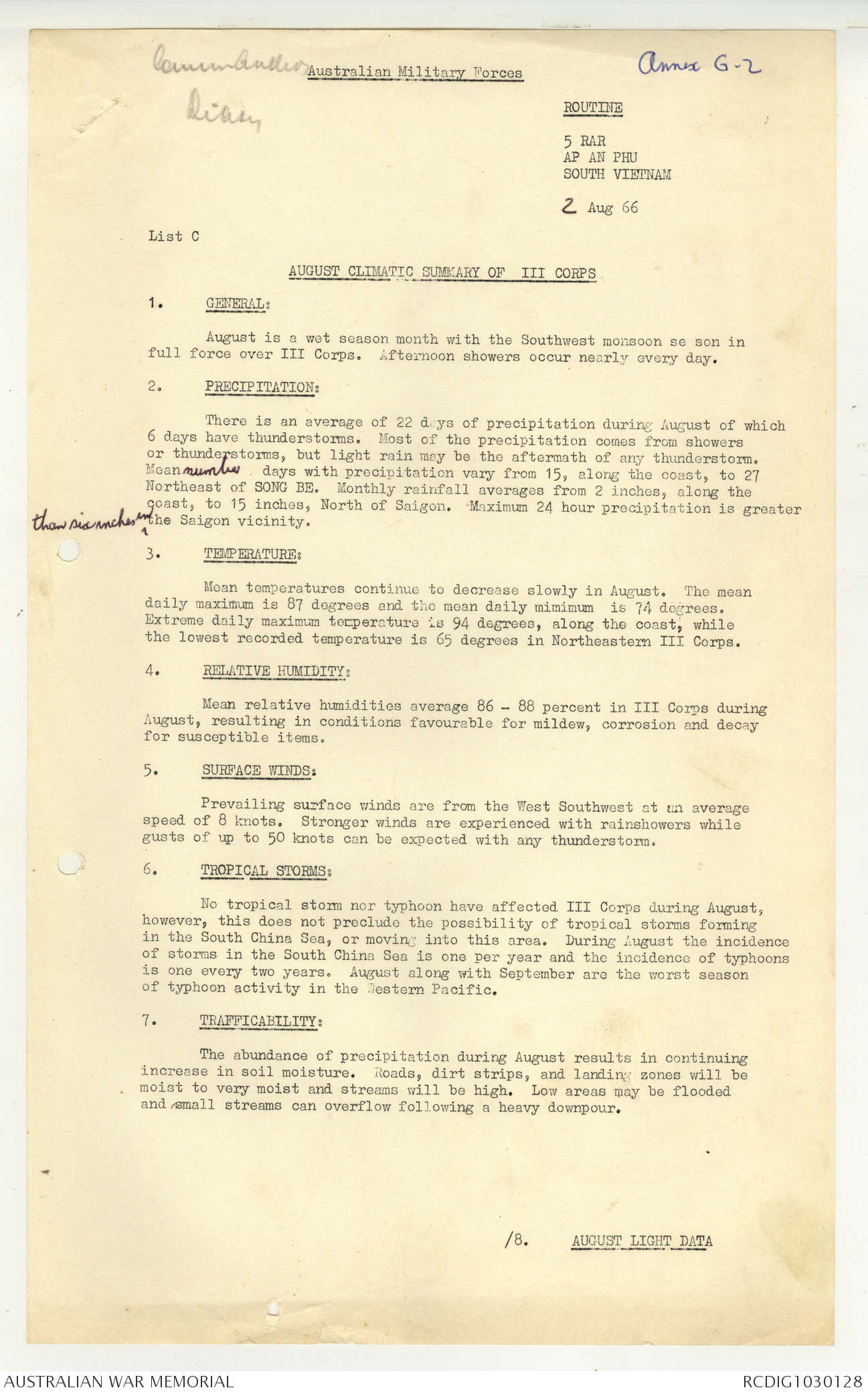 AWM95 7/5/7 PART 1 - 1-31 August 1966, Narrative, Operations log, Annexes