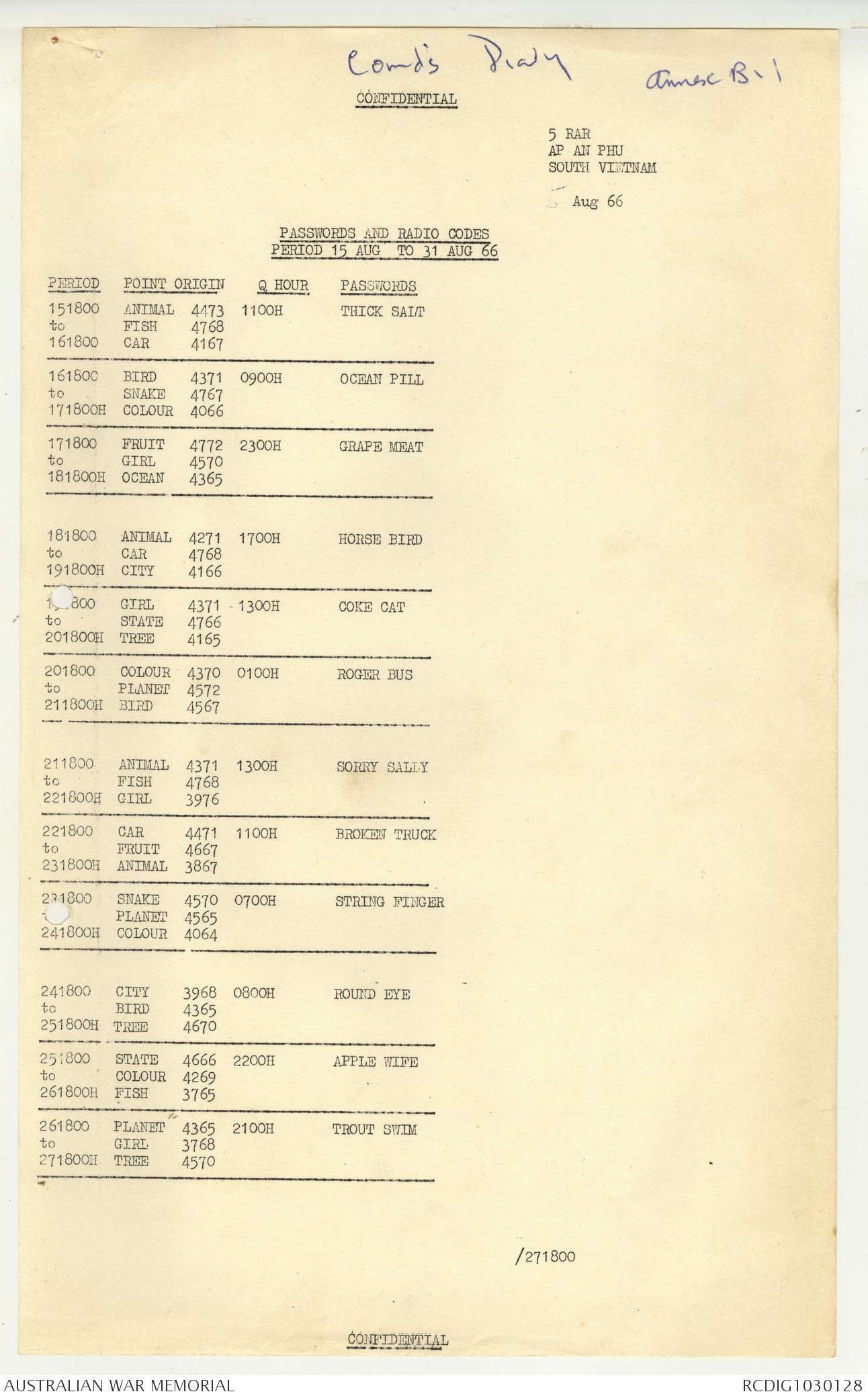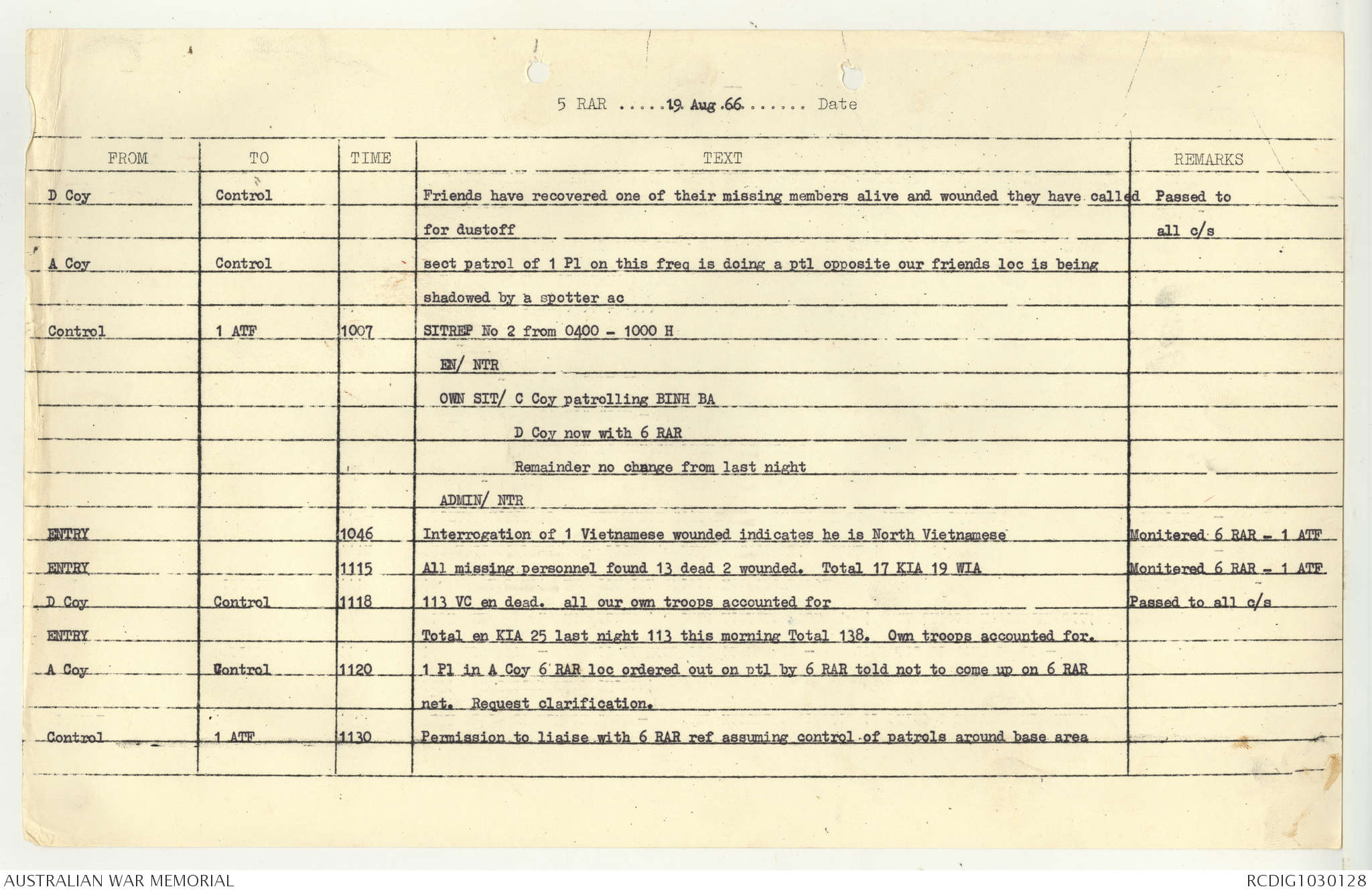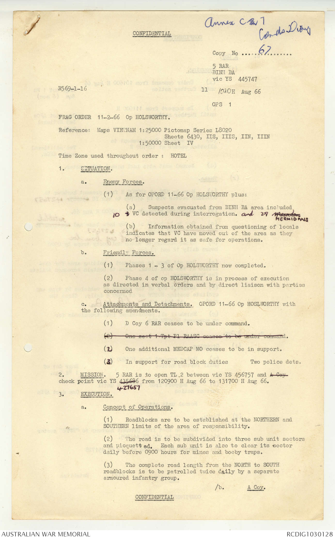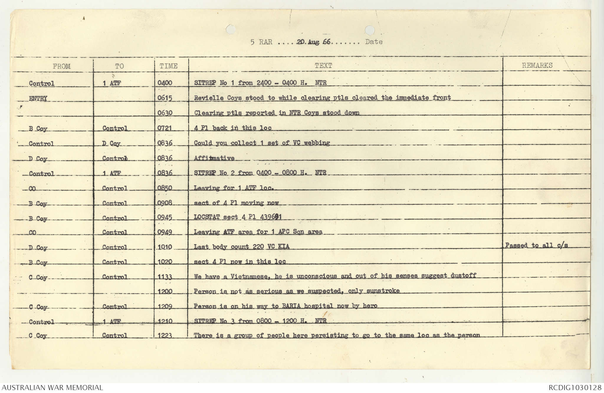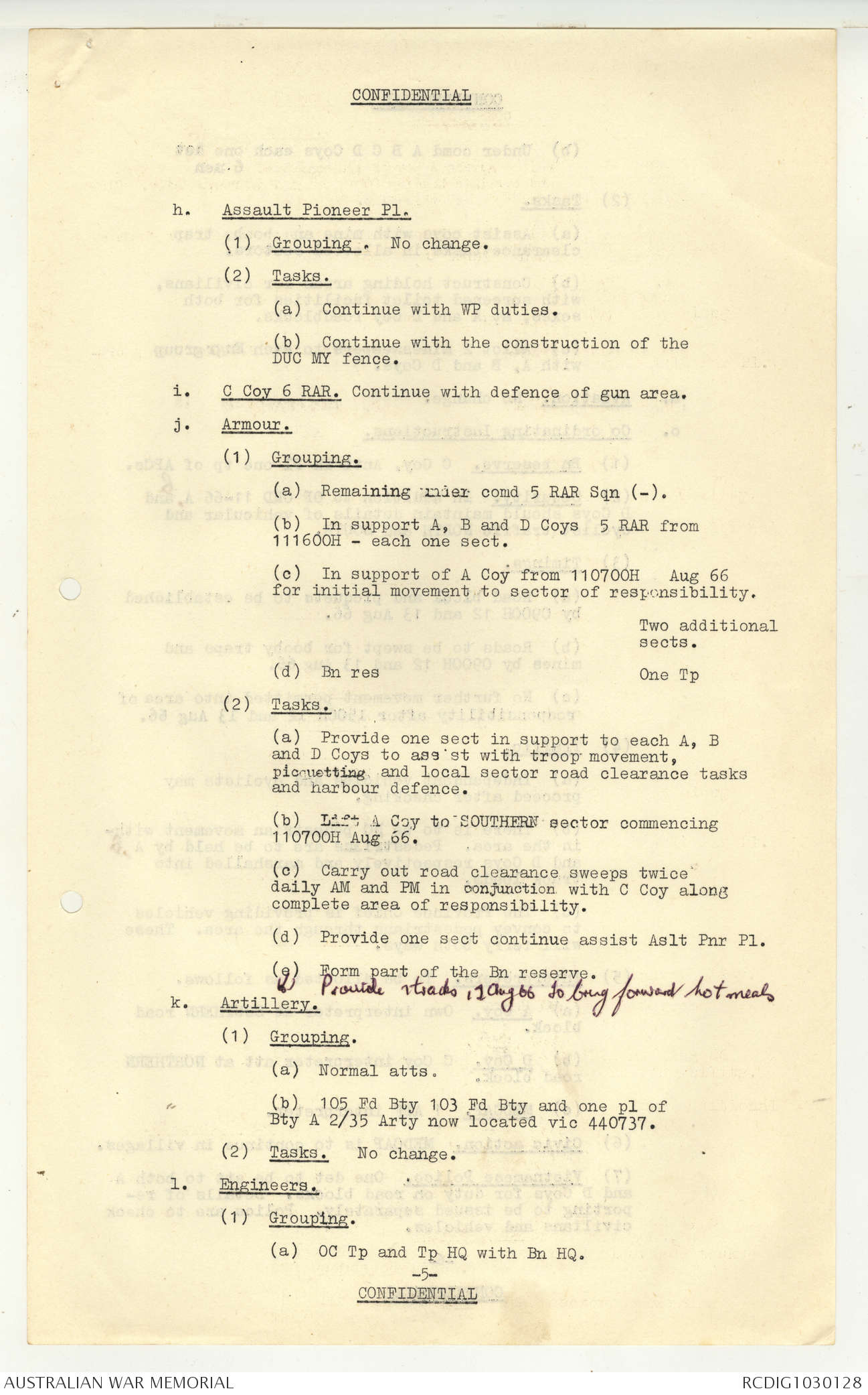 AWM95 7/5/7 PART 1 - 1-31 August 1966, Narrative, Operations log, Annexes