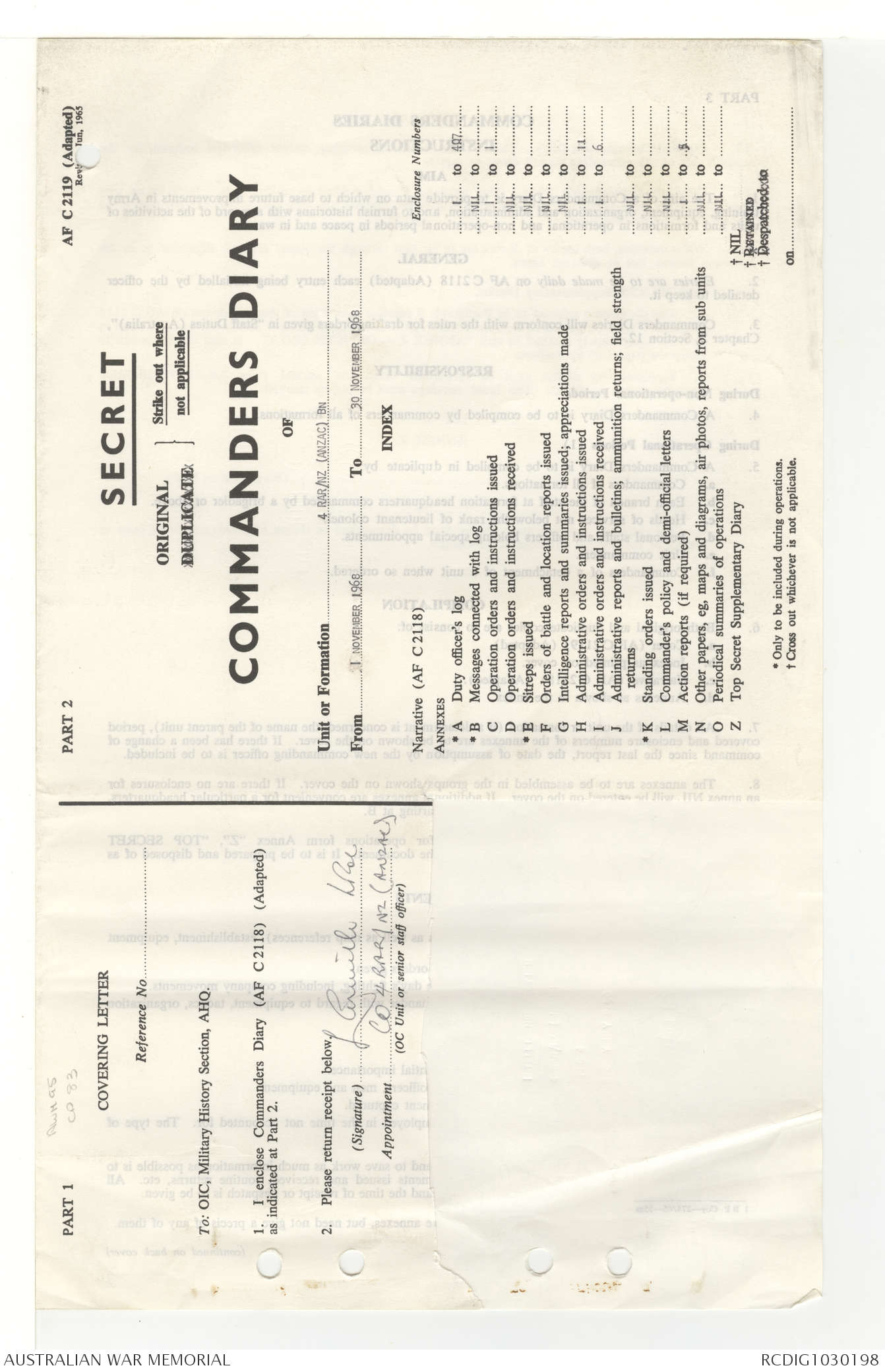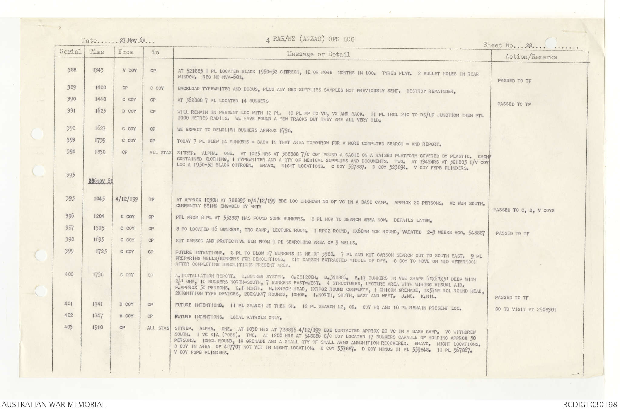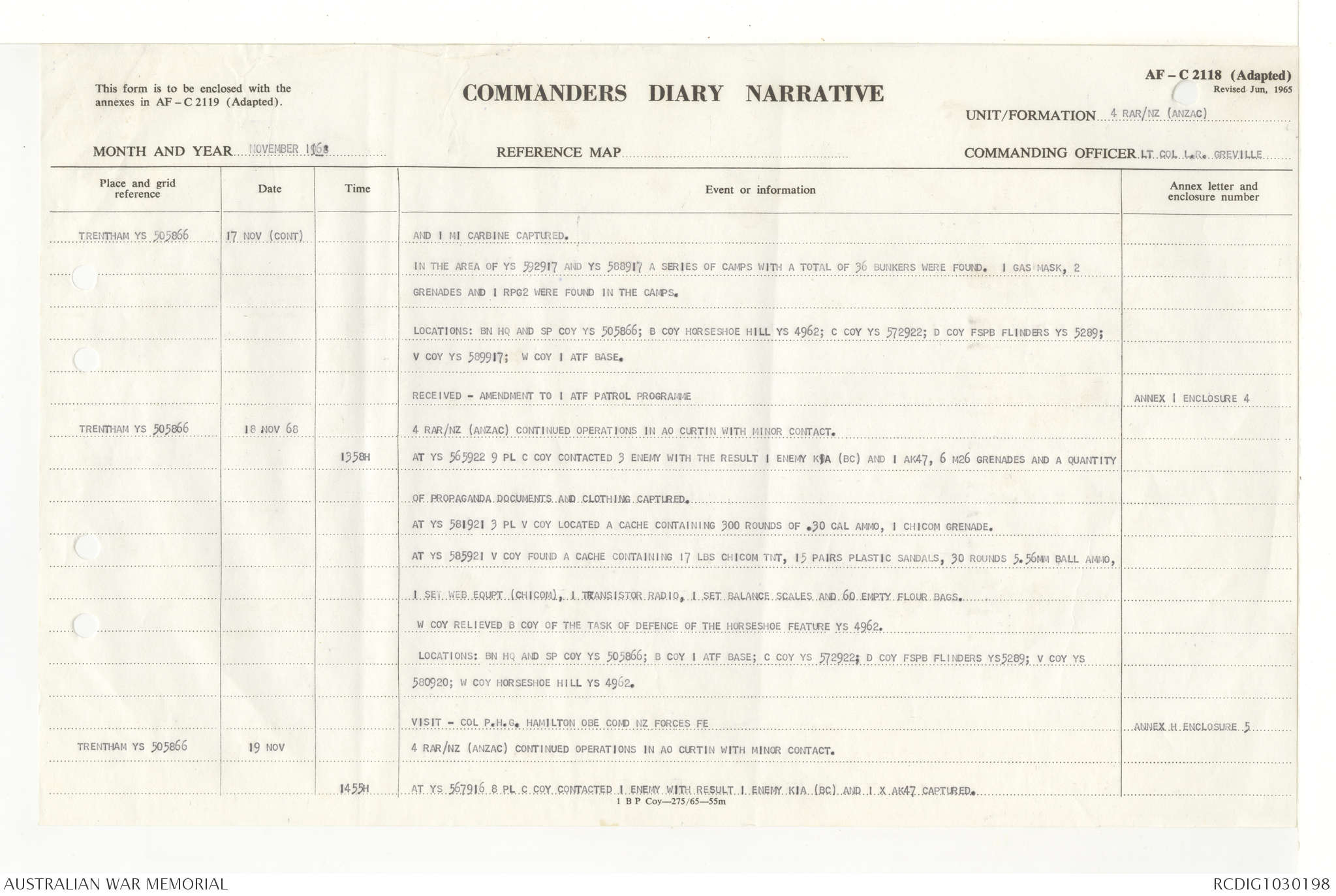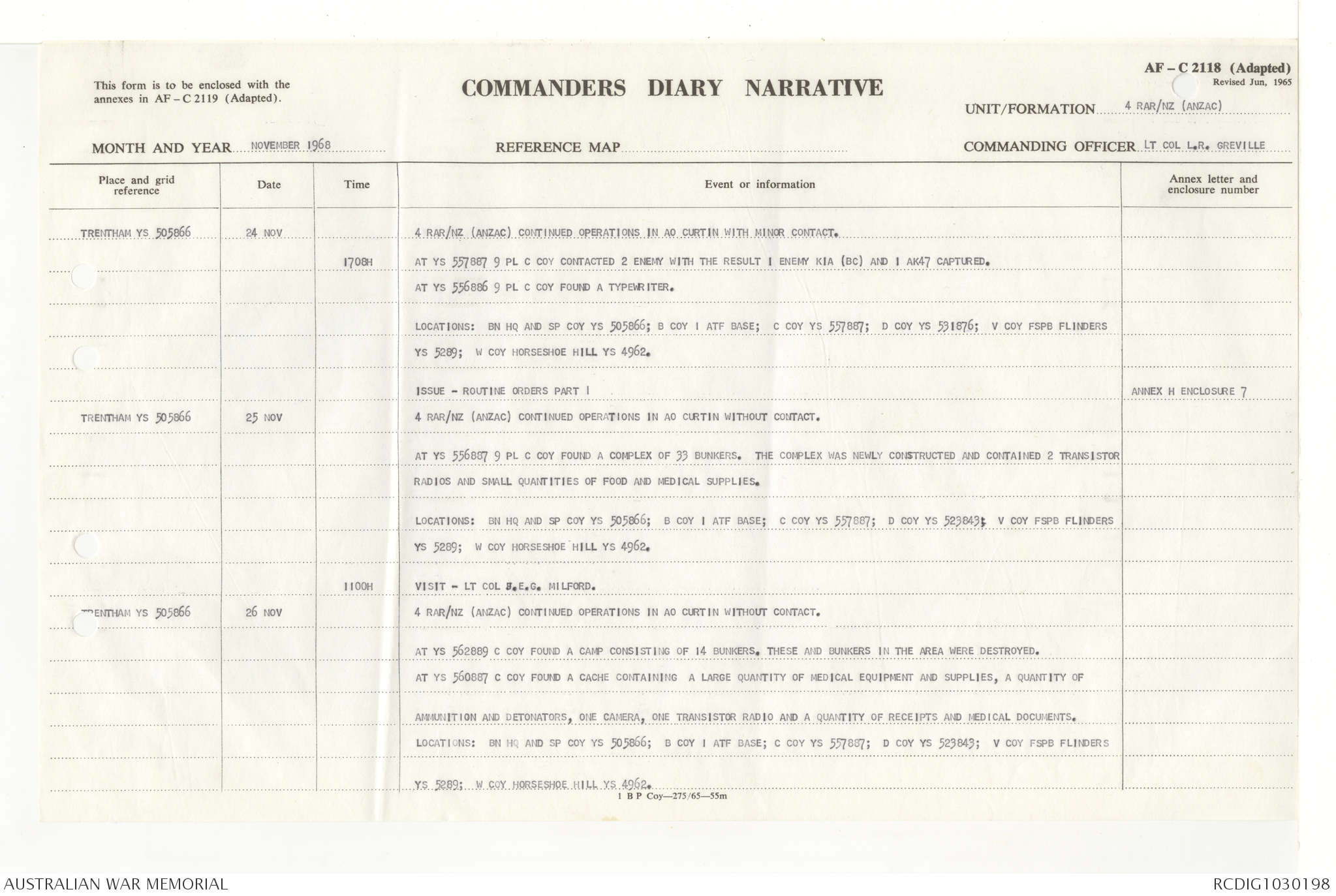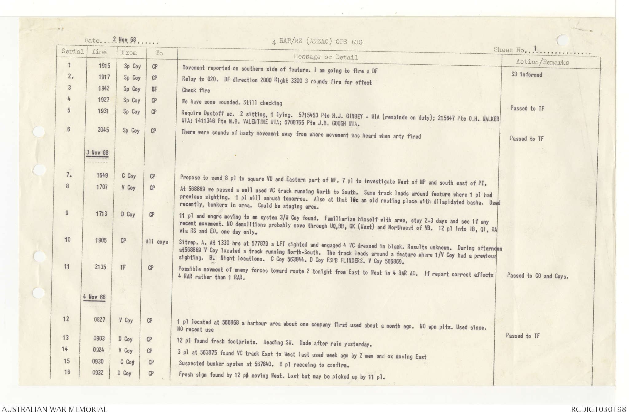 AWM95 7/4/33 - 1-30 November 1968, Narrative, Duty Officer's log, Annexes