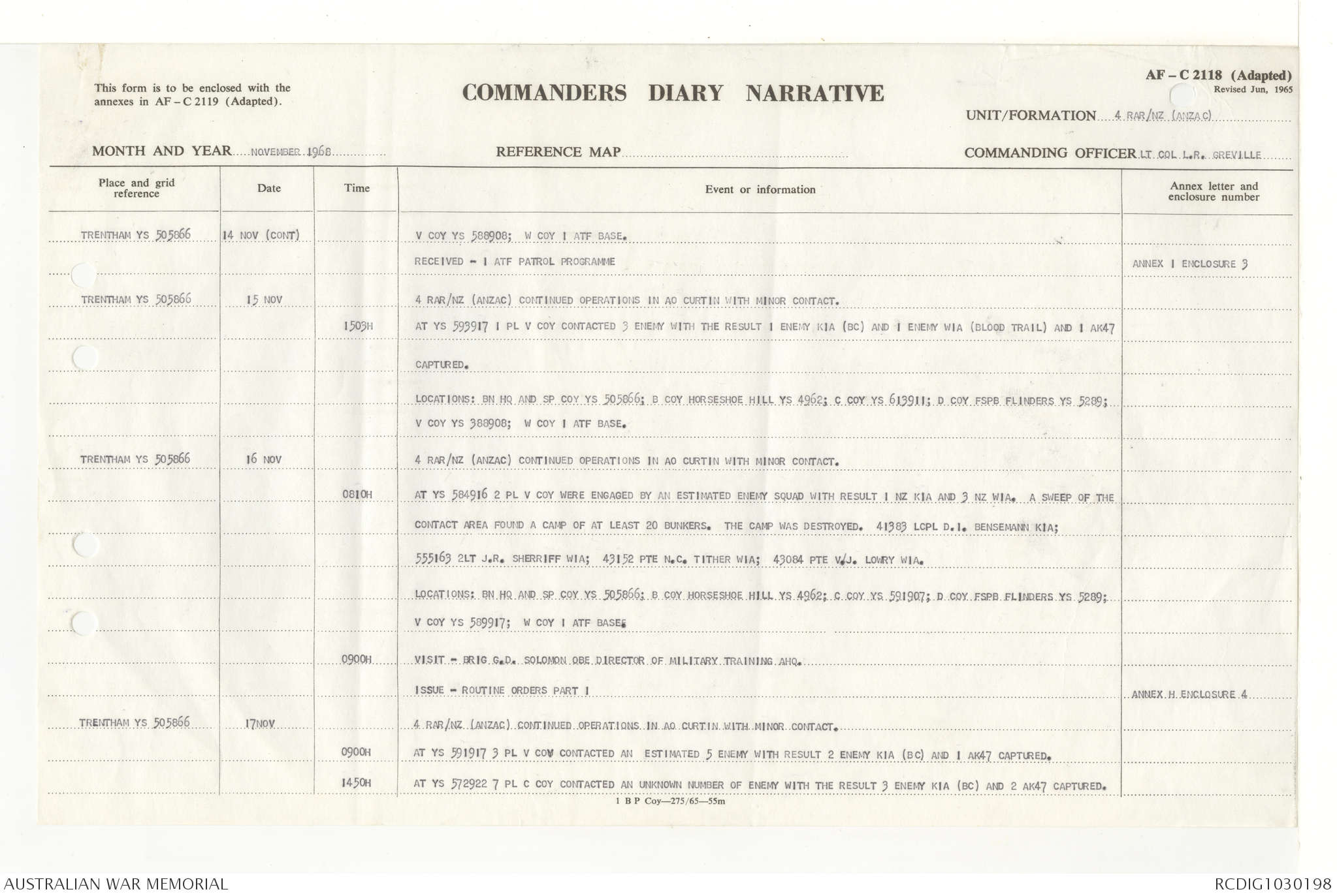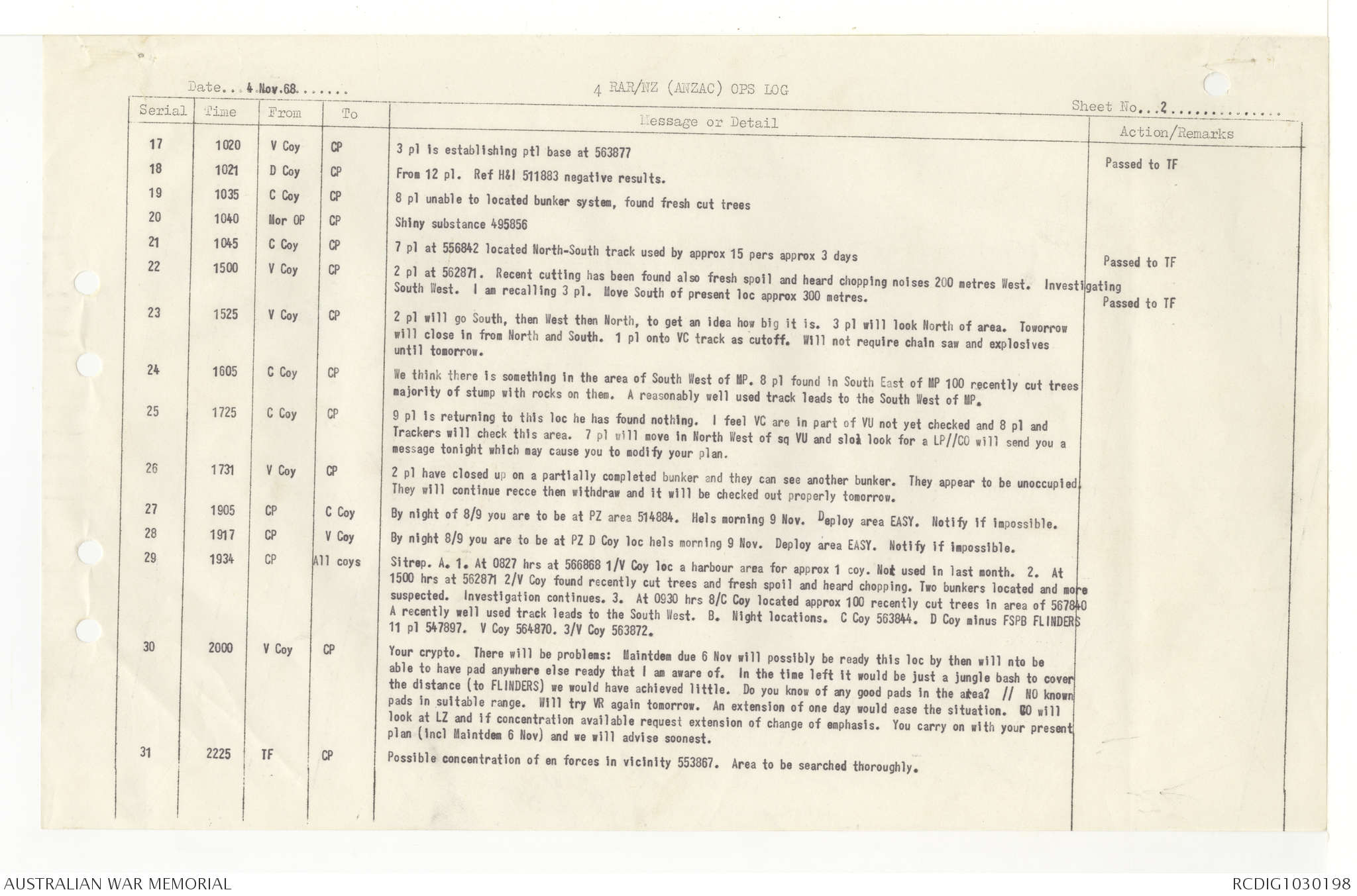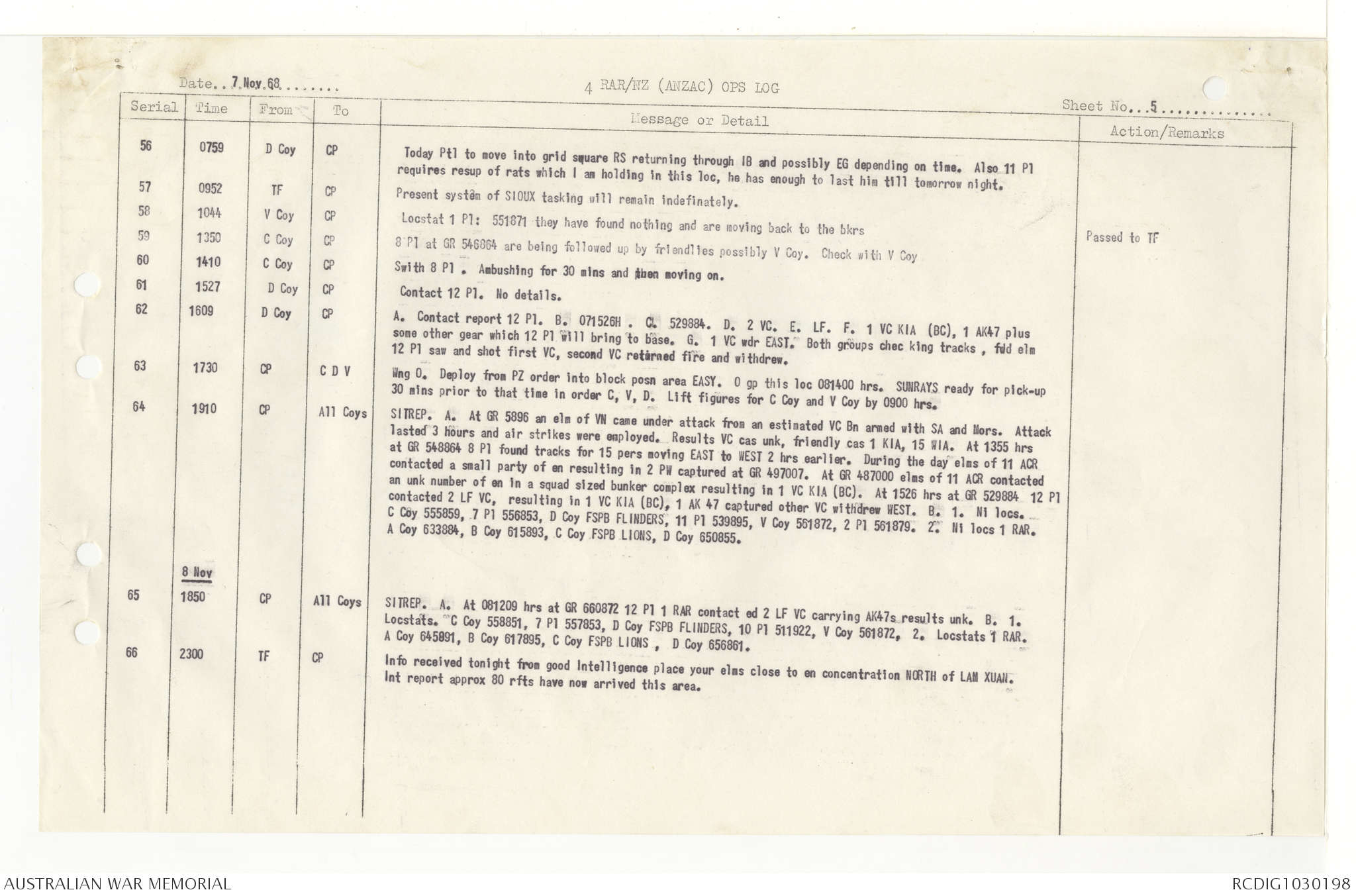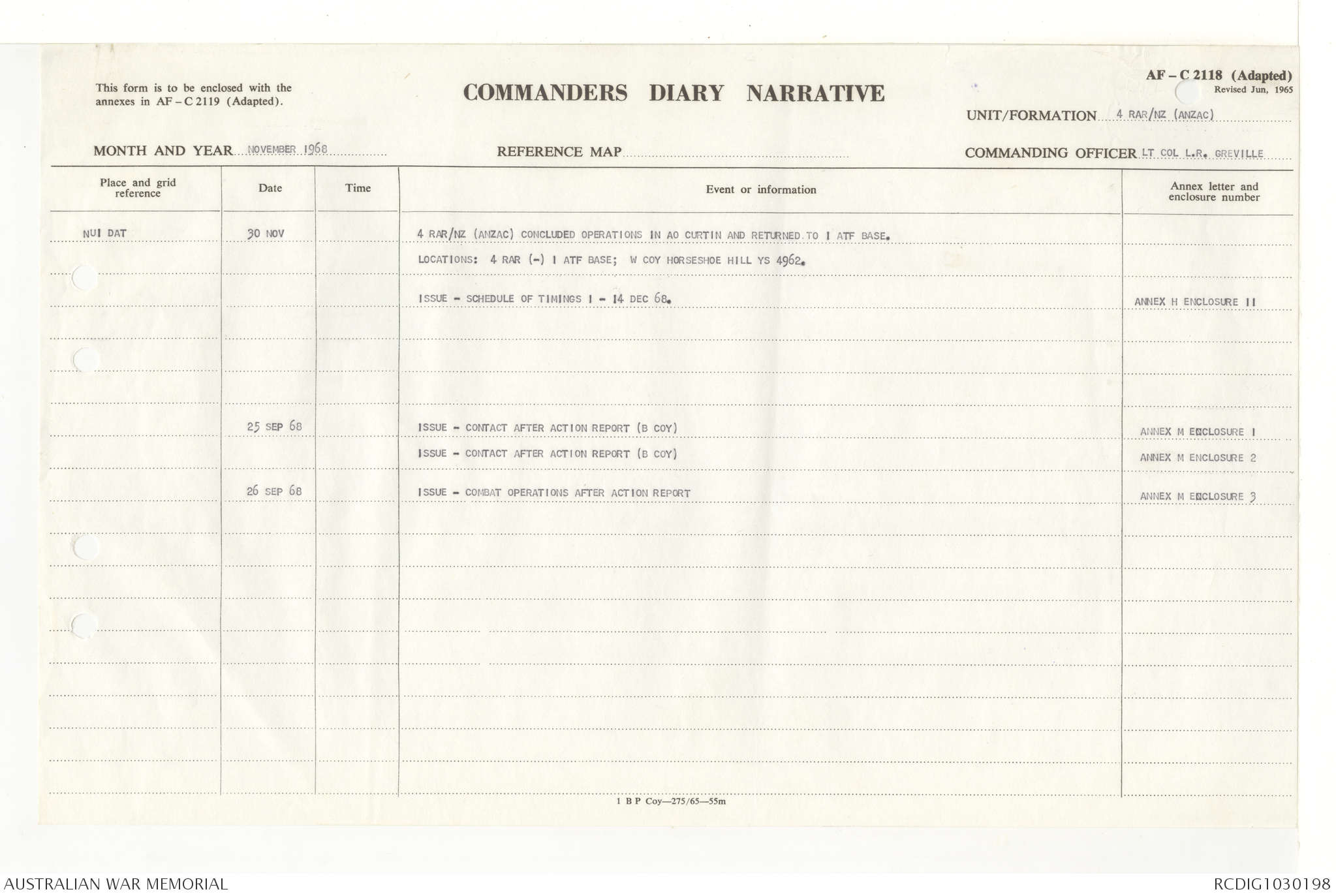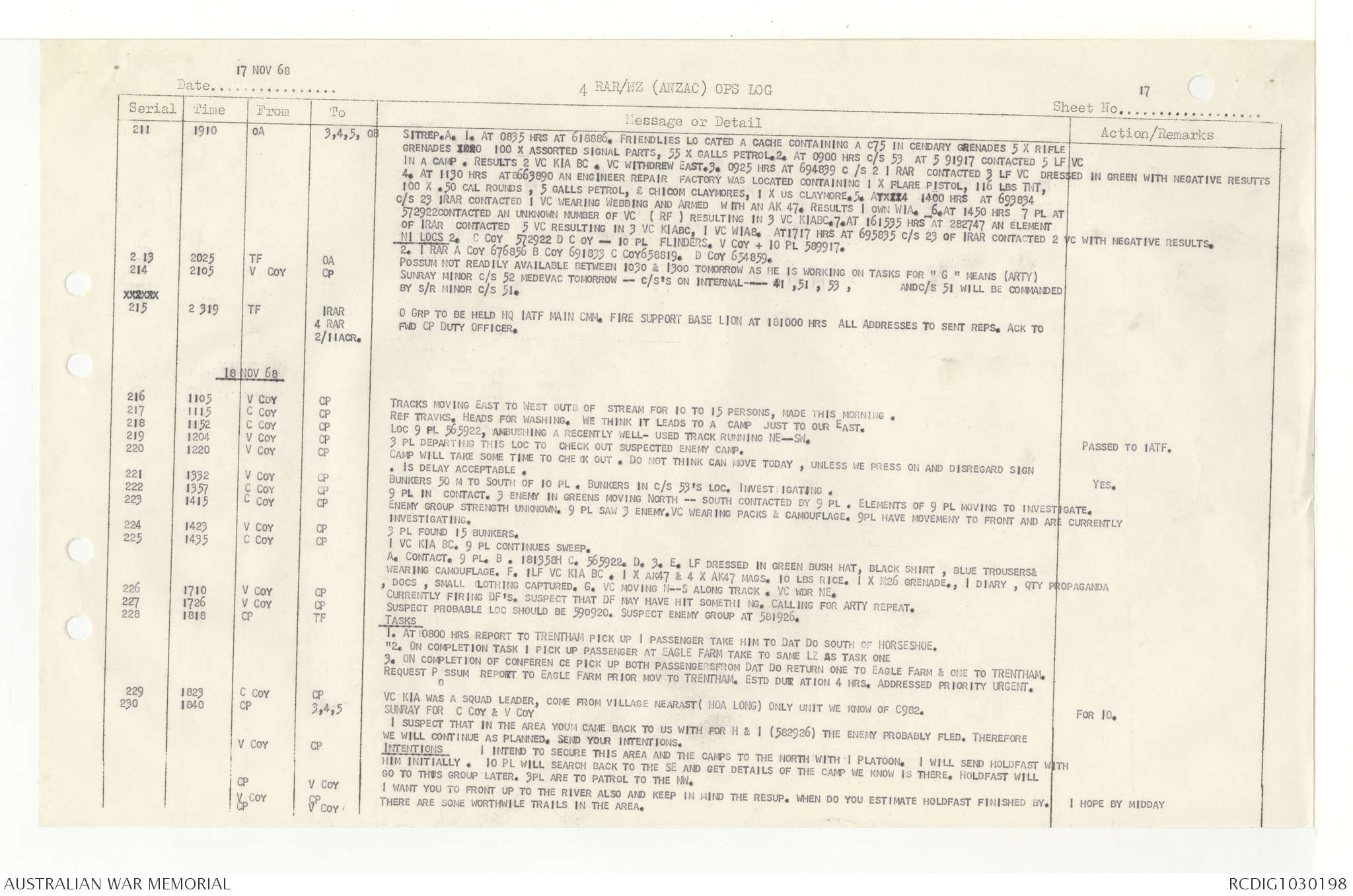 AWM95 7/4/33 - 1-30 November 1968, Narrative, Duty Officer's log, Annexes