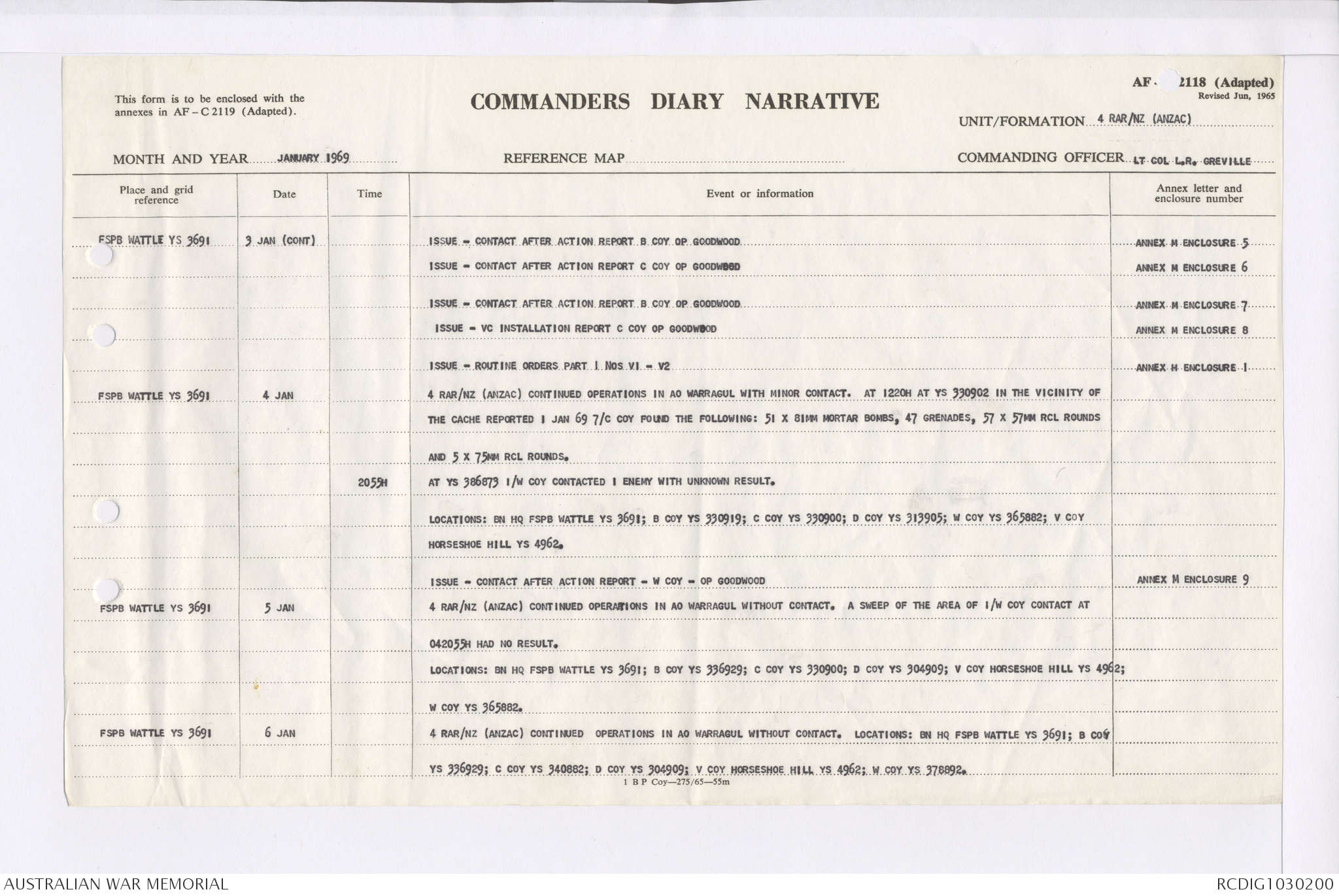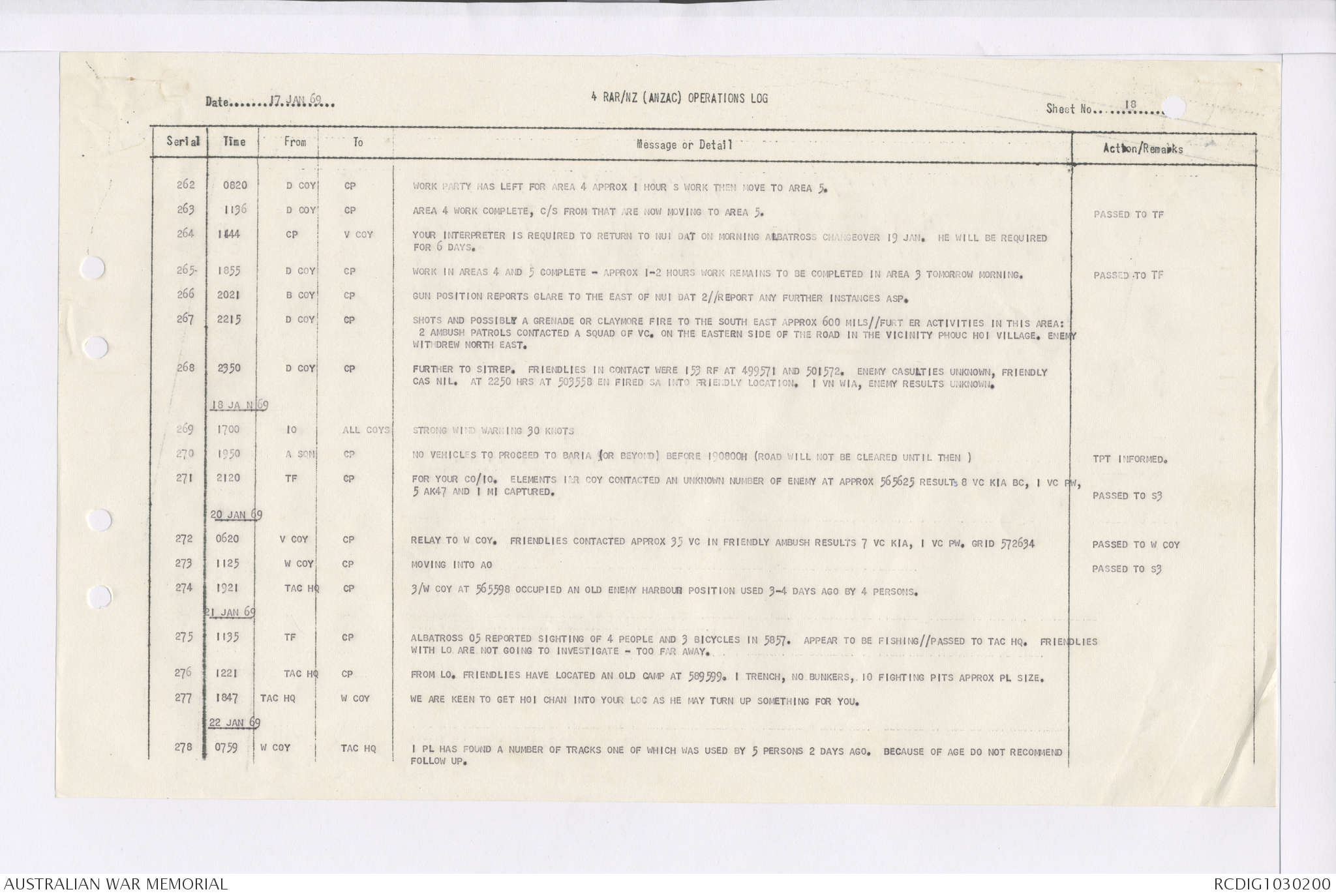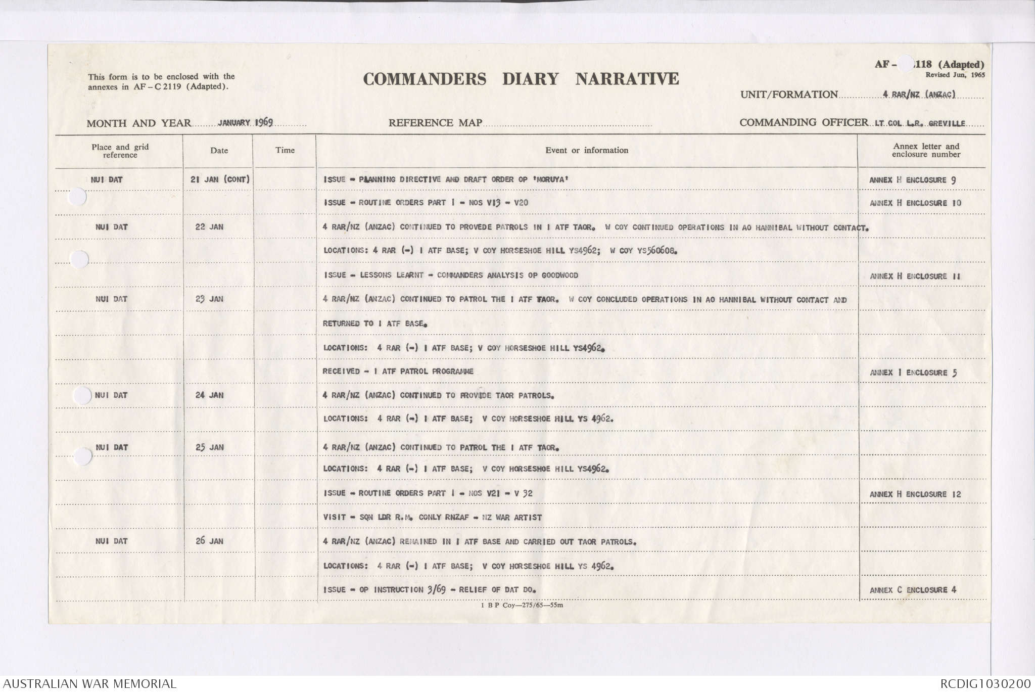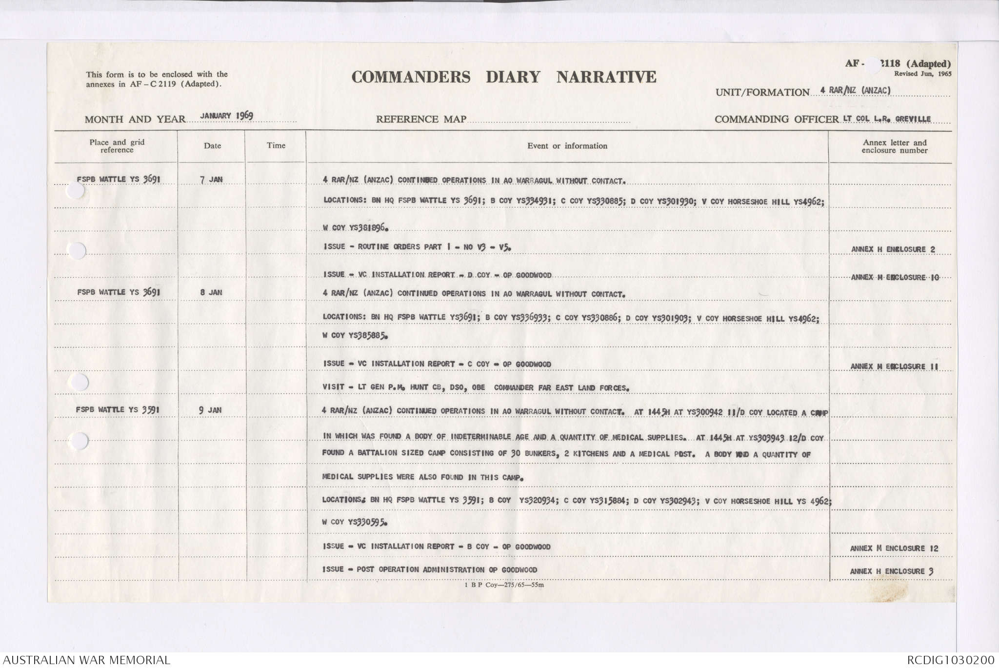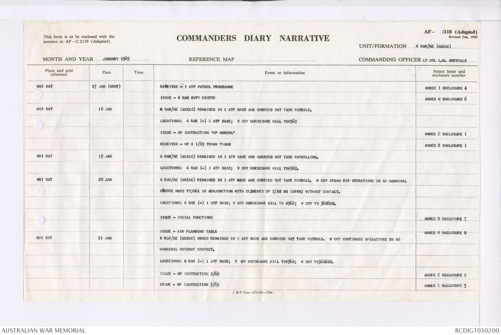 AWM95 7/4/35 - 1-31 January 1969, Narrative, Duty Officer's log, Maps, Annexes