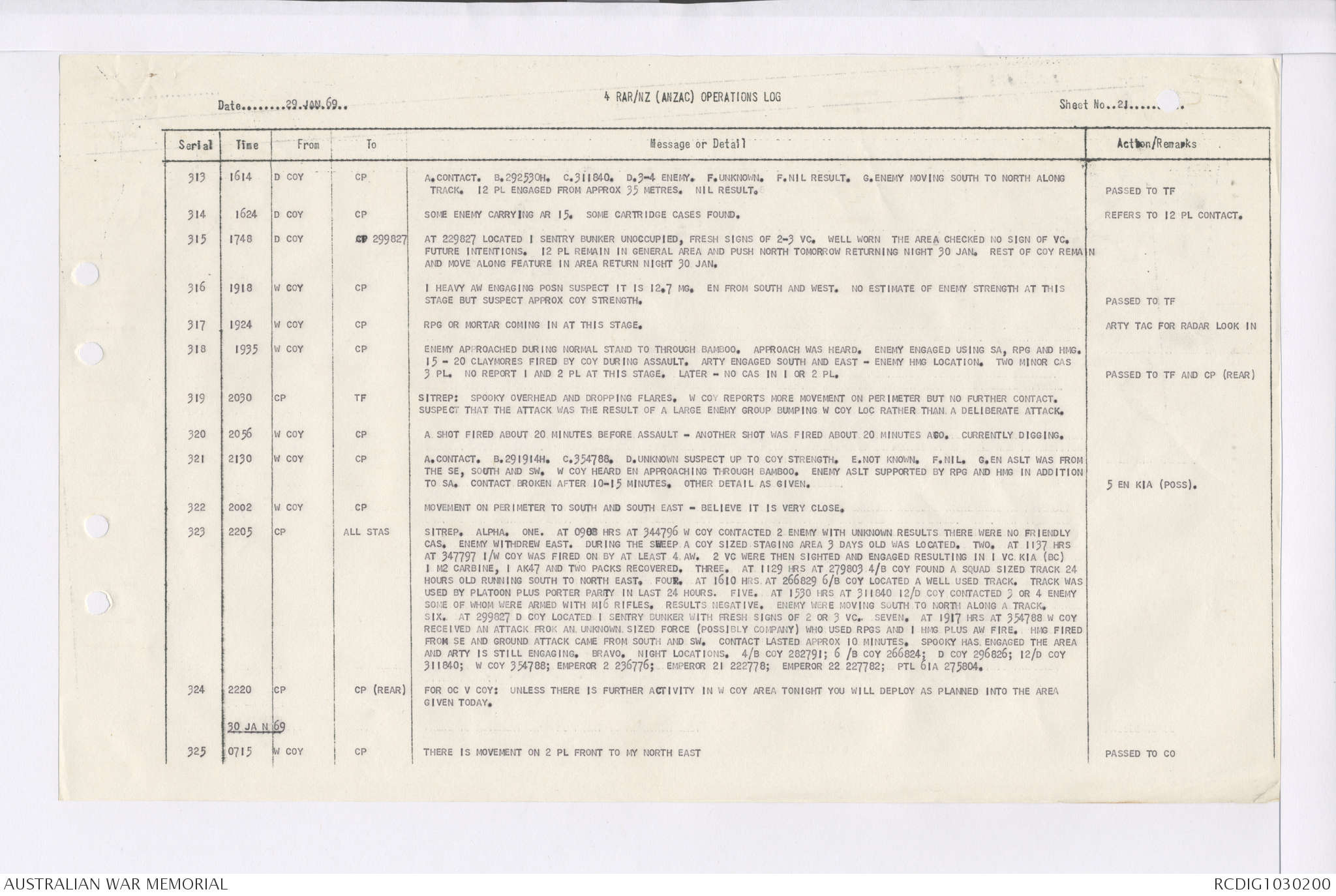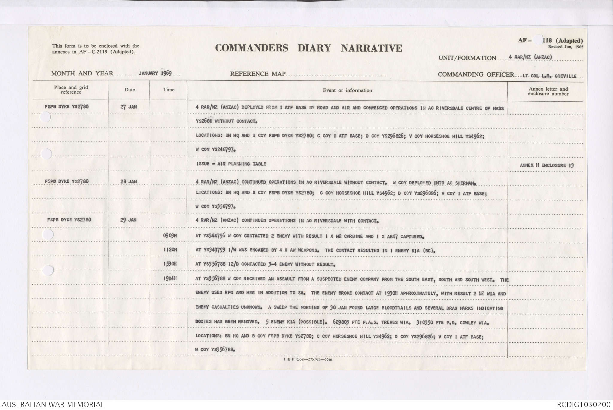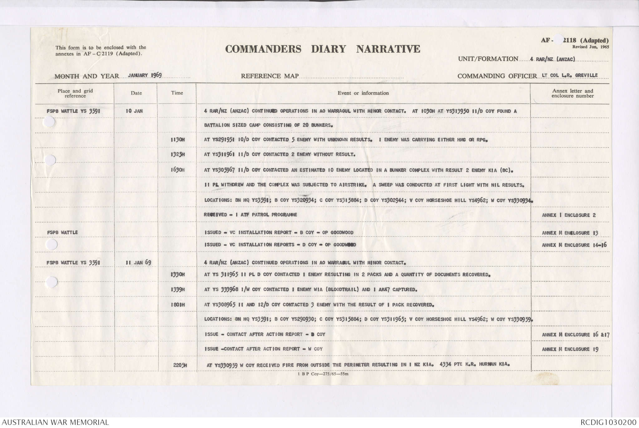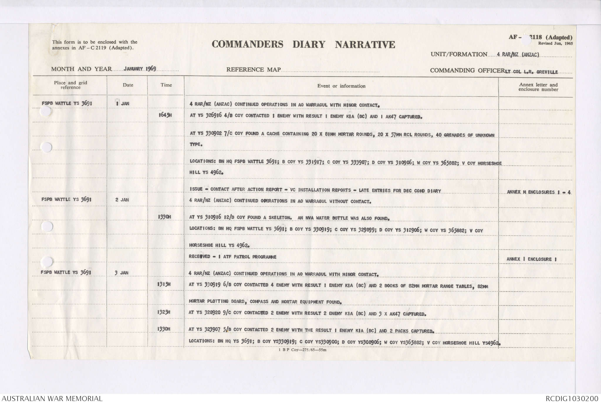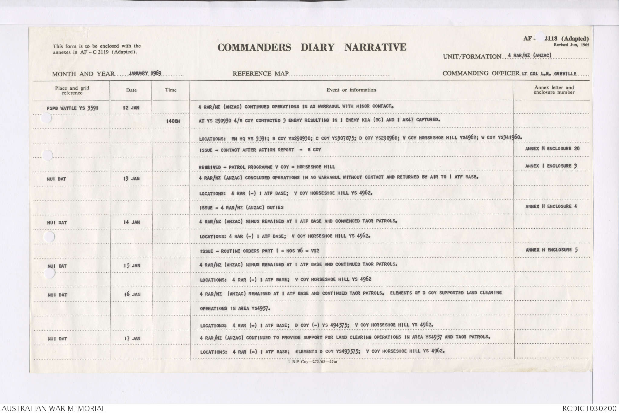 AWM95 7/4/35 - 1-31 January 1969, Narrative, Duty Officer's log, Maps, Annexes