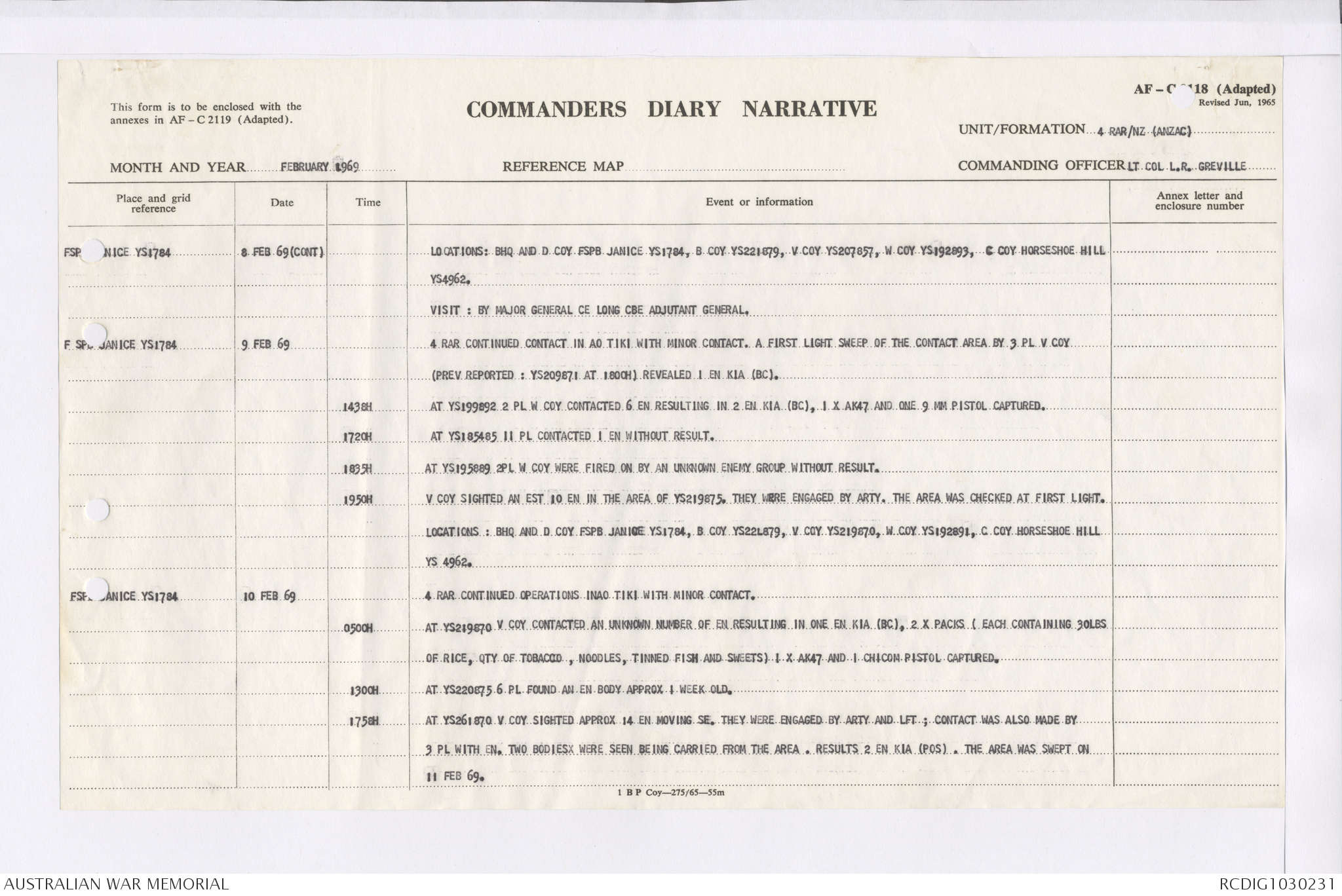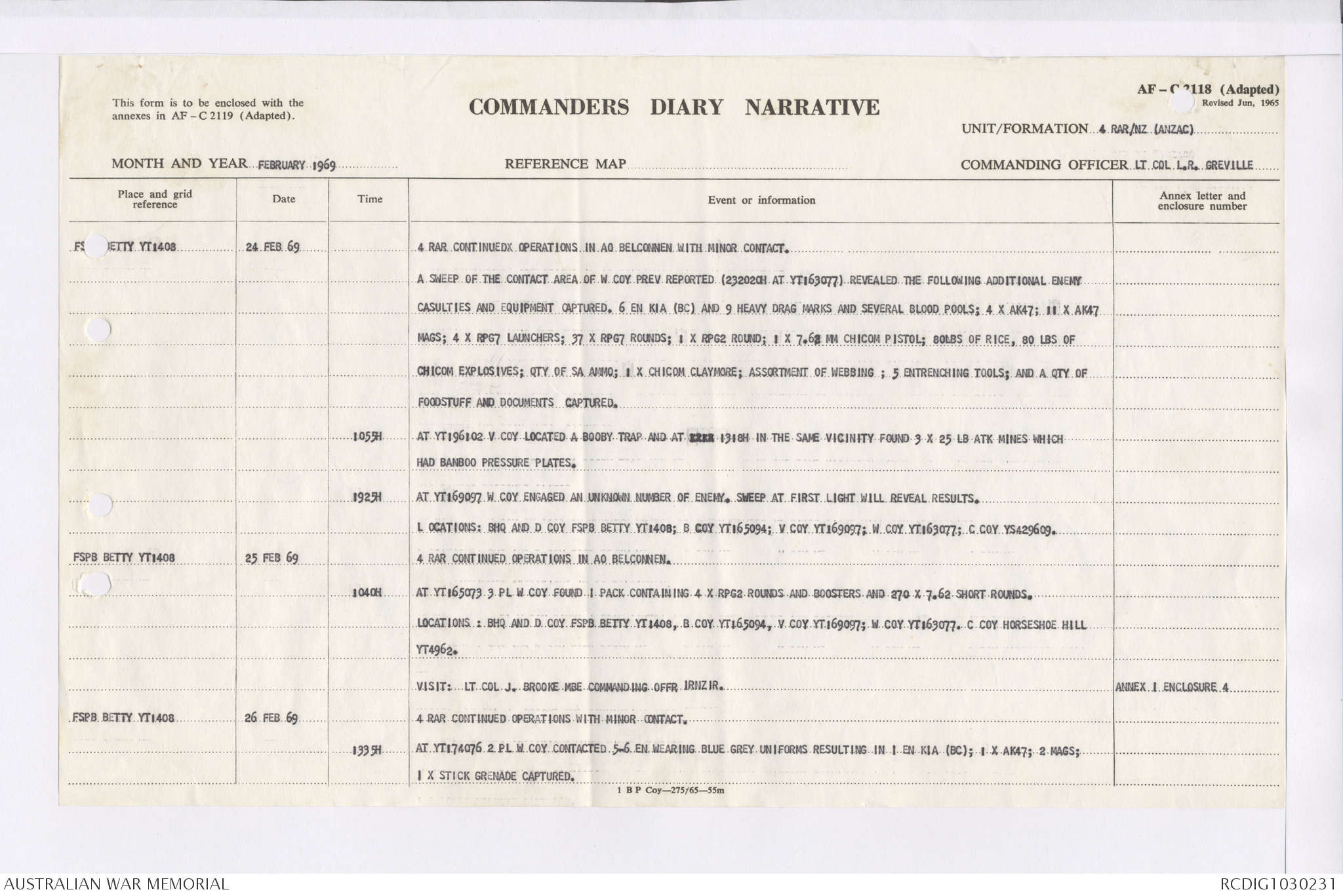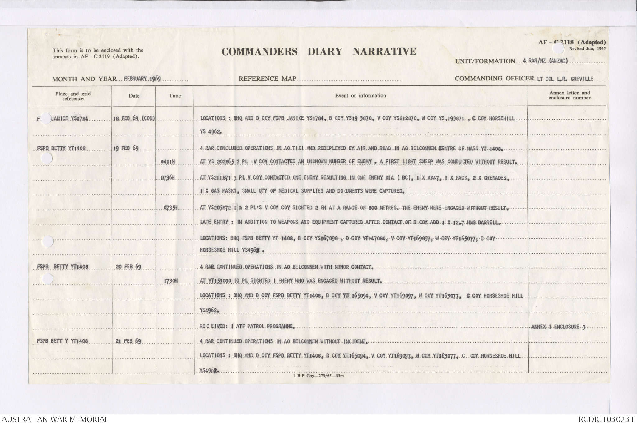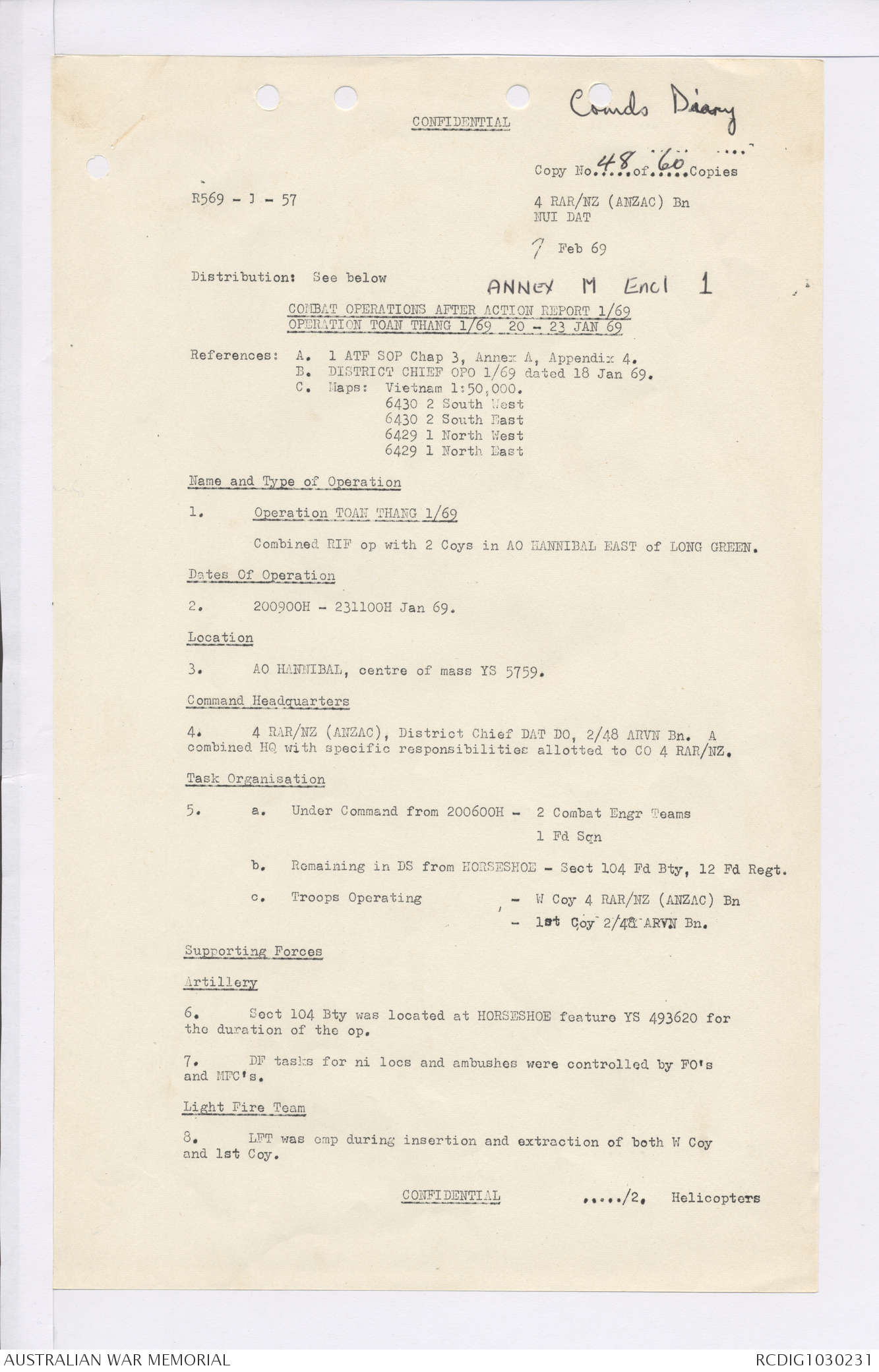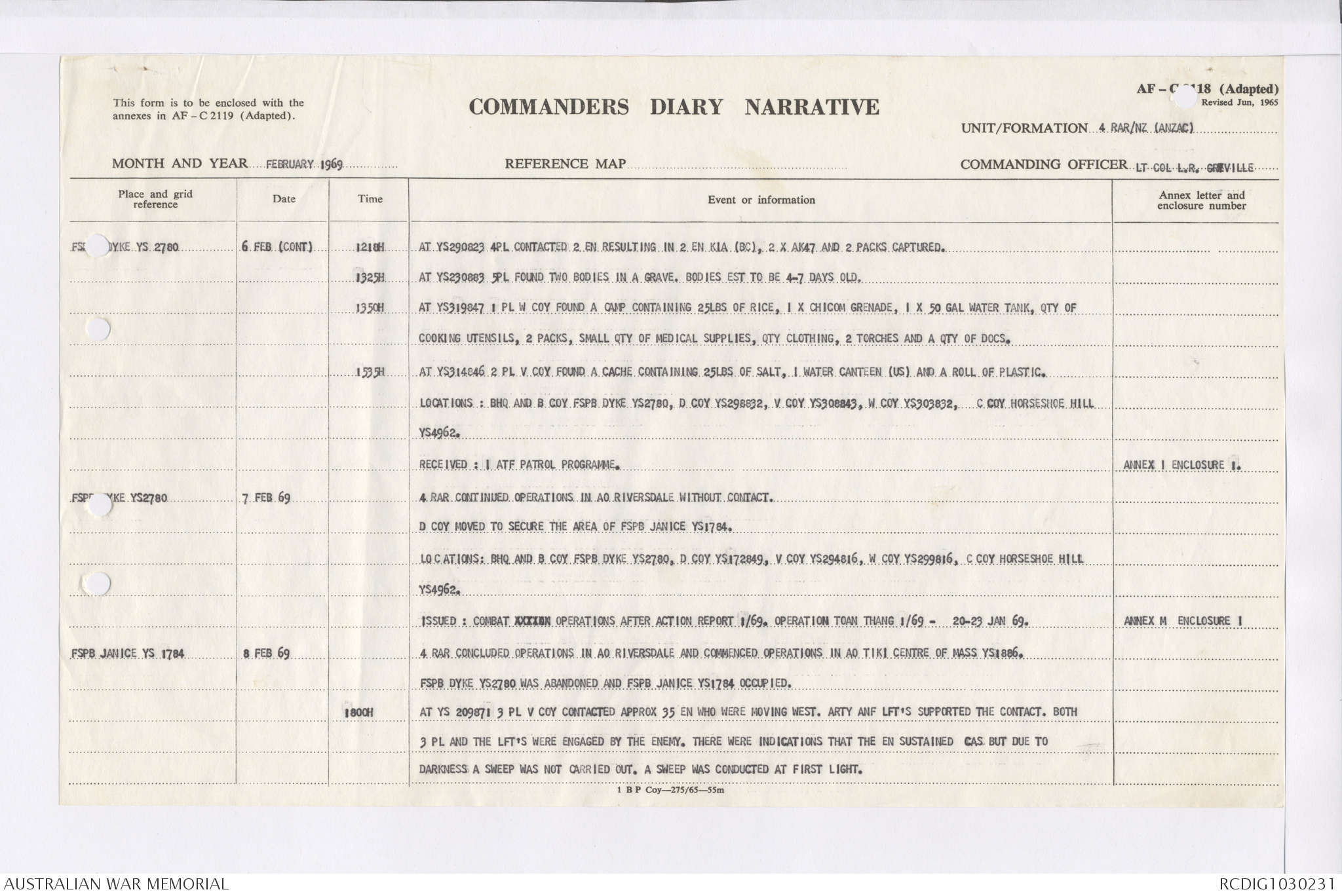 AWM95 7/4/36 - 1-28 February 1969, Narrative, Duty Officer's log, Maps, Annexes