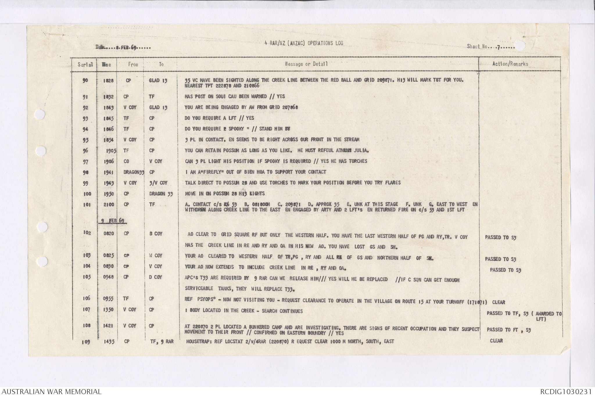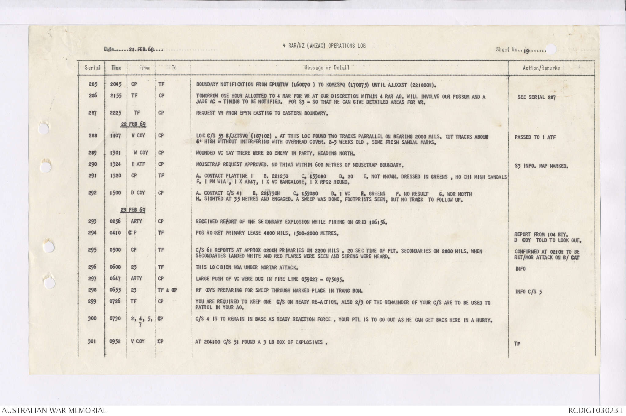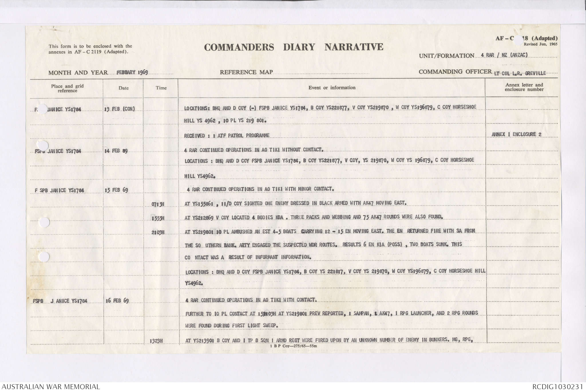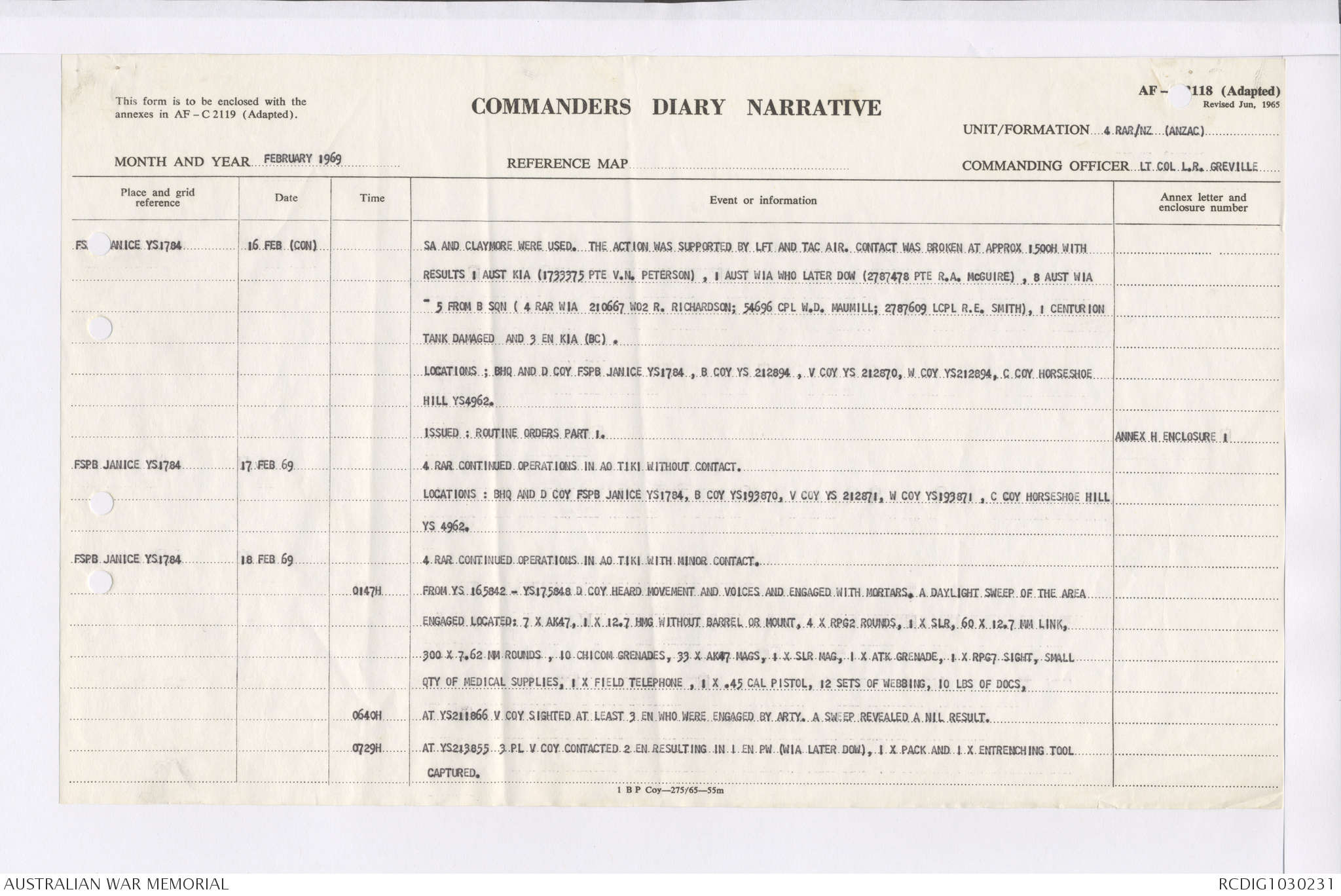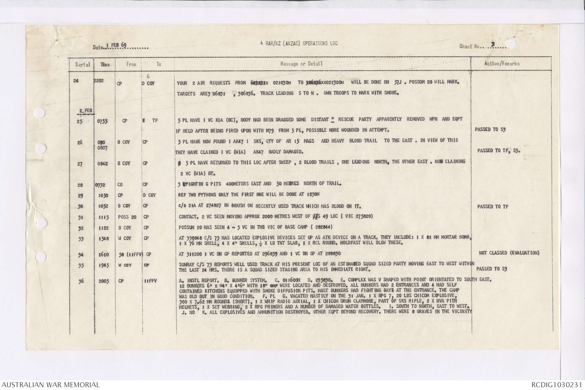 AWM95 7/4/36 - 1-28 February 1969, Narrative, Duty Officer's log, Maps, Annexes