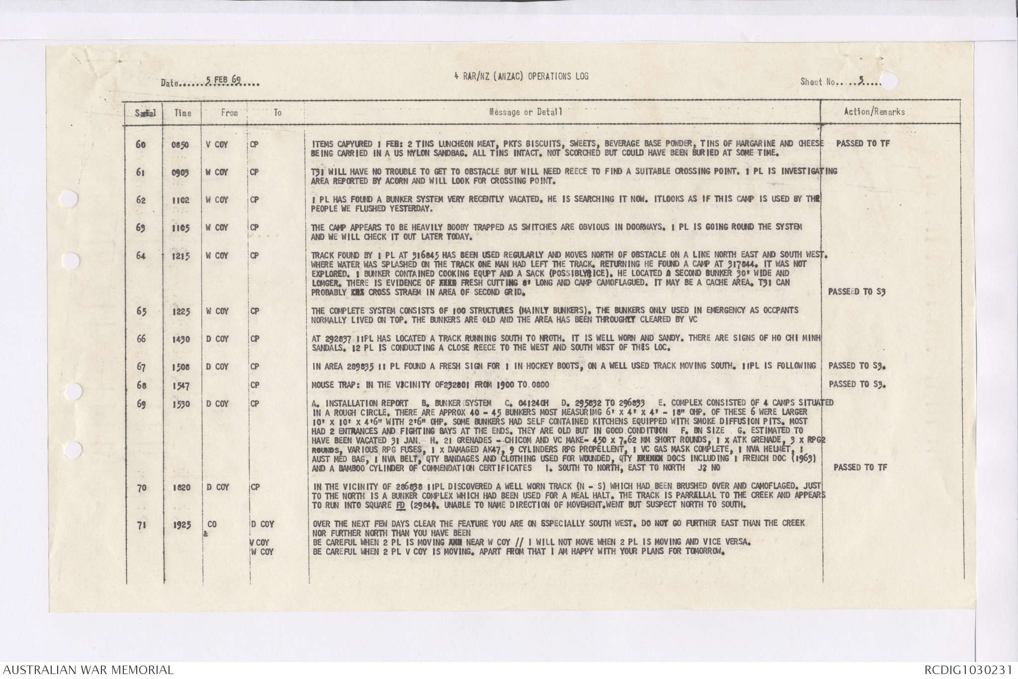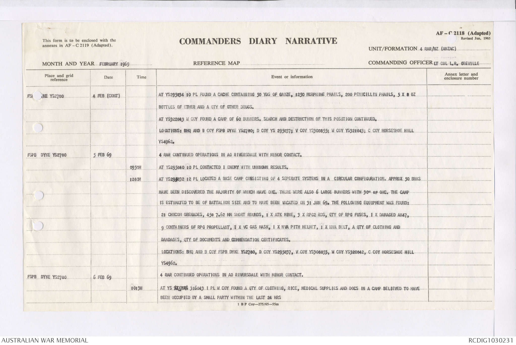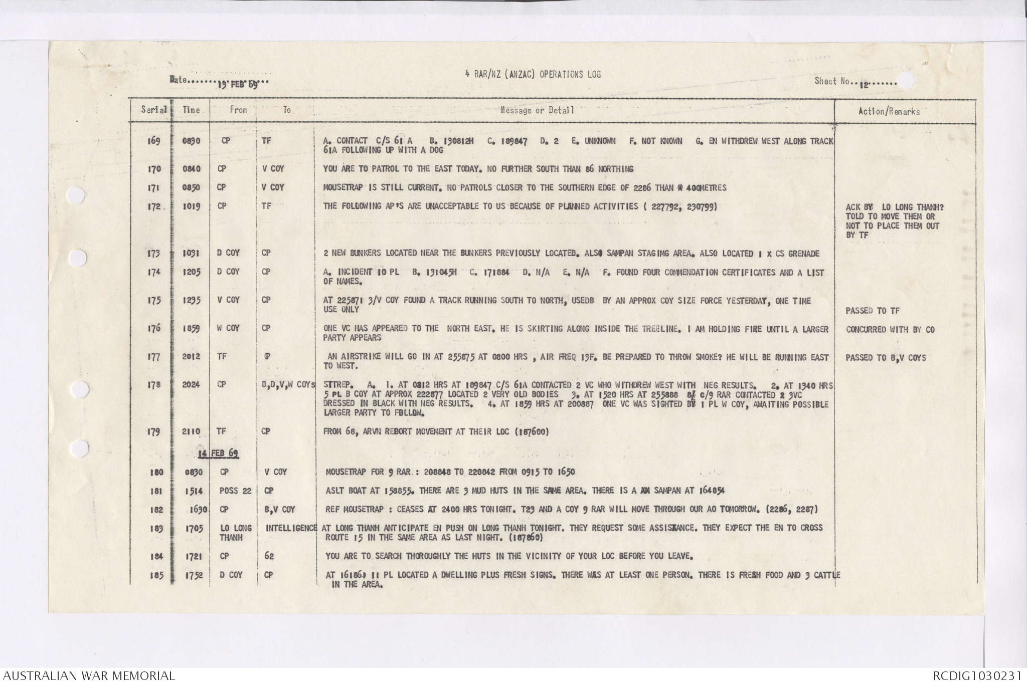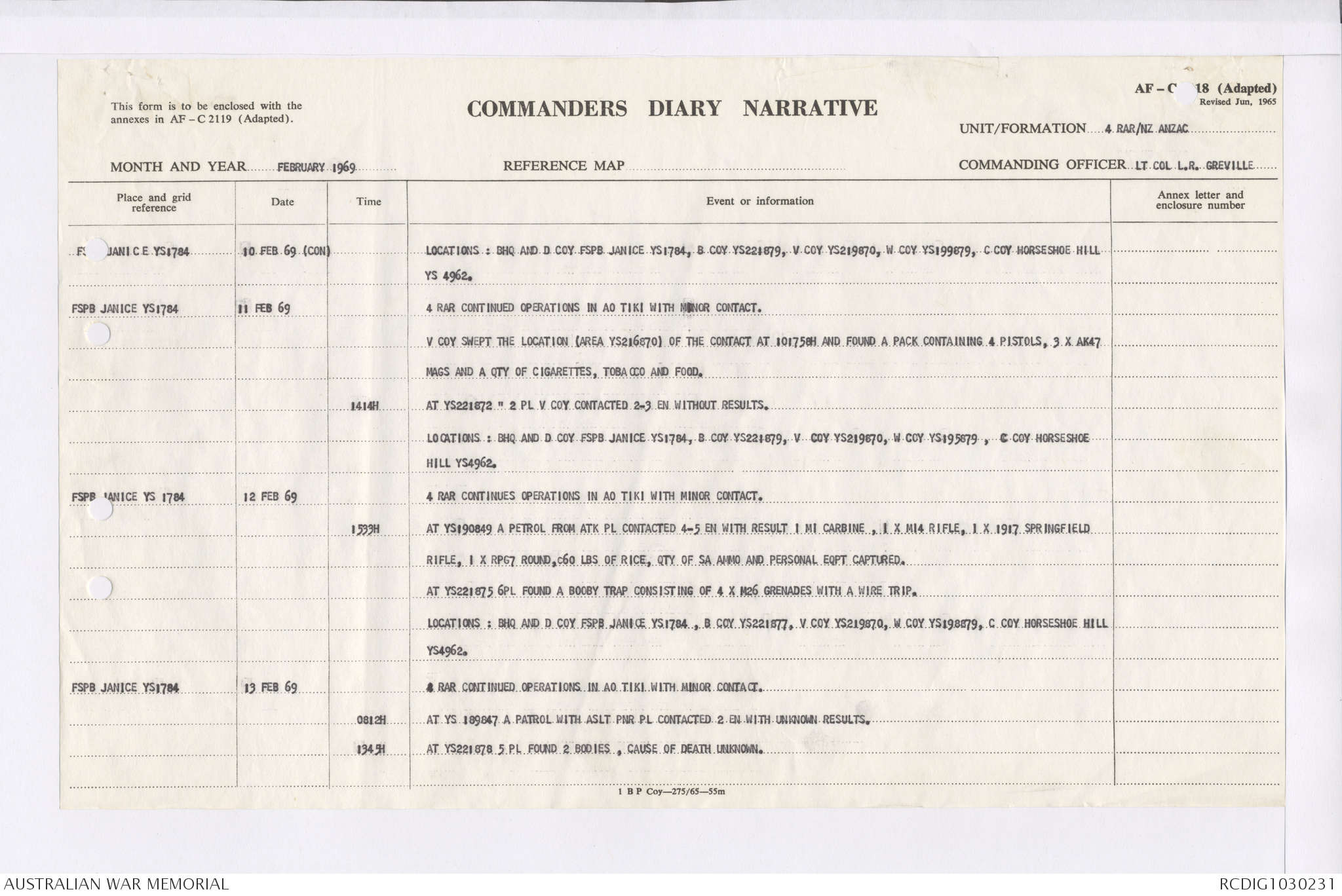 AWM95 7/4/36 - 1-28 February 1969, Narrative, Duty Officer's log, Maps, Annexes