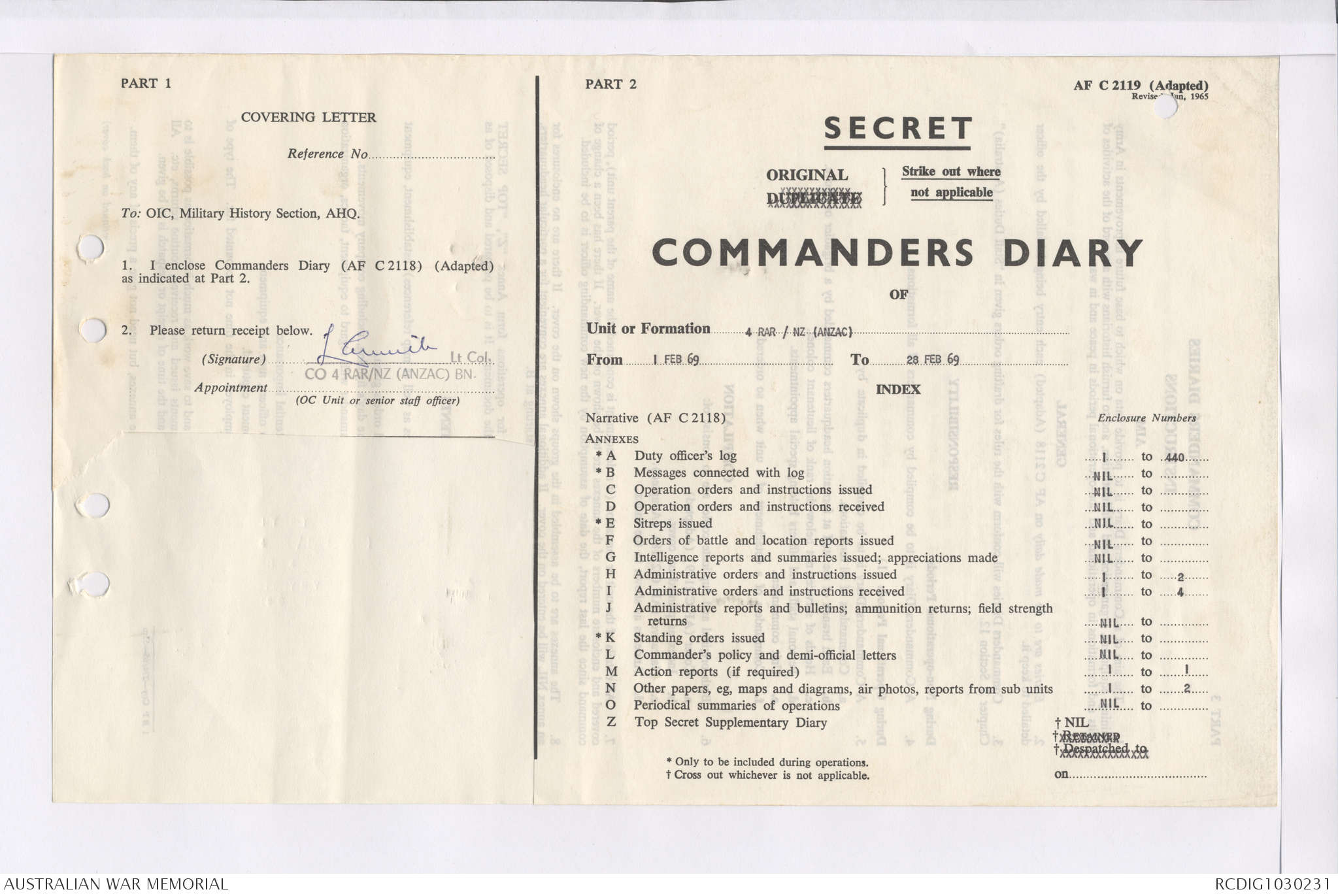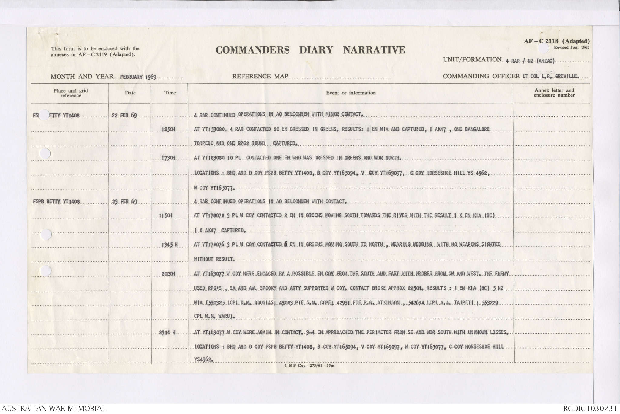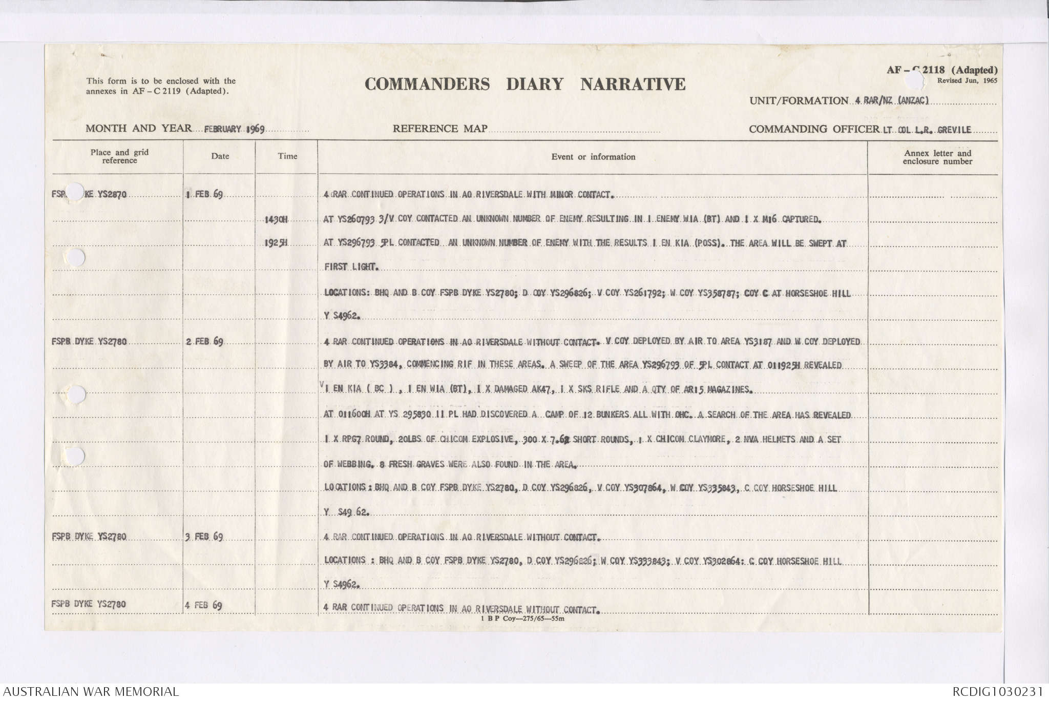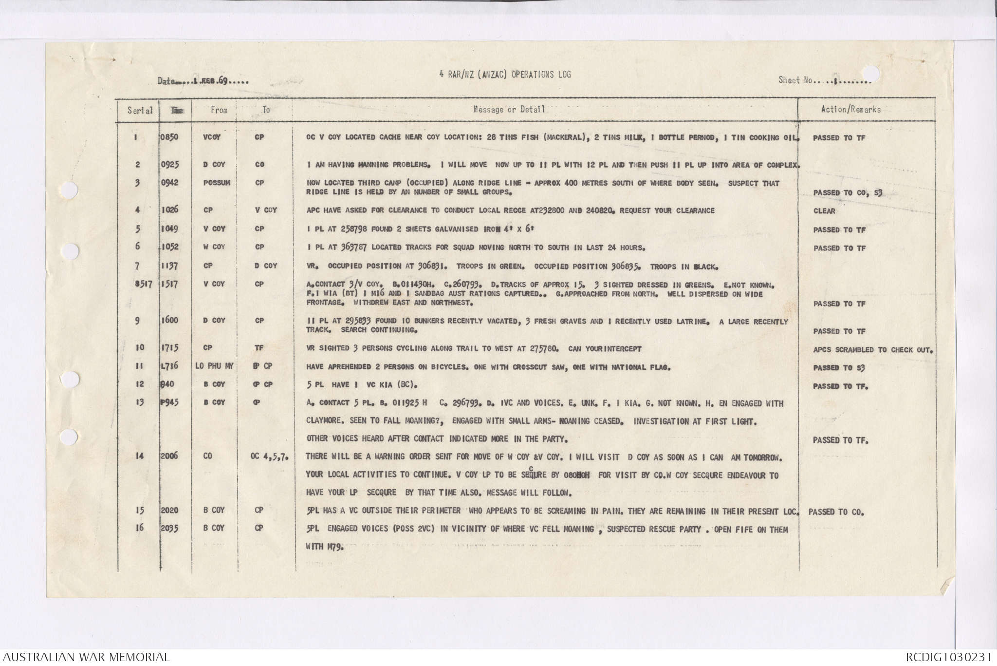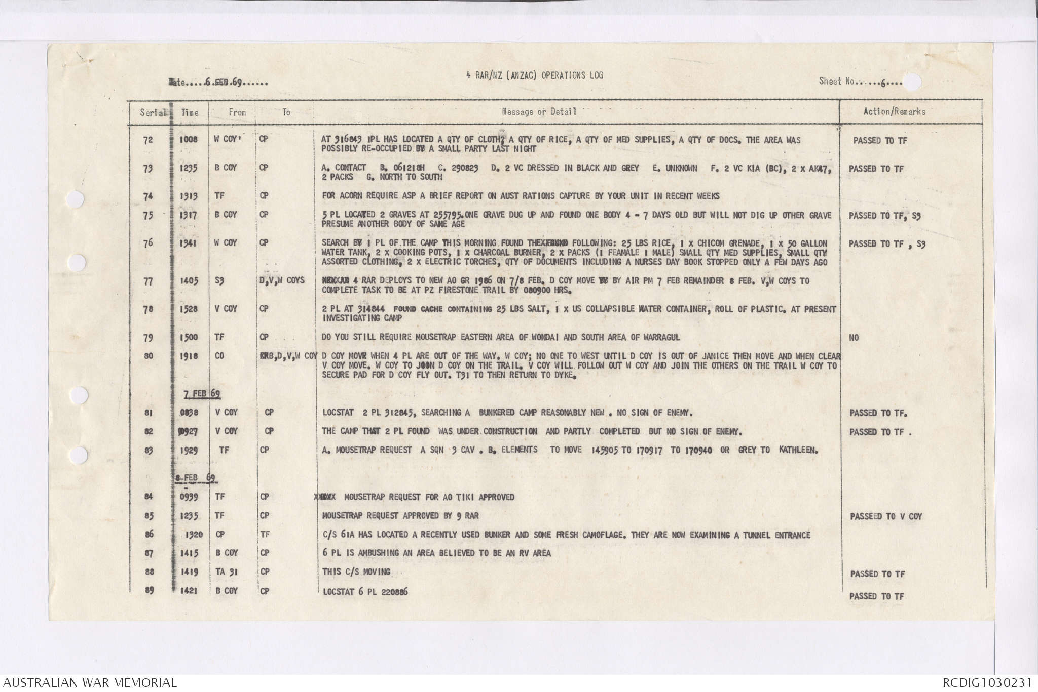 AWM95 7/4/36 - 1-28 February 1969, Narrative, Duty Officer's log, Maps, Annexes