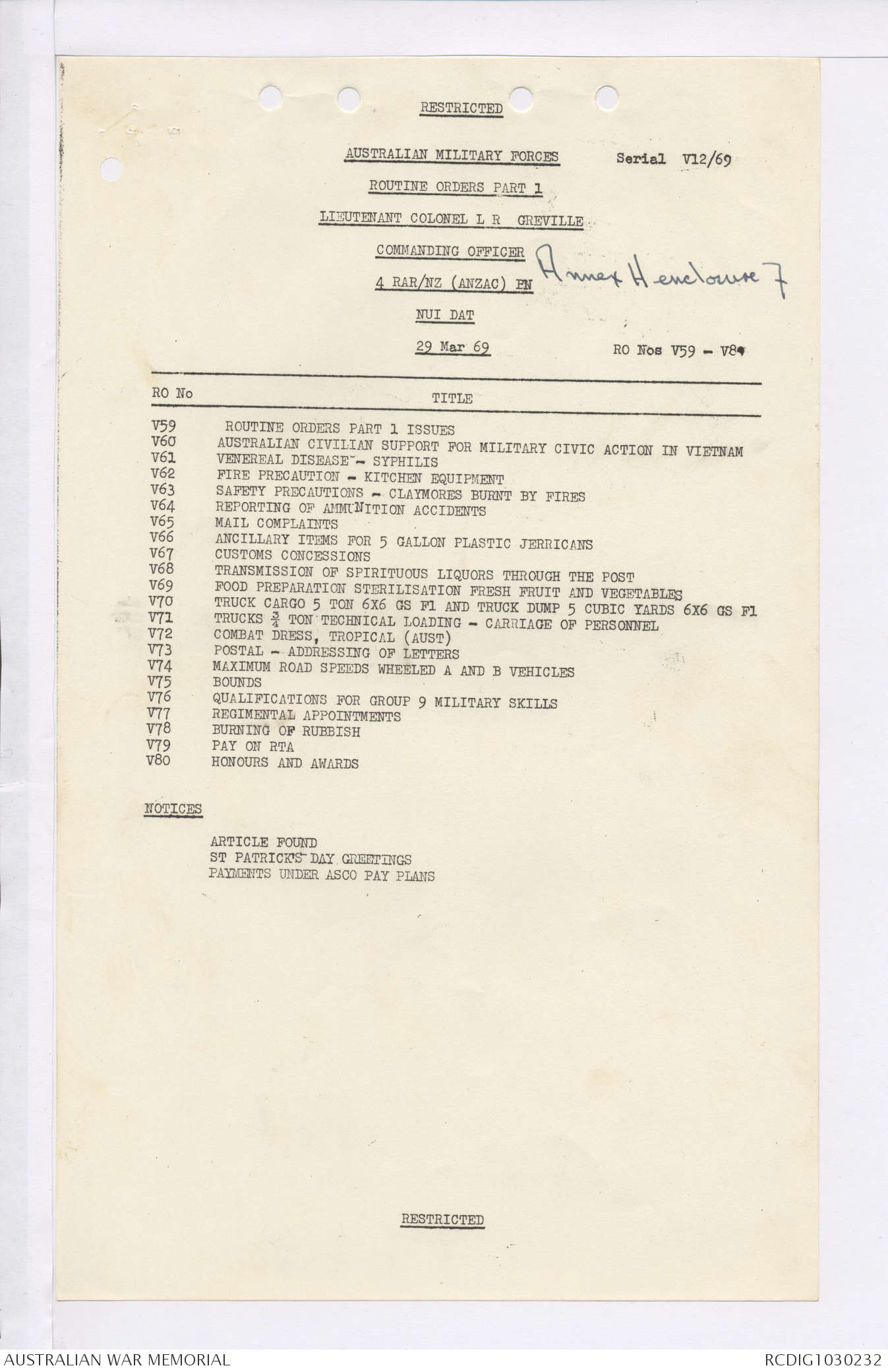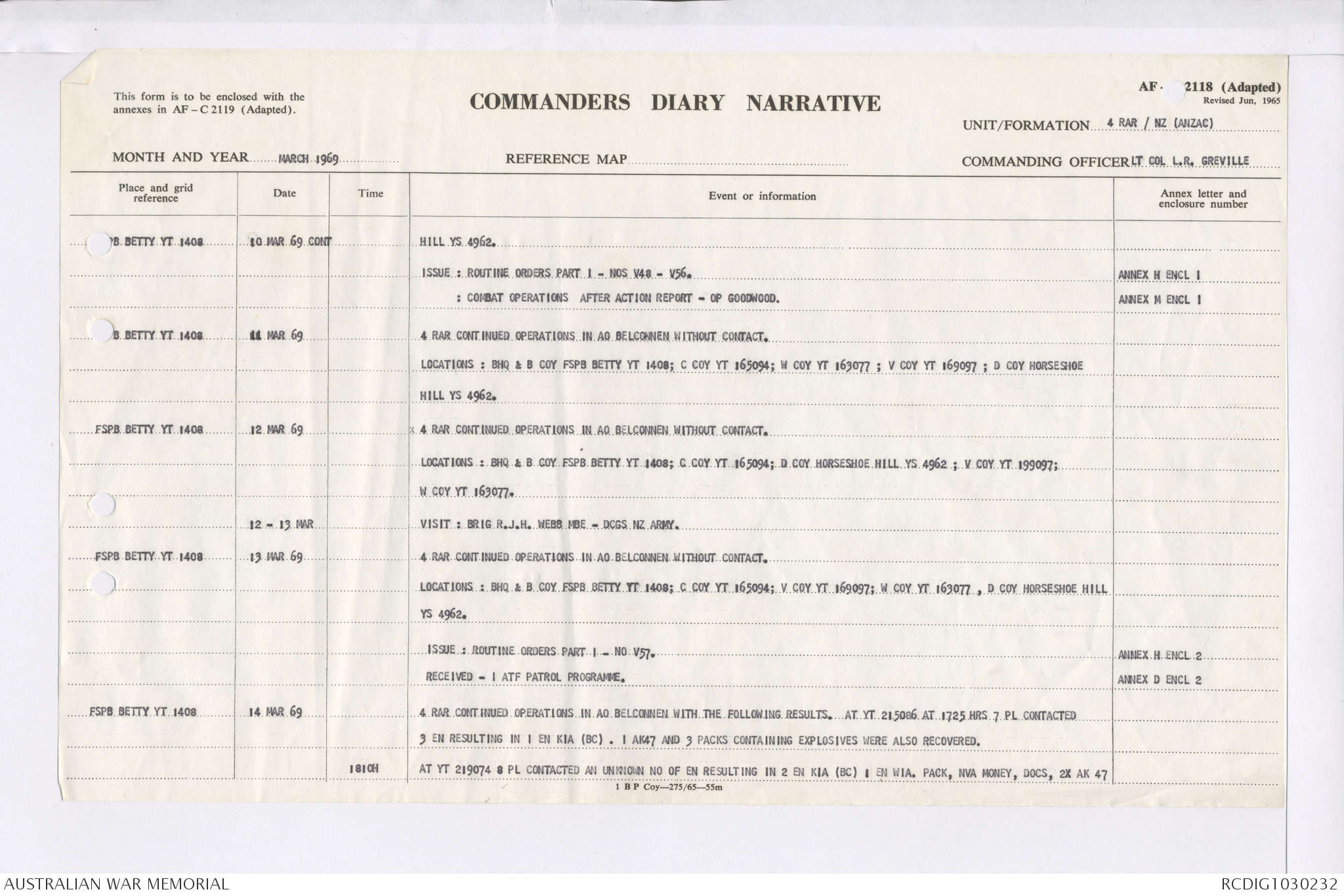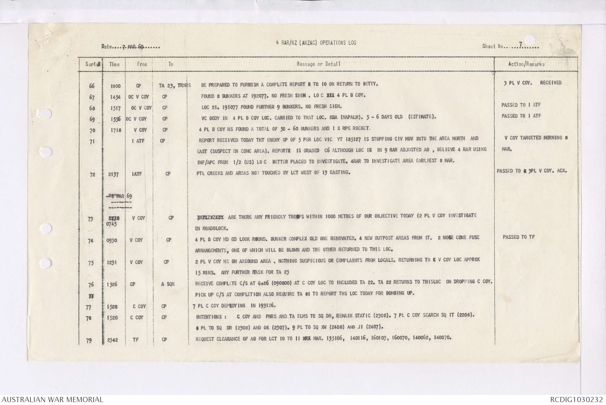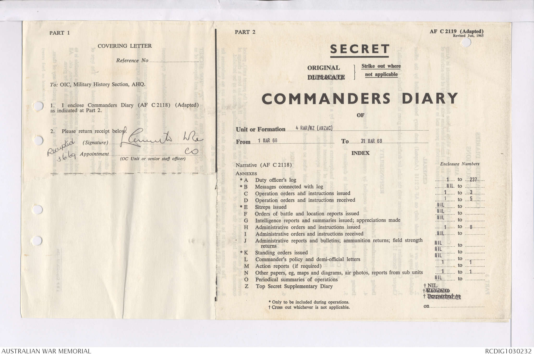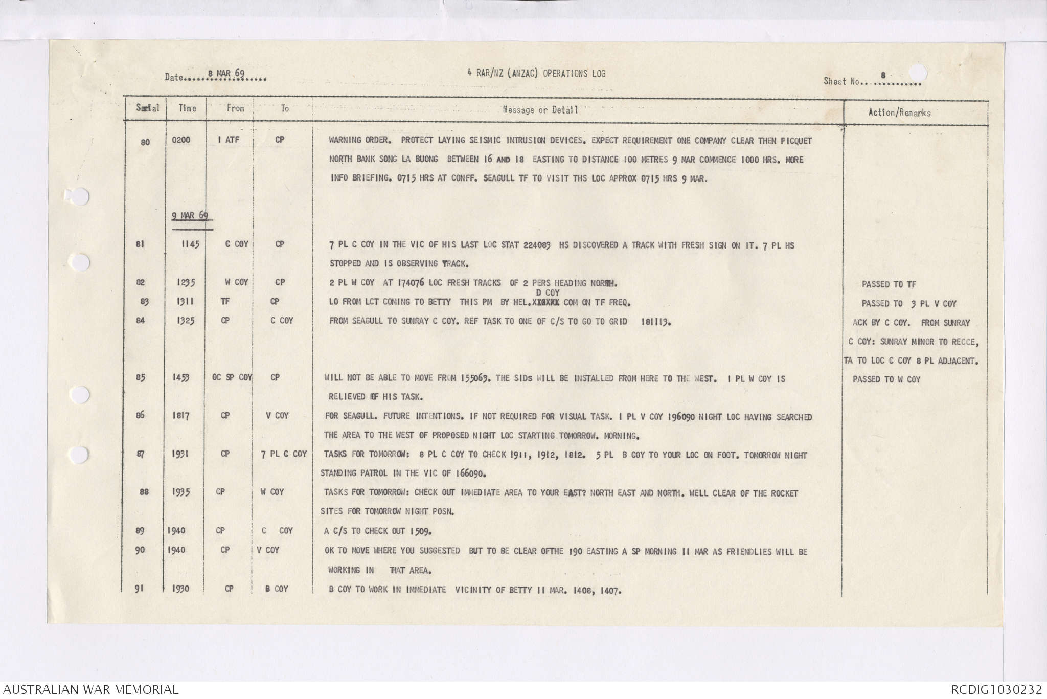 AWM95 7/4/37 - 1-31 March 1969, Narrative, Duty Officer's log, Annexes