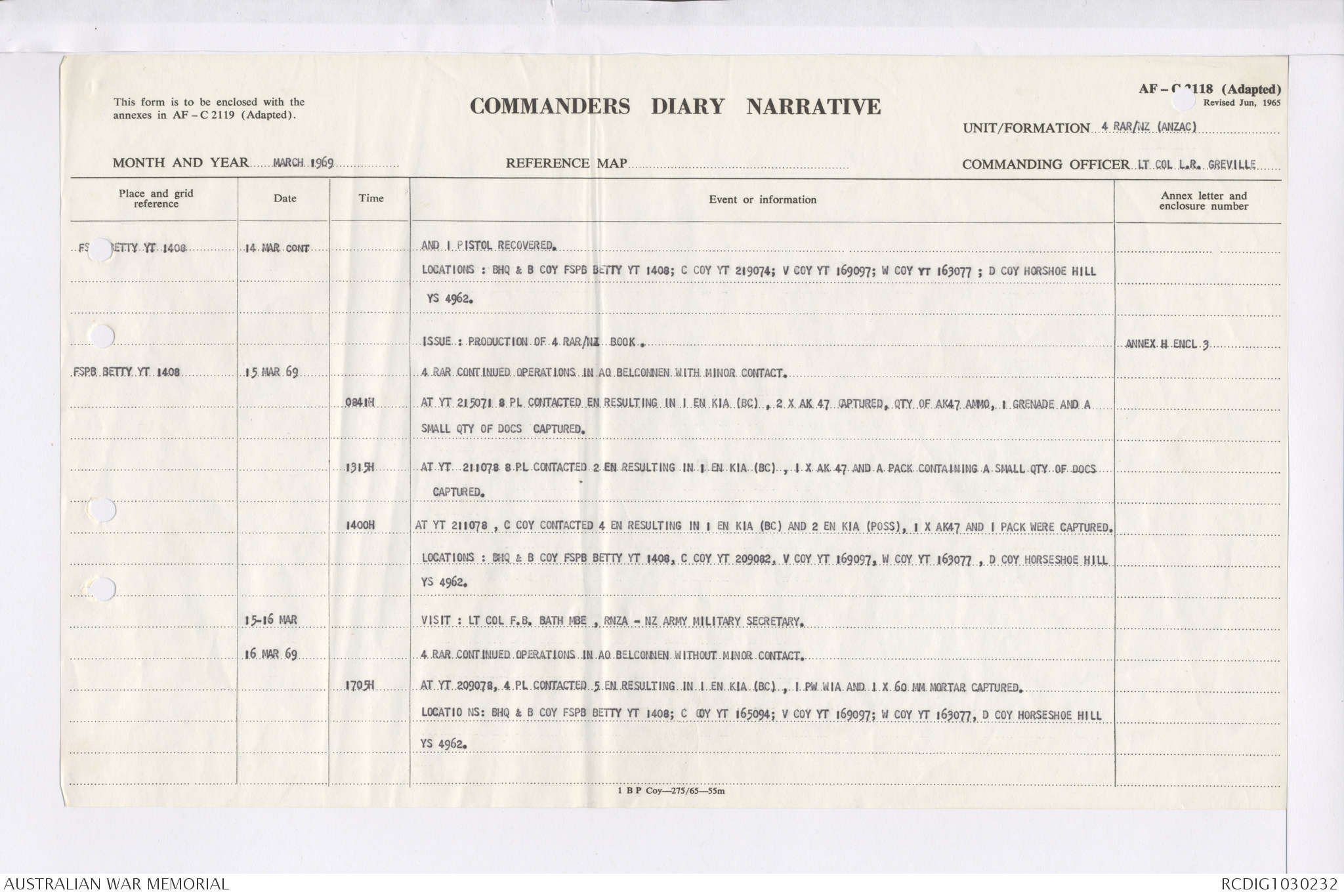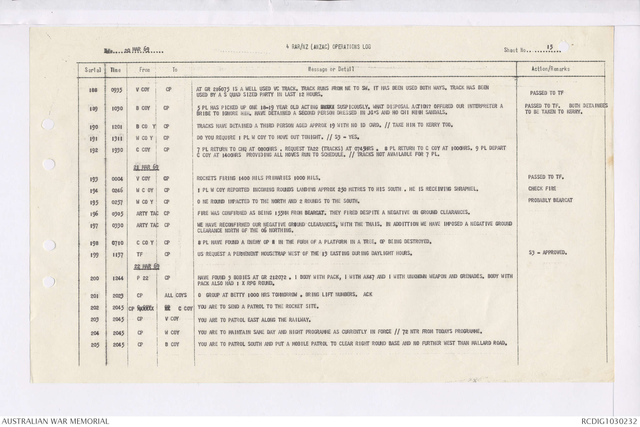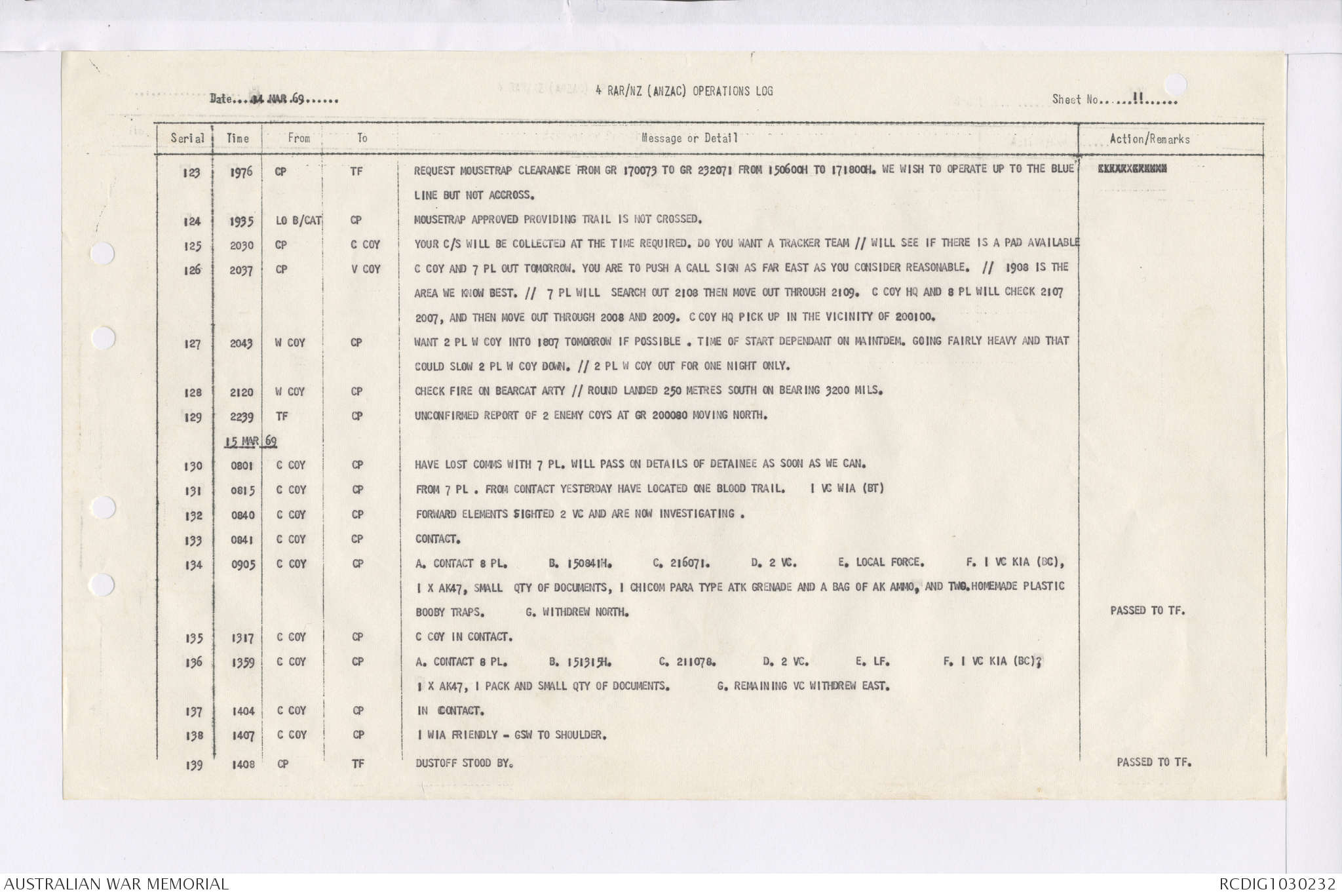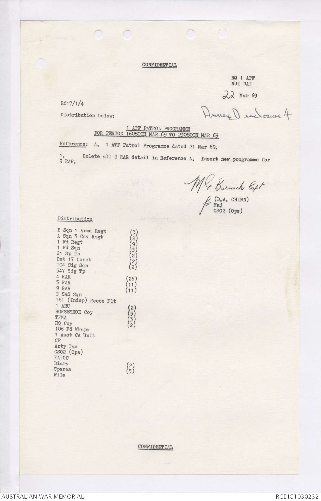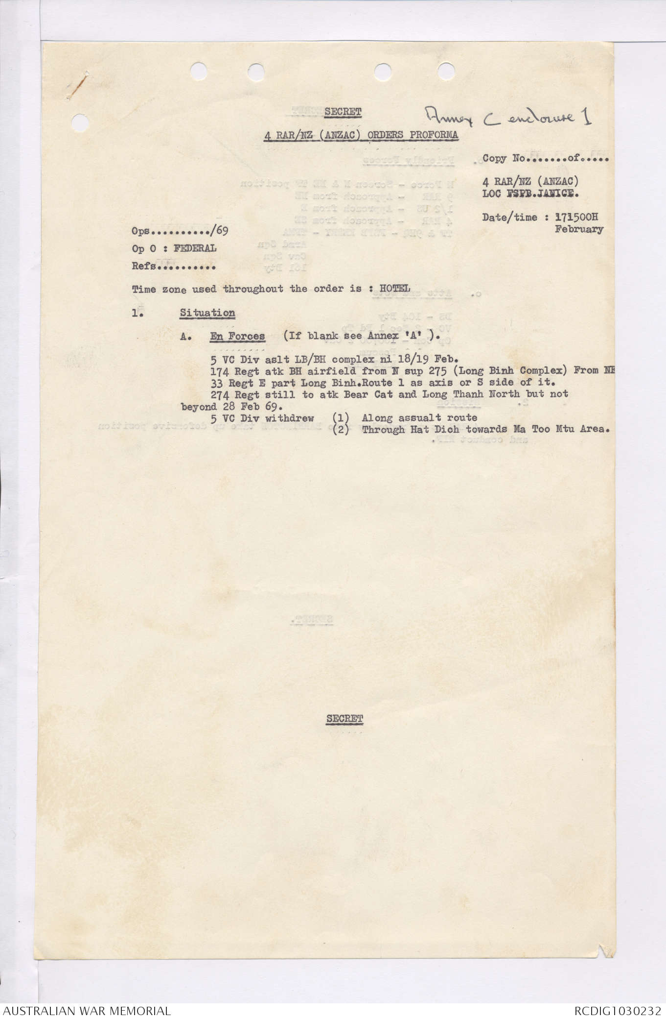 AWM95 7/4/37 - 1-31 March 1969, Narrative, Duty Officer's log, Annexes