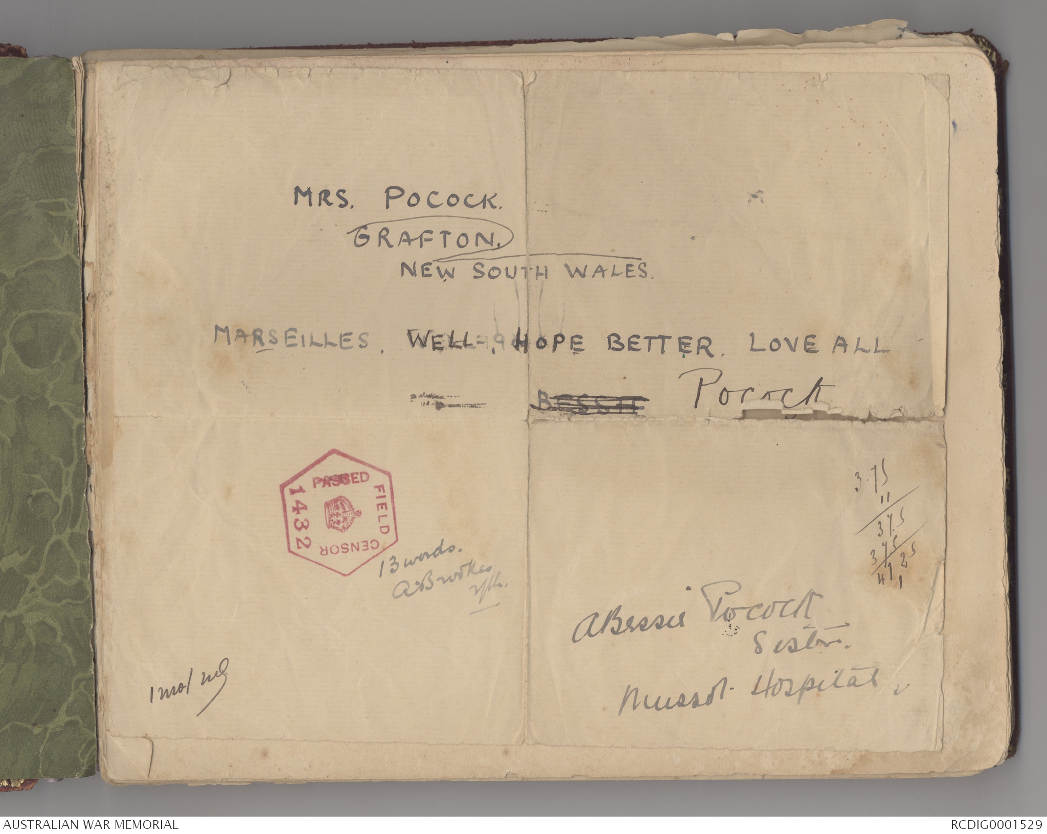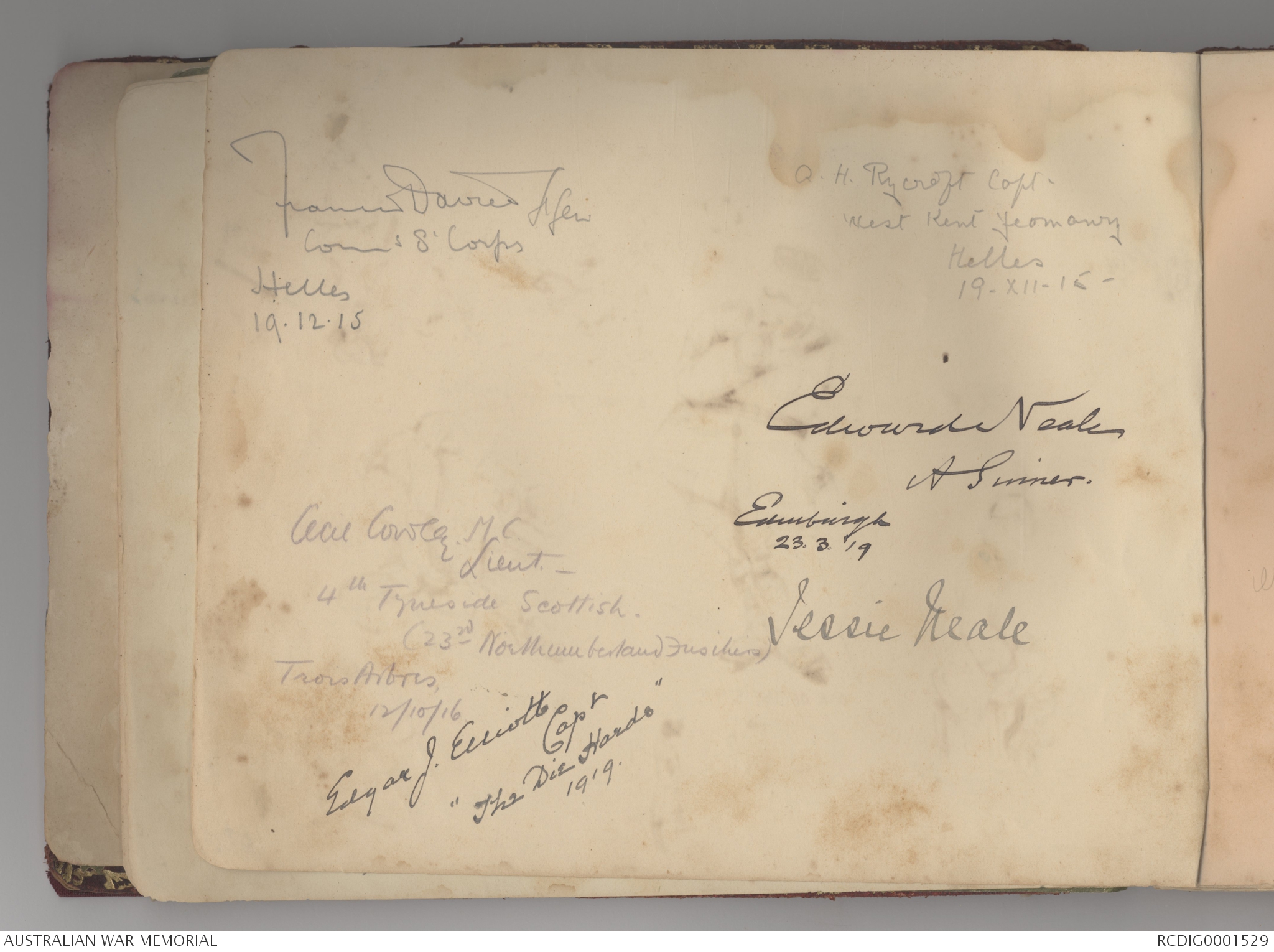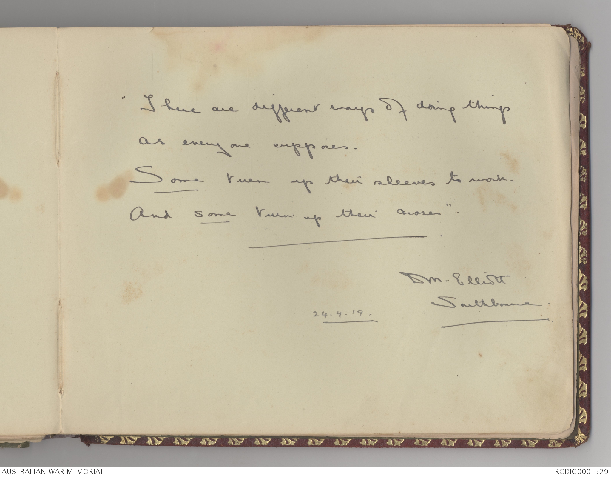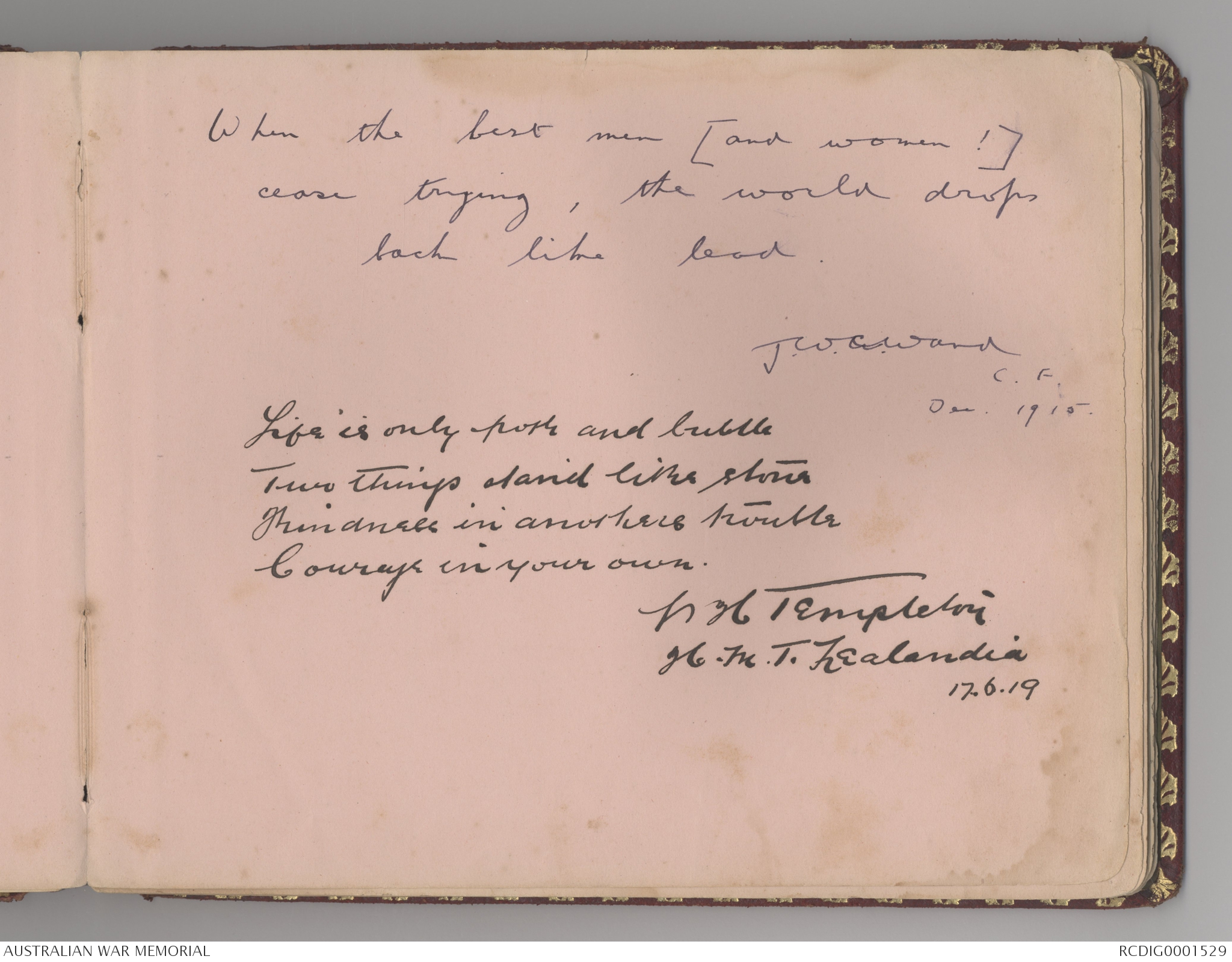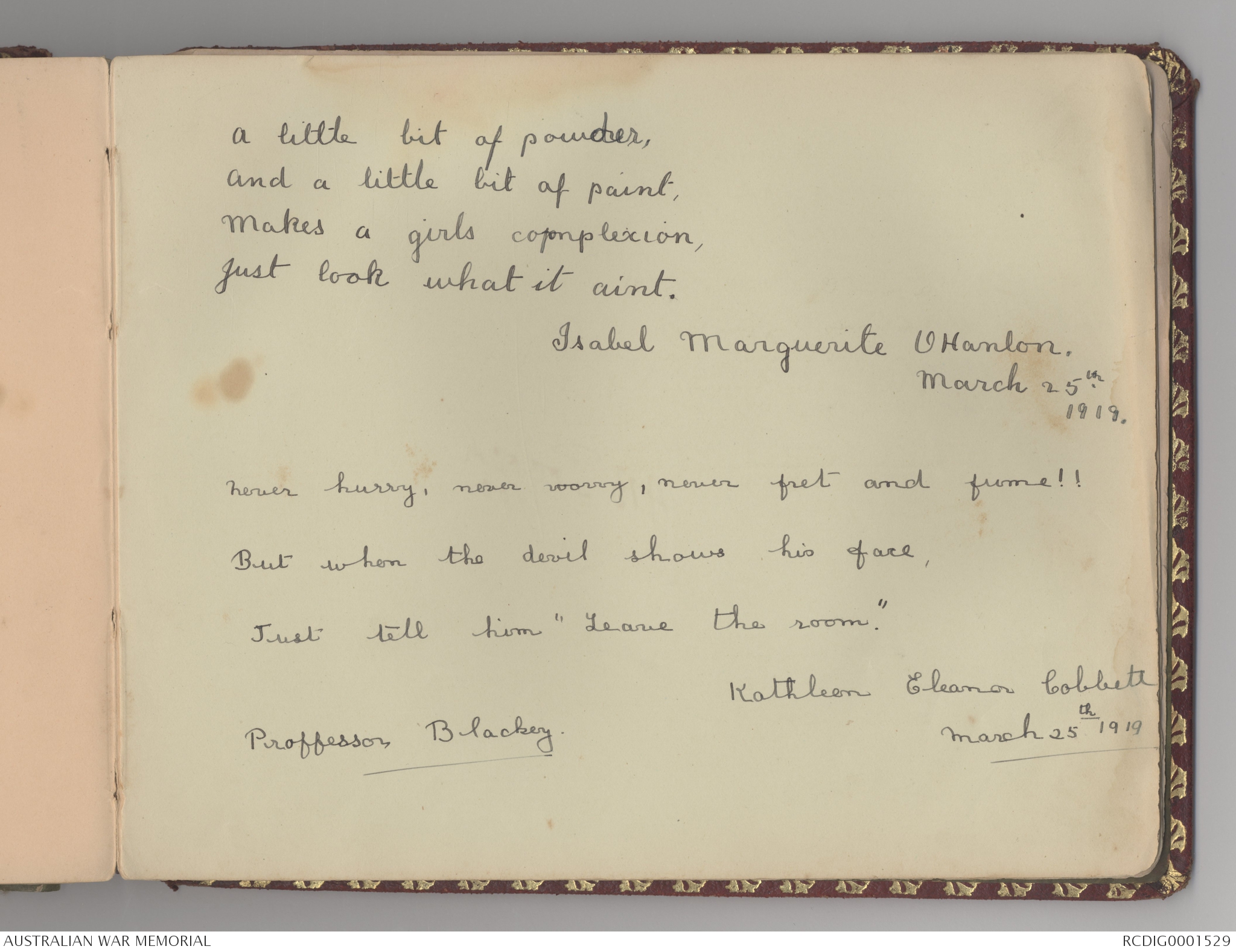 < Previous RecordAutograph book relating to the First World War service of Mary Anne ‘Bessie’ Pocock, Australian Army Nursing Service (AANS). The entries in this autograph book are from various periods, both before and during the First World War. The most prominent of these periods relate to her service at the 17th Stationary Hospital at Middelburg during the Boer War, her service aboard the Hospital Ship Assaye in 1915, her service with the 2nd Australian General Hospital (2AGH) at Mena in 1916, her service with the 2AGH and the 2nd Australian Casualty Clearing Station (2ACCS) in France in 1916-1917, her service at the convalescent home at Cobham Hall in Kent in 1917-1918, her sightseeing after the war in England in early 1919, and her return to Australia aboard the SS Zealandia in June 1919. The book contains autographs from English, Australian and New Zealand soldiers (one entry is the Maori Haka), as well as messages of support. It also contains poems on themes such as birds, flowers, convalescence, and the British Prime Minister David Lloyd George. The book also contains numerous watercolours and paintings such as those depicting a country road in England and Australia in December 1917, ships at night with their search lights, and ships at Southampton at sunset. Also included are numerous sketches, including those of dugouts, staff generals, stretcher bearers, ships, nurses, soldiers, Sir David Beatty, a ward at 2AGH,and a soldier in the Boer War from 1902. Some of these are humorous cartoons, such as those depicting the 2ACCS at Trois Arbres near Steenwercke, and a nurse treating soldier. As part of their autograph, many contributors included verses from prominent authors and poets such as Ruskin and Kipling.