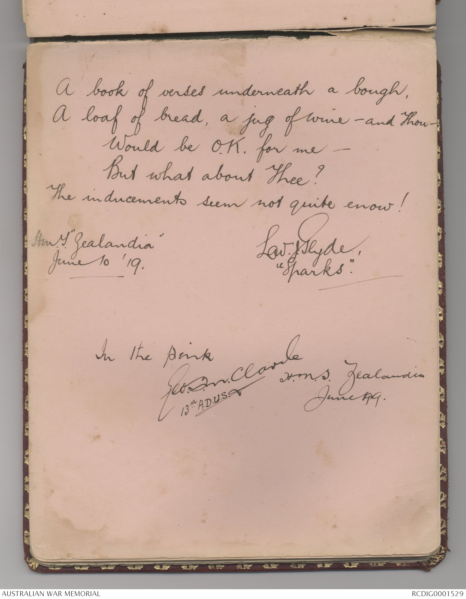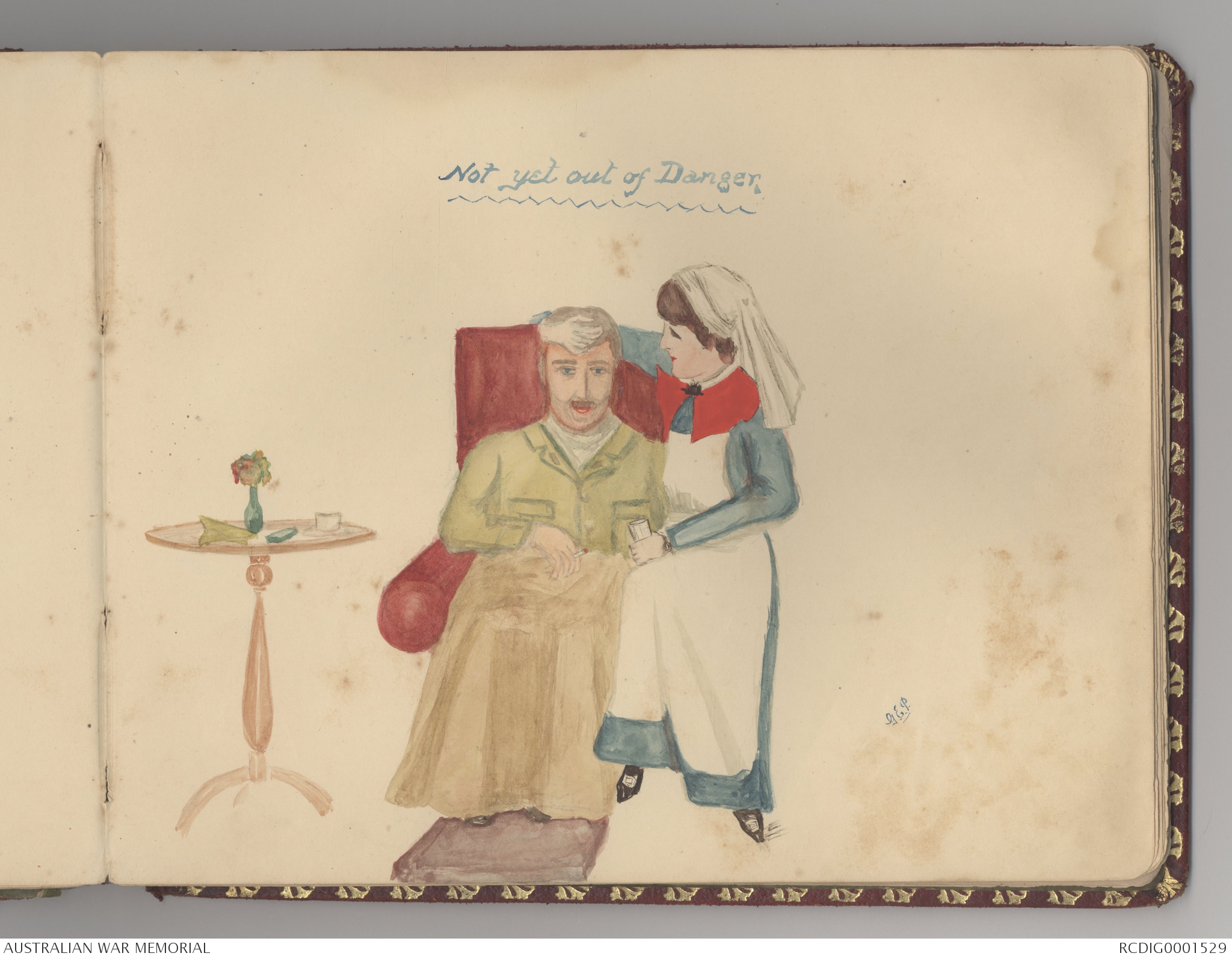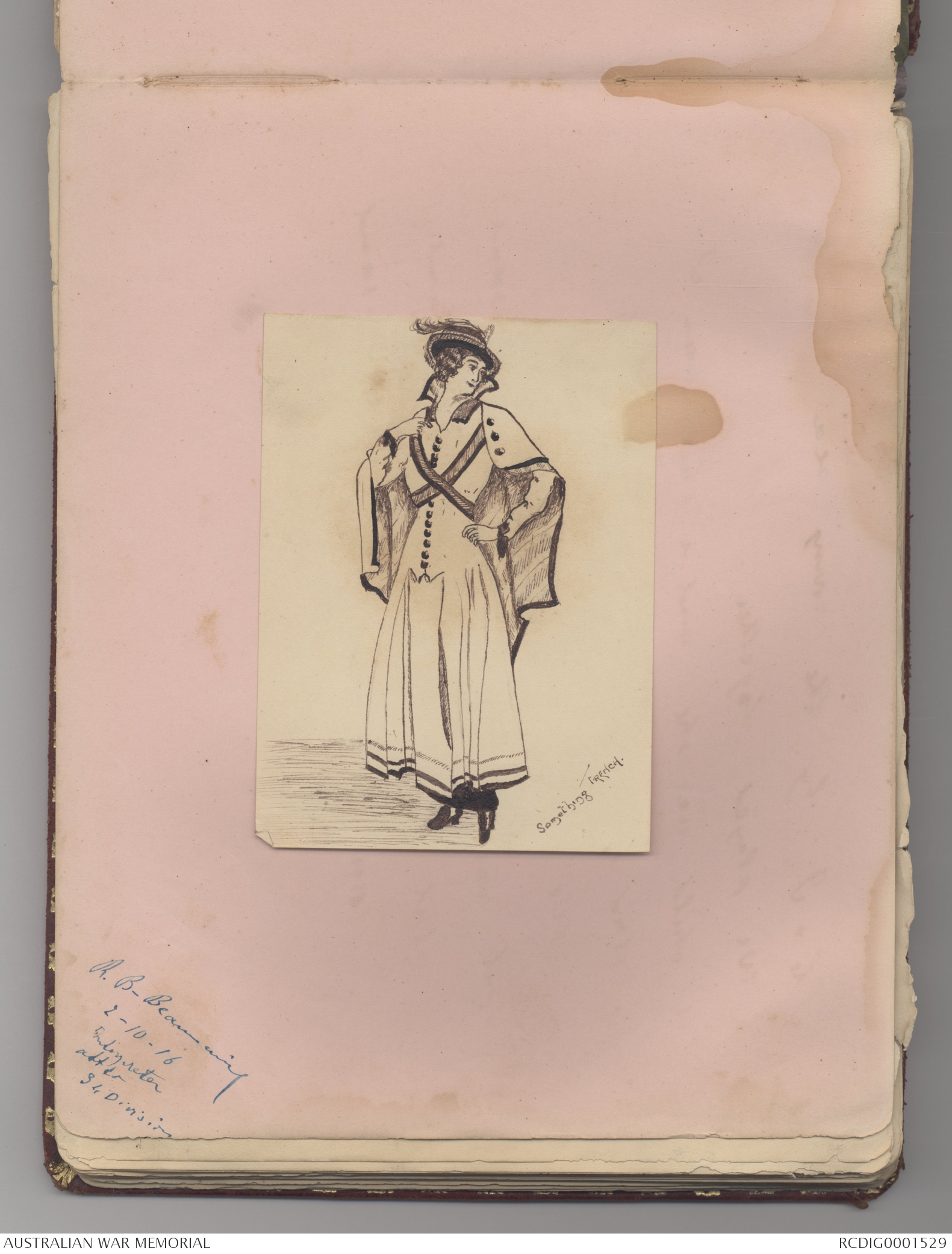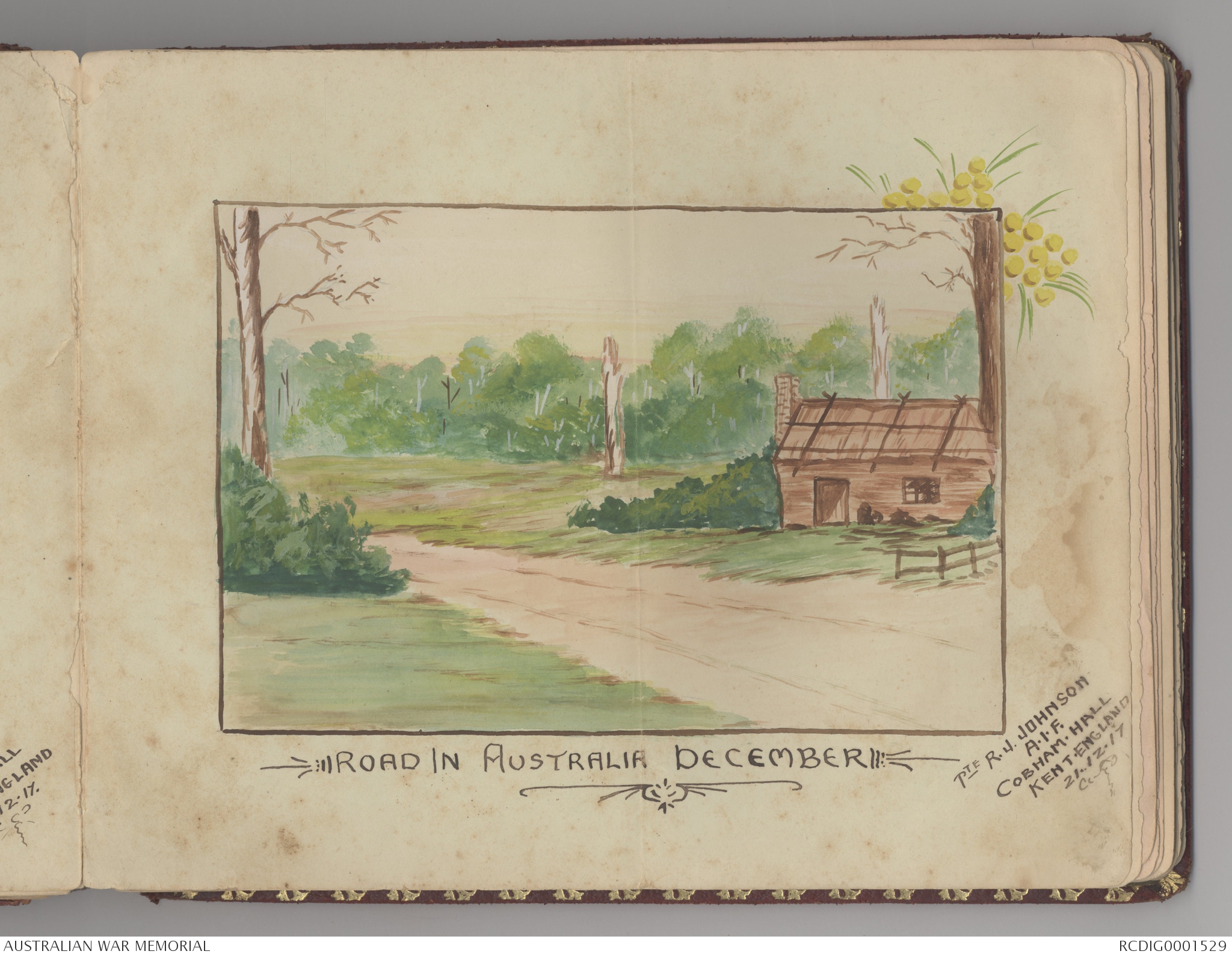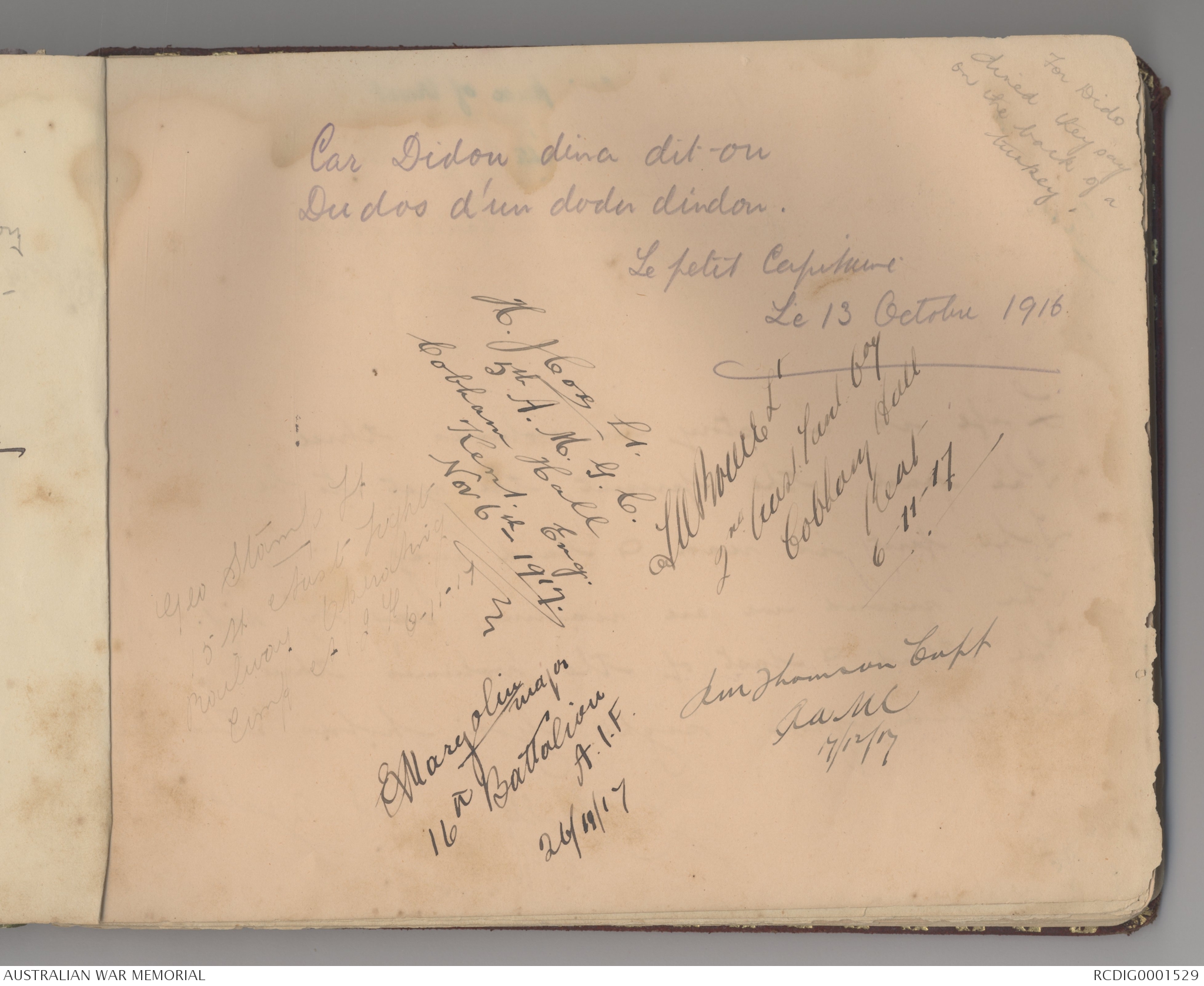 < Previous RecordAutograph book relating to the First World War service of Mary Anne ‘Bessie’ Pocock, Australian Army Nursing Service (AANS). The entries in this autograph book are from various periods, both before and during the First World War. The most prominent of these periods relate to her service at the 17th Stationary Hospital at Middelburg during the Boer War, her service aboard the Hospital Ship Assaye in 1915, her service with the 2nd Australian General Hospital (2AGH) at Mena in 1916, her service with the 2AGH and the 2nd Australian Casualty Clearing Station (2ACCS) in France in 1916-1917, her service at the convalescent home at Cobham Hall in Kent in 1917-1918, her sightseeing after the war in England in early 1919, and her return to Australia aboard the SS Zealandia in June 1919. The book contains autographs from English, Australian and New Zealand soldiers (one entry is the Maori Haka), as well as messages of support. It also contains poems on themes such as birds, flowers, convalescence, and the British Prime Minister David Lloyd George. The book also contains numerous watercolours and paintings such as those depicting a country road in England and Australia in December 1917, ships at night with their search lights, and ships at Southampton at sunset. Also included are numerous sketches, including those of dugouts, staff generals, stretcher bearers, ships, nurses, soldiers, Sir David Beatty, a ward at 2AGH,and a soldier in the Boer War from 1902. Some of these are humorous cartoons, such as those depicting the 2ACCS at Trois Arbres near Steenwercke, and a nurse treating soldier. As part of their autograph, many contributors included verses from prominent authors and poets such as Ruskin and Kipling.