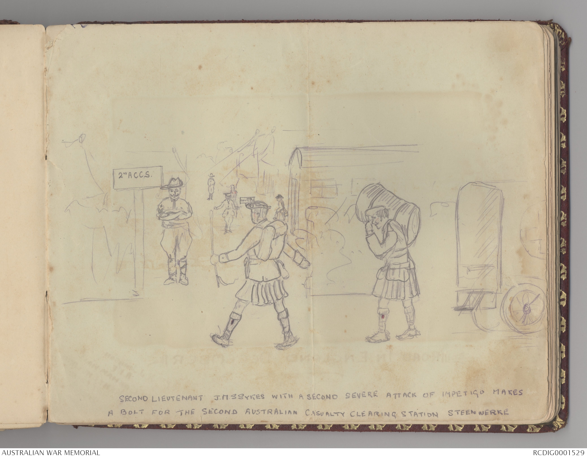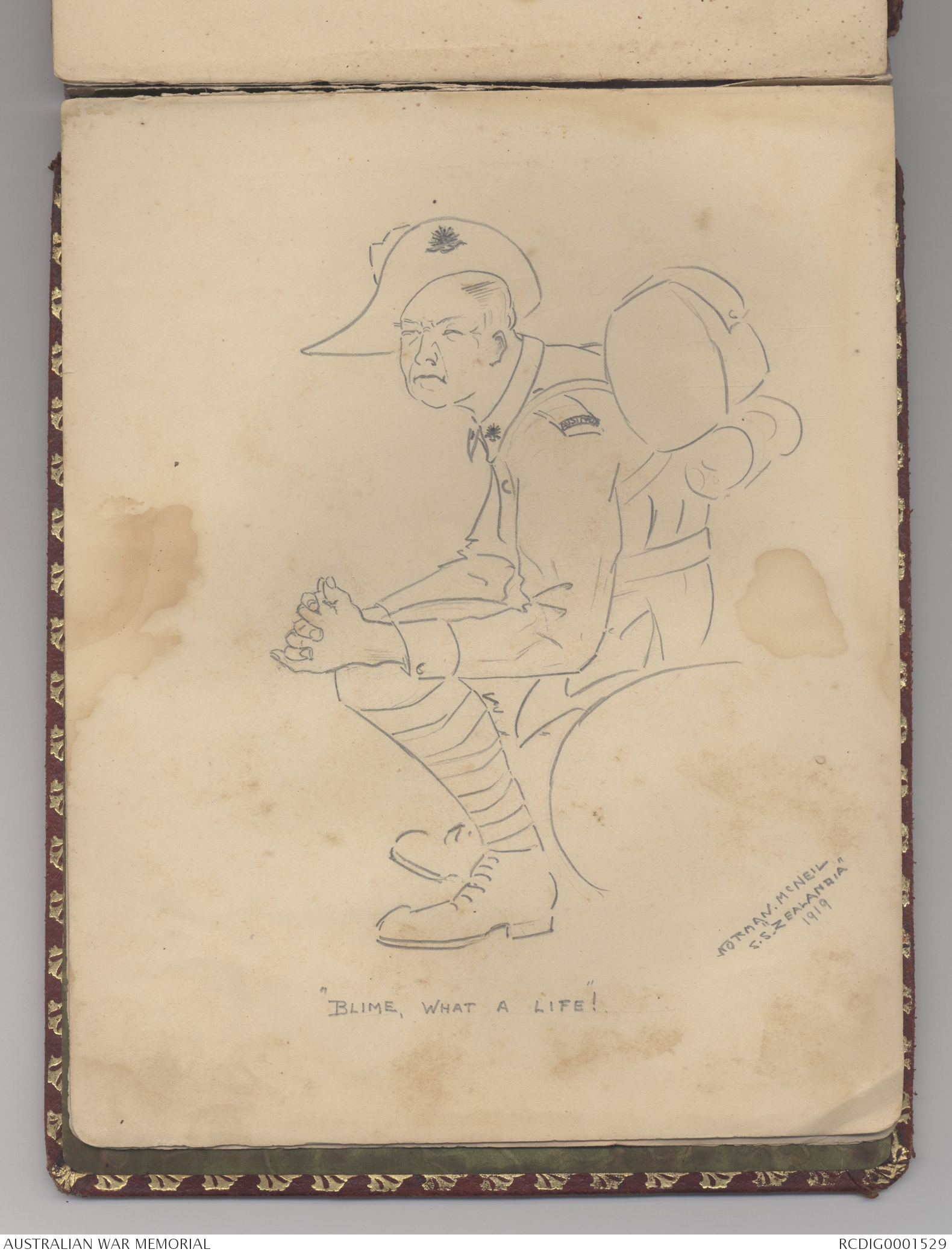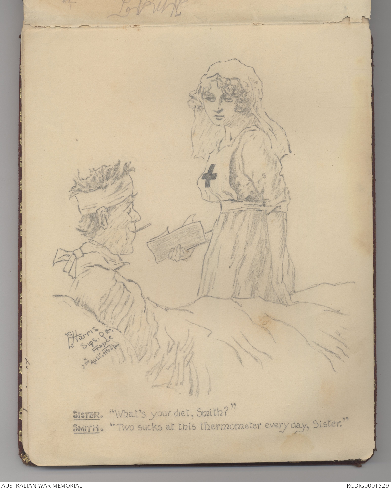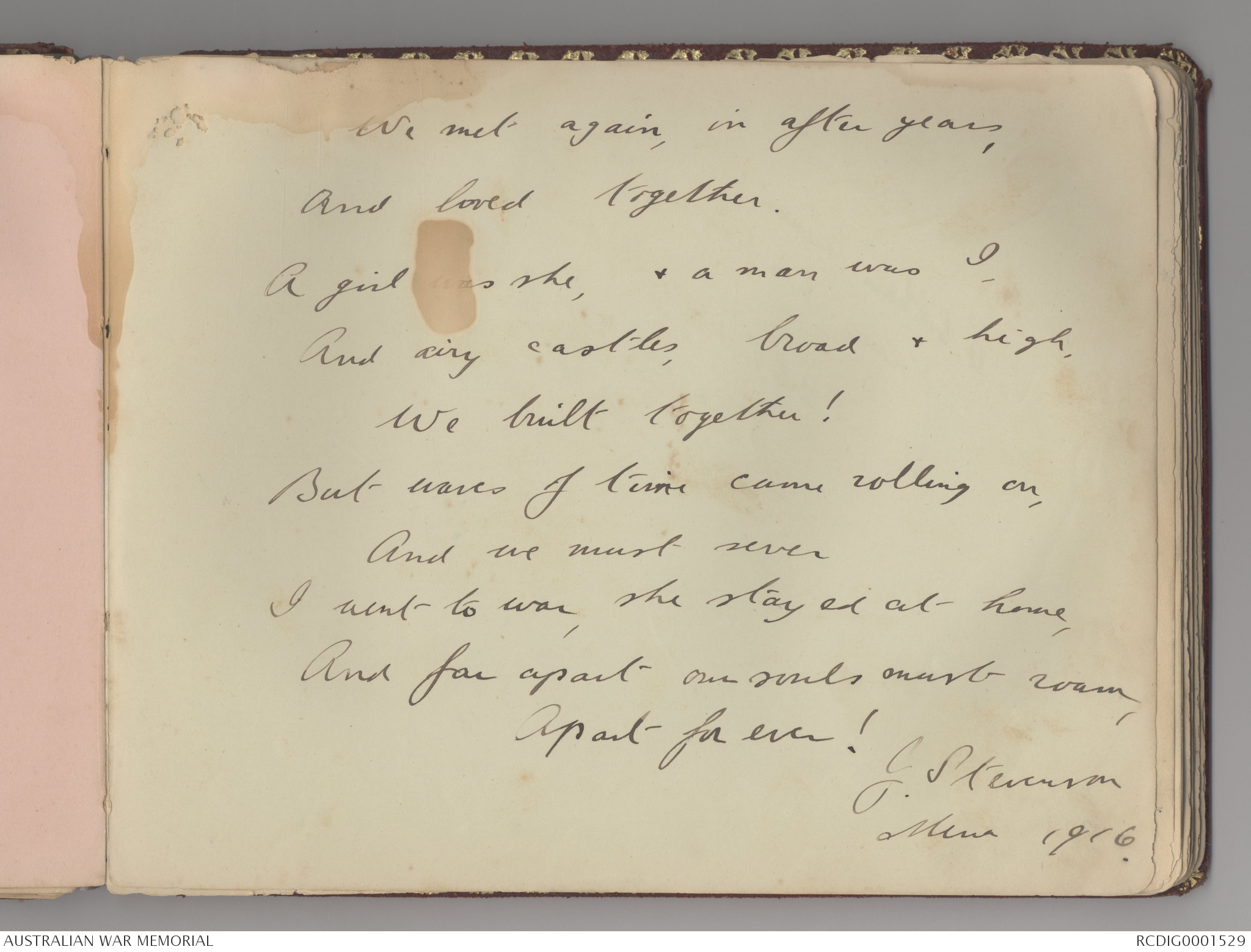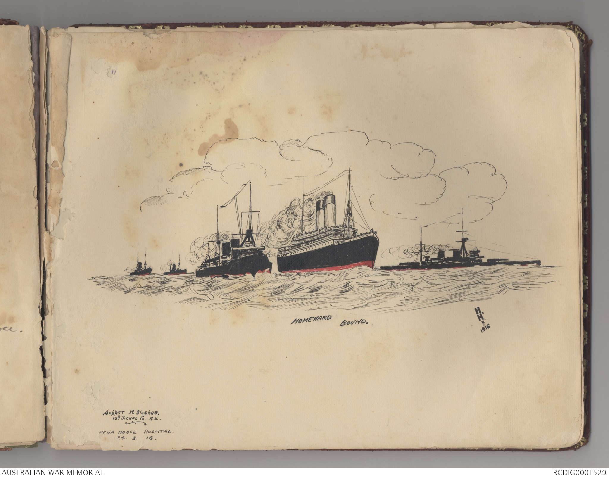 < Previous RecordAutograph book relating to the First World War service of Mary Anne ‘Bessie’ Pocock, Australian Army Nursing Service (AANS). The entries in this autograph book are from various periods, both before and during the First World War. The most prominent of these periods relate to her service at the 17th Stationary Hospital at Middelburg during the Boer War, her service aboard the Hospital Ship Assaye in 1915, her service with the 2nd Australian General Hospital (2AGH) at Mena in 1916, her service with the 2AGH and the 2nd Australian Casualty Clearing Station (2ACCS) in France in 1916-1917, her service at the convalescent home at Cobham Hall in Kent in 1917-1918, her sightseeing after the war in England in early 1919, and her return to Australia aboard the SS Zealandia in June 1919. The book contains autographs from English, Australian and New Zealand soldiers (one entry is the Maori Haka), as well as messages of support. It also contains poems on themes such as birds, flowers, convalescence, and the British Prime Minister David Lloyd George. The book also contains numerous watercolours and paintings such as those depicting a country road in England and Australia in December 1917, ships at night with their search lights, and ships at Southampton at sunset. Also included are numerous sketches, including those of dugouts, staff generals, stretcher bearers, ships, nurses, soldiers, Sir David Beatty, a ward at 2AGH,and a soldier in the Boer War from 1902. Some of these are humorous cartoons, such as those depicting the 2ACCS at Trois Arbres near Steenwercke, and a nurse treating soldier. As part of their autograph, many contributors included verses from prominent authors and poets such as Ruskin and Kipling.