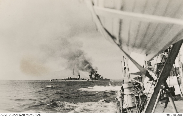 THE ITALIAN CRUISER BARTOLOMEO COLLEONI BEING TORPEDOED BY A BRITISH DESTROYER AFTER SHE HAD BEEN ABANDONED BY HER CREW. THE COLLEONI HAD BEEN BADLY DAMAGED IN A FIERCE NINETY MINUTE BATTLE WITH HMAS SYDNEY OFF CAPE SPADA, CRETE, THE FIRST CRUISER DUEL OF THE SECOND WORLD WAR. (DONOR C. OLIVER, ORIGINAL ALBUM HELD IN AWM ARCHIVE STORE) (USE THIS IN PREFERENCE TO 007897)
