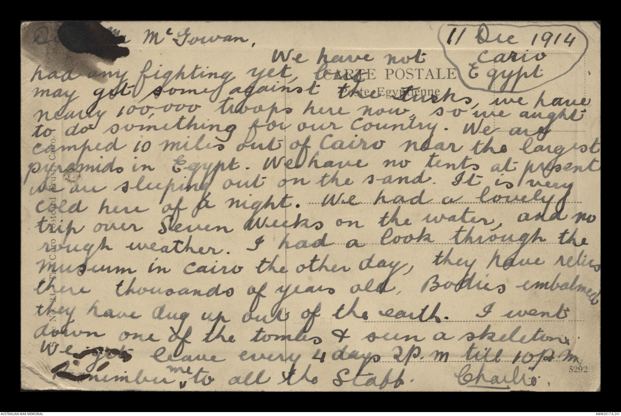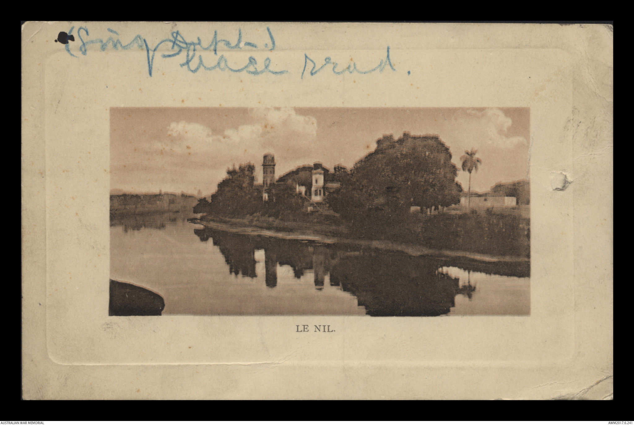 Scenic postcard for Le Nil sent from Charlie to Mr McGowan, Cairo 11 December 1914. The postcard described the trip from Australia and what the writer has been doing while in Egypt.