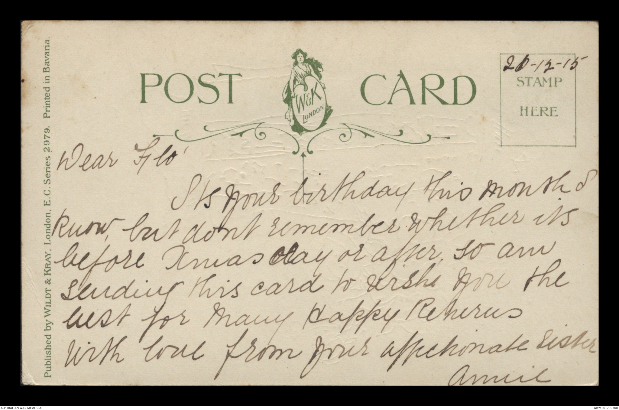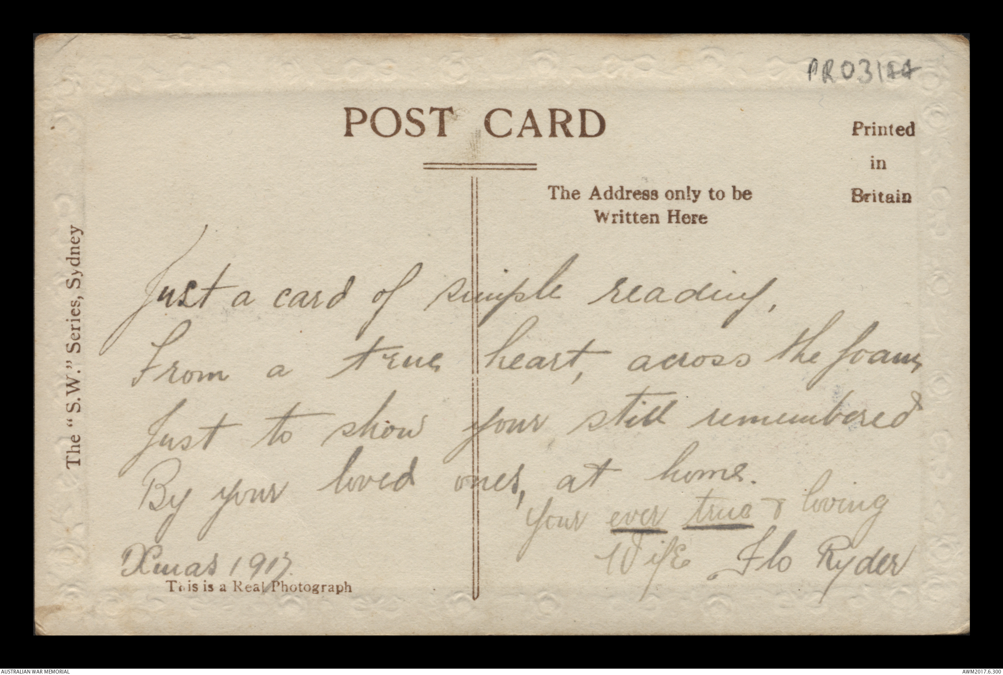 Postcard from Florence Laurel Jane Ryder to Frederick Ewart Ryder, c. December 1917.