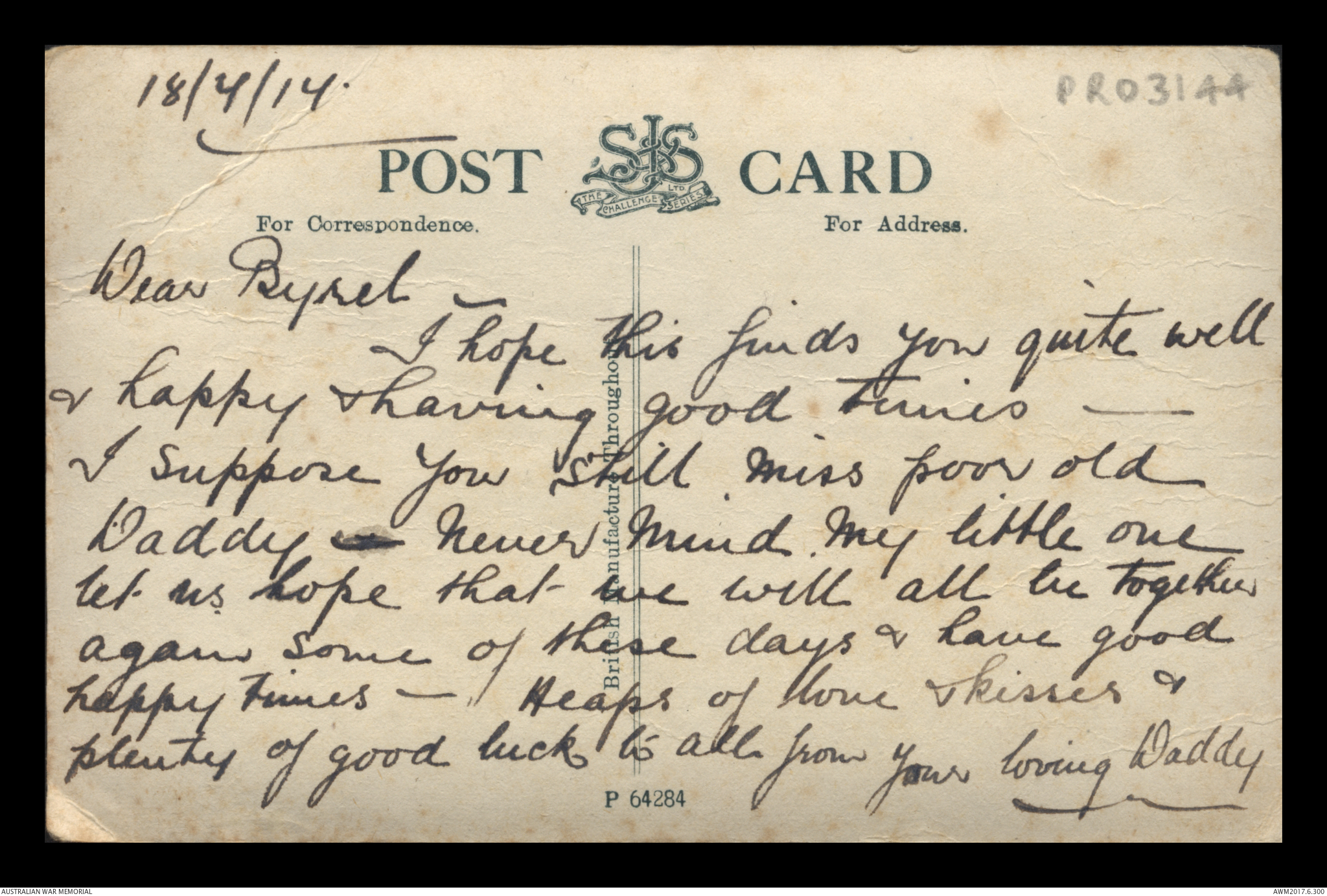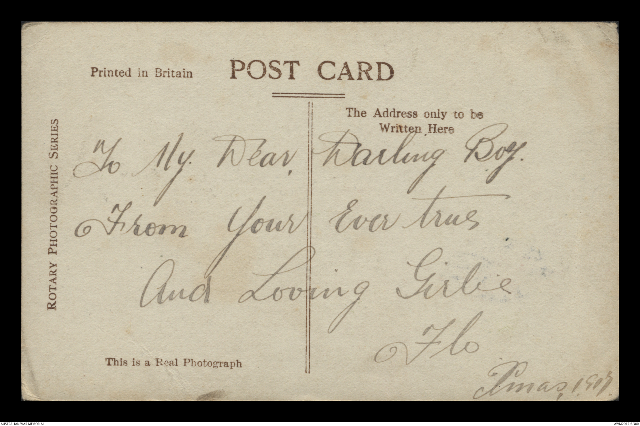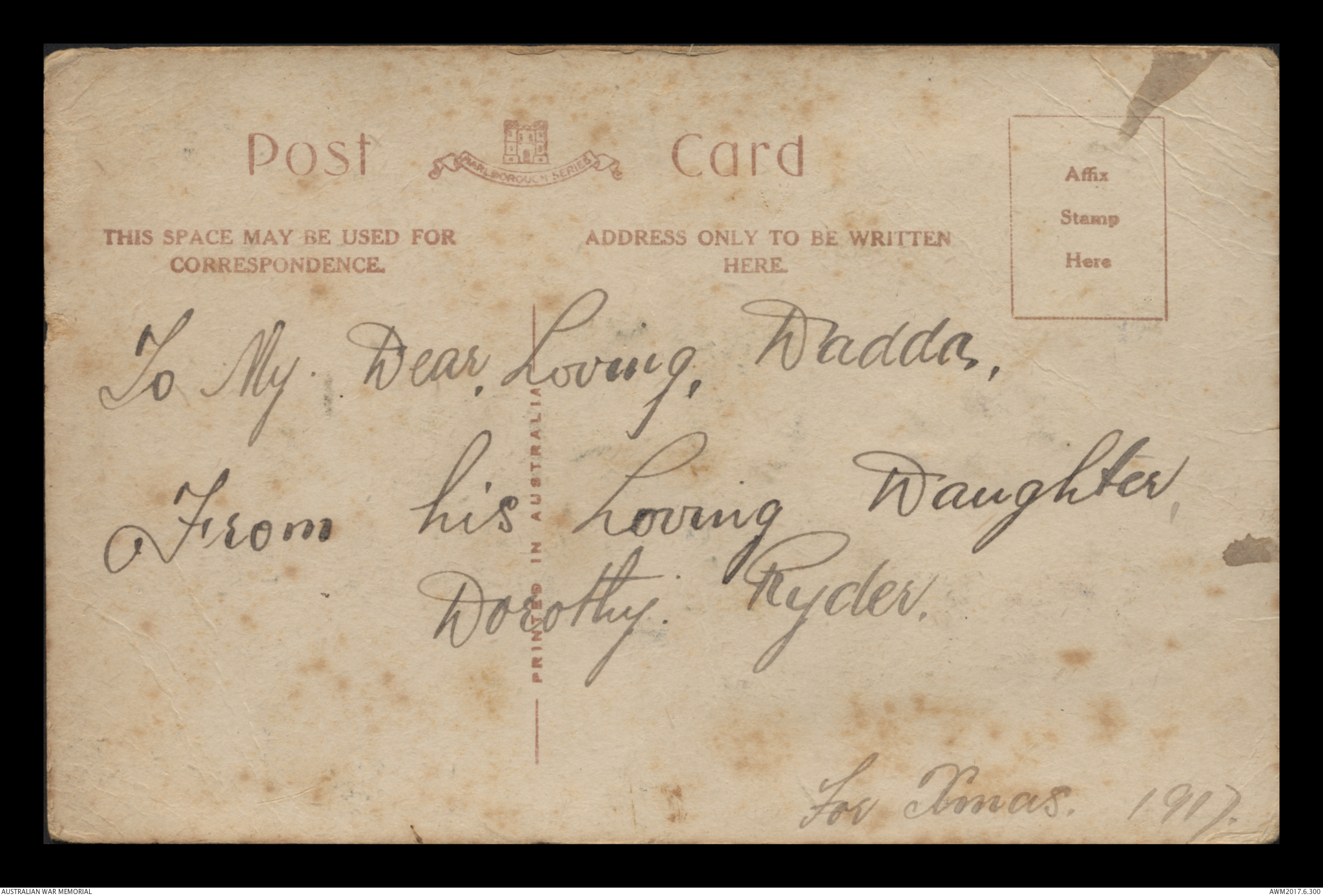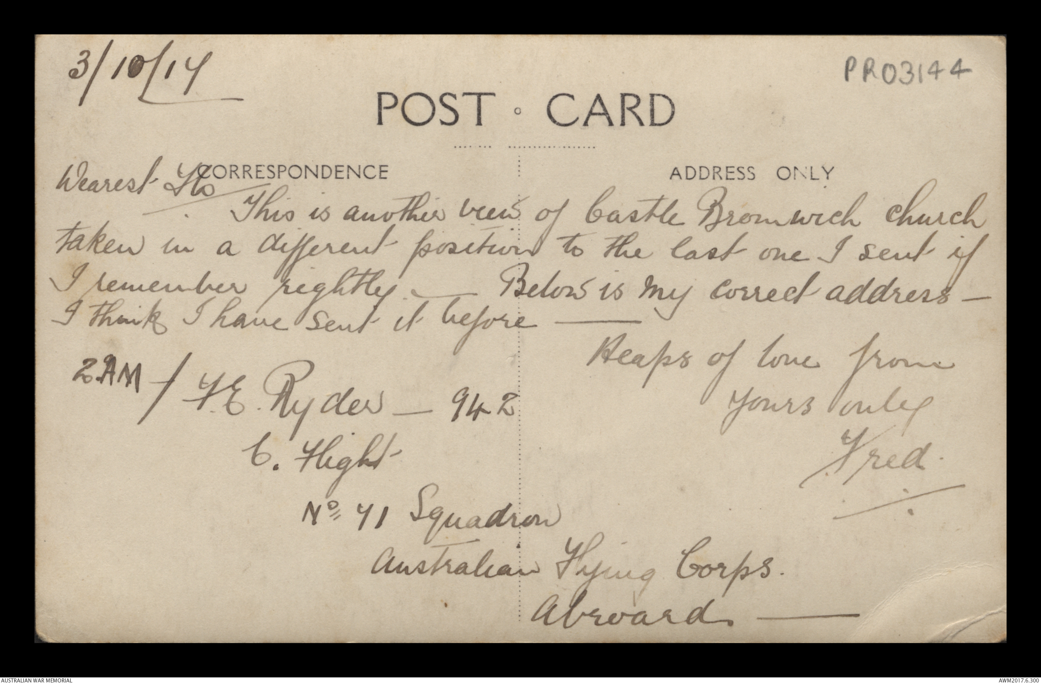Postcards relating to the First World War service of 942 Air Mechanic 2nd Class (2AM) Frederick Ewart Ryder, No. 4 Squadron, Australian Flying Corps. This collection consists of 58 postcards sent by 2AM Frederick Ewart Ryder to his wife and children from 26 December 1915 to 31 December 1917. 2AM Ryder’s postcards provide few details of the war's progress on the Western Front and the conditions of camp life in England and France. 2AM Ryder also expresses his frustration at being separated from his family and is anxious to reassure them of his health and safety. A small number of postcards from Ryder’s wife, Florence Laurel Jane Ryder, and their two daughters, Dorothy and Beryl, contain birthday, Christmas and anniversary messages.