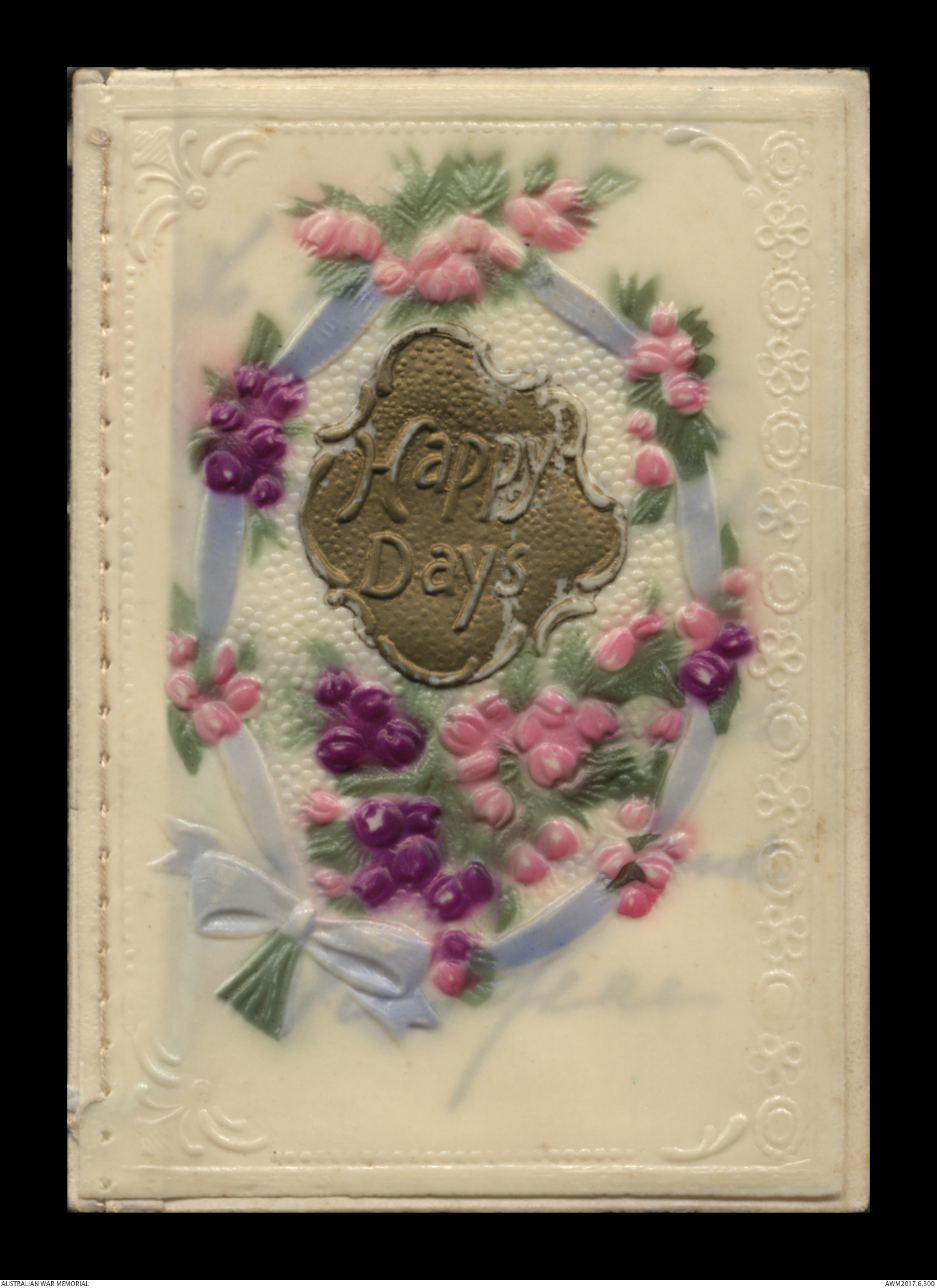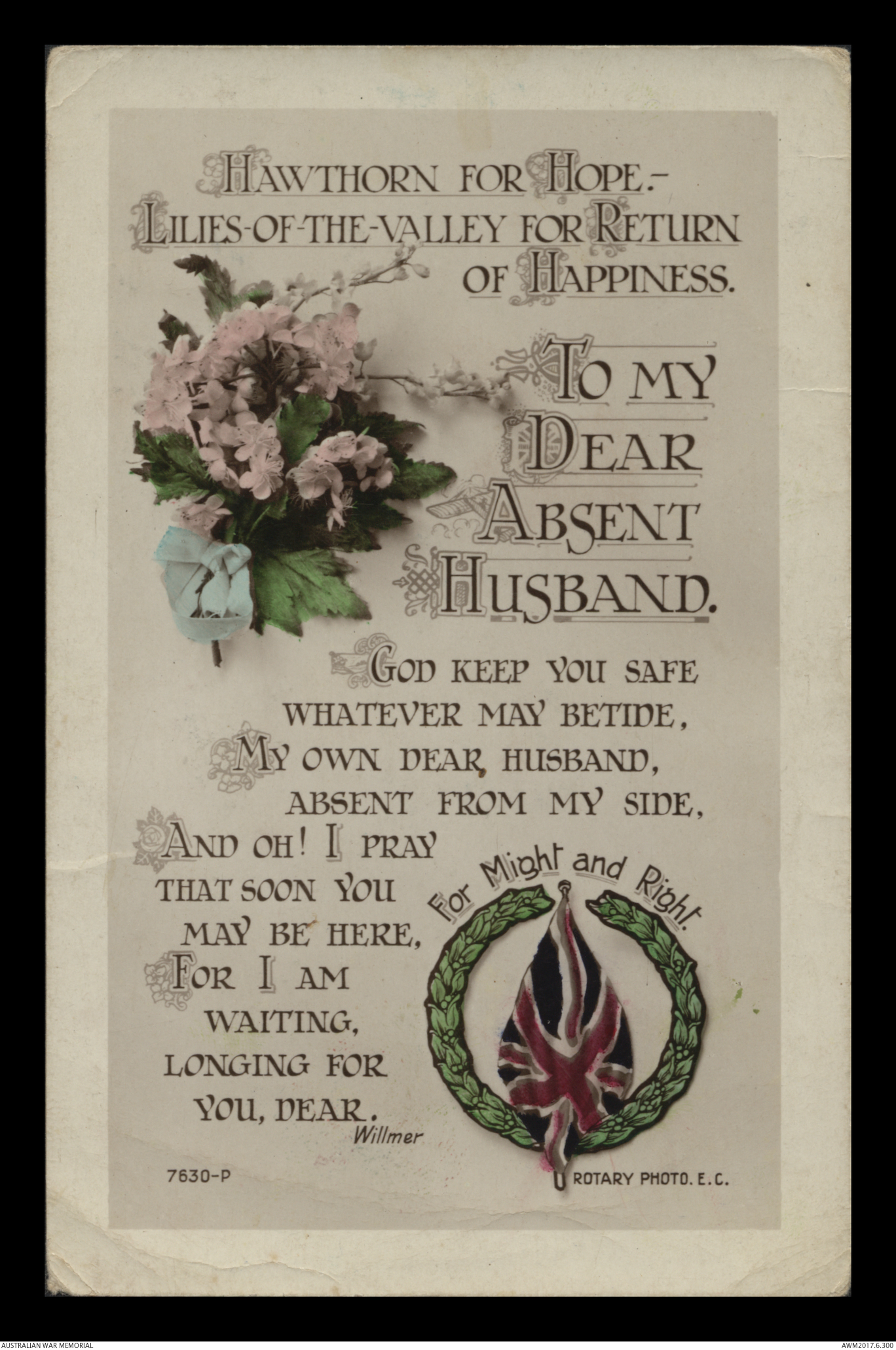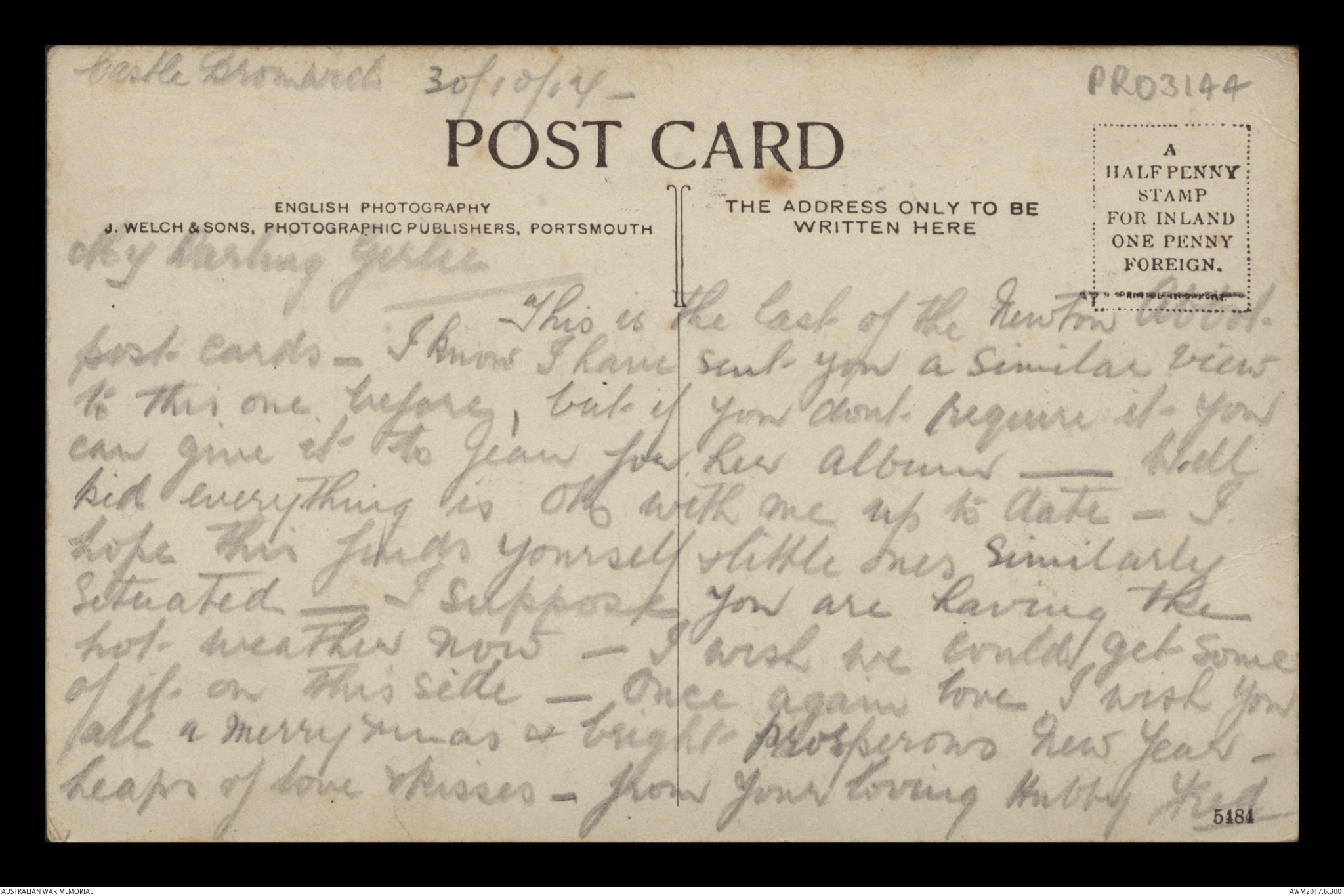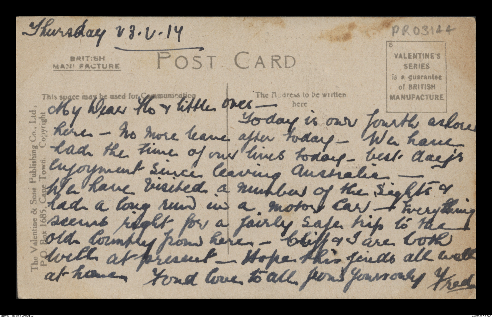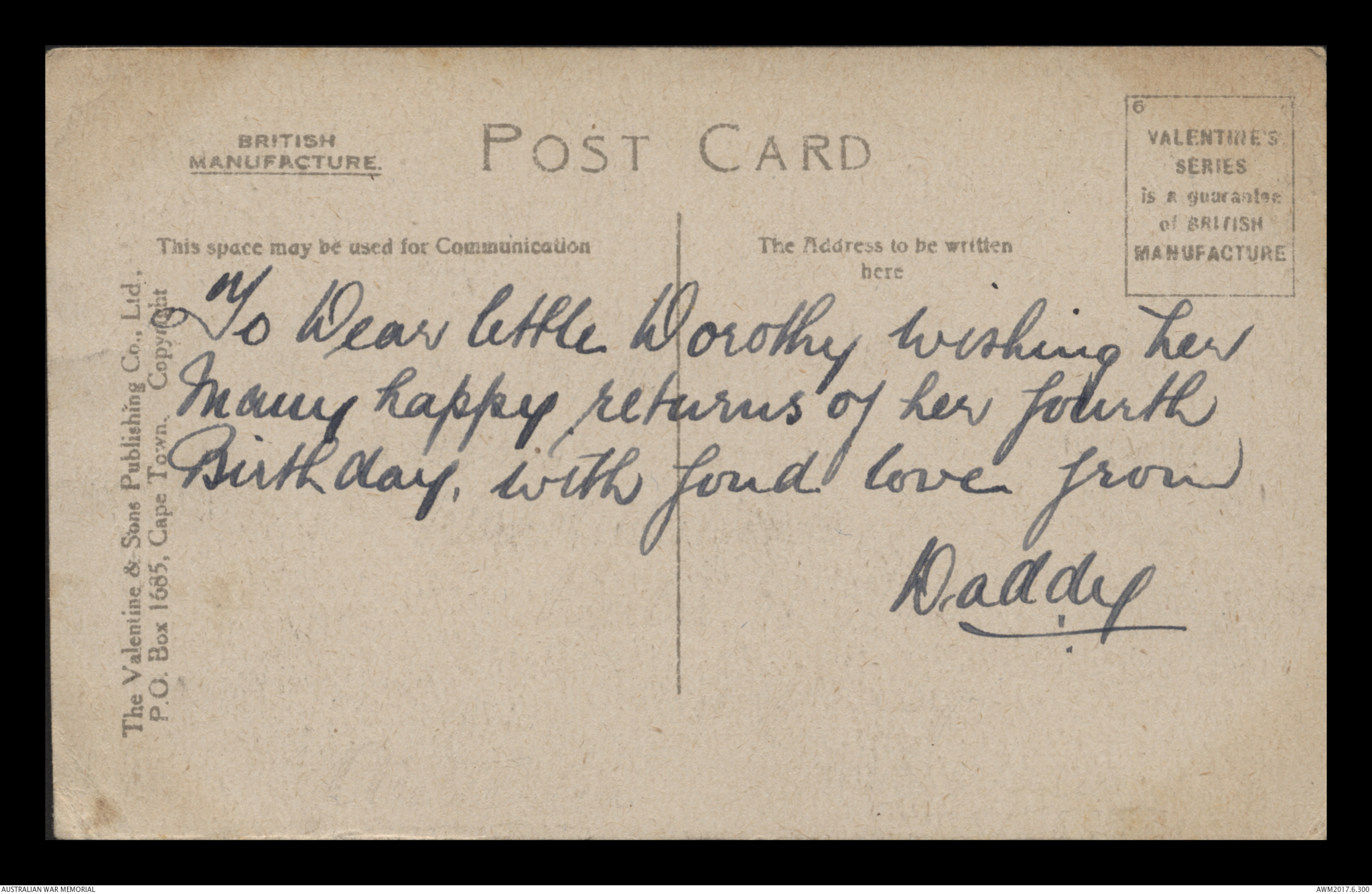 Postcards relating to the First World War service of 942 Air Mechanic 2nd Class (2AM) Frederick Ewart Ryder, No. 4 Squadron, Australian Flying Corps. This collection consists of 58 postcards sent by 2AM Frederick Ewart Ryder to his wife and children from 26 December 1915 to 31 December 1917. 2AM Ryder’s postcards provide few details of the war's progress on the Western Front and the conditions of camp life in England and France. 2AM Ryder also expresses his frustration at being separated from his family and is anxious to reassure them of his health and safety. A small number of postcards from Ryder’s wife, Florence Laurel Jane Ryder, and their two daughters, Dorothy and Beryl, contain birthday, Christmas and anniversary messages.