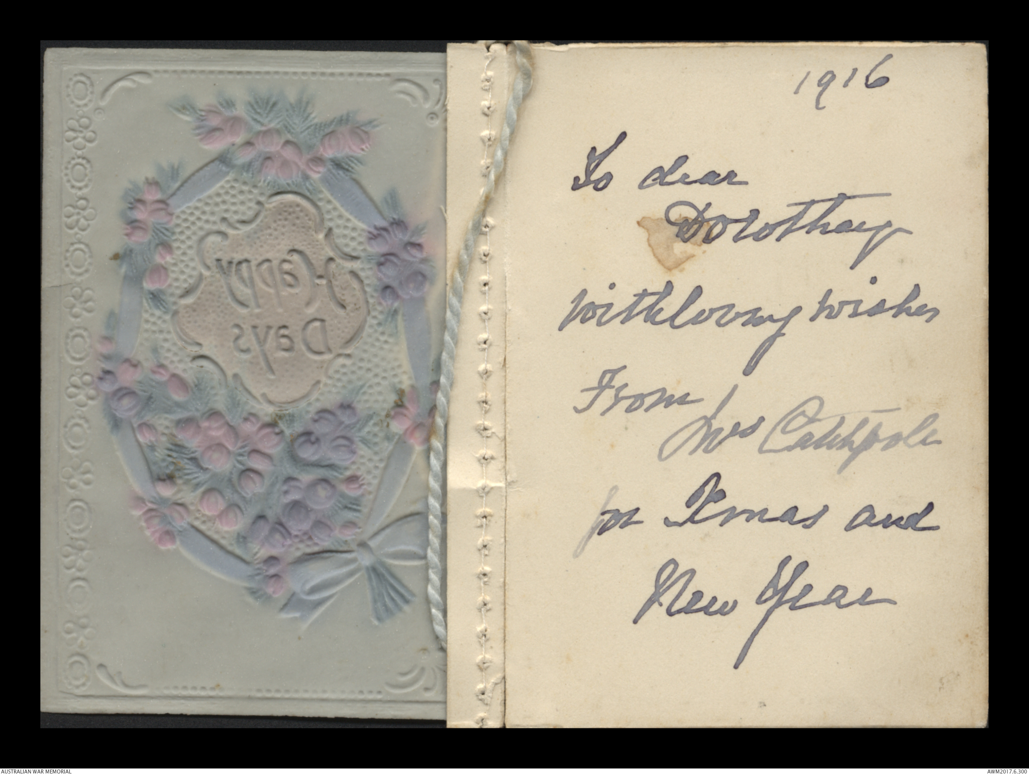 Greeting card from Mrs Catchpole to Dorothy Ryder, c. December 1916;