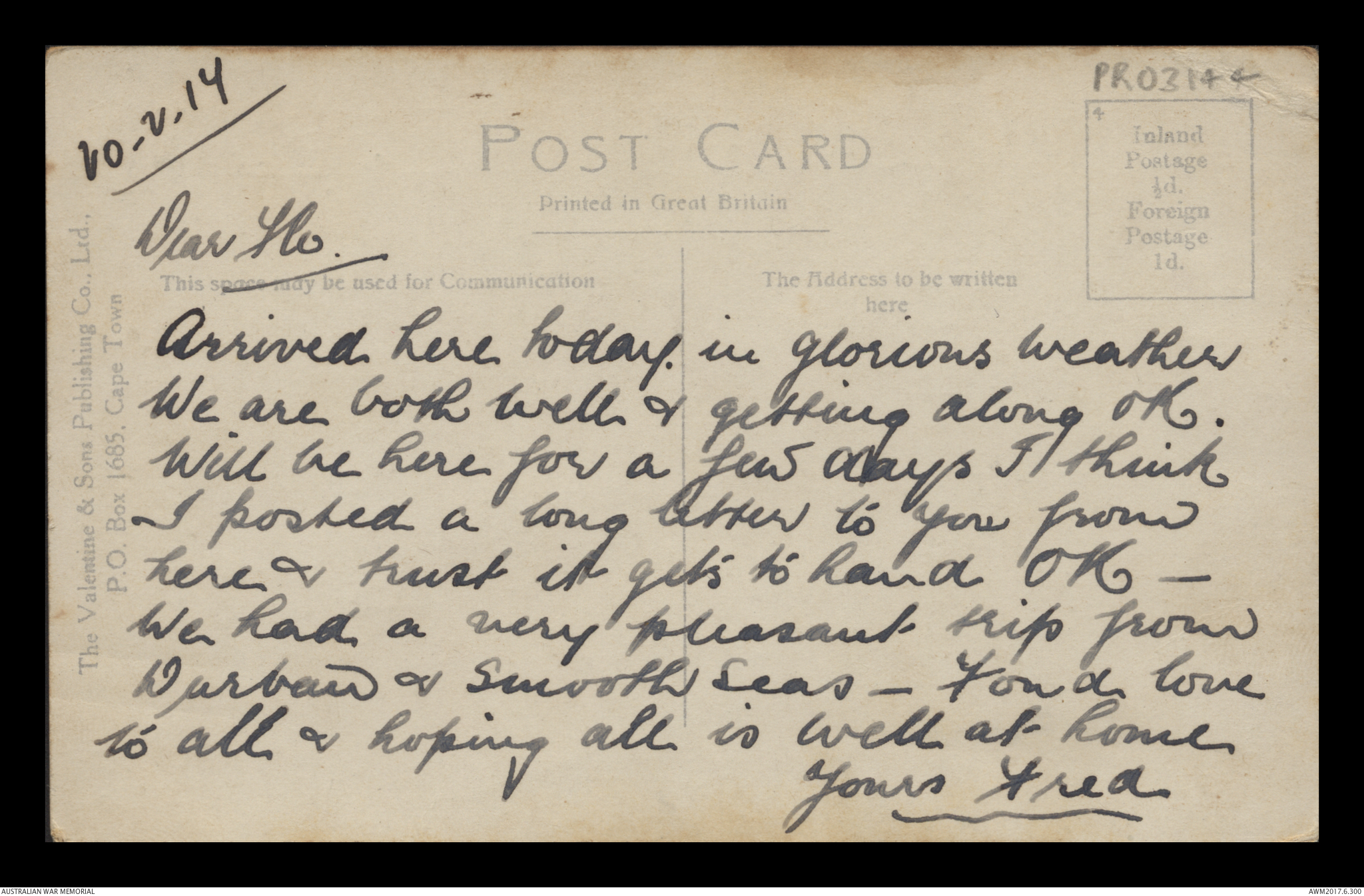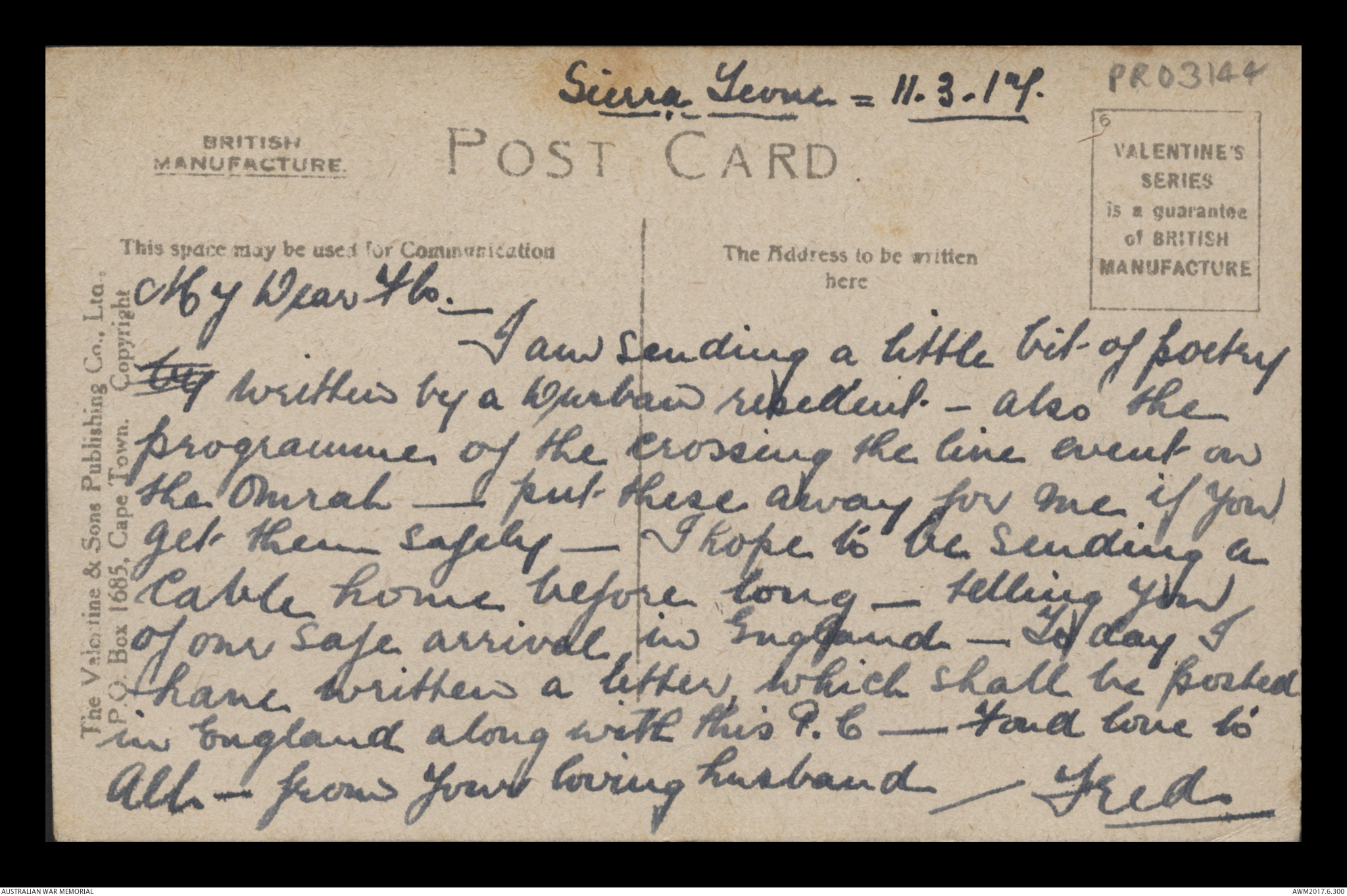 Postcard from Frederick Ewart Ryder to Florence Laurel Jane Ryder, Sierra Leone, 11 March 1917;
