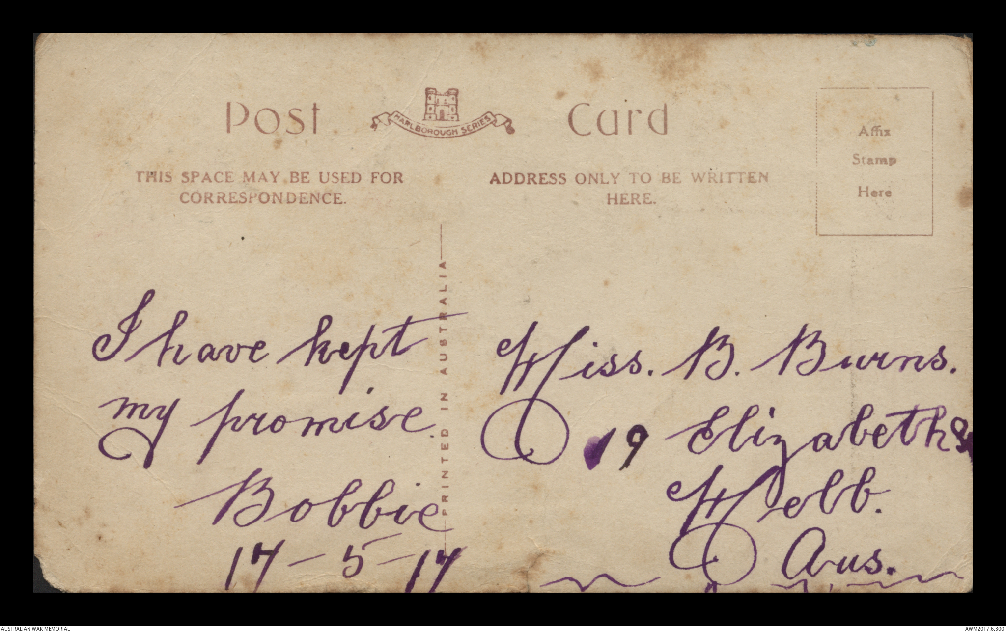 Postcard from Bobbie to Miss B. Burns, 17 May 1917;