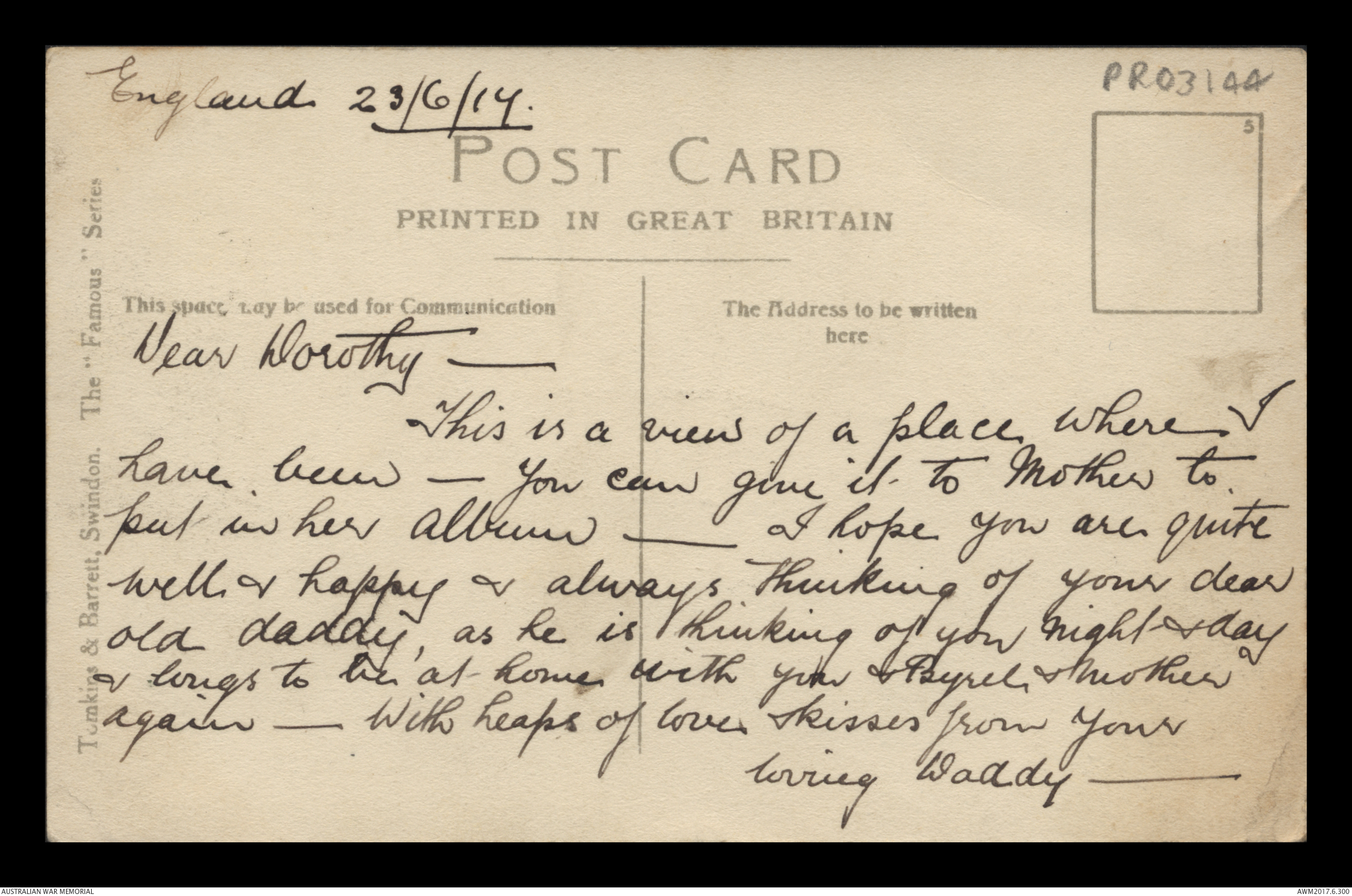 Postcard from Frederick Ewart Ryder to Dorothy Ryder, England, 23 June 1917;