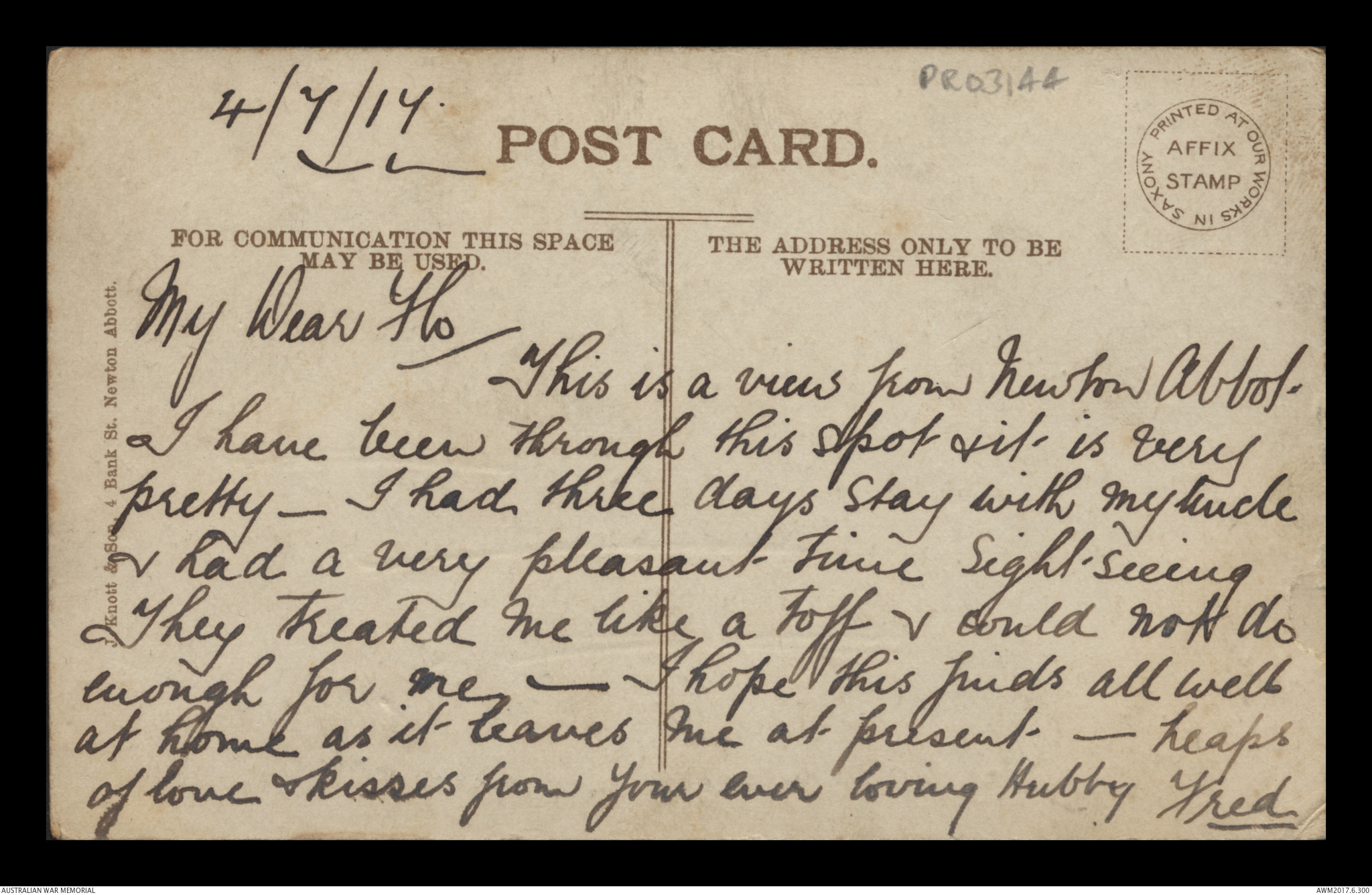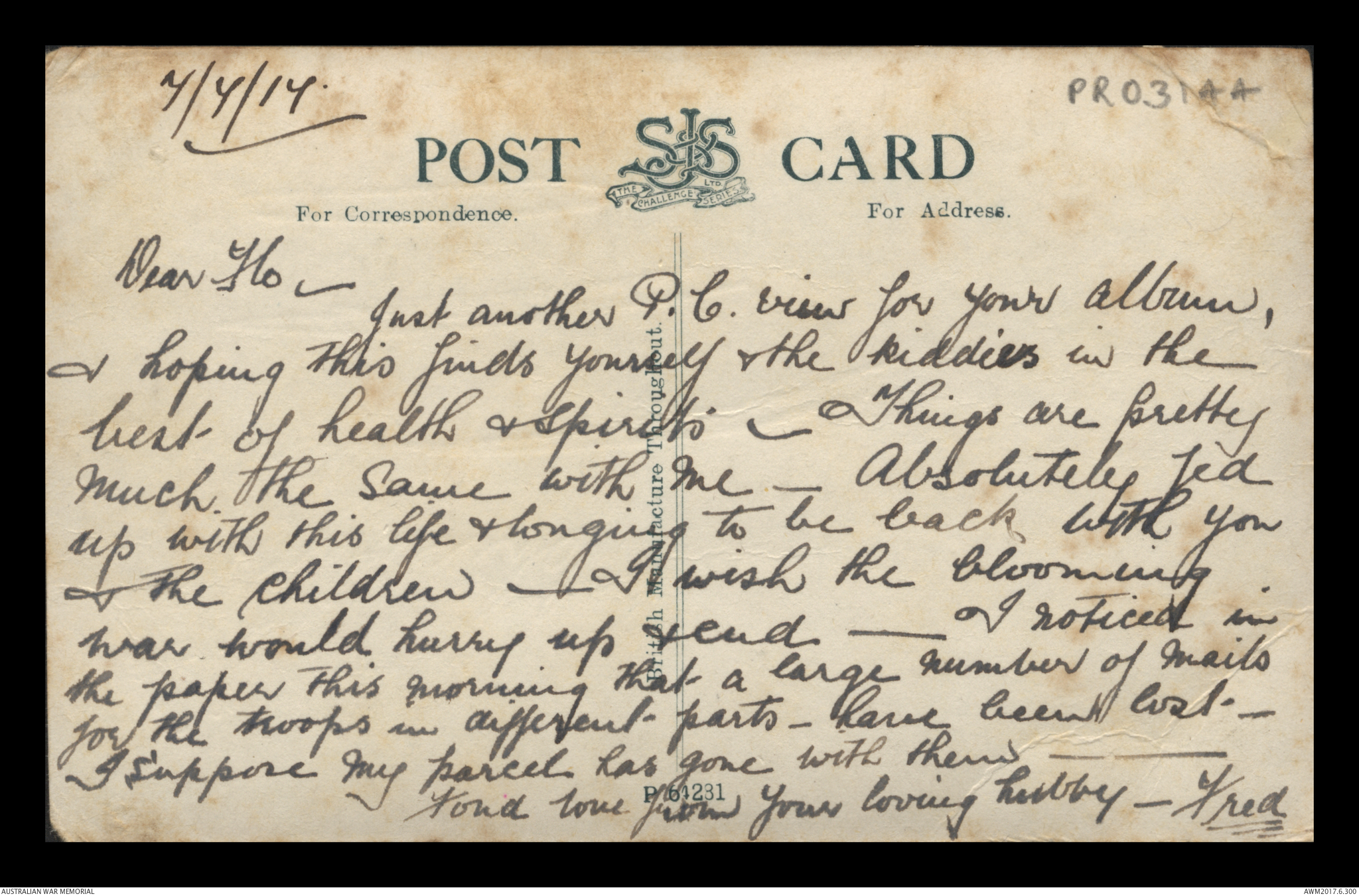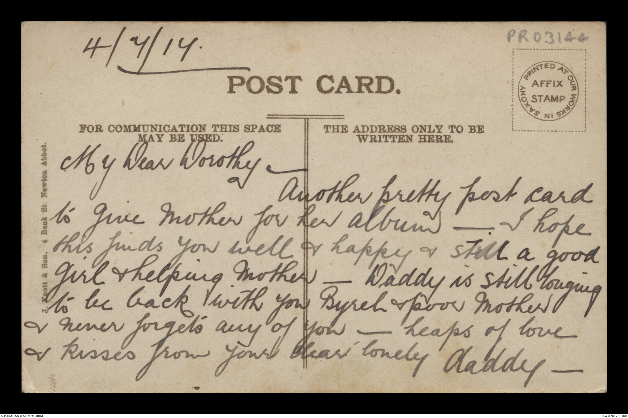 Postcard from Frederick Ewart Ryder to Dorothy Ryder, 4 July 1917;