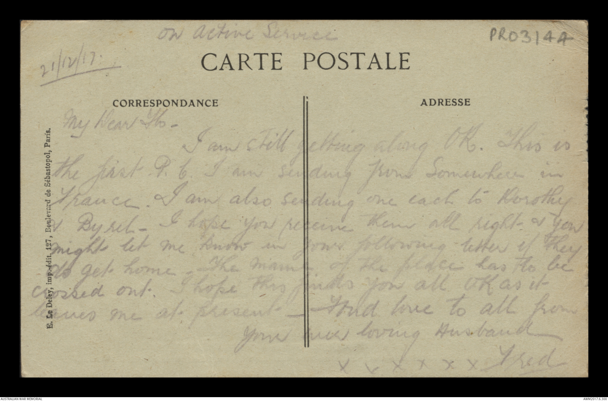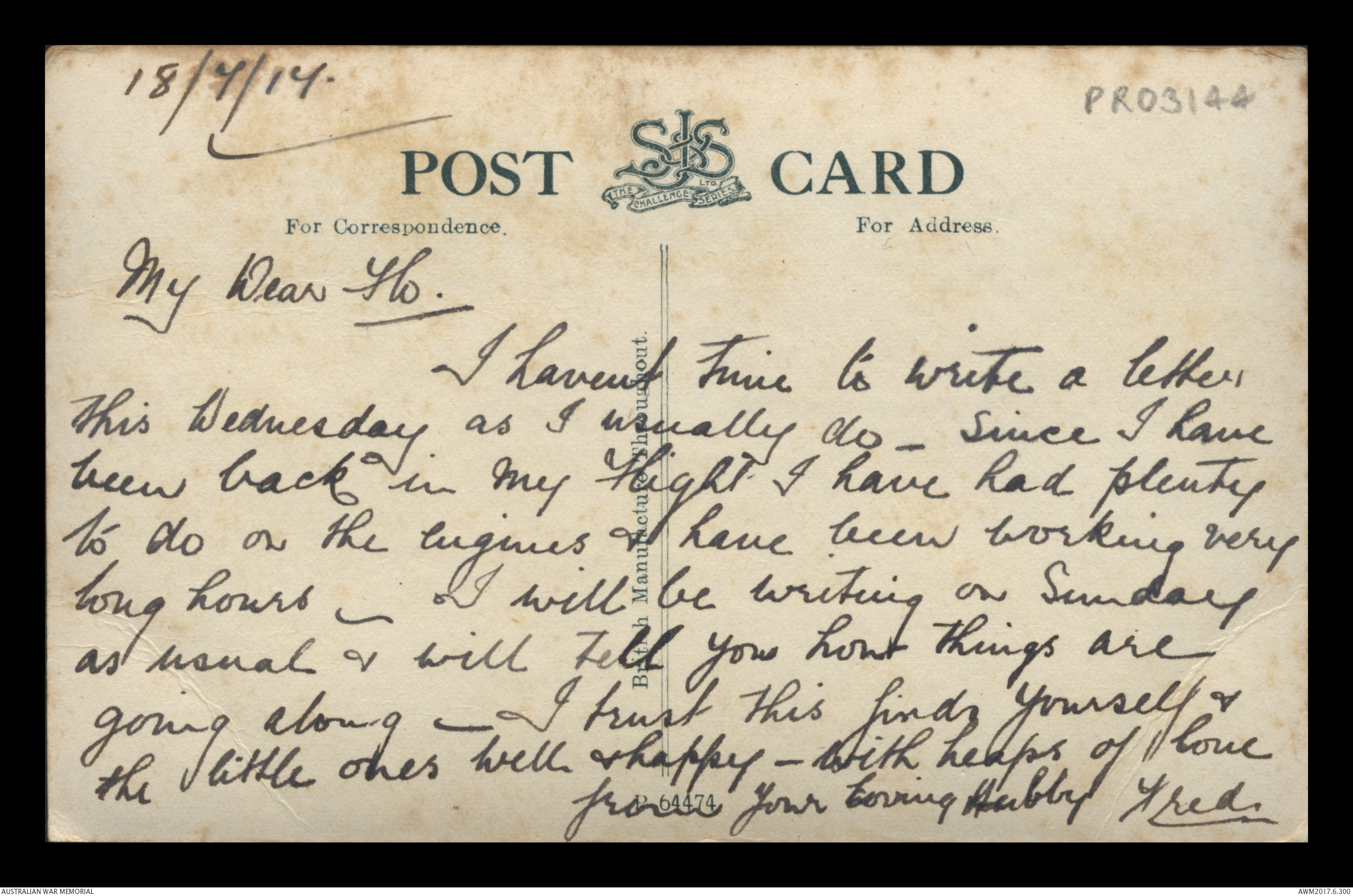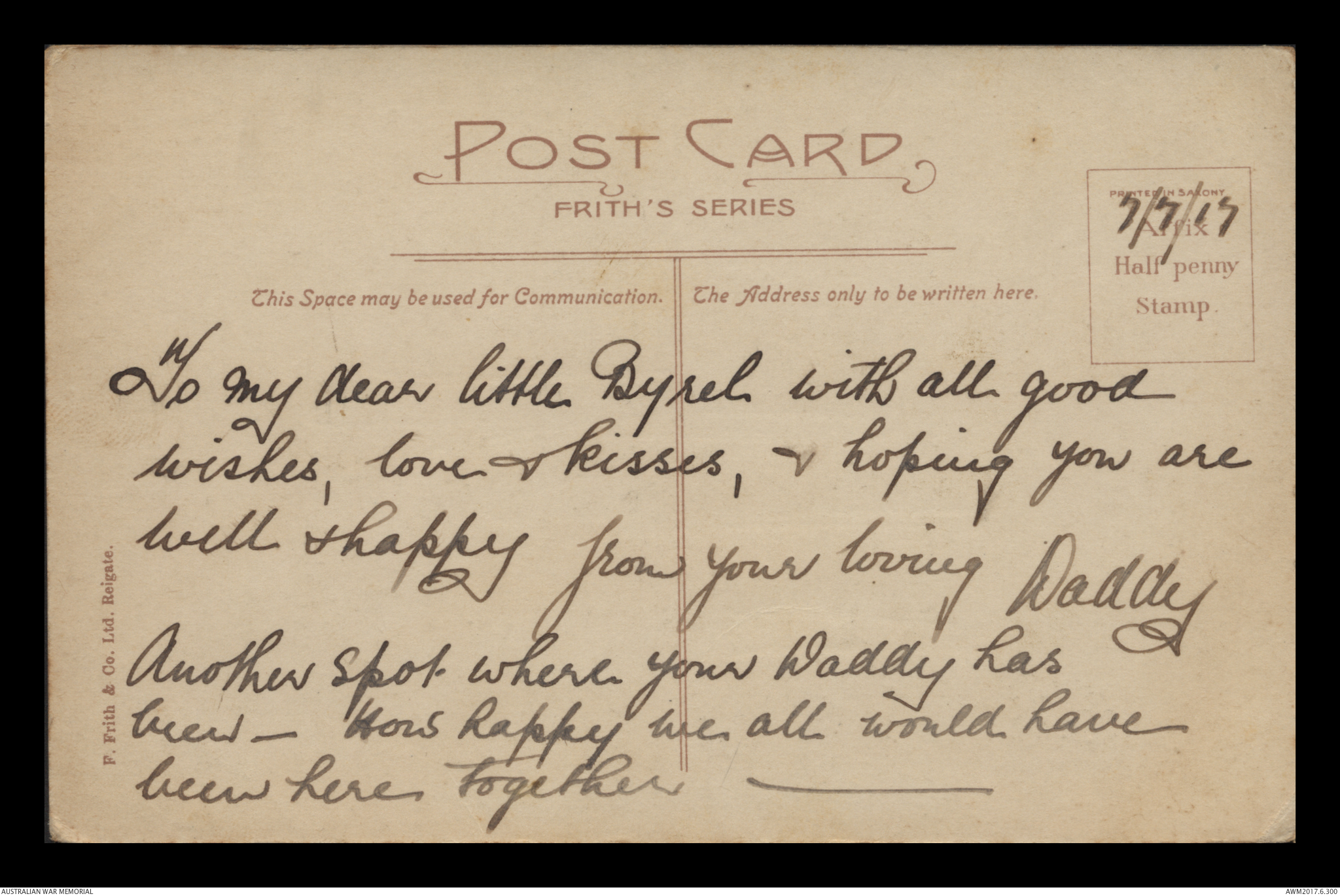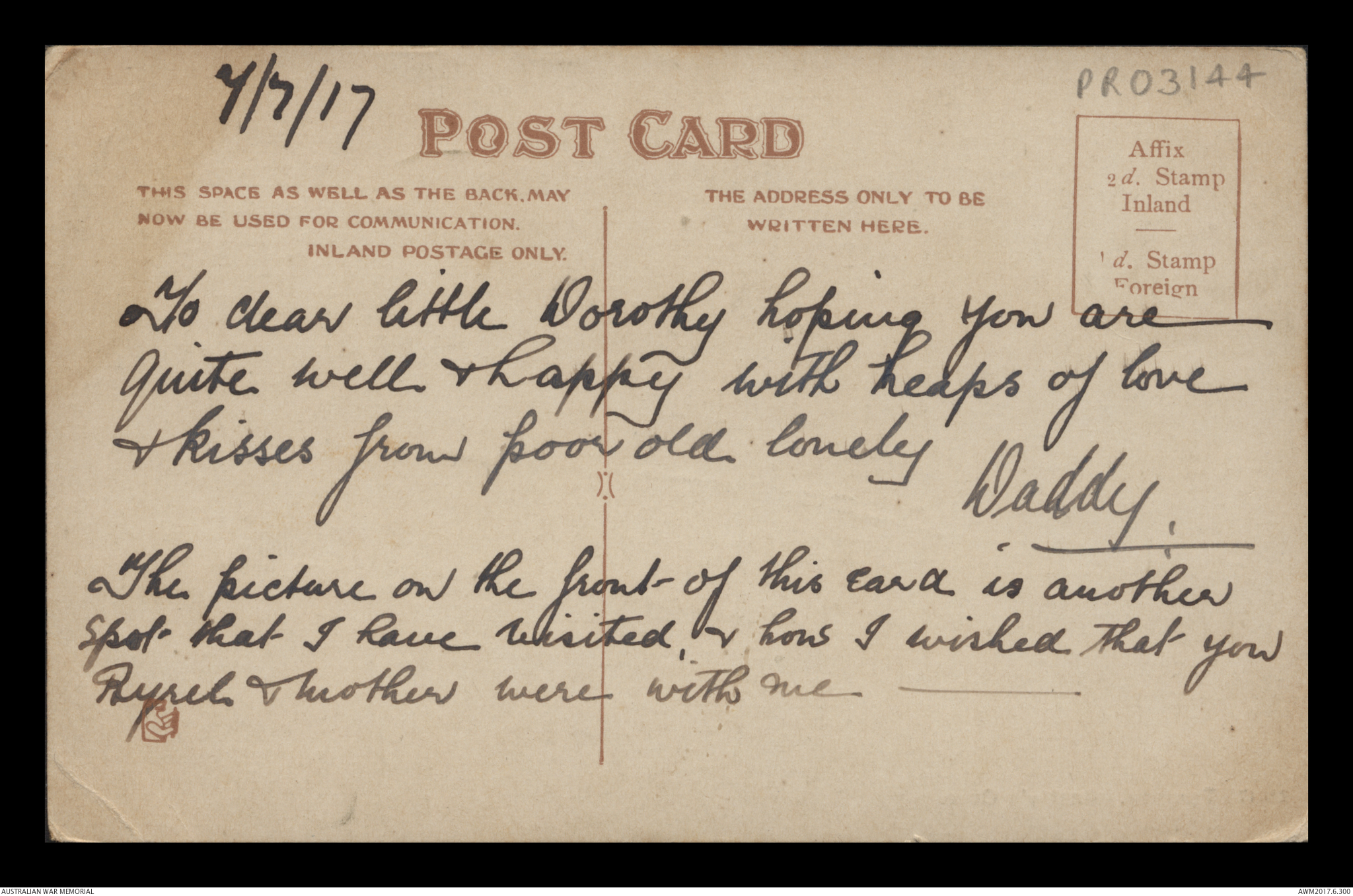 Postcard from Frederick Ewart Ryder to Dorothy Ryder, 7 July 1917;