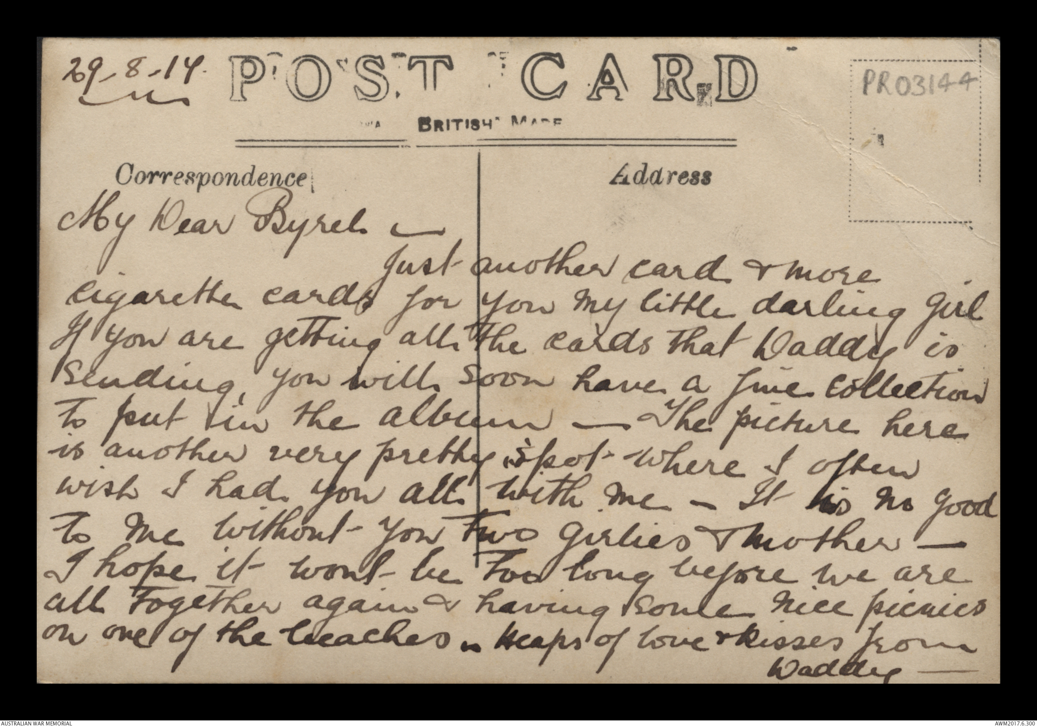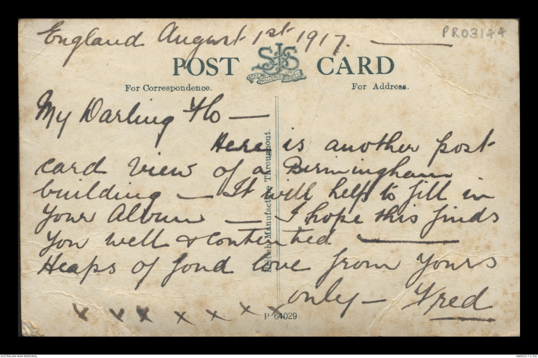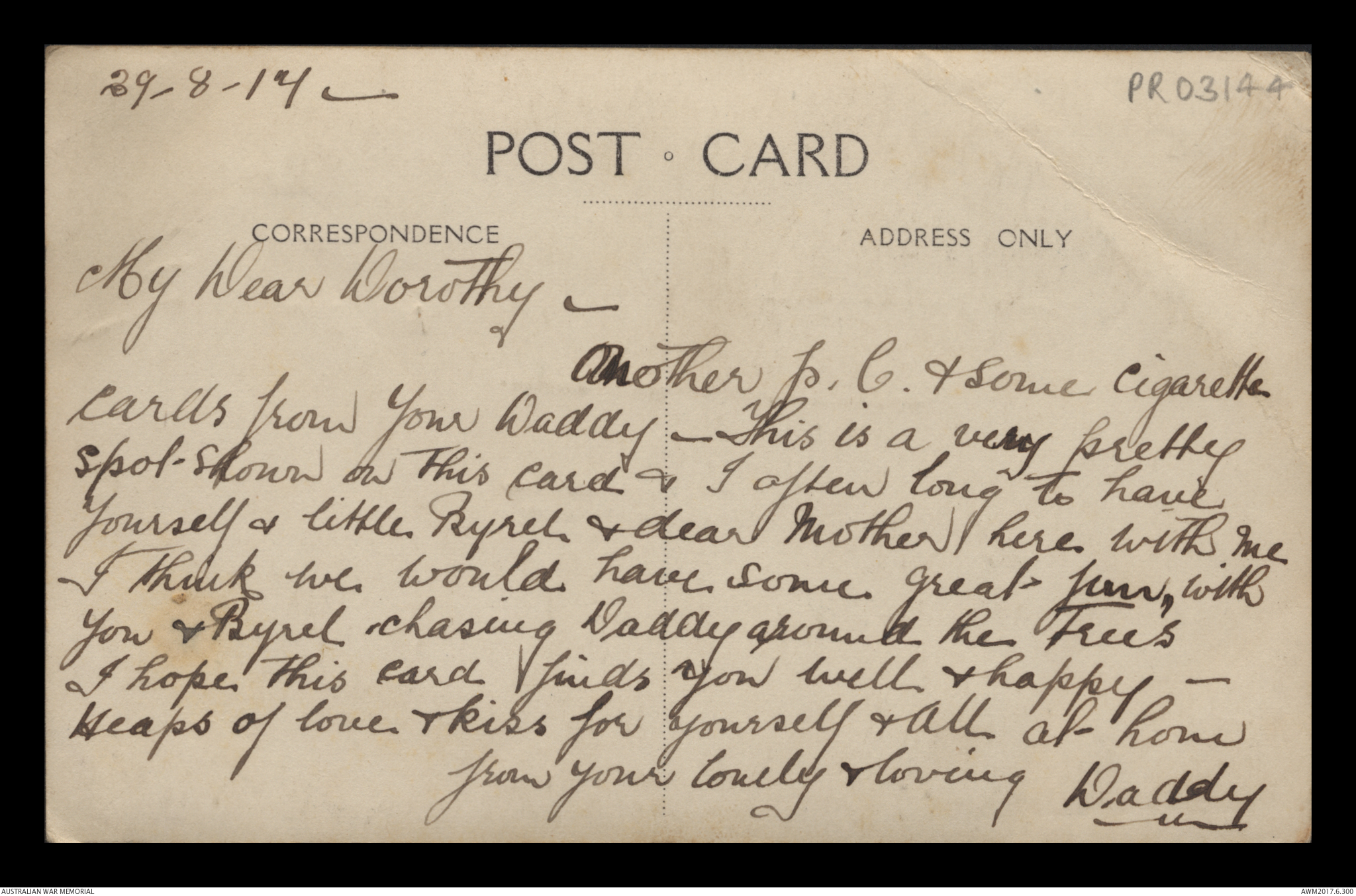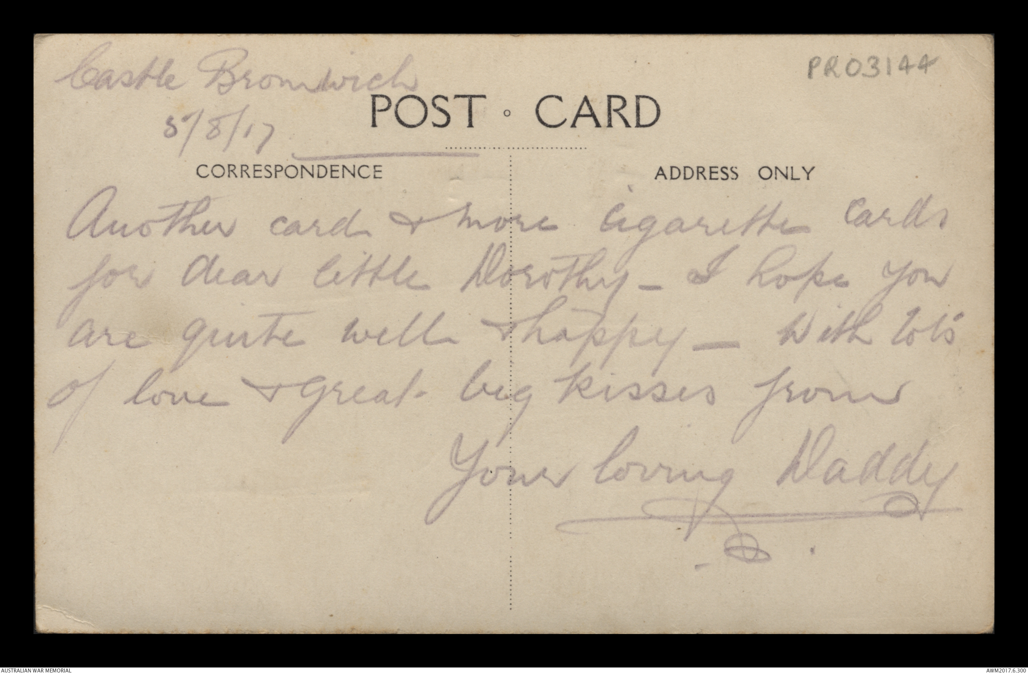 Postcard from Frederick Ewart Ryder to Dorothy Ryder, 29 August 1917;