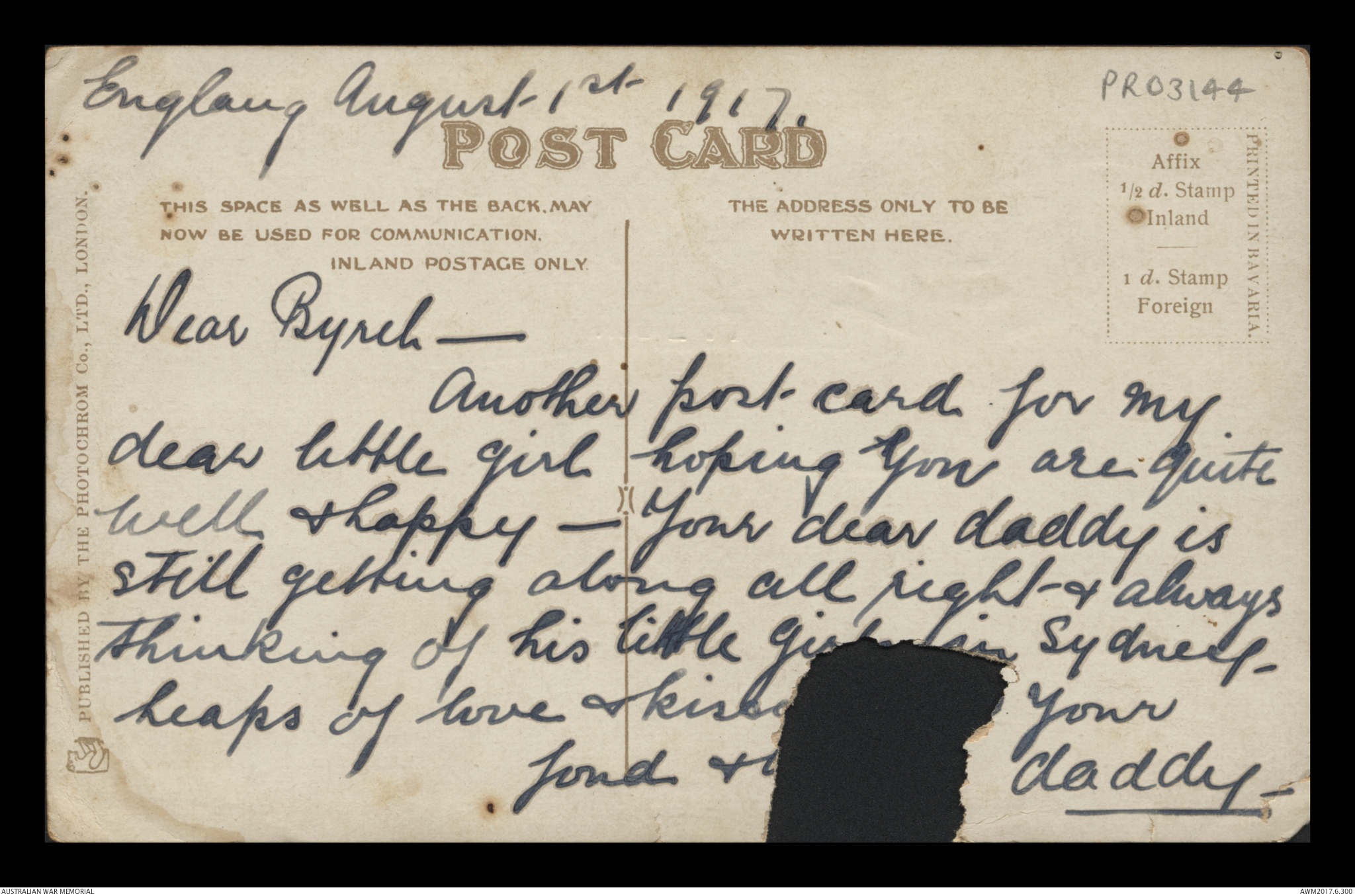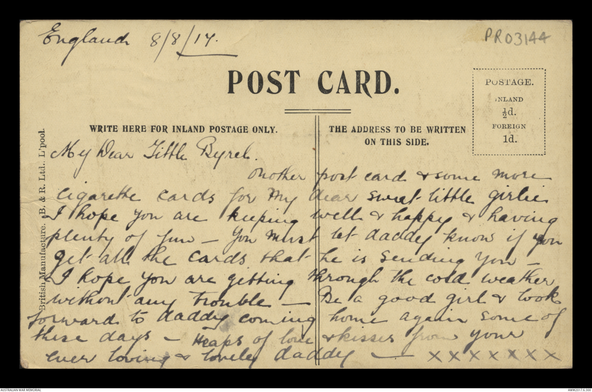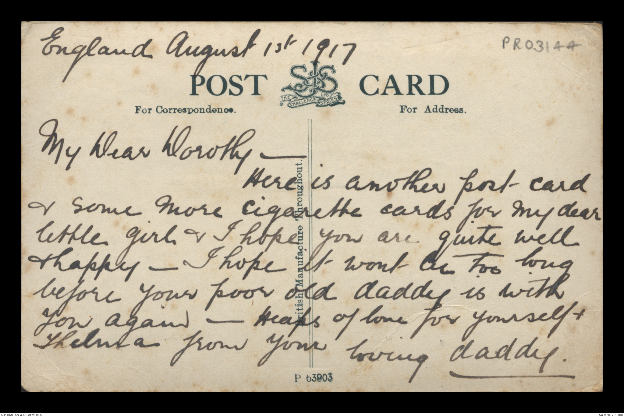 Postcard from Frederick Ewart Ryder to Dorothy Ryder, England, 1 August 1917;