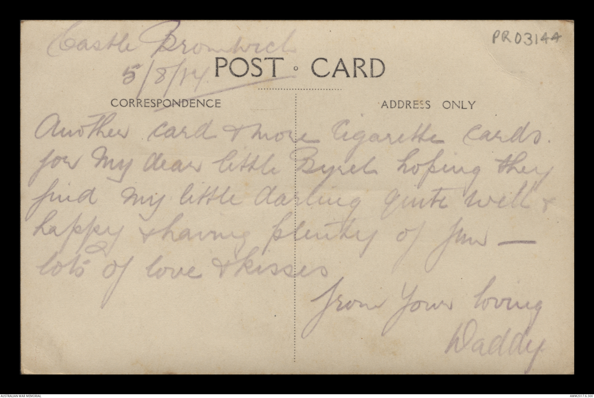 Postcard from Frederick Ewart Ryder to Dorothy Ryder, 5 August 1917;